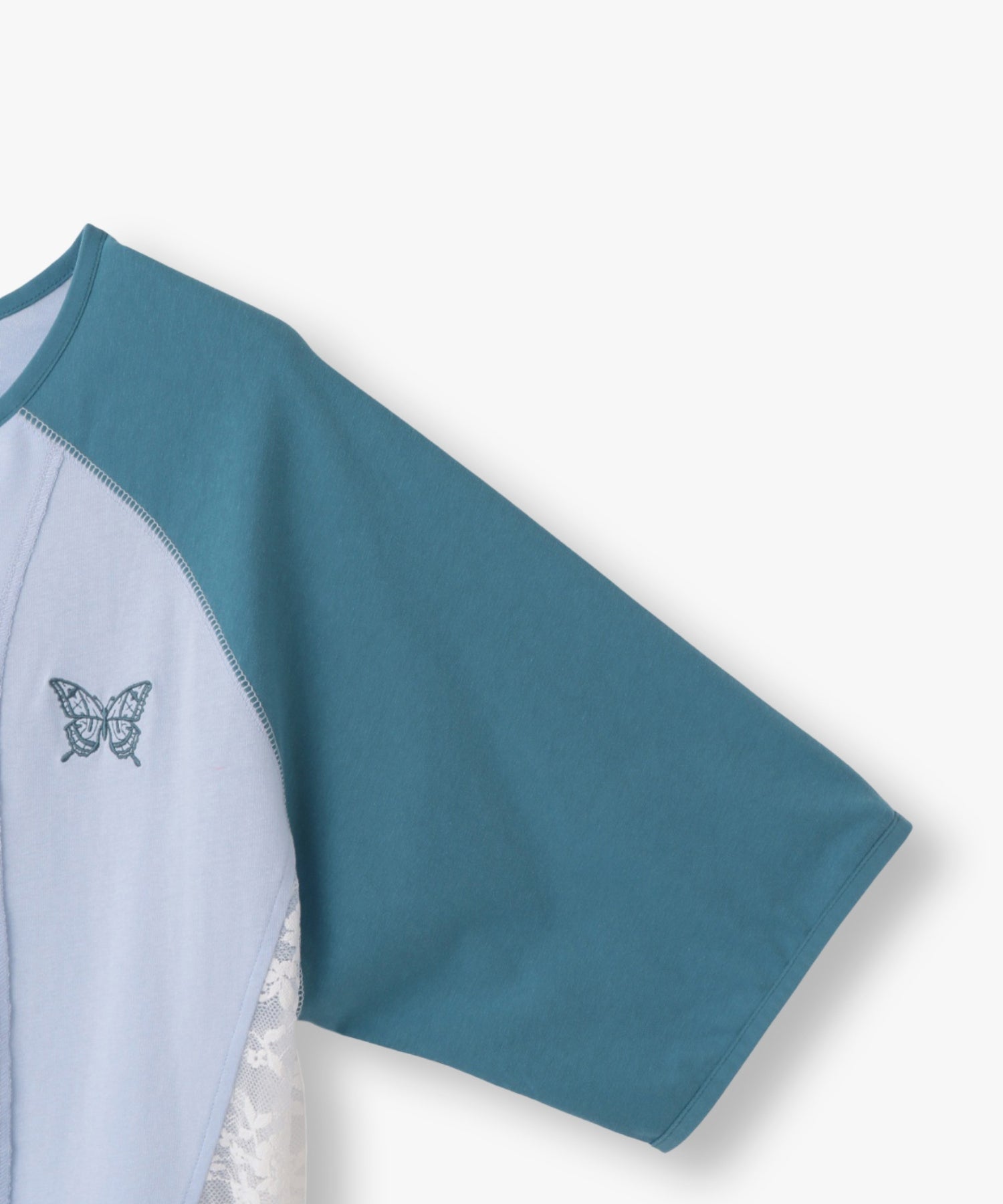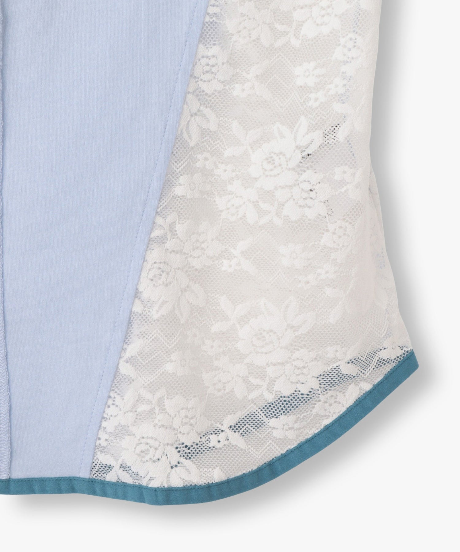 ドライタッチのカジュアルな天竺素材をベースに、脇の切り替え部分にはヴィンテージな雰囲気が漂うレースを使用。質感のコントラストが、シンプルながらも奥行きのあるルックスを演出します。