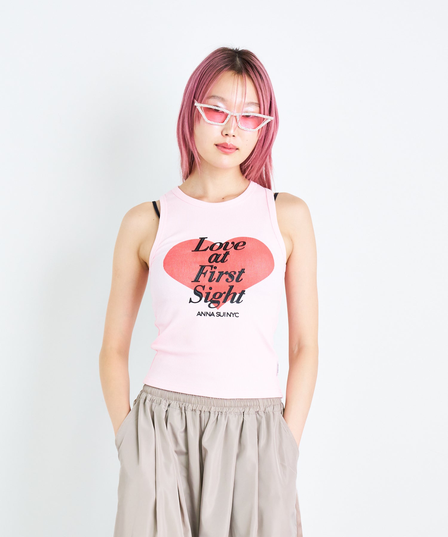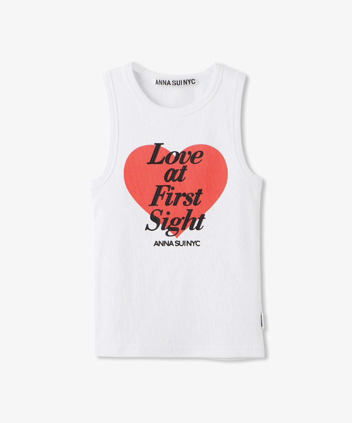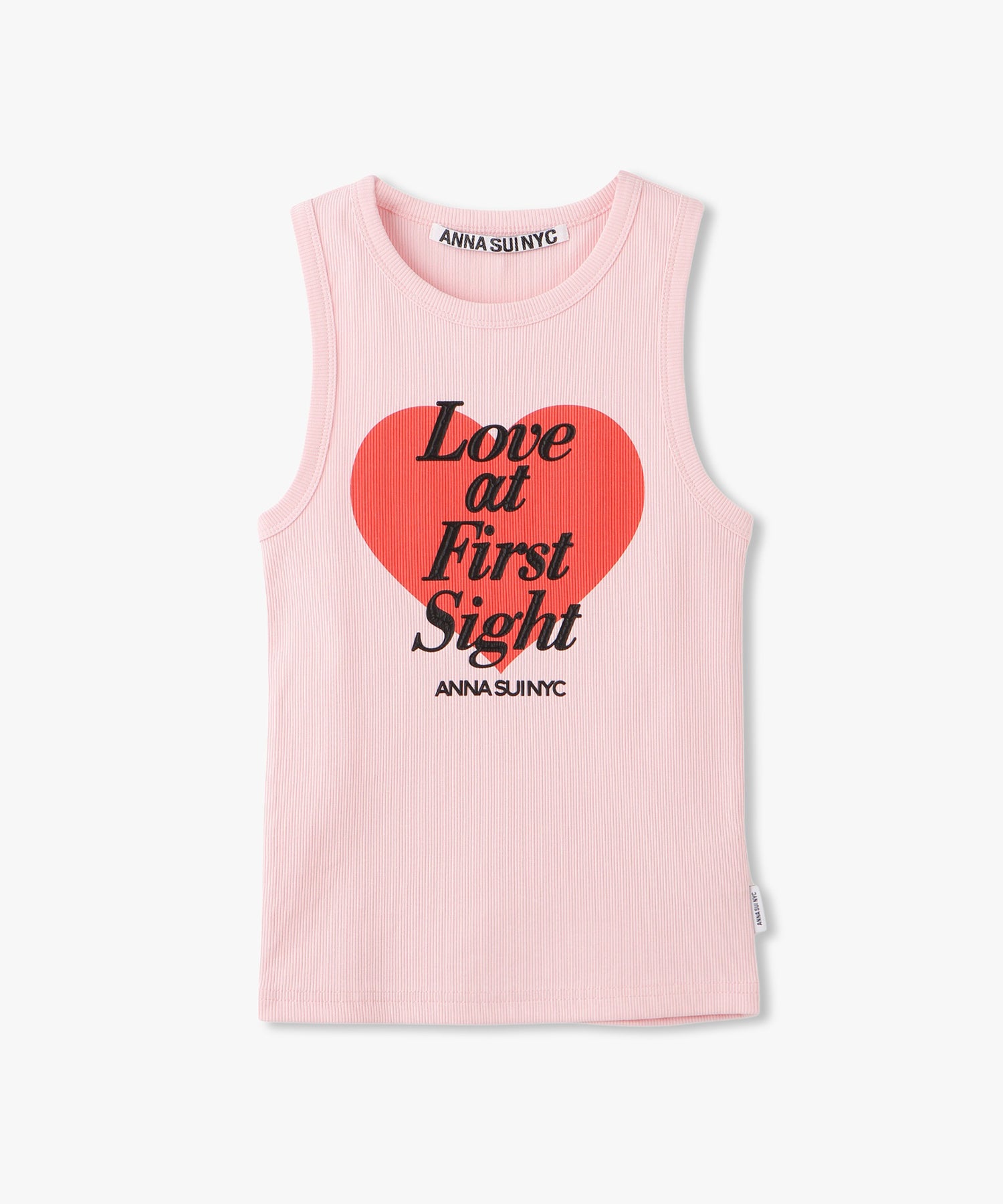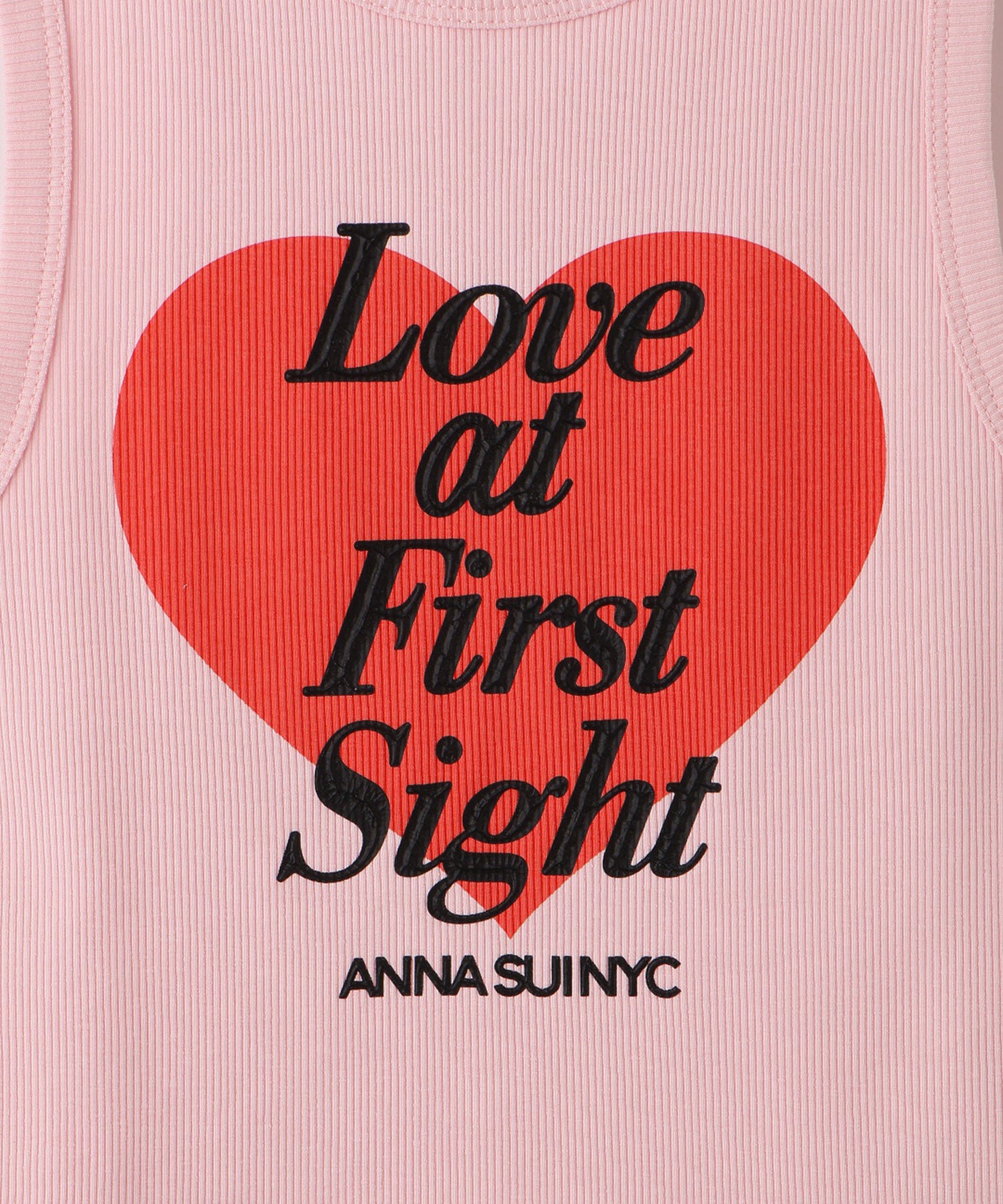 大きなハートと「Love at first sight」のメッセージが胸元に大胆にプリントされたタンクトップ。愛らしさとエネルギッシュな雰囲気を感じさせるデザインは、シンプルながらインパクト抜群です。ロゴ部分のみ凹凸感のあるプリントで立体的に仕上げられており、こだわりが光るデザインです。