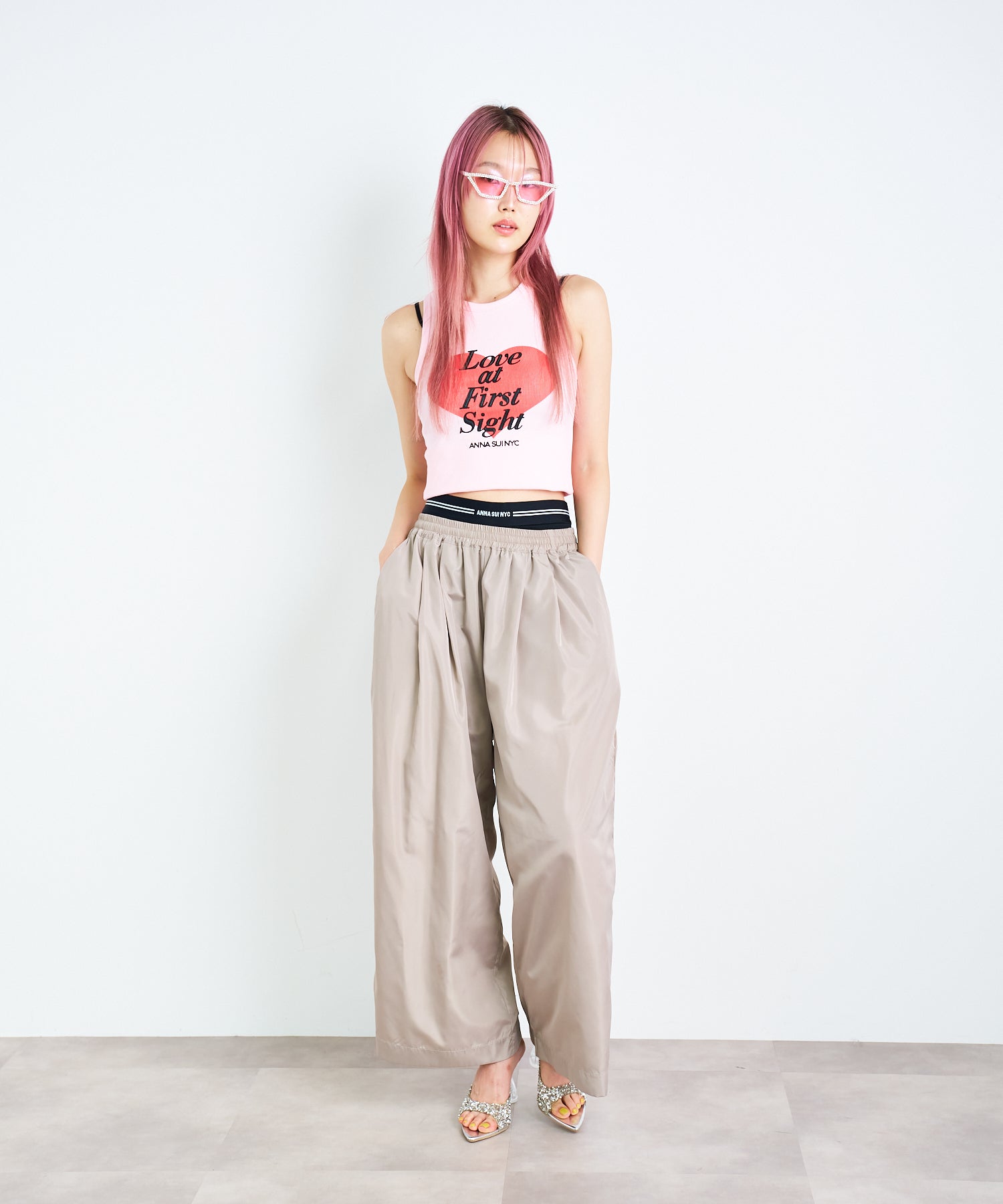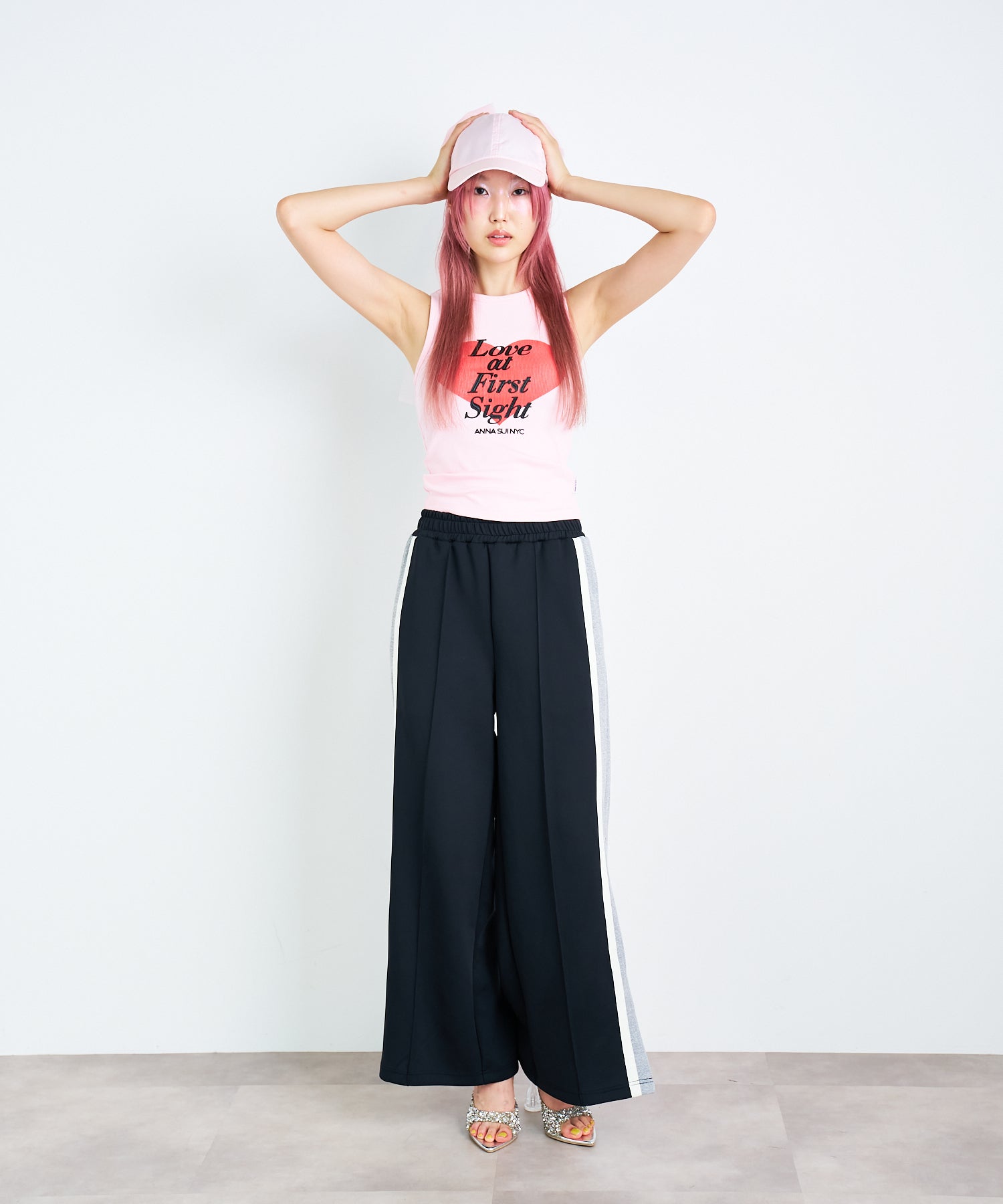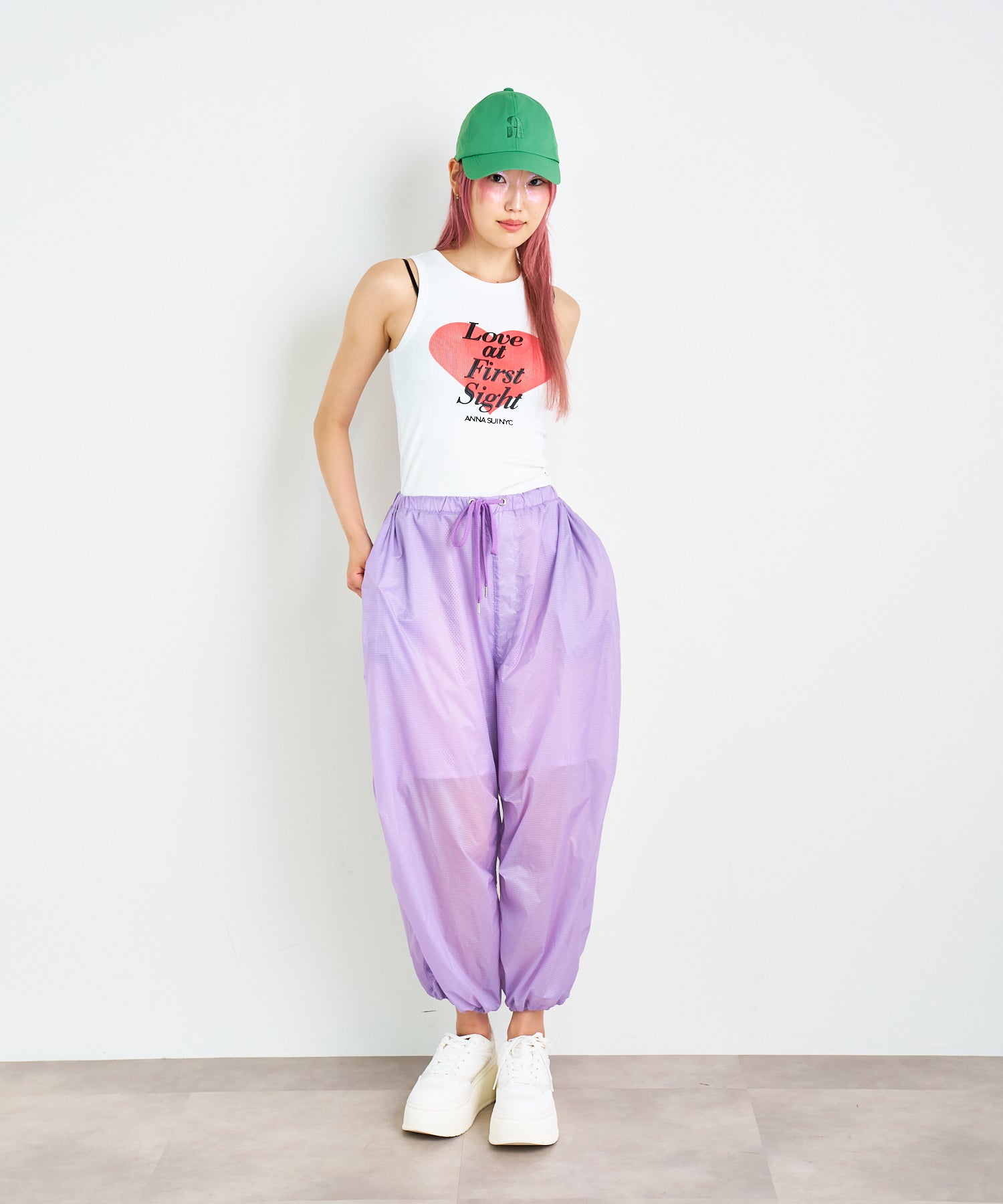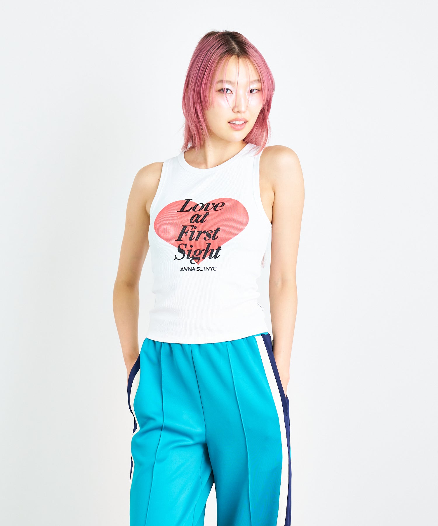 大きなハートと「Love at first sight」のメッセージが胸元に大胆にプリントされたタンクトップ。愛らしさとエネルギッシュな雰囲気を感じさせるデザインは、シンプルながらインパクト抜群です。ロゴ部分のみ凹凸感のあるプリントで立体的に仕上げられており、こだわりが光るデザインです。