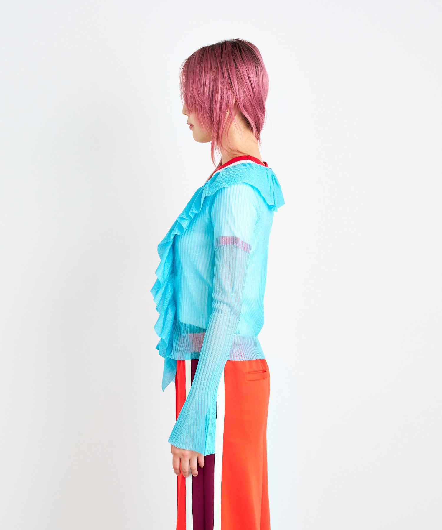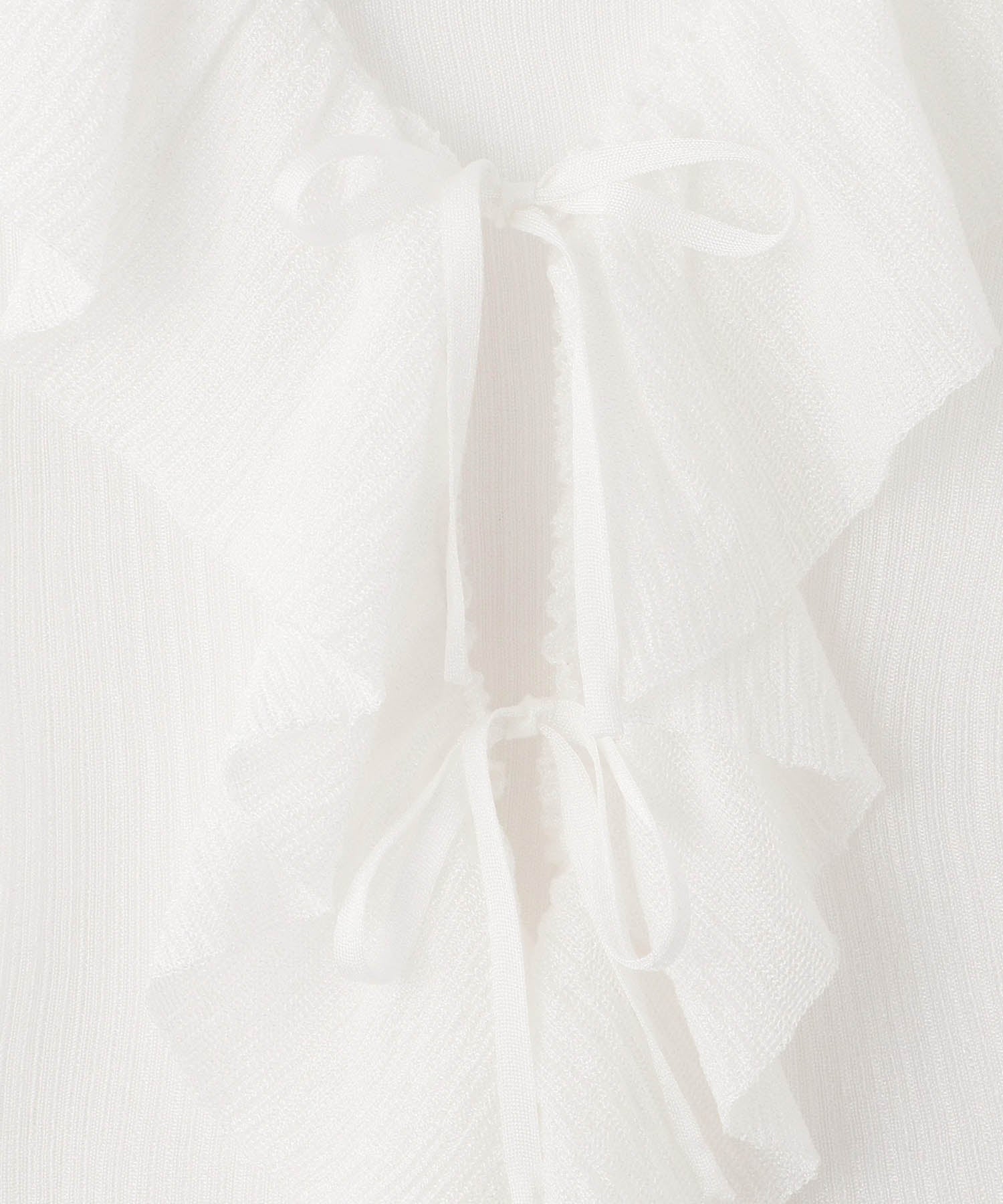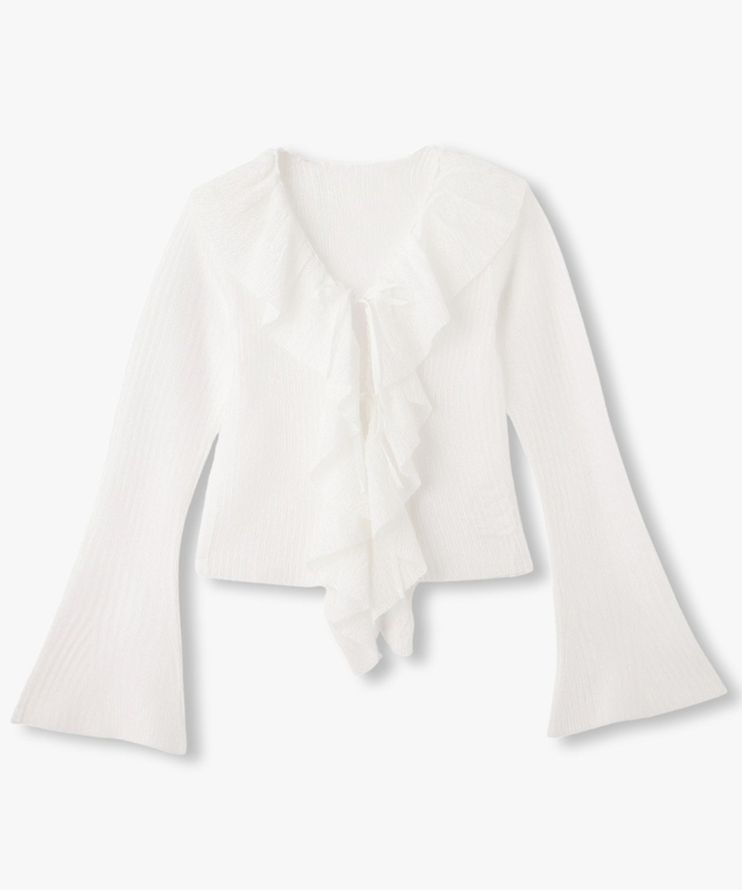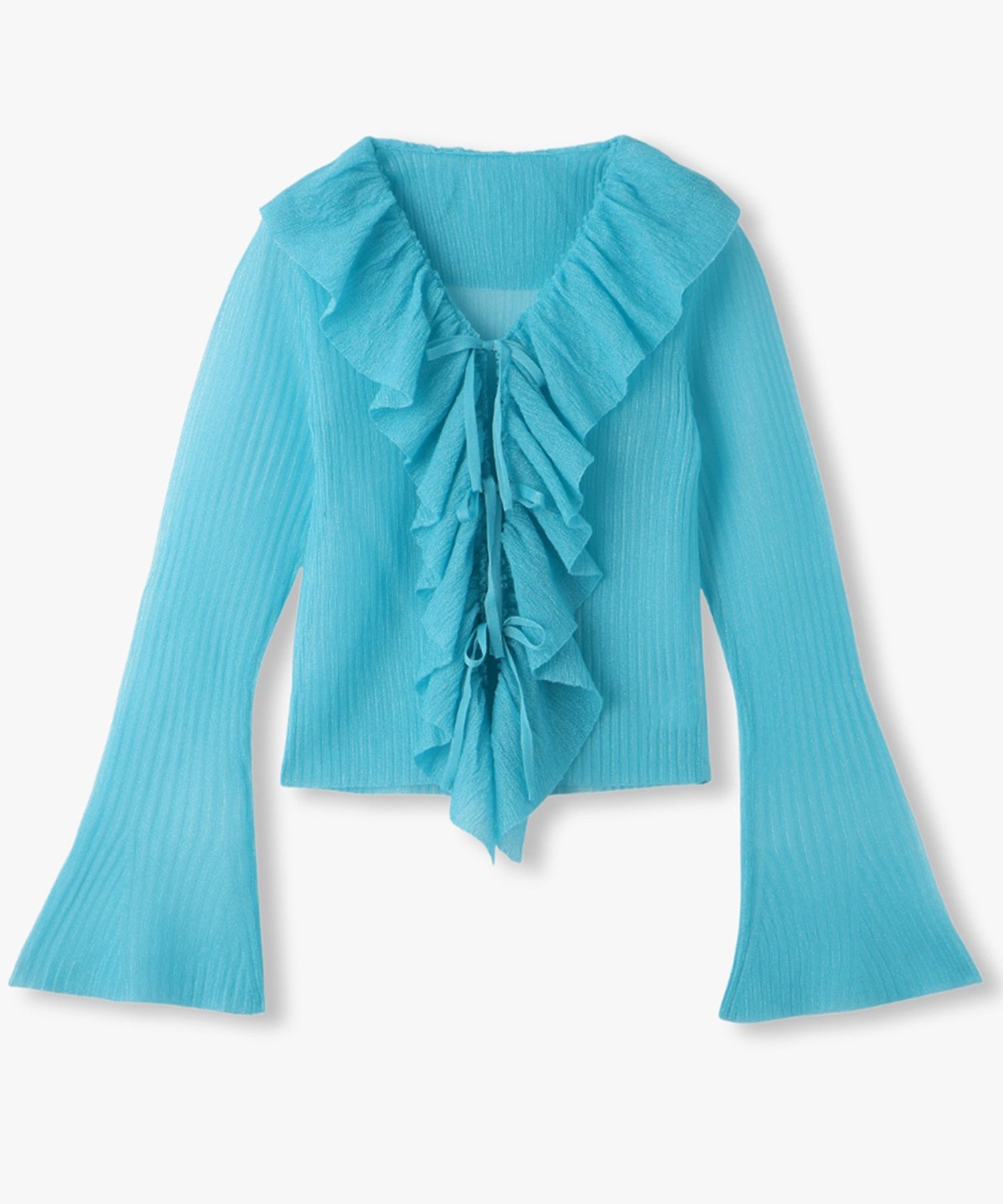 キラキラと光る透け感のある糸で編み上げた、軽やかで女性らしい雰囲気のハイゲージニットカーディガン。流れるようなラッフルのラインと繊細なリボンディテールが、マーメイドのような幻想的な魅力を演出します。爽やかなカラーリングと涼しげな素材感が、シーズンムードを高めてくれる一着です。
