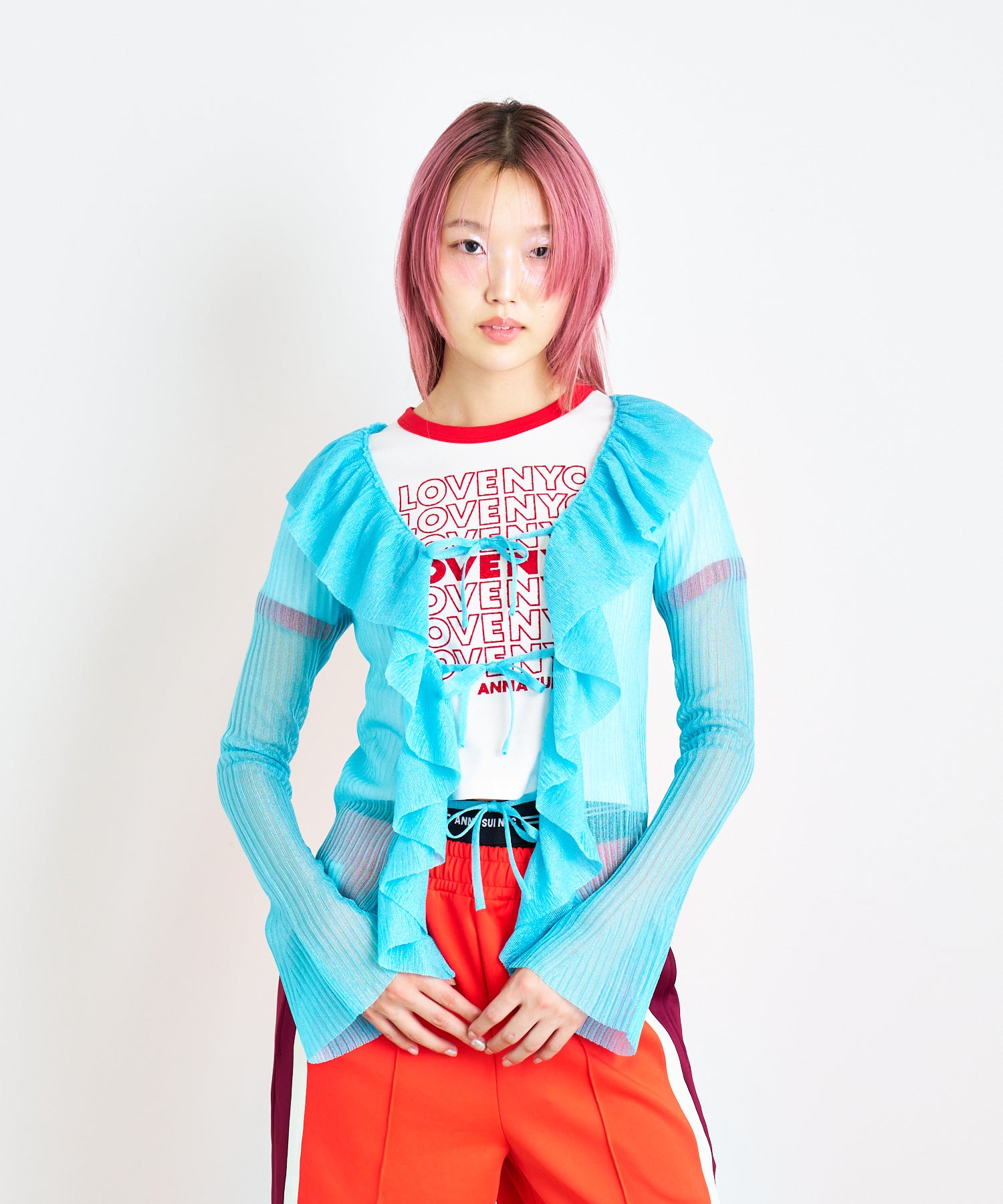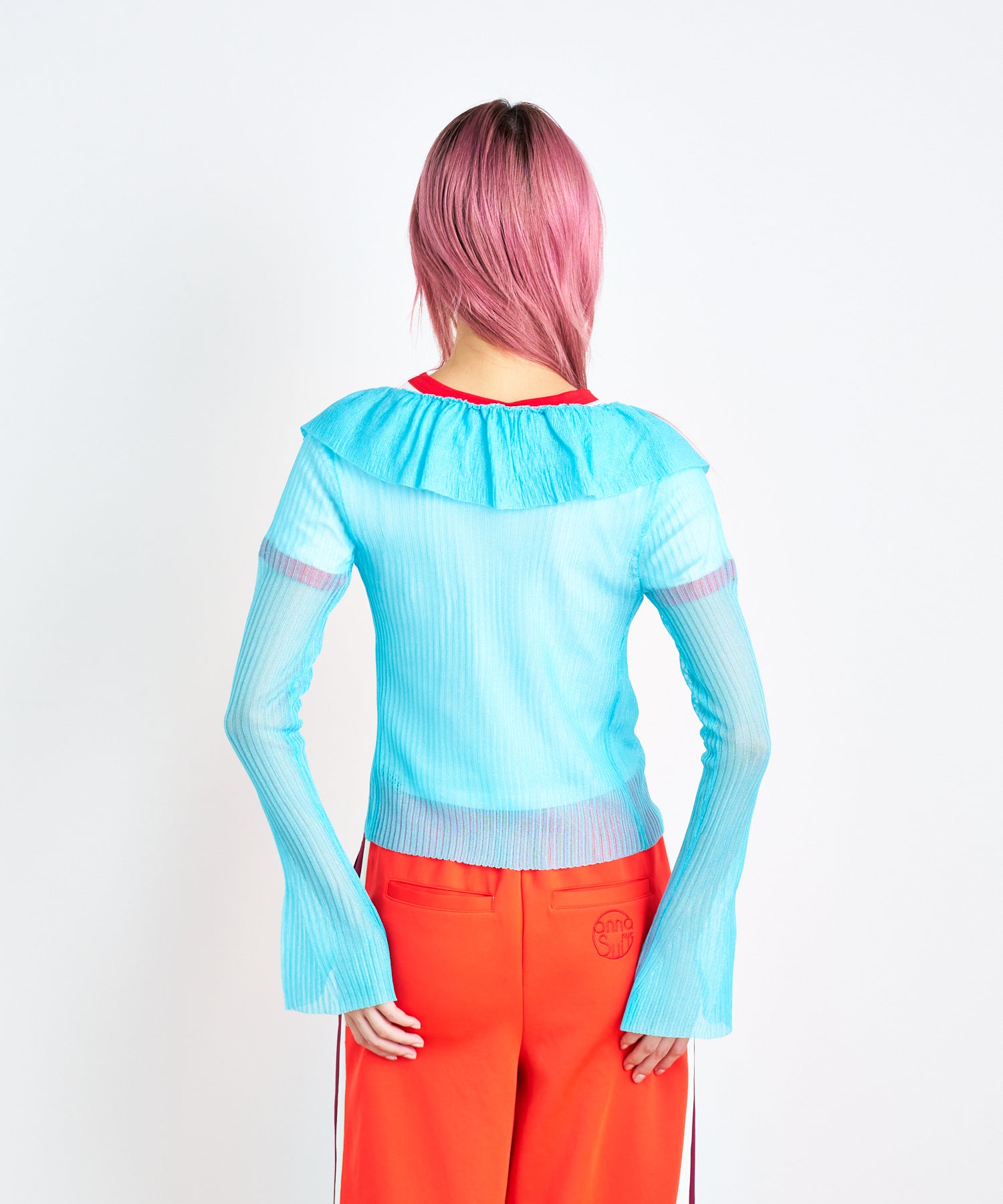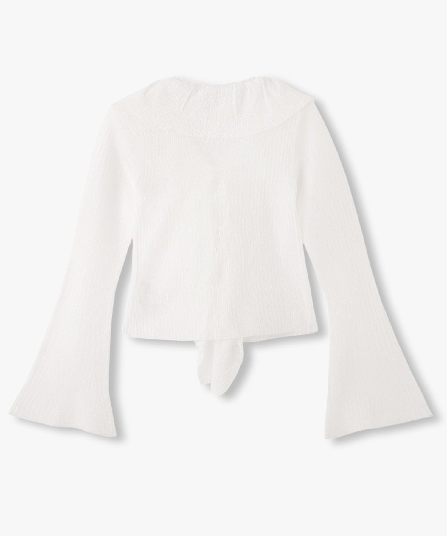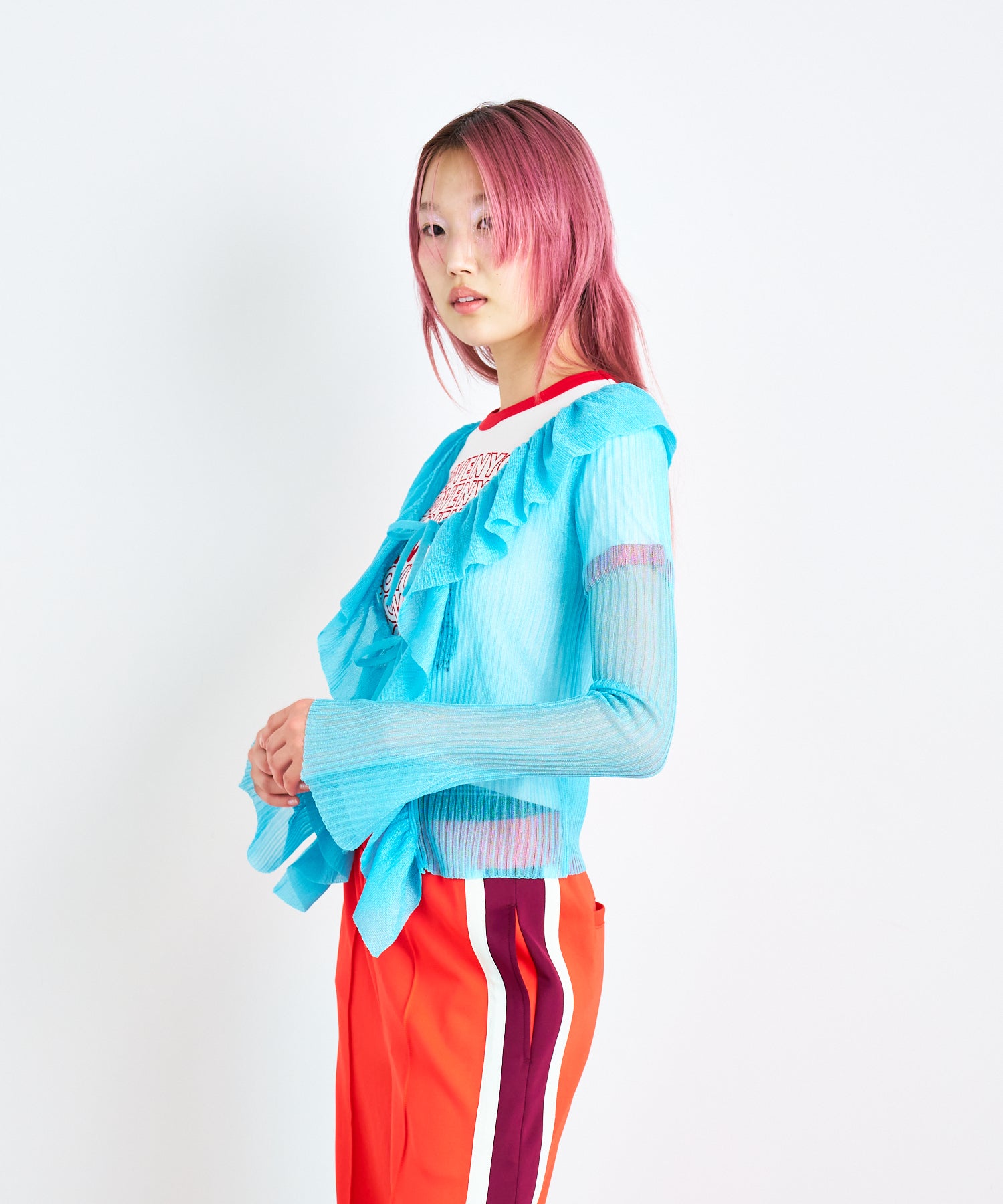 キラキラと光る透け感のある糸で編み上げた、軽やかで女性らしい雰囲気のハイゲージニットカーディガン。流れるようなラッフルのラインと繊細なリボンディテールが、マーメイドのような幻想的な魅力を演出します。爽やかなカラーリングと涼しげな素材感が、シーズンムードを高めてくれる一着です。