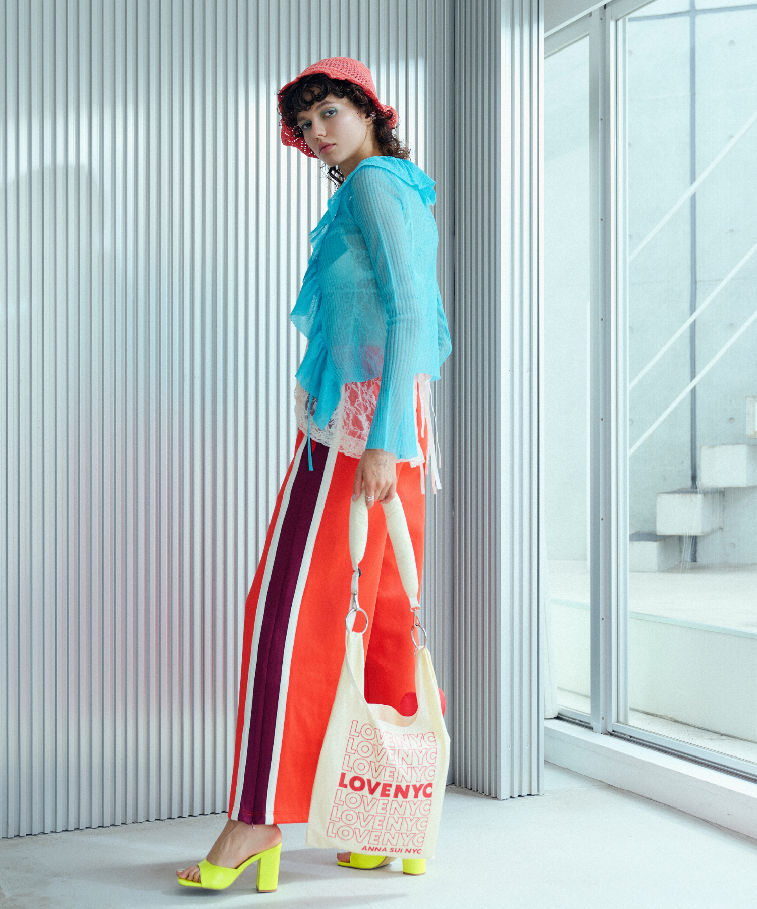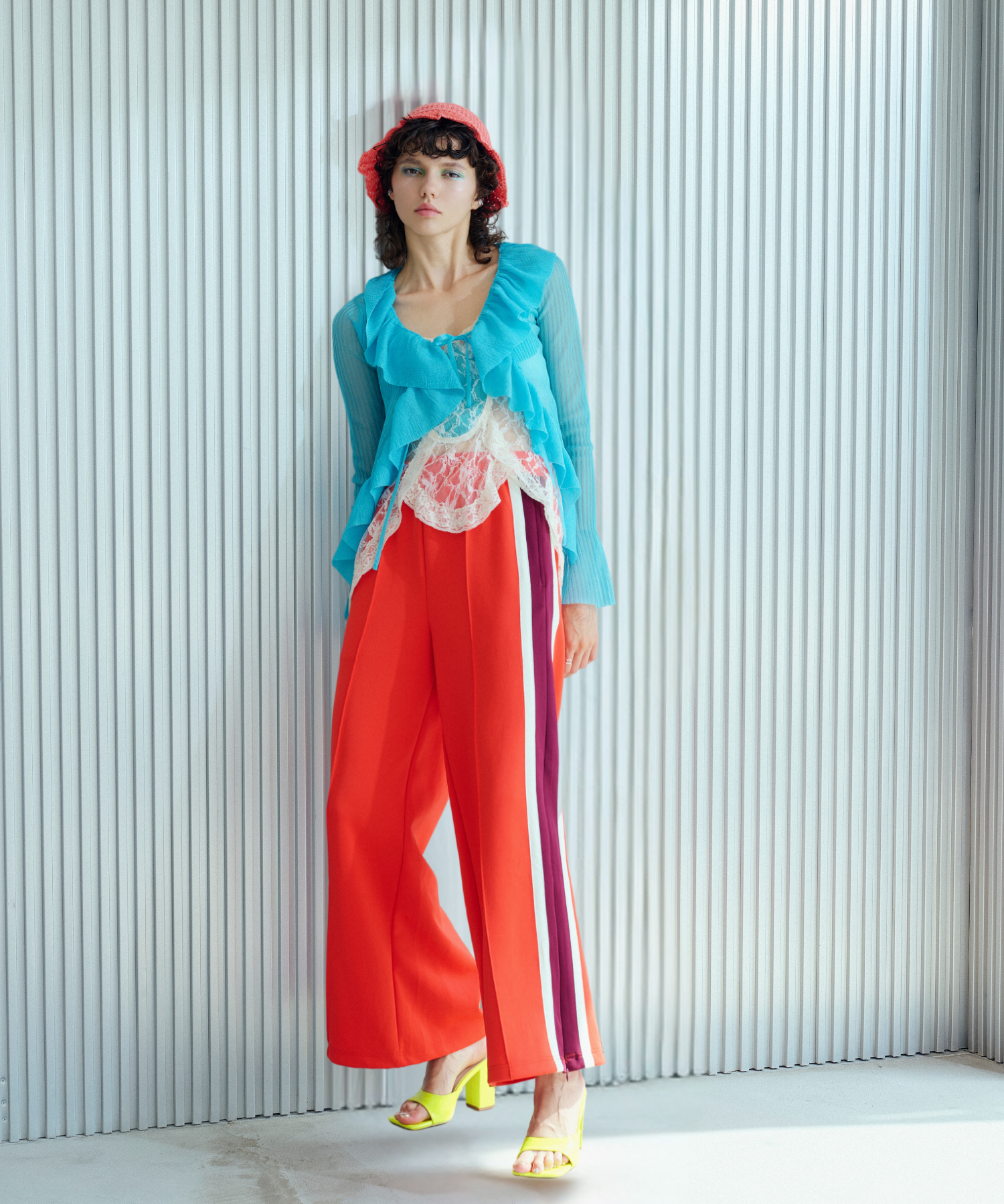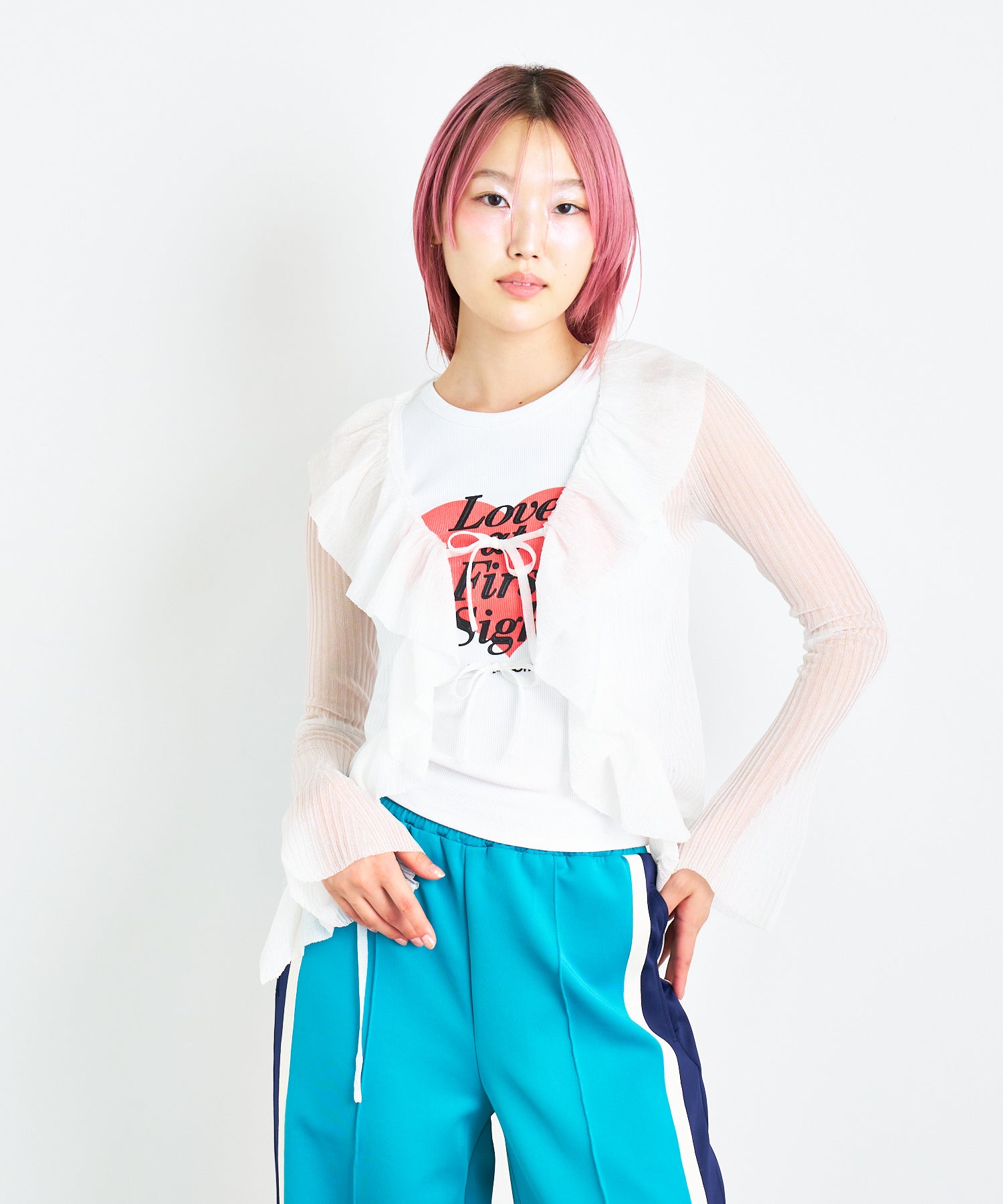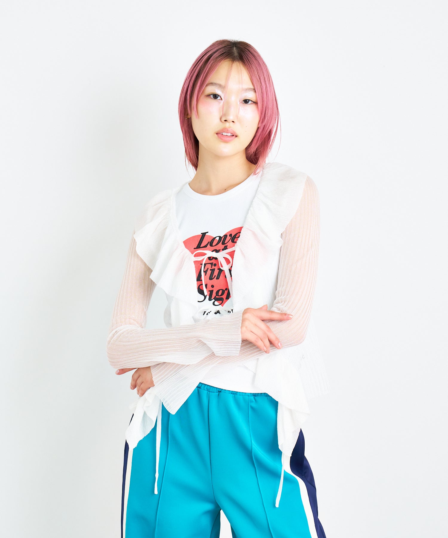 キラキラと光る透け感のある糸で編み上げた、軽やかで女性らしい雰囲気のハイゲージニットカーディガン。流れるようなラッフルのラインと繊細なリボンディテールが、マーメイドのような幻想的な魅力を演出します。爽やかなカラーリングと涼しげな素材感が、シーズンムードを高めてくれる一着です。