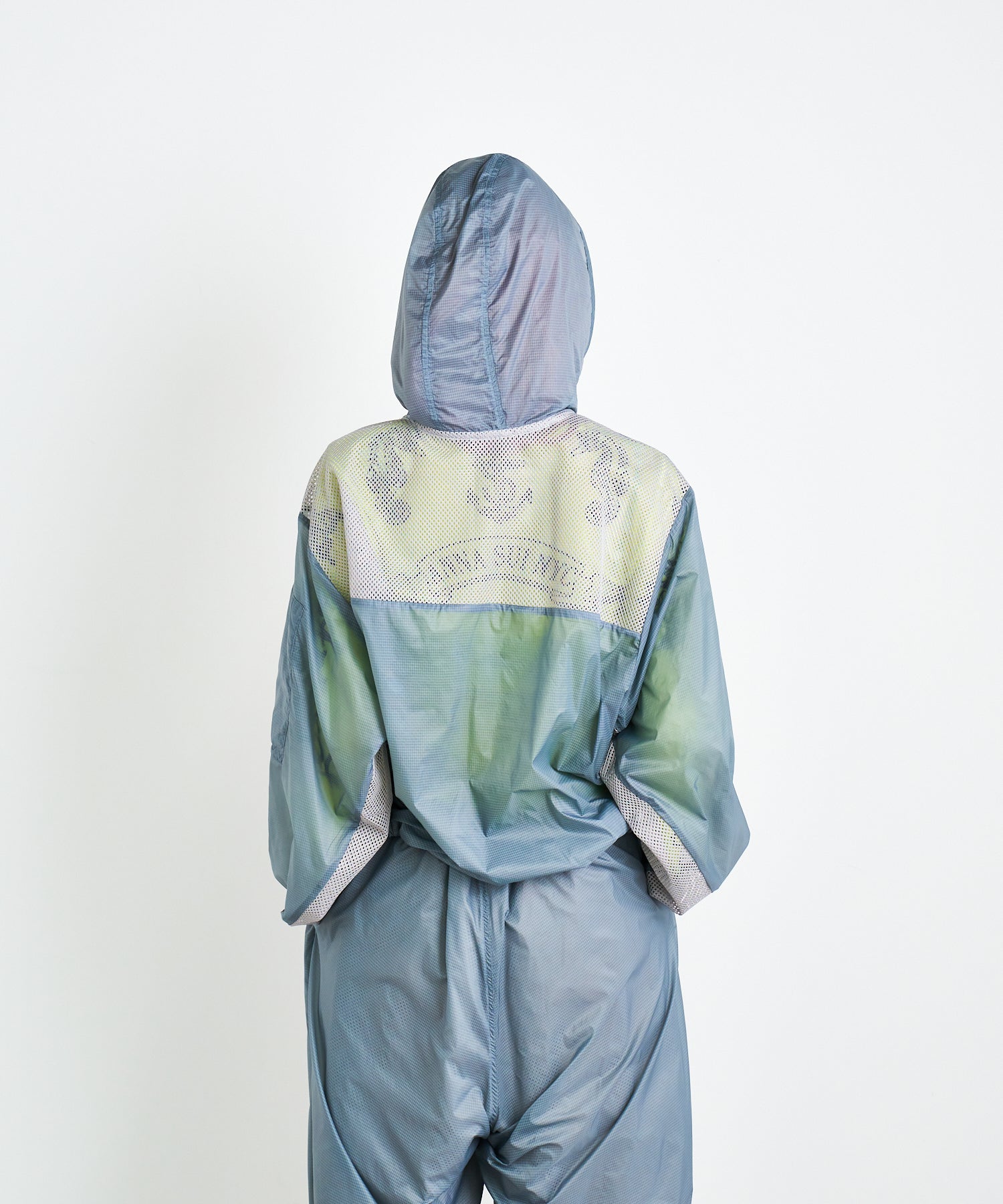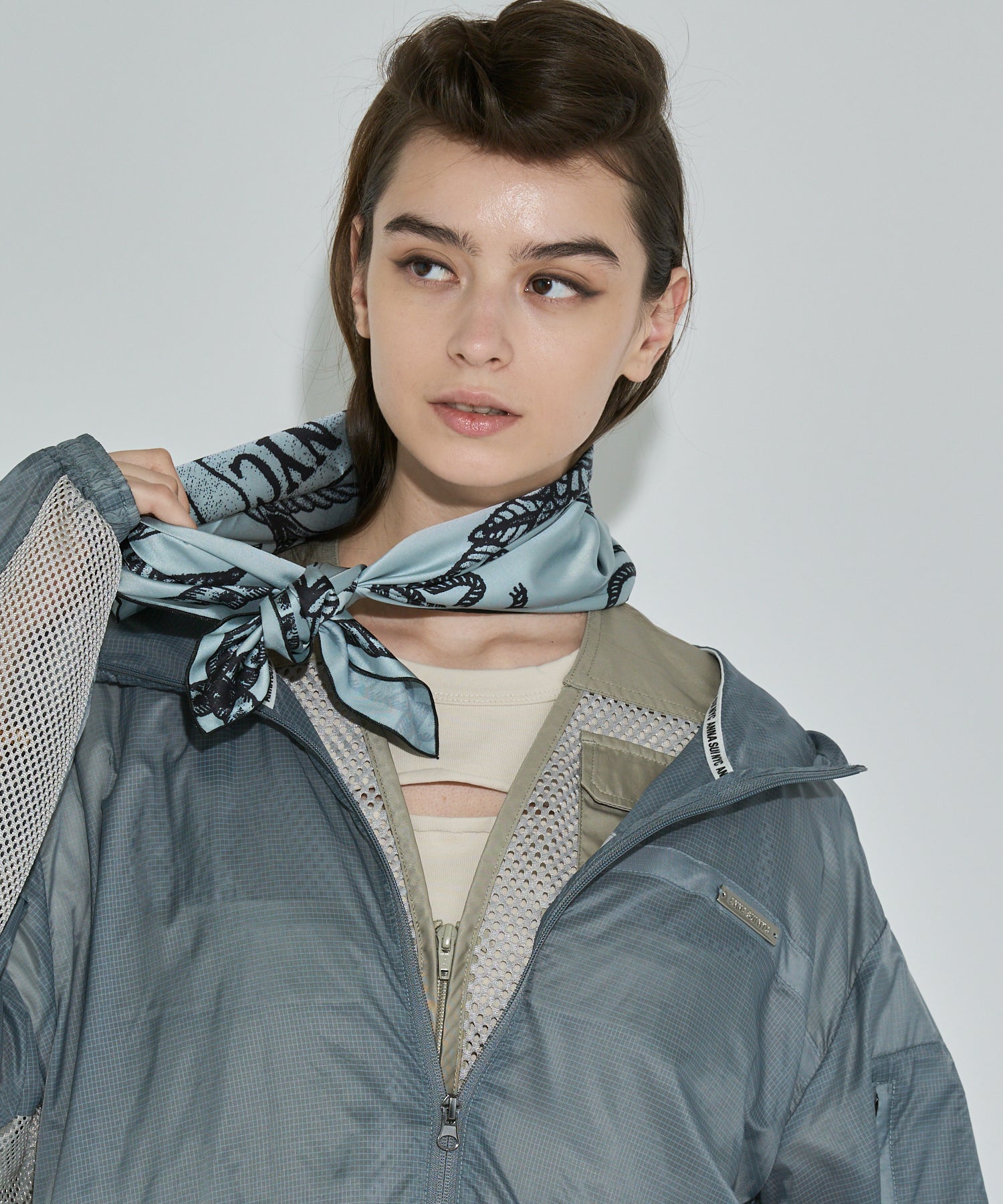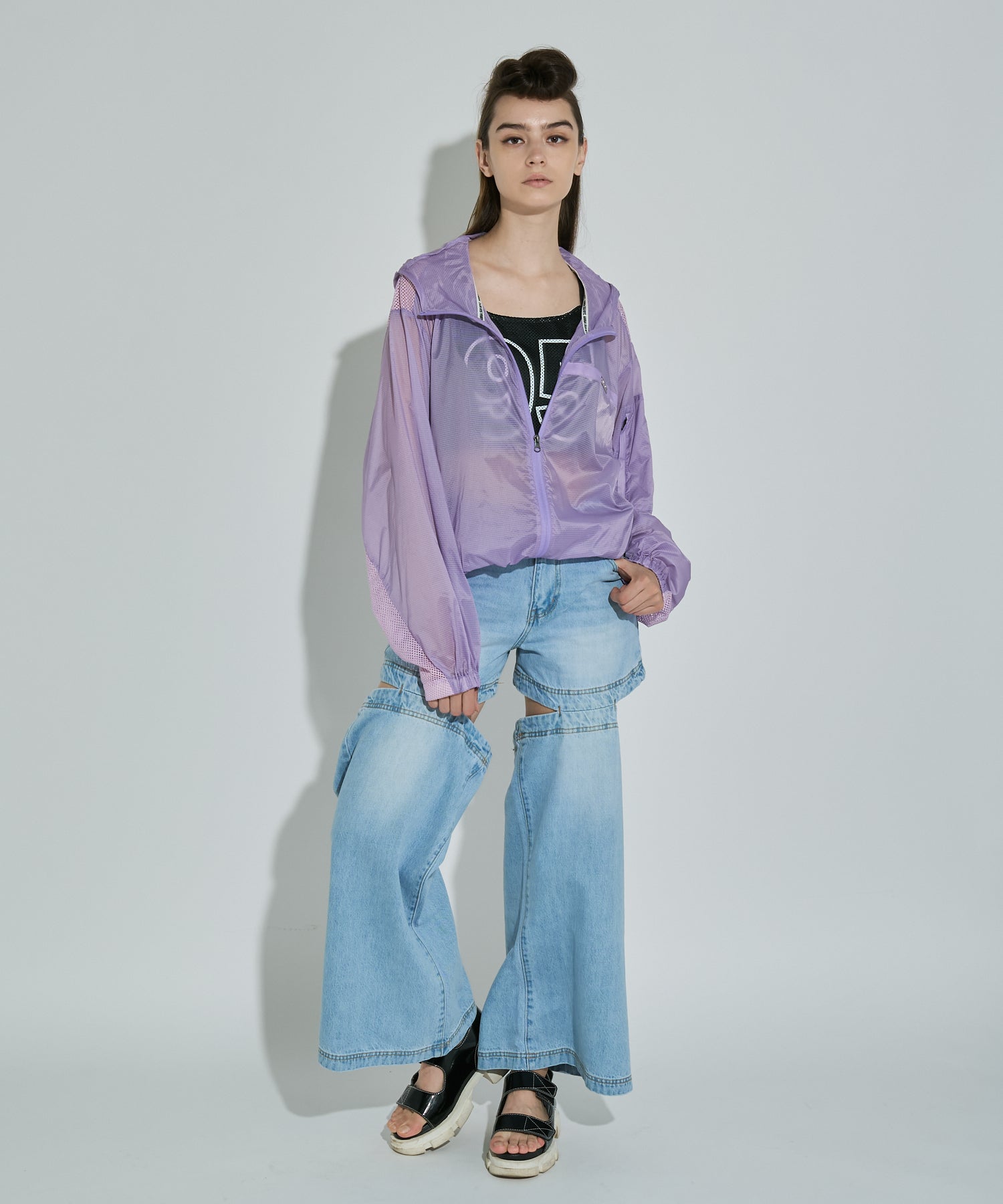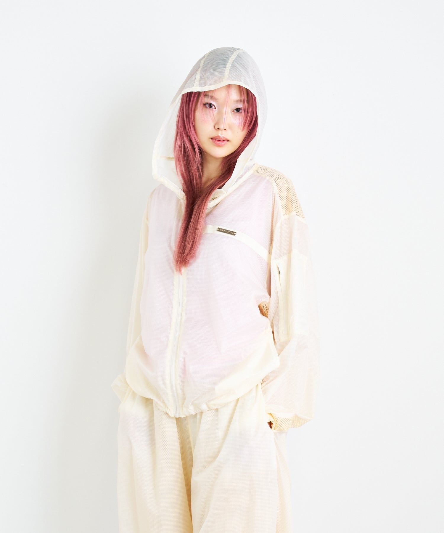 軽量で適度なハリ感と柔らかさを兼ね揃えたシアーリップストップ素材に、通気性の高いメッシュを切り替えた、機能性とデザイン性を兼ね備えた素材使い。アクティブな素材感ながら、シアーならではのエアリーな表情が、ヘルシーで女性らしいバランスを演出します。