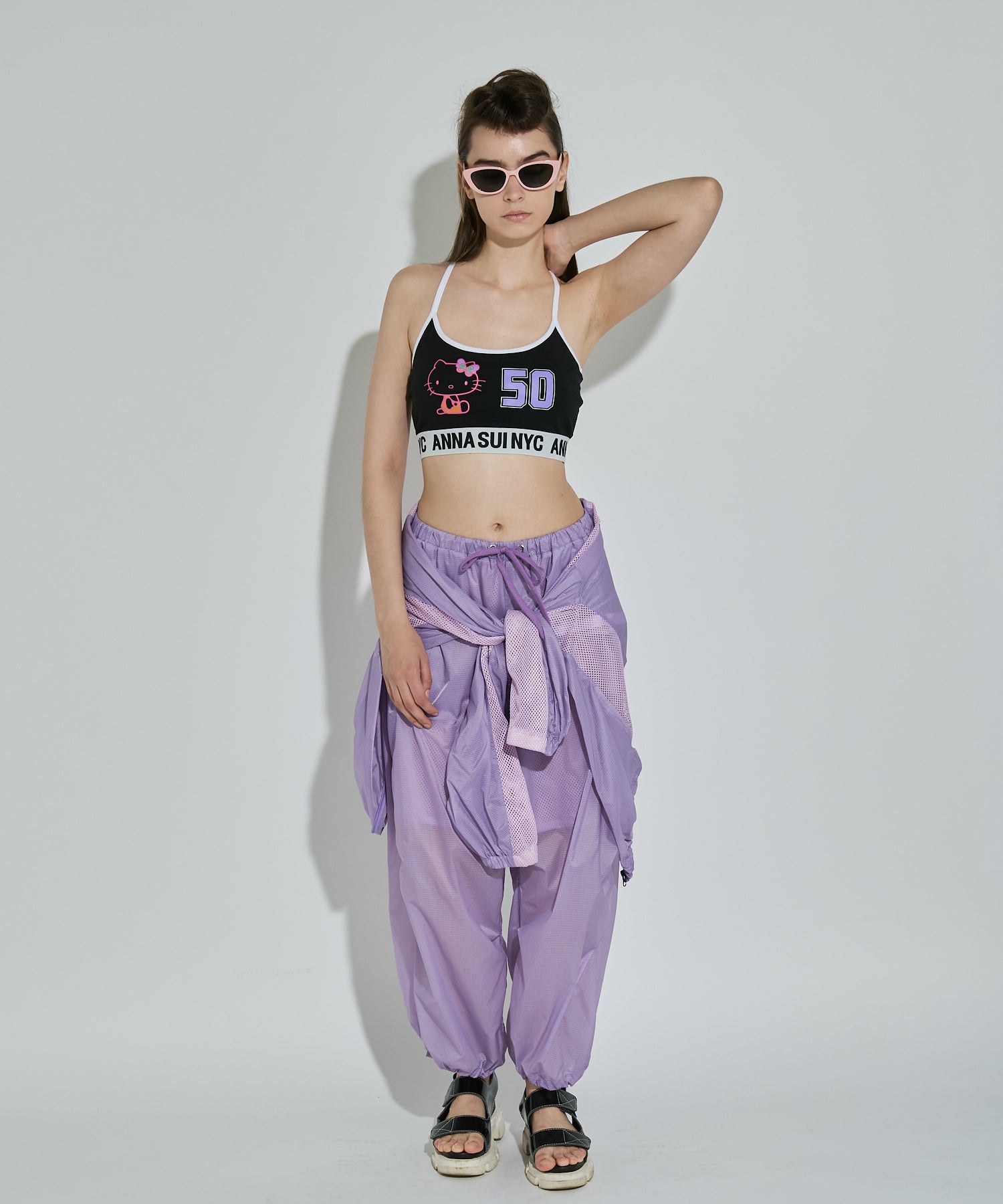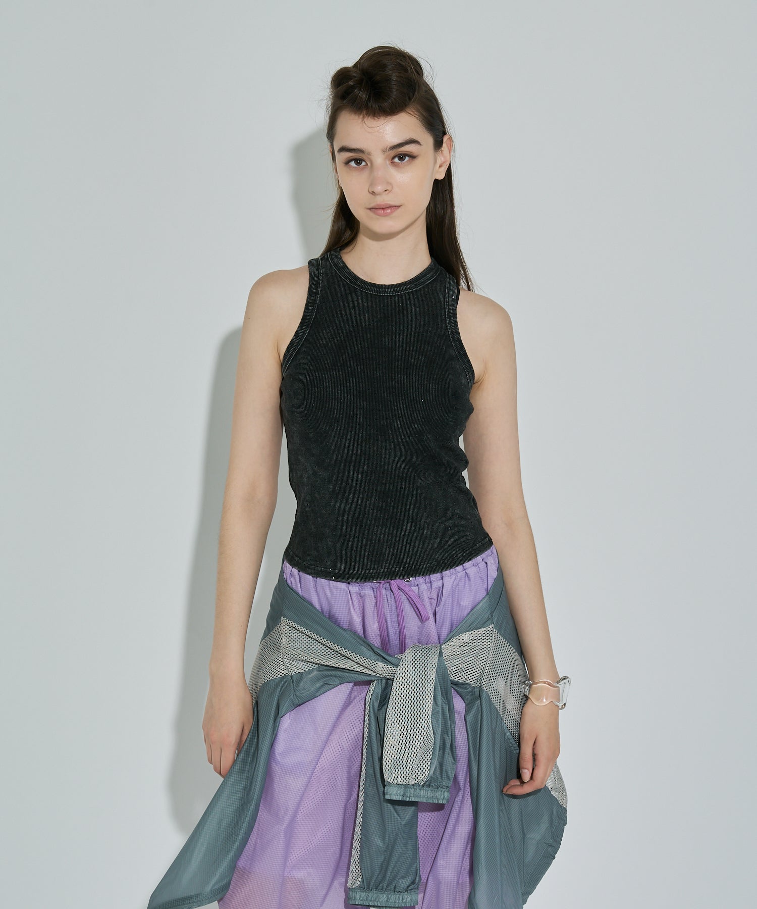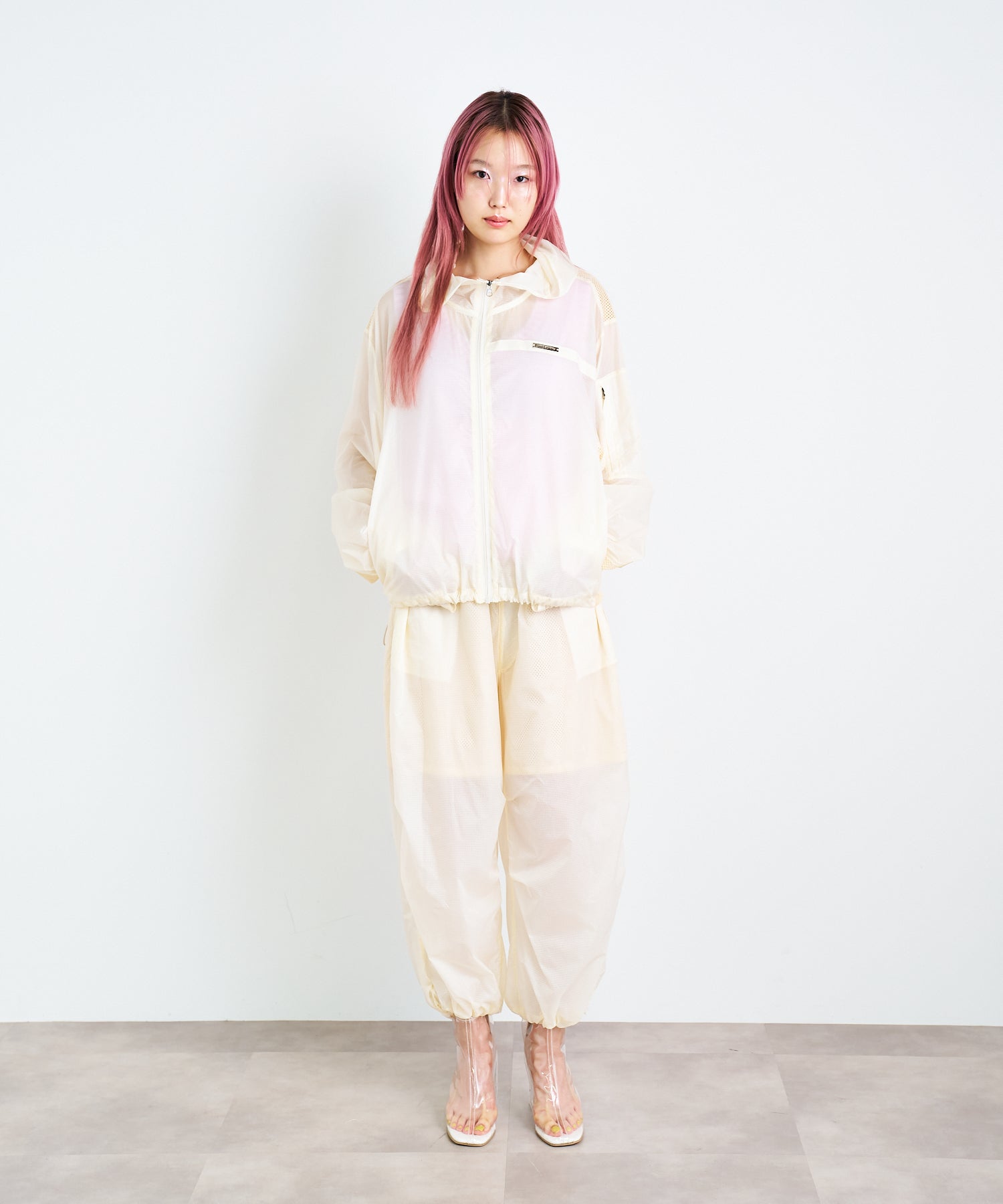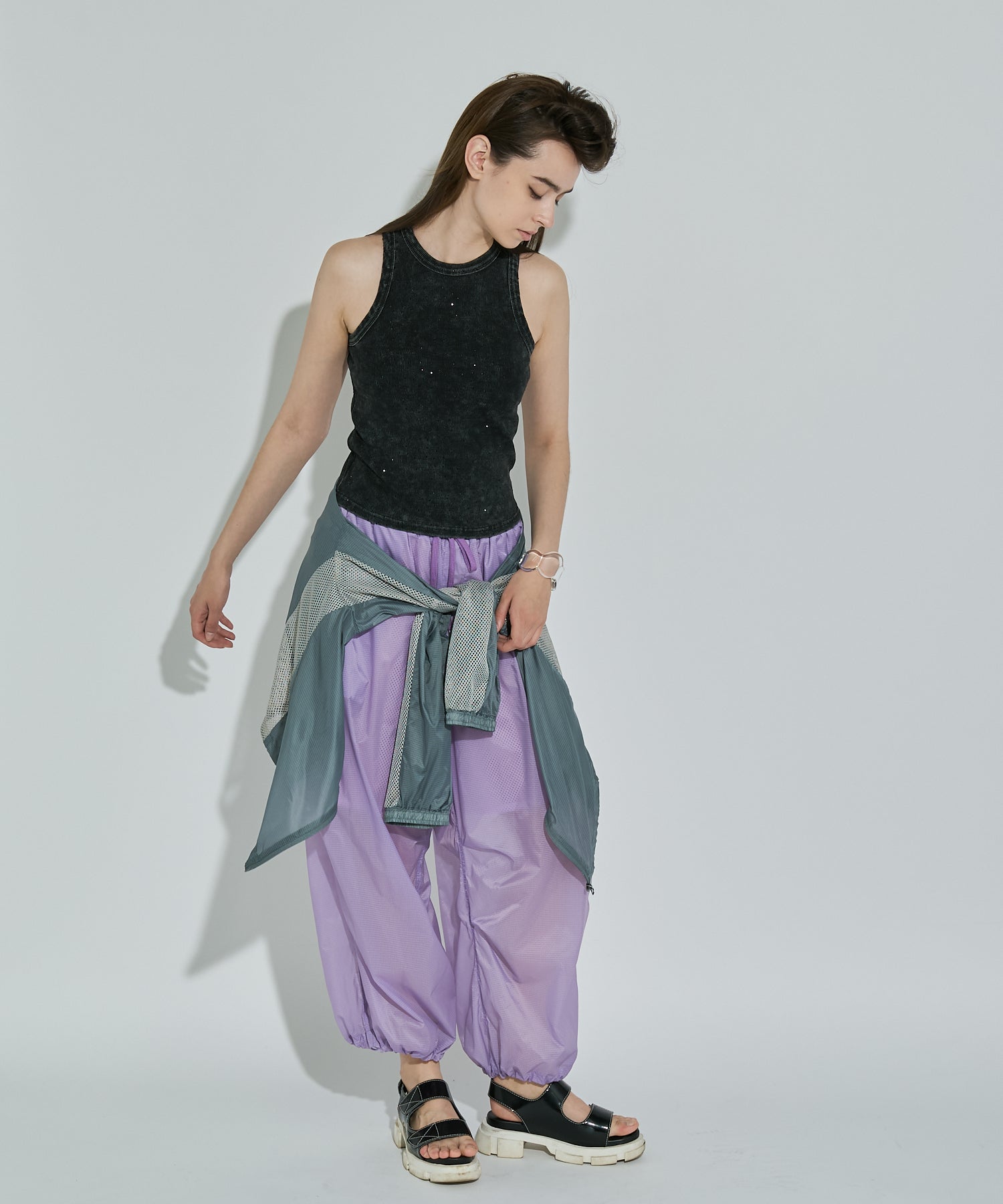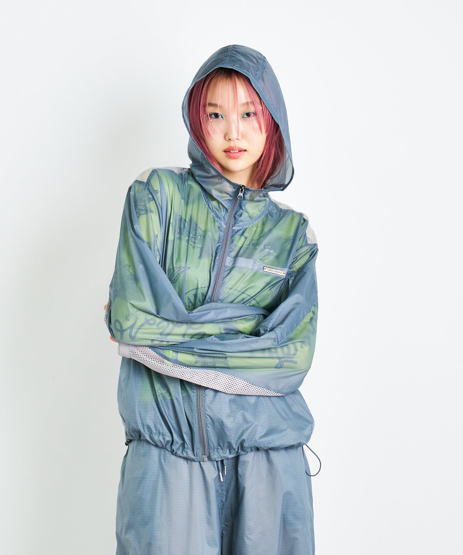 軽量で適度なハリ感と柔らかさを兼ね揃えたシアーリップストップ素材に、通気性の高いメッシュを切り替えた、機能性とデザイン性を兼ね備えた素材使い。アクティブな素材感ながら、シアーならではのエアリーな表情が、ヘルシーで女性らしいバランスを演出します。