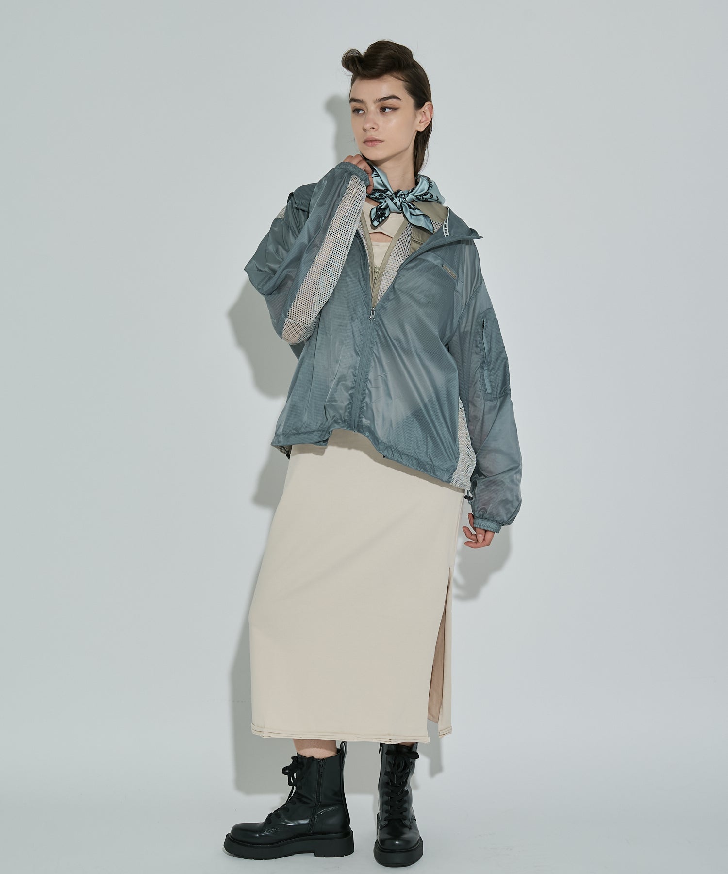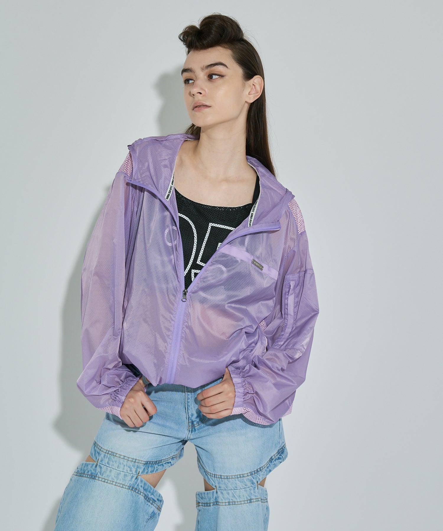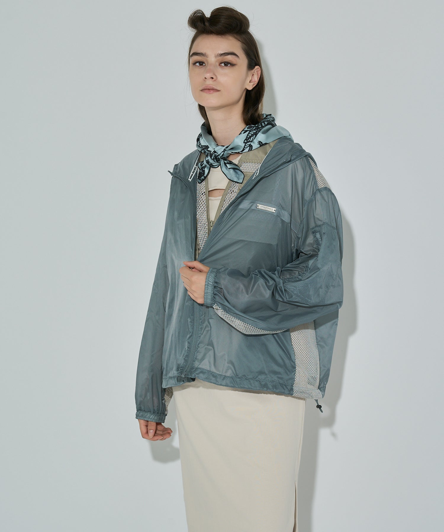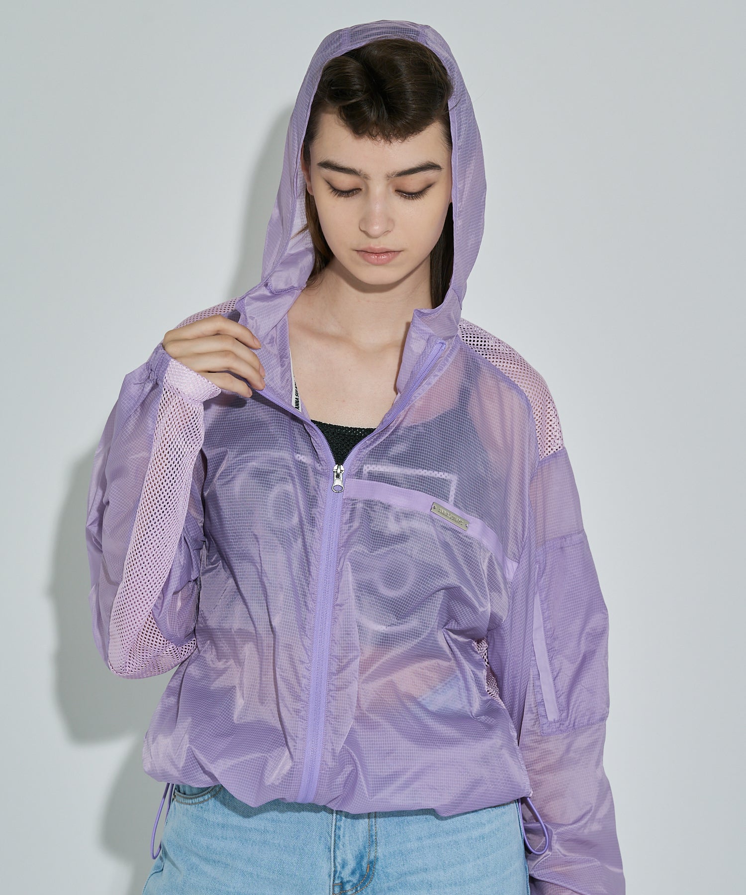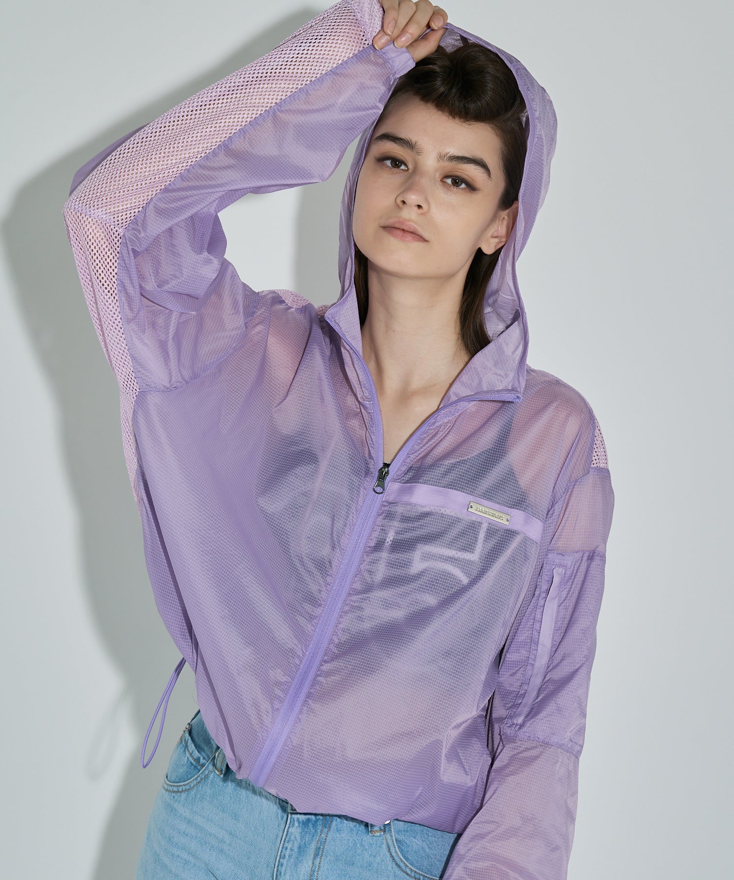 軽やかな透け感が魅力のリップストップジャケット。タフな印象になりがちなスポーティーアイテムを、軽やかな素材と計算されたシルエットで洗練されたムードに。胸元や背中、袖にはメッシュで切り替えを入れてスポーティーなアクセントを効かせつつも、全体はどこかセンシュアルな印象に。素材のエアリー感を際立たせるオーバーサイズのゆったりシルエットは、ラフに羽織るだけで旬のムードに。裾は絞れる仕様でシルエットにアレンジを効かせることも可能。
