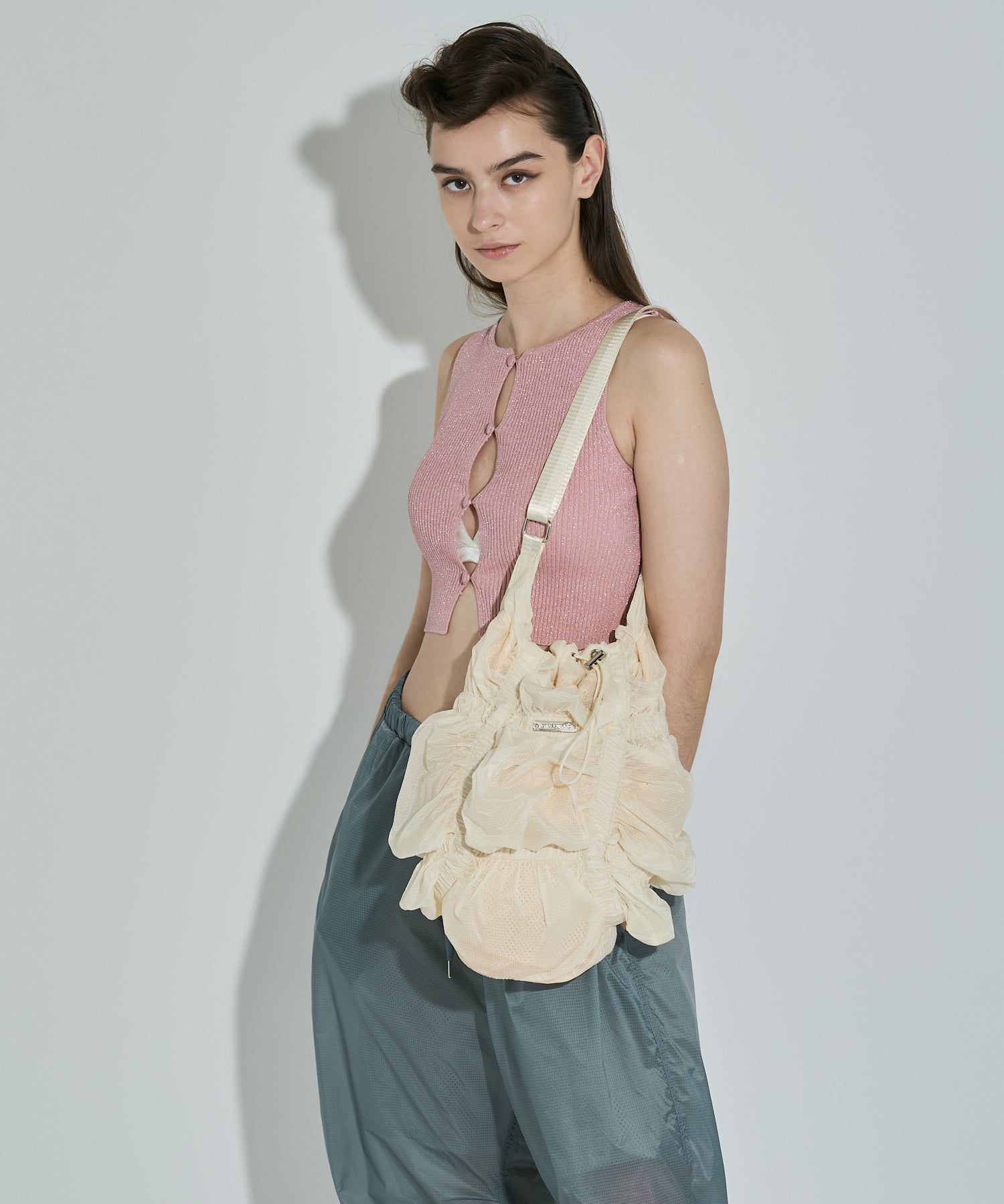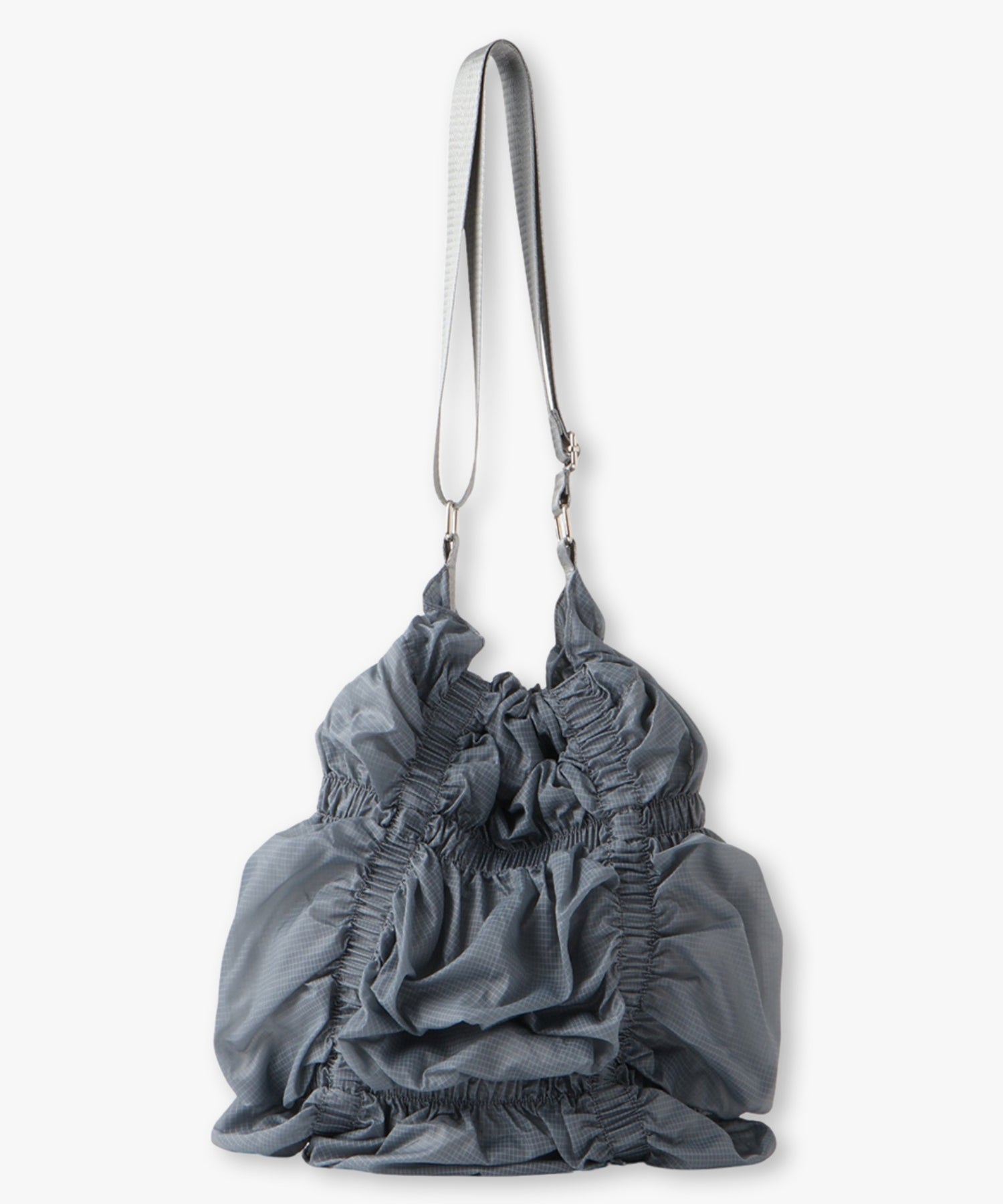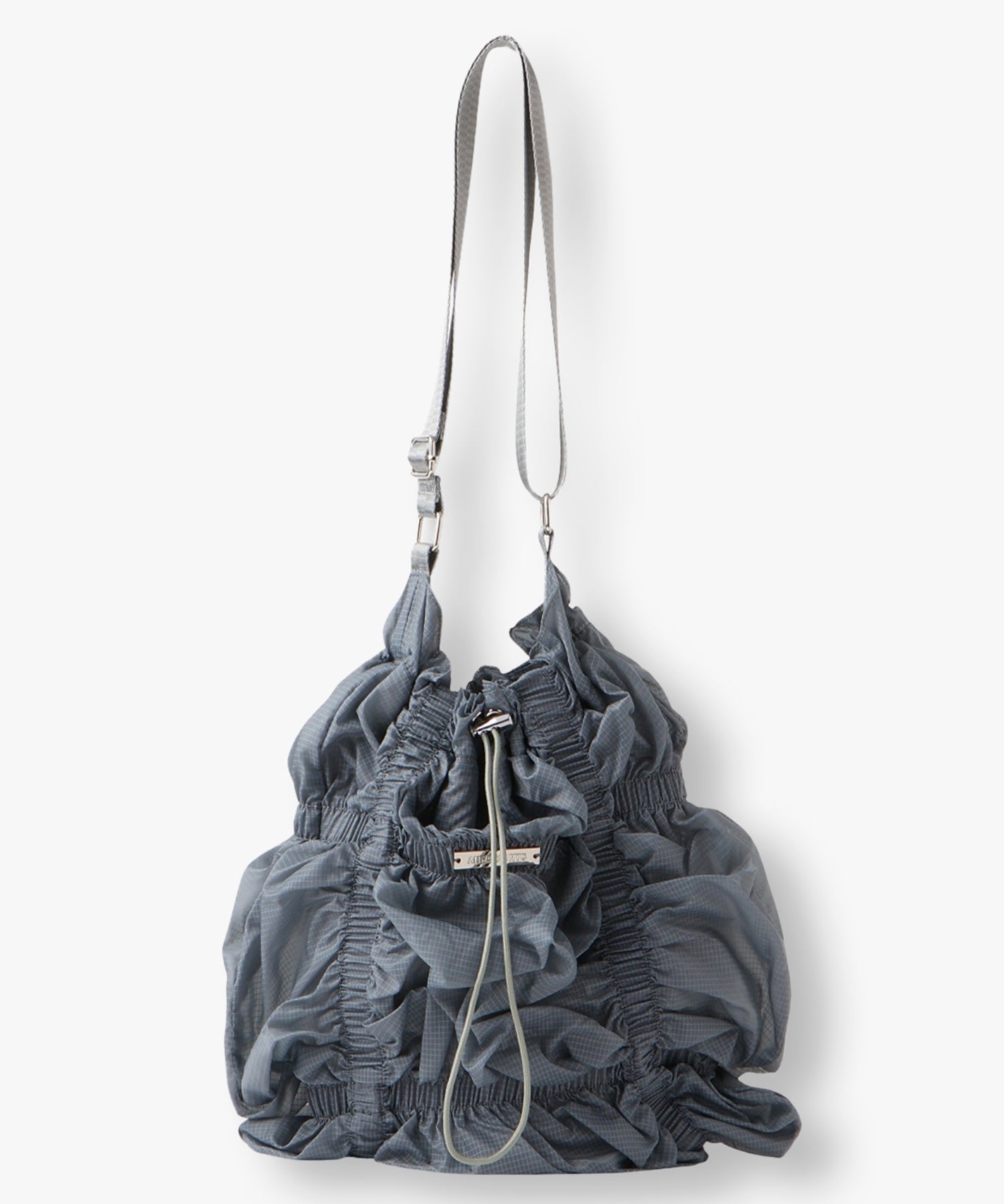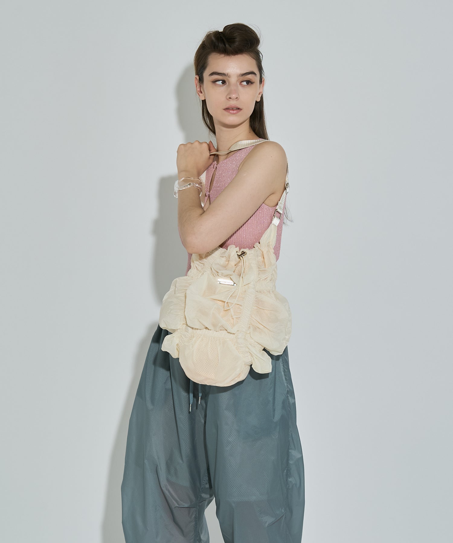 存分に施されたゴムギャザーによって表現された立体感のあるフォルムが魅力的なシャーリングバック。様々なスタイリングに合わせやすいようにあえてスポーティーな雰囲気の素材を使用しました。スタイリングに遊び心を加えてくれるアクセサリー感覚でお持ちいただけるバックです。