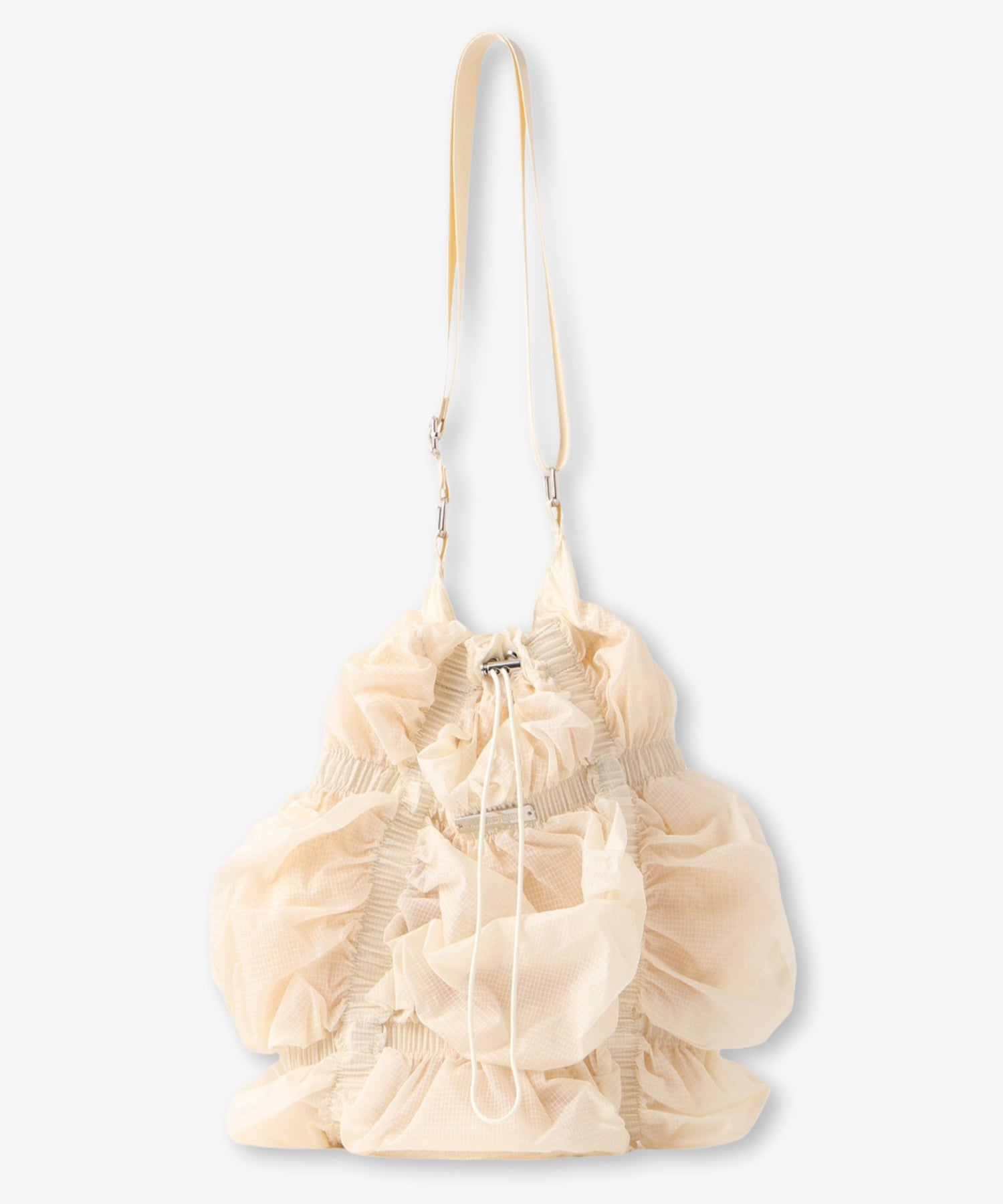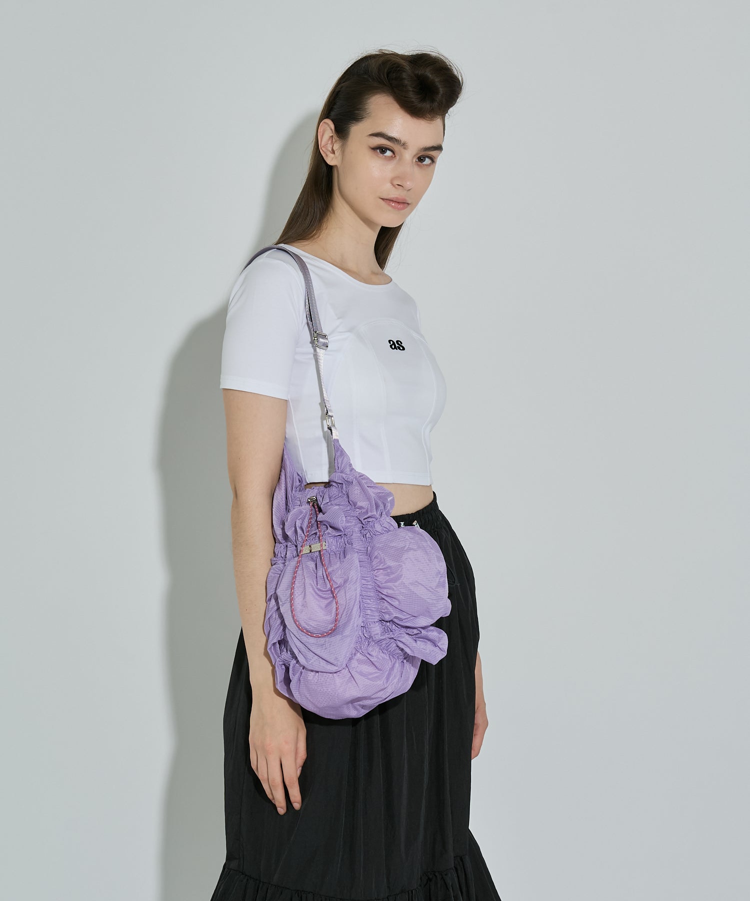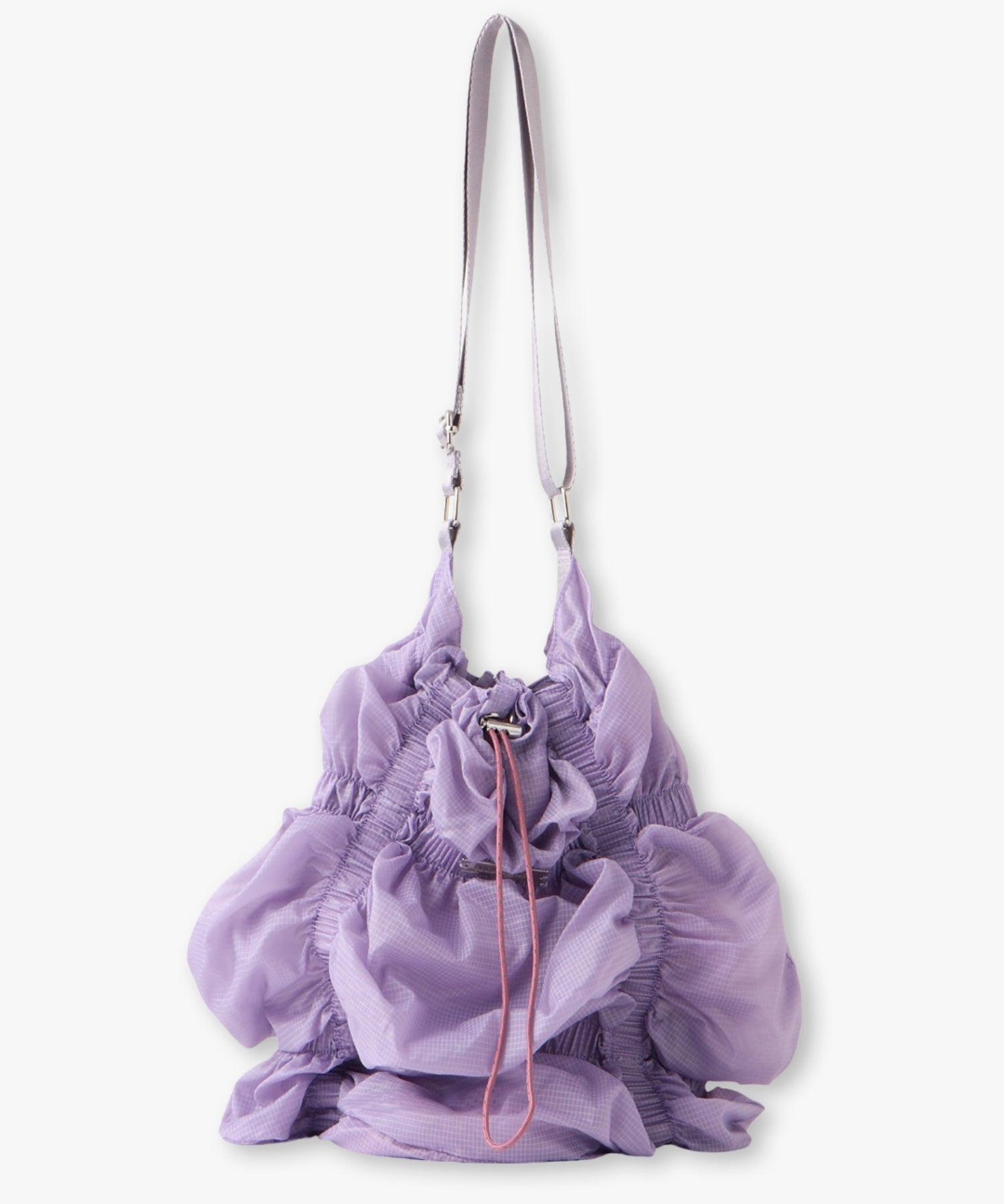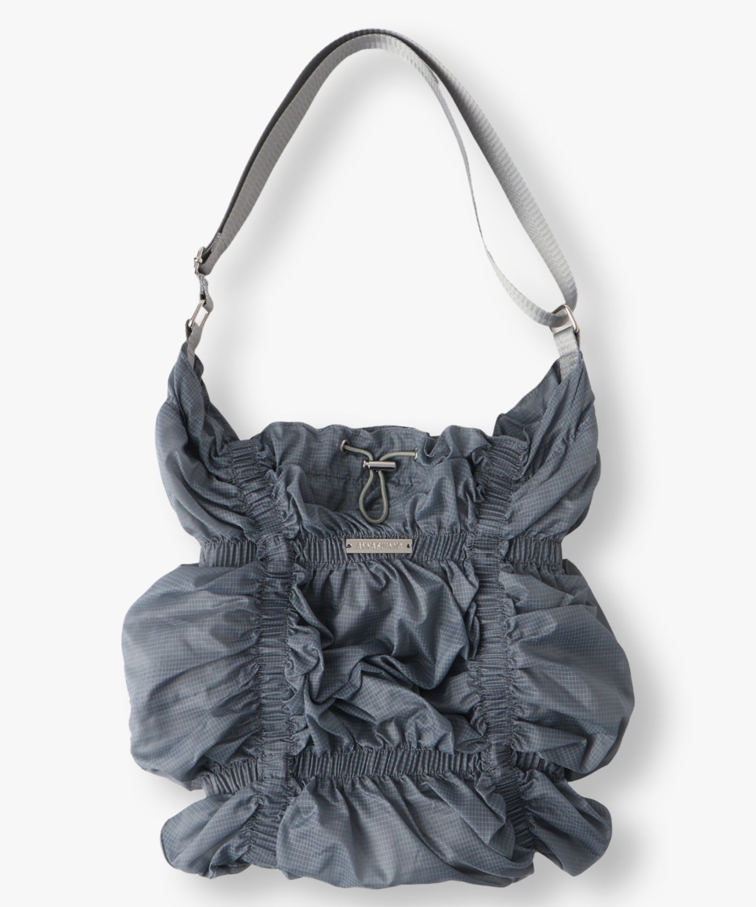 存分に施されたゴムギャザーによって表現された立体感のあるフォルムが魅力的なシャーリングバック。様々なスタイリングに合わせやすいようにあえてスポーティーな雰囲気の素材を使用しました。スタイリングに遊び心を加えてくれるアクセサリー感覚でお持ちいただけるバックです。
