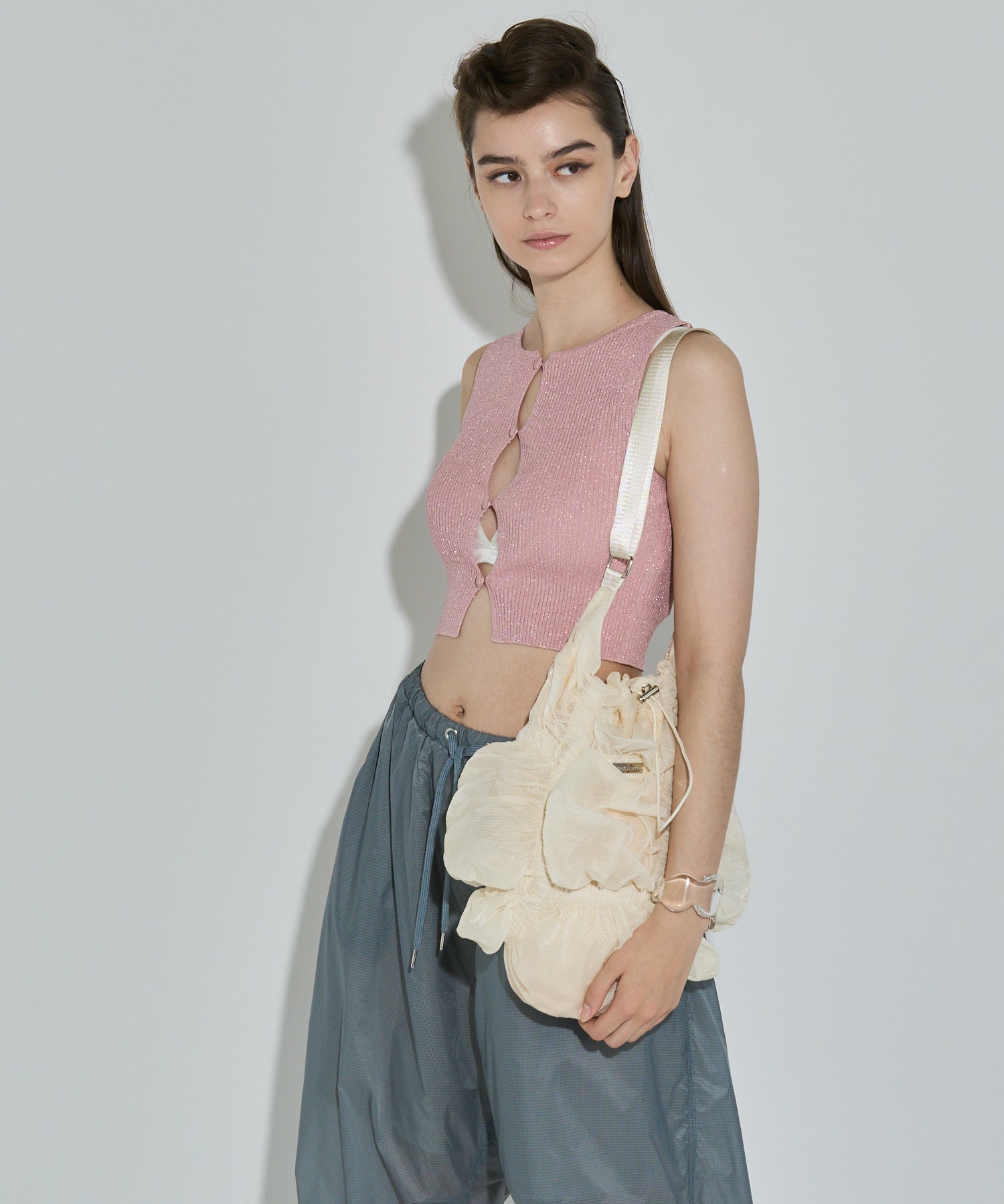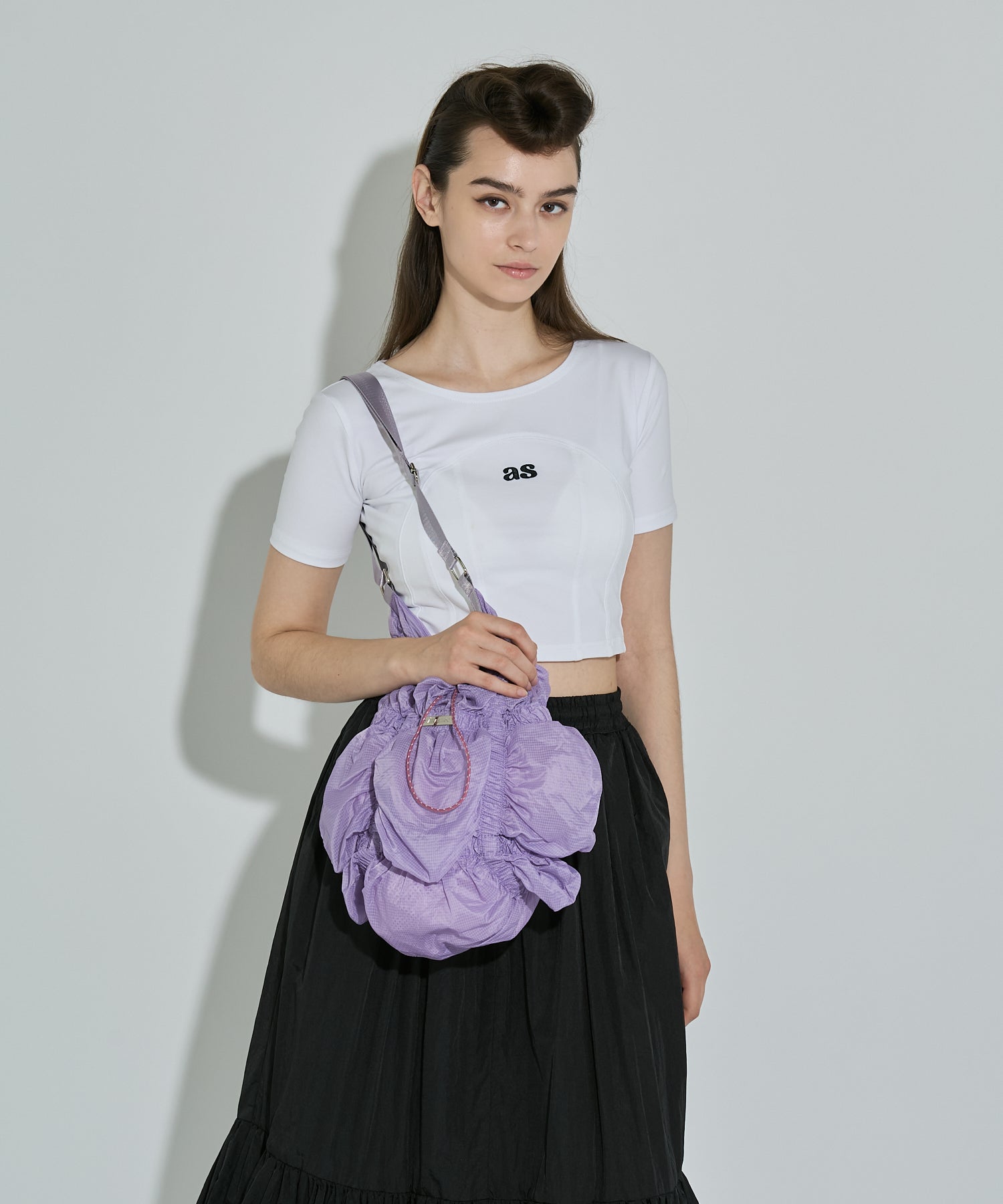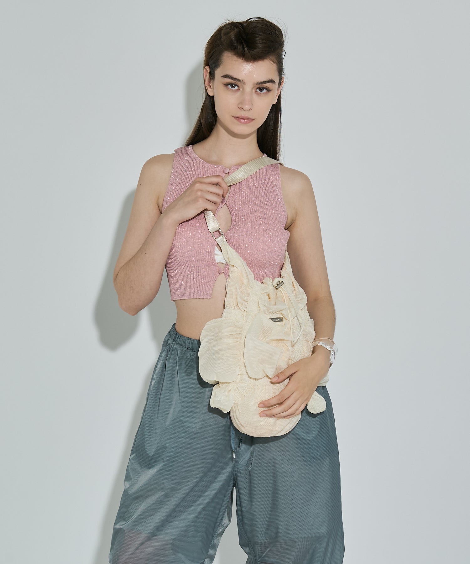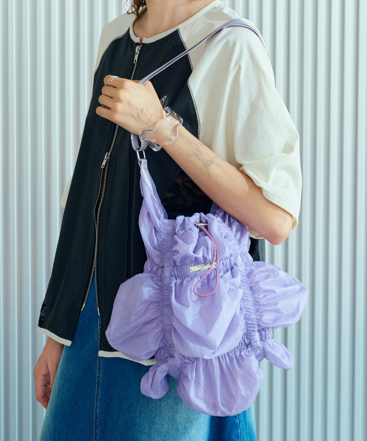 存分に施されたゴムギャザーによって表現された立体感のあるフォルムが魅力的なシャーリングバック。様々なスタイリングに合わせやすいようにあえてスポーティーな雰囲気の素材を使用しました。スタイリングに遊び心を加えてくれるアクセサリー感覚でお持ちいただけるバックです。