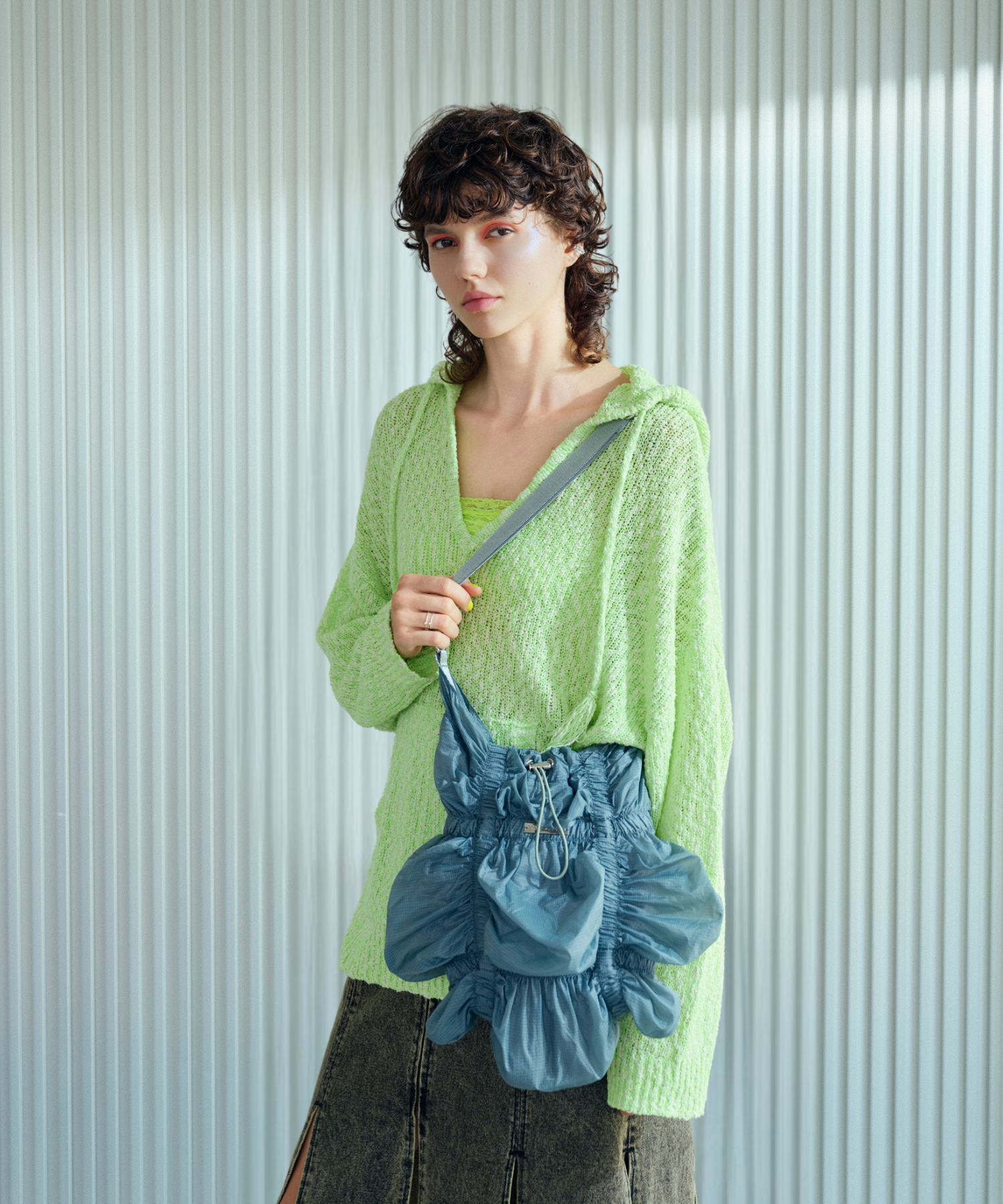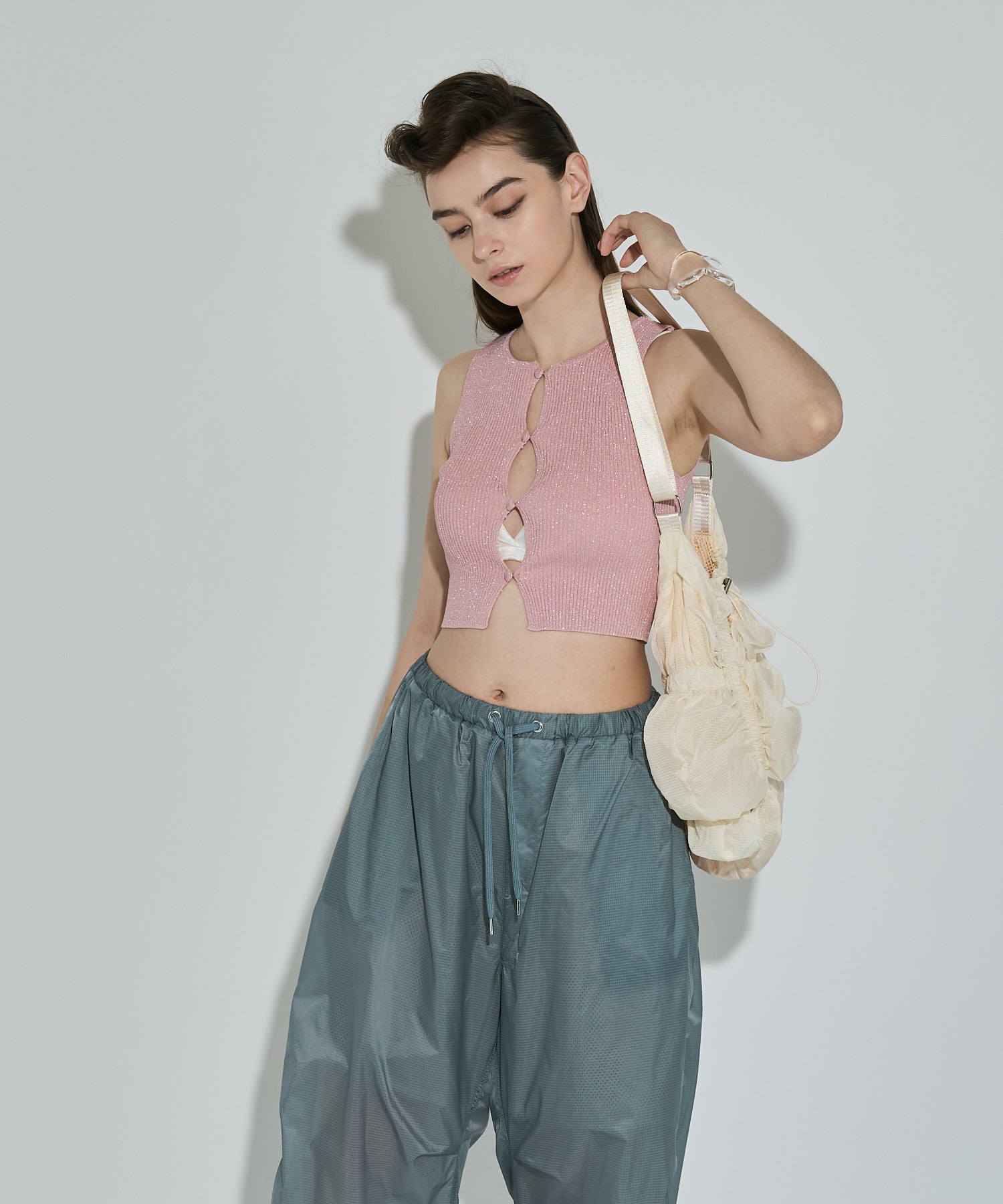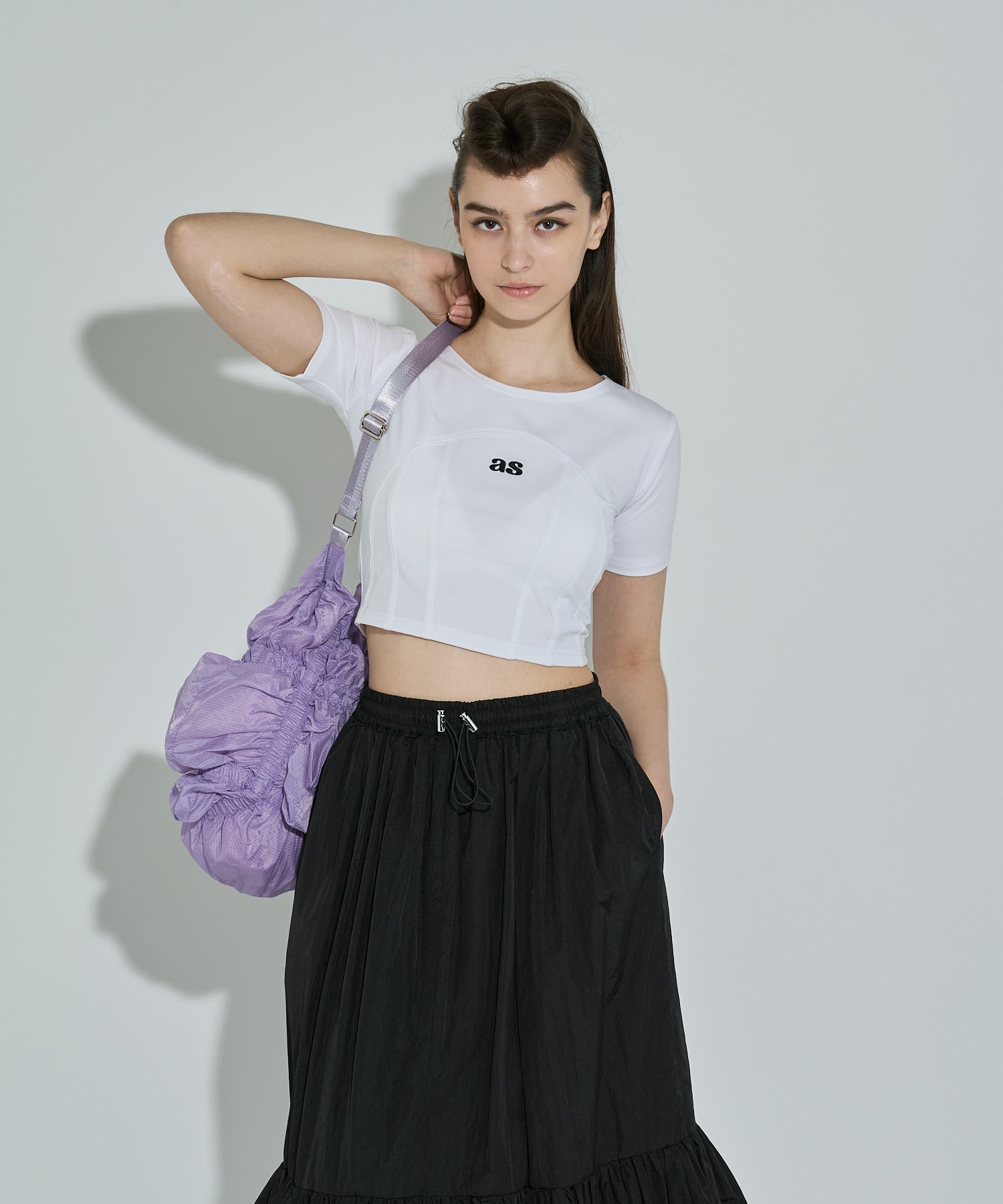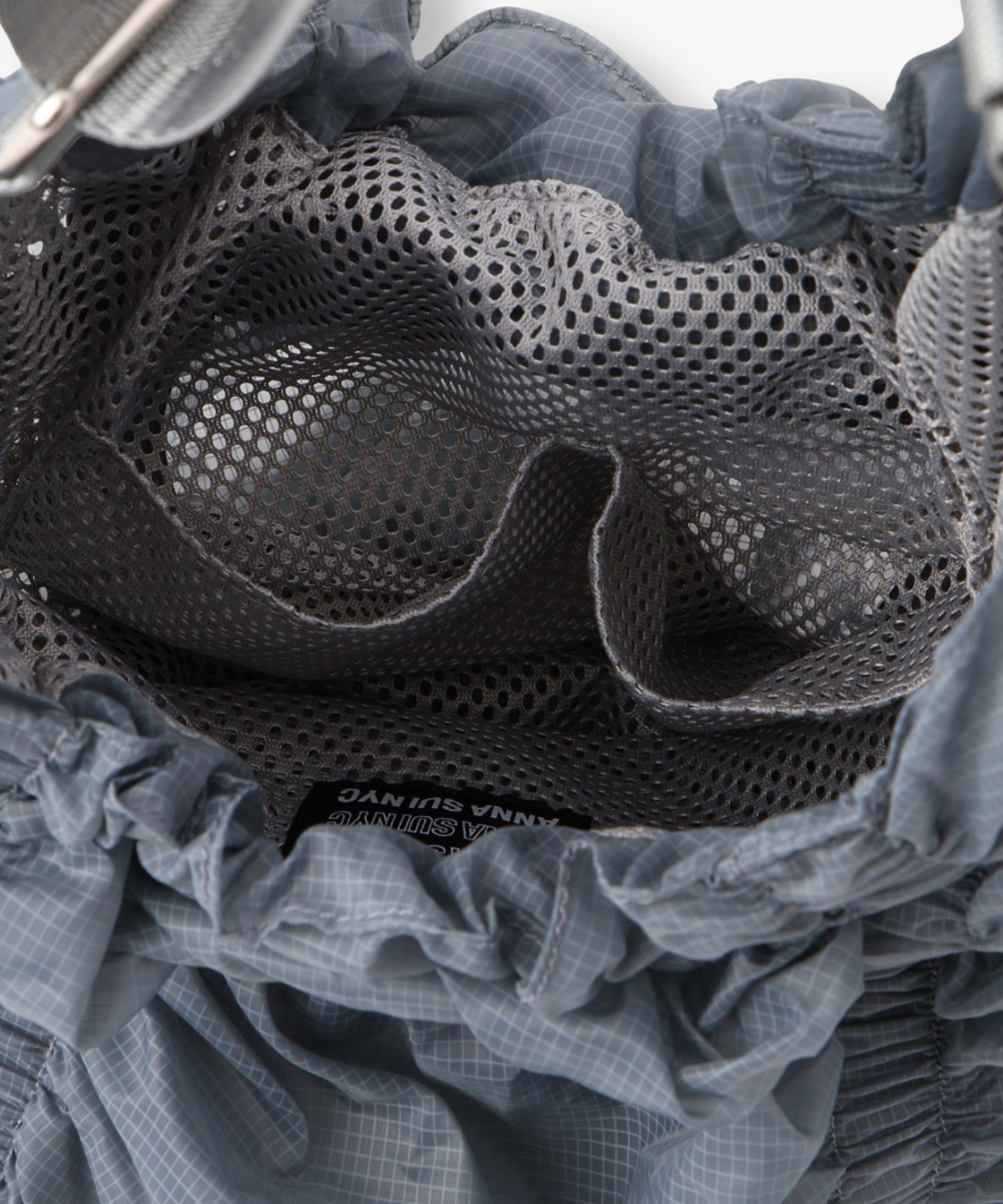 存分に施されたゴムギャザーによって表現された立体感のあるフォルムが魅力的なシャーリングバック。様々なスタイリングに合わせやすいようにあえてスポーティーな雰囲気の素材を使用しました。スタイリングに遊び心を加えてくれるアクセサリー感覚でお持ちいただけるバックです。