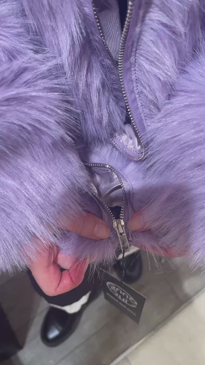 思わず触れたくなるような、ふわふわとした毛足の長いフェイクファーを使用したフード付きコート。