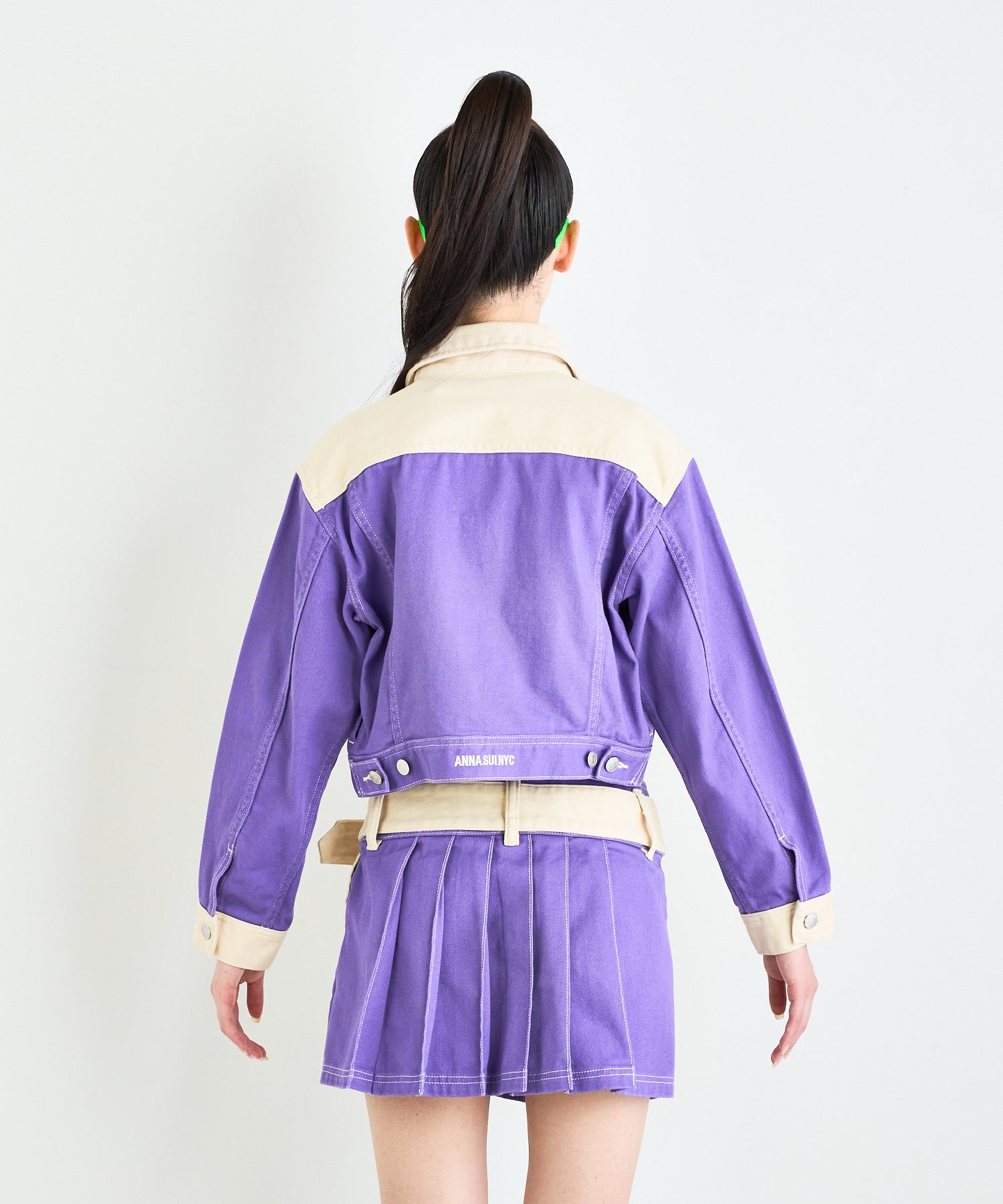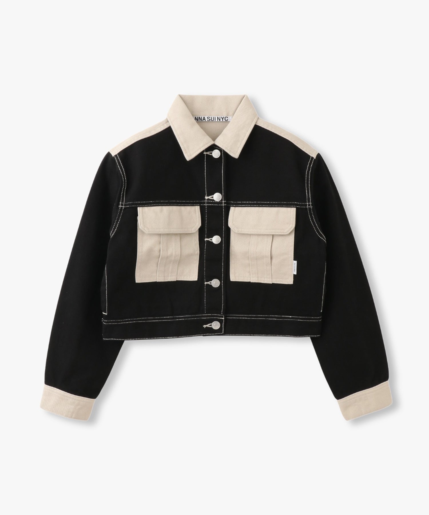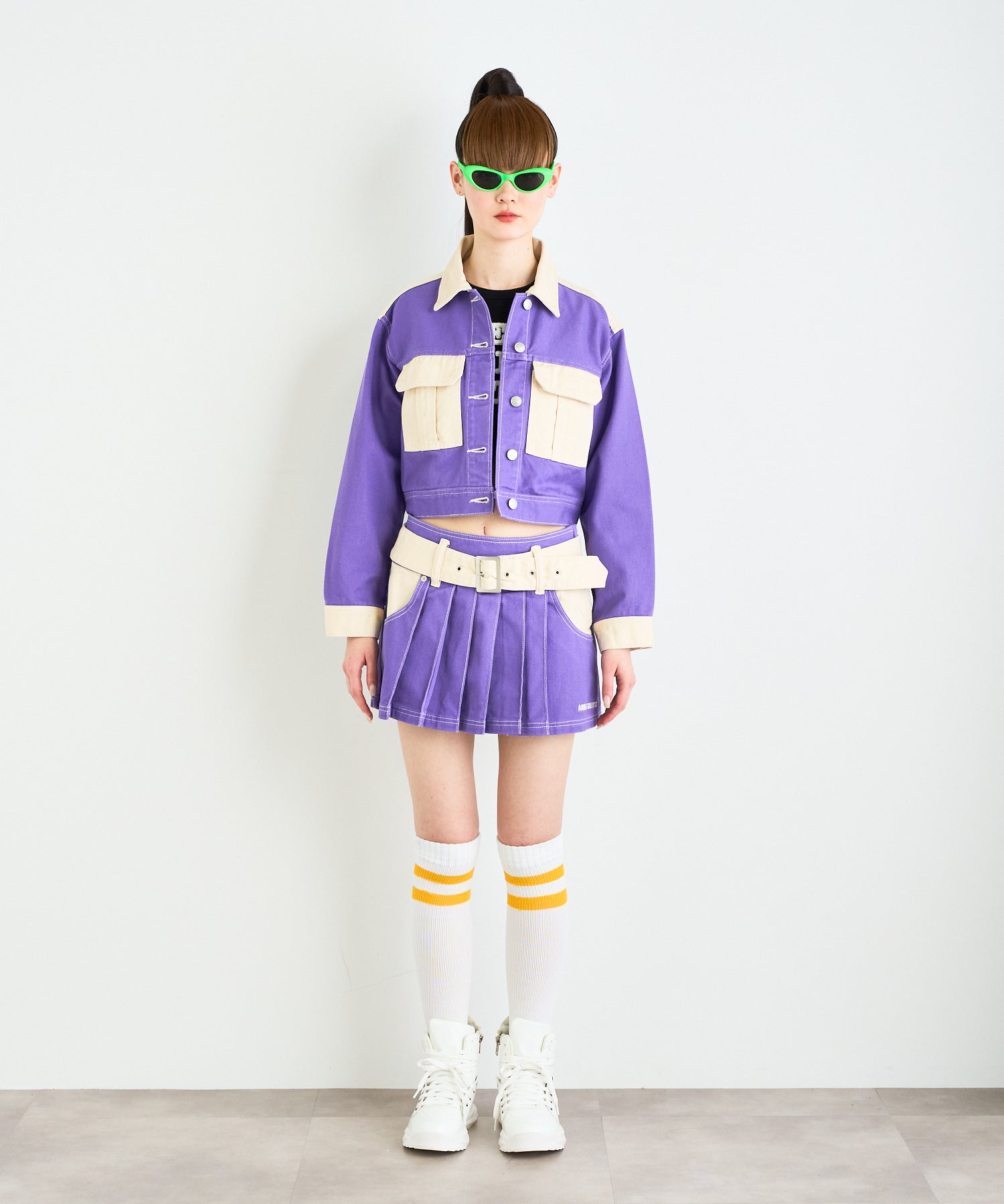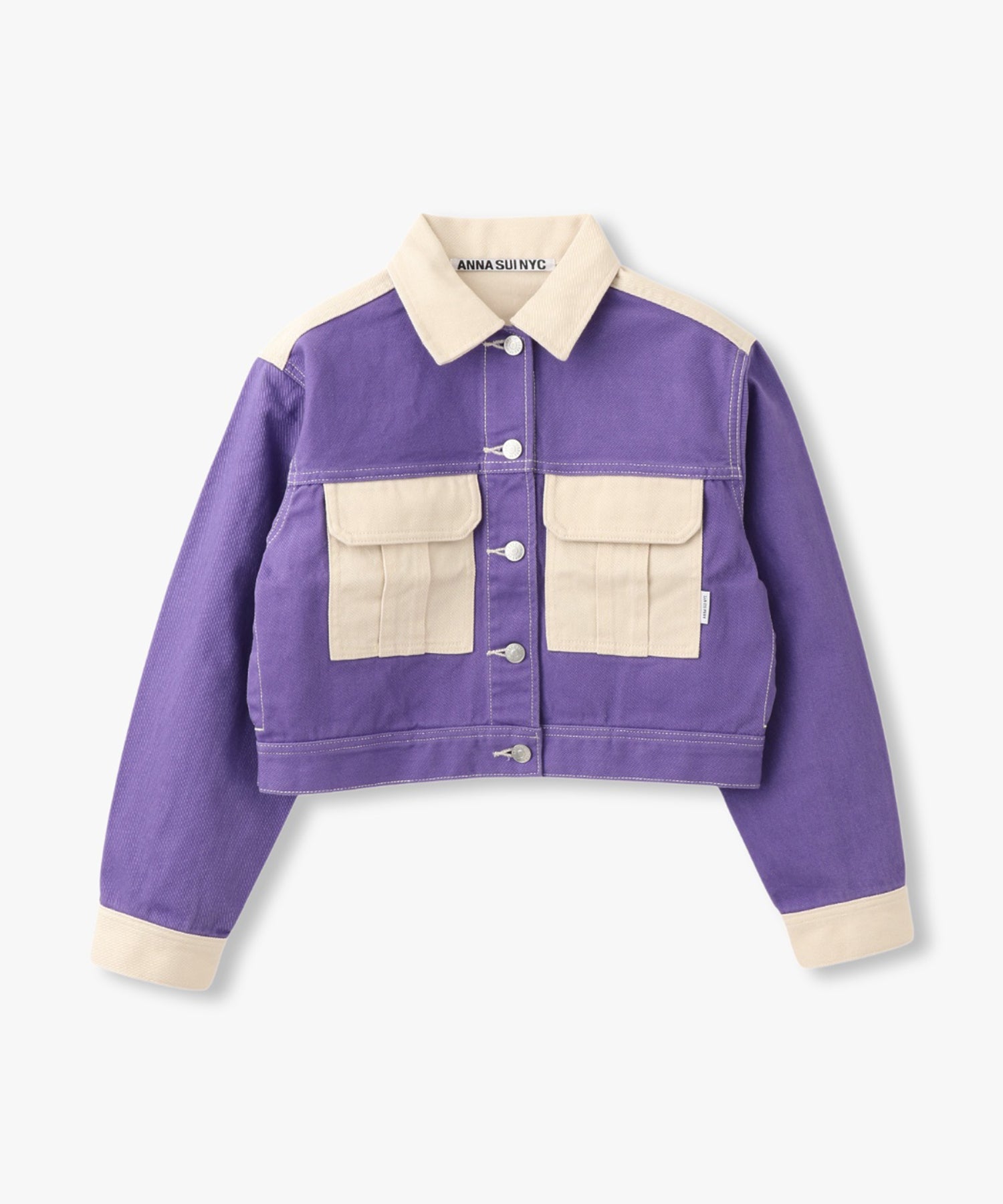 バイカラーが可愛いツイルジャケット。厚みのあるしっかりとした生地で季節の変わり目の羽織りにも大活躍!カーペンターをイメージした大きめのポケットもあり、実用性もバッチリです。同素材のスカートとセットアップでY2Kスタイルもお楽しみいただけます。