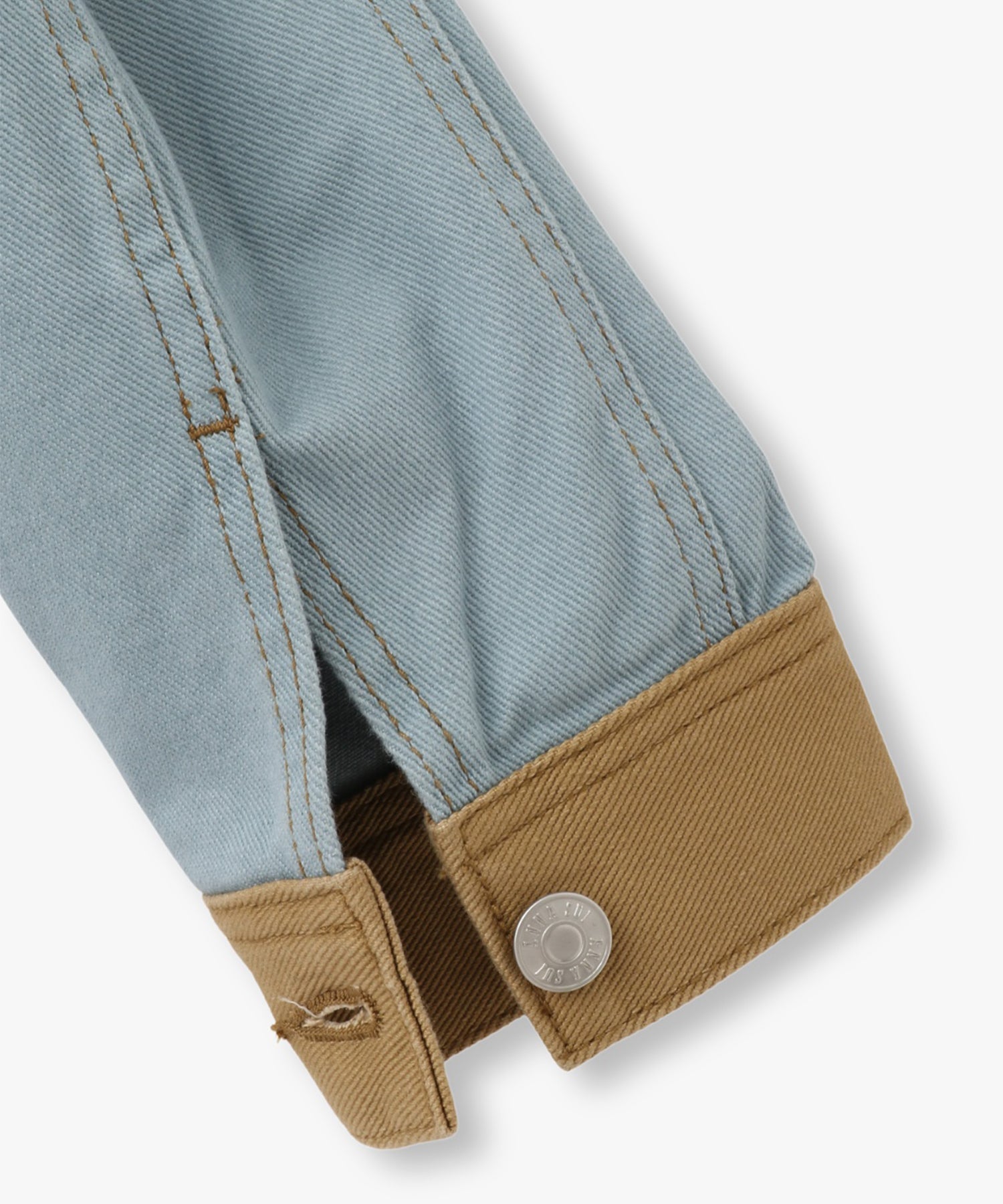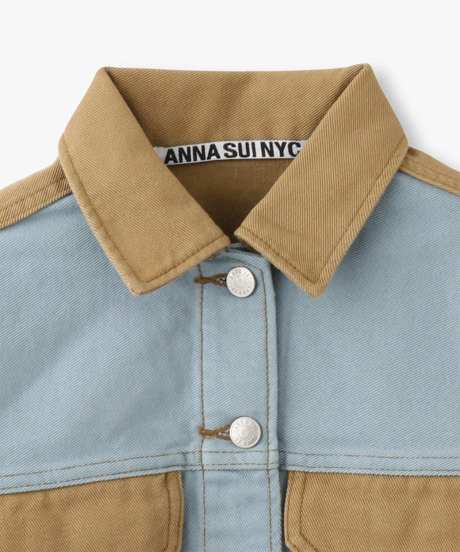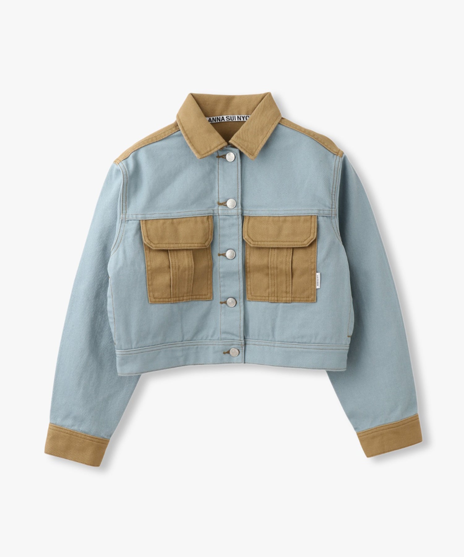 バイカラーが可愛いツイルジャケット。厚みのあるしっかりとした生地で季節の変わり目の羽織りにも大活躍!カーペンターをイメージした大きめのポケットもあり、実用性もバッチリです。同素材のスカートとセットアップでY2Kスタイルもお楽しみいただけます。