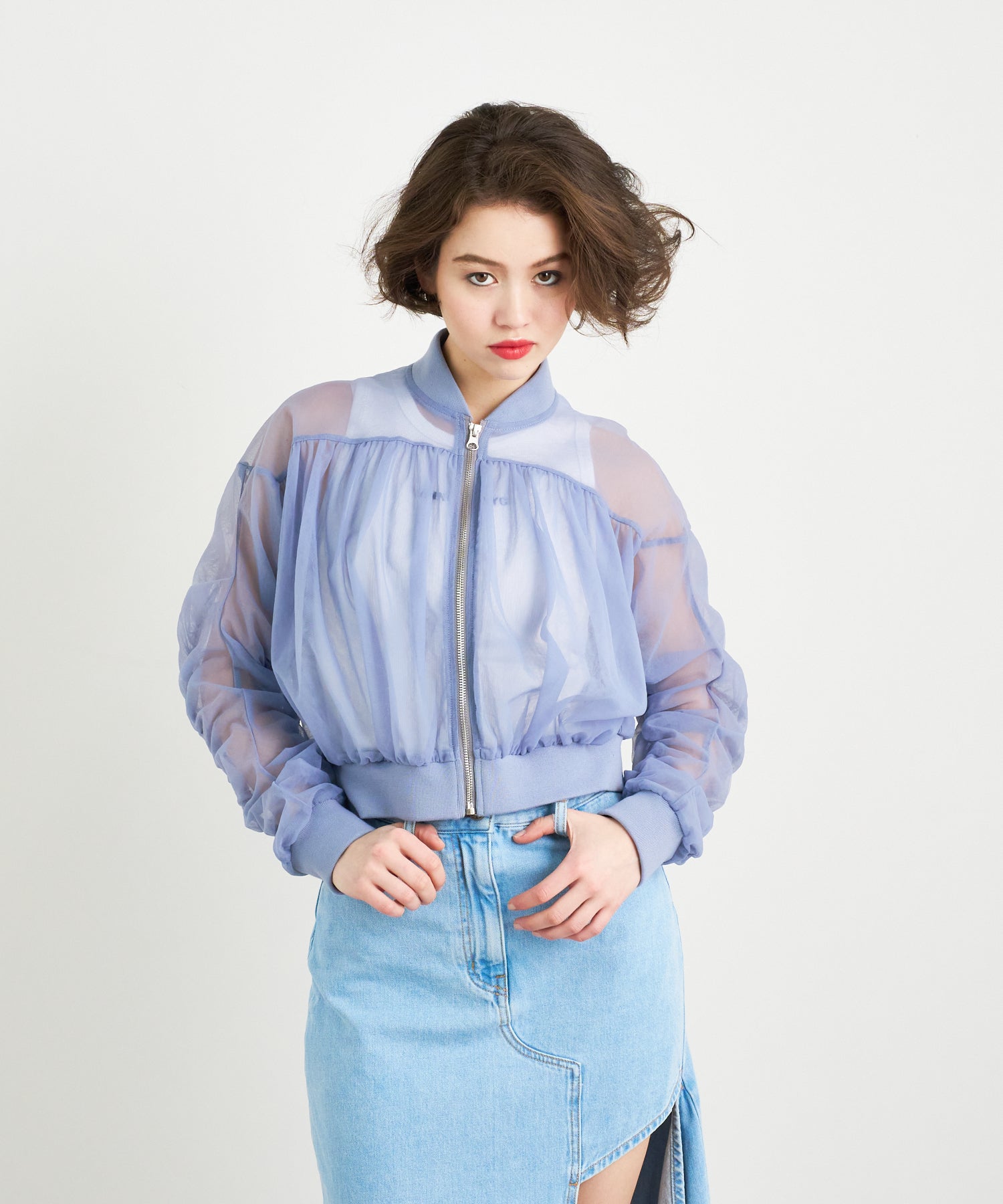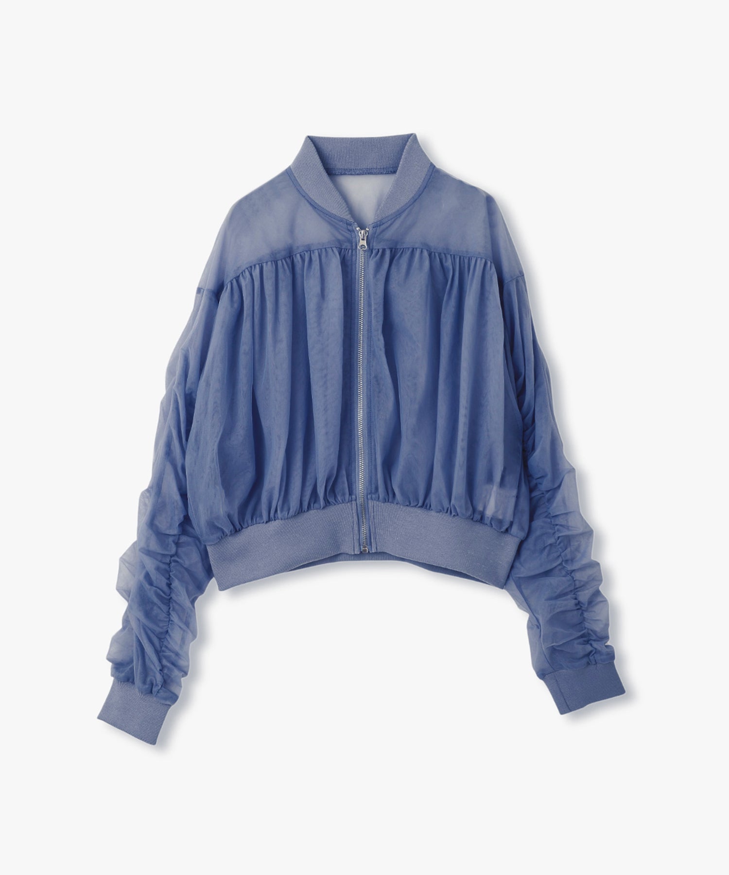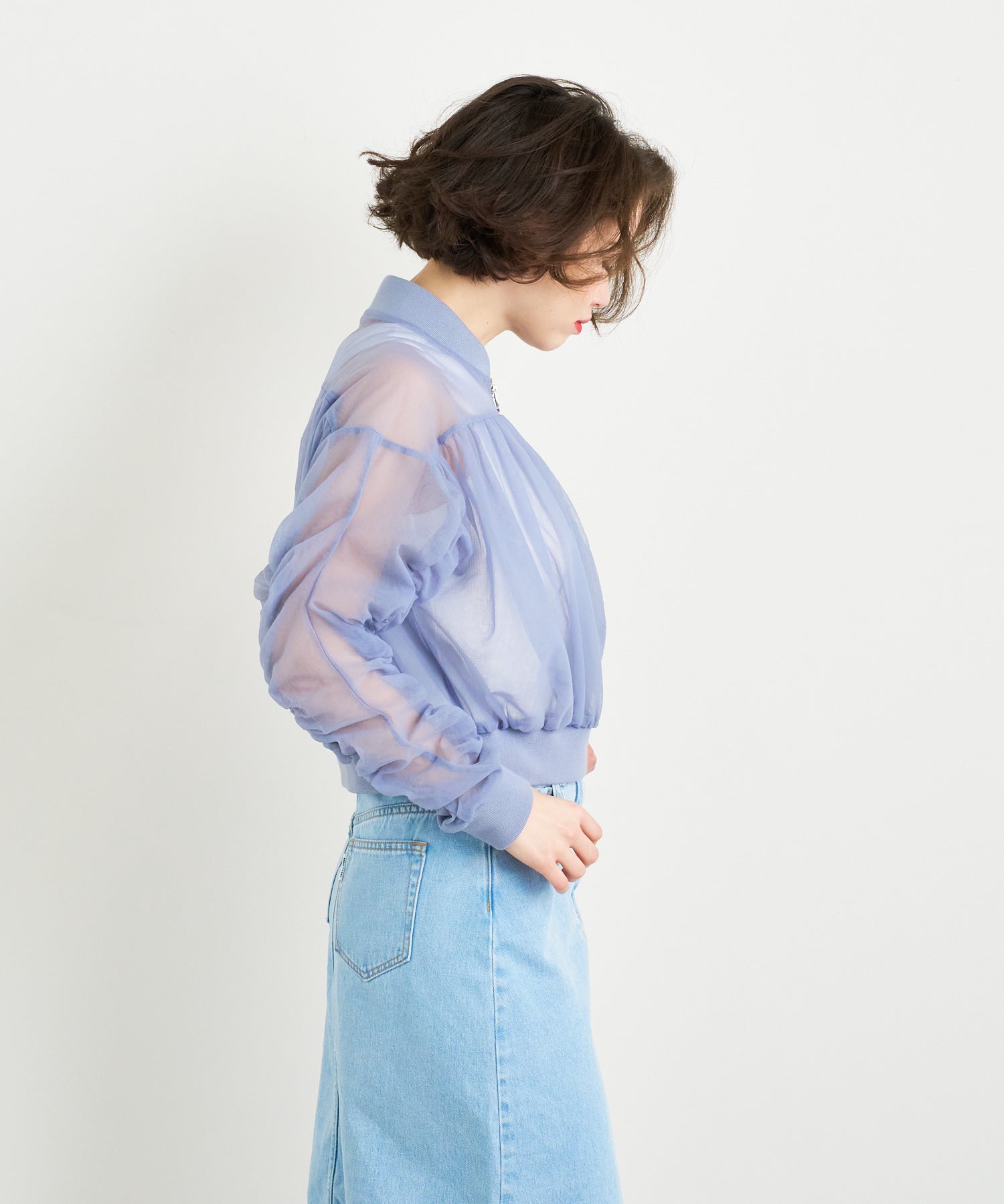 チュールを2枚合わせて仕立てた立体感のあるブルゾン。エアリーな素材感が春の羽織りにピッタリ!引き締まった裾リブの効果でウエストが細く見え、女性らしい印象を出してくれます。