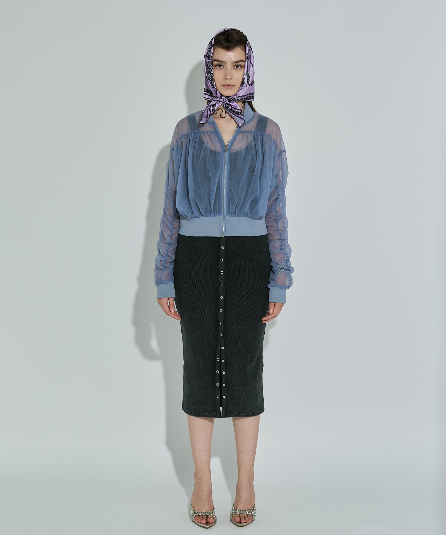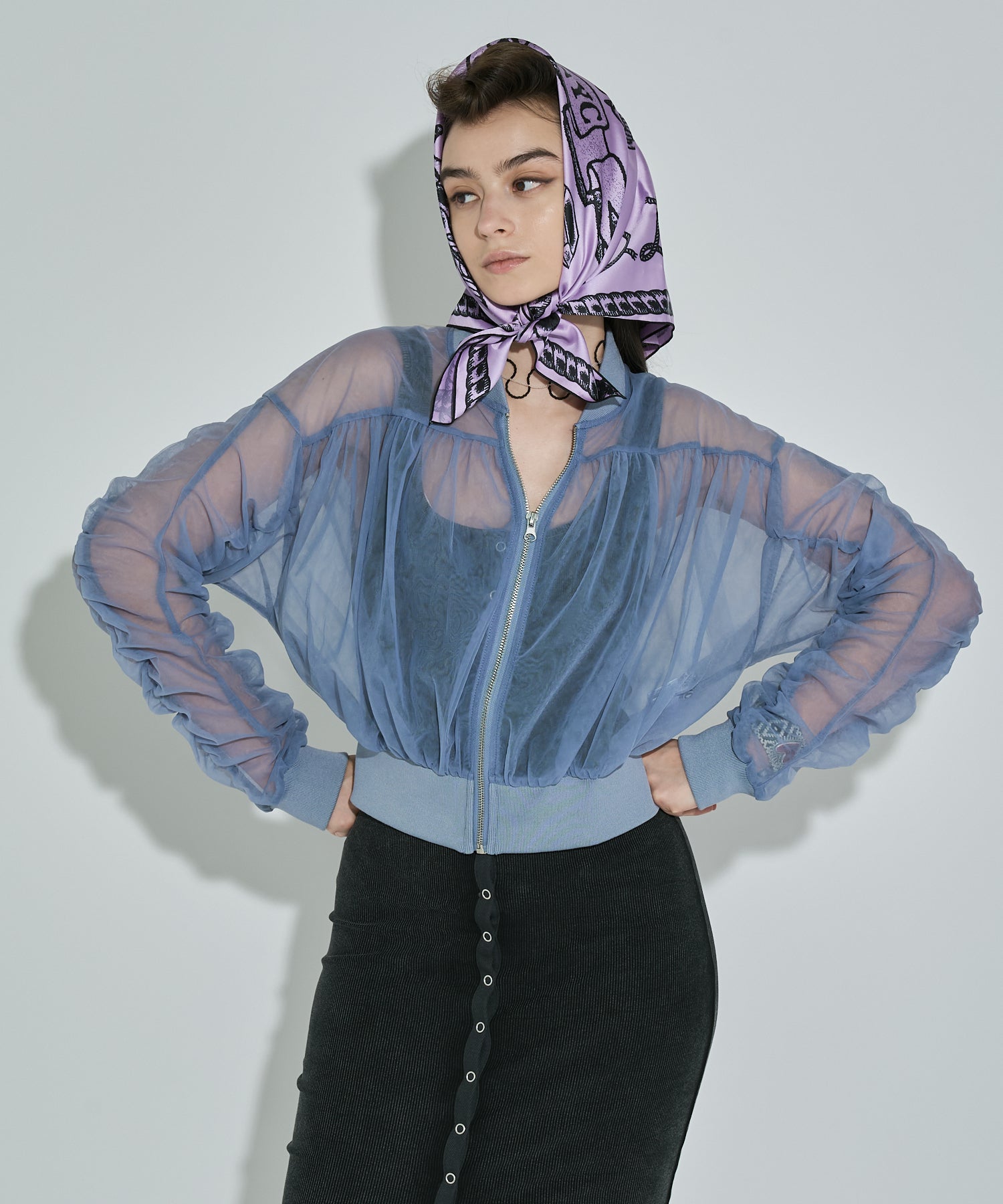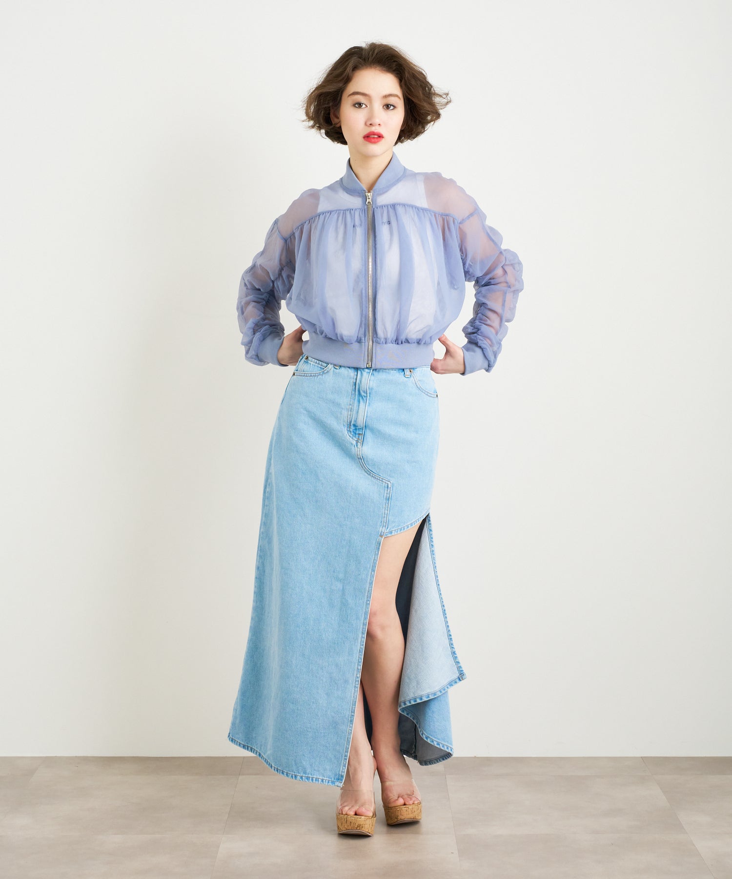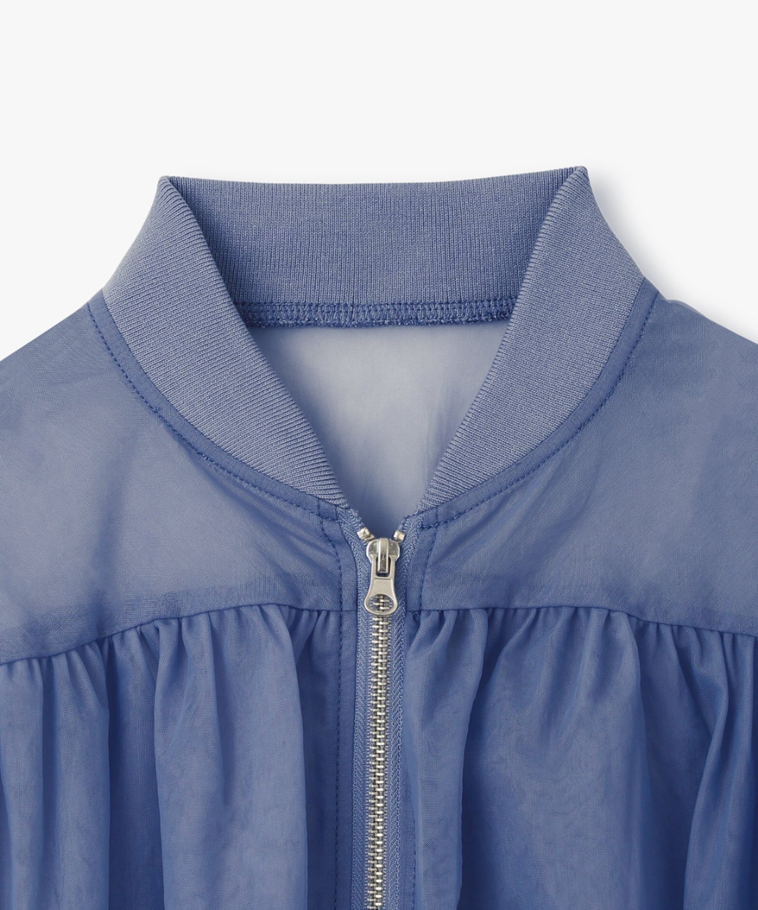 チュールを2枚合わせて仕立てた立体感のあるブルゾン。エアリーな素材感が春の羽織りにピッタリ!引き締まった裾リブの効果でウエストが細く見え、女性らしい印象を出してくれます。