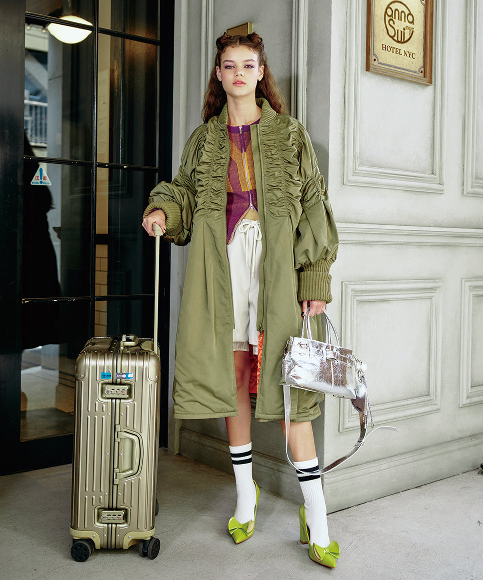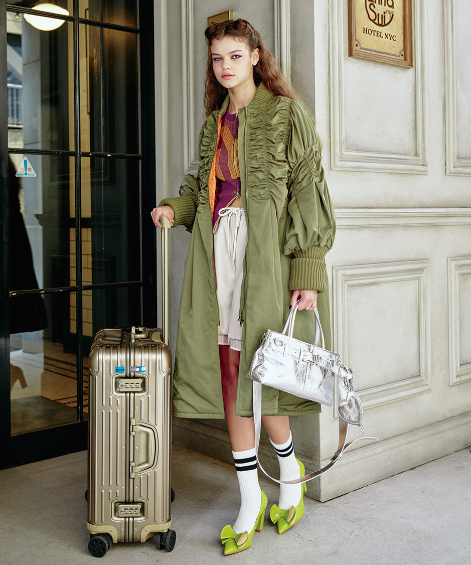 ミリタリーライクなMA-1を、フェミニンな要素で再構築したロングコート。たっぷりとギャザーを寄せたデザインとボリュームのあるシルエットで、着るだけでドラマティックな印象を演出します。中綿入りのキルティング仕様でしっかりとした重厚感がありながら、素材の光沢が上品な表情をプラスしてくれます。裏地には遊び心のある配色を施し、チラリと覗くカラーがスタイリングのアクセントに。カラーは、落ち着いたカーキ×オレンジと、シックなブラック×パープルの2色展開。モードにもストリートにも振れる存在感抜群のイチオシアウターです。