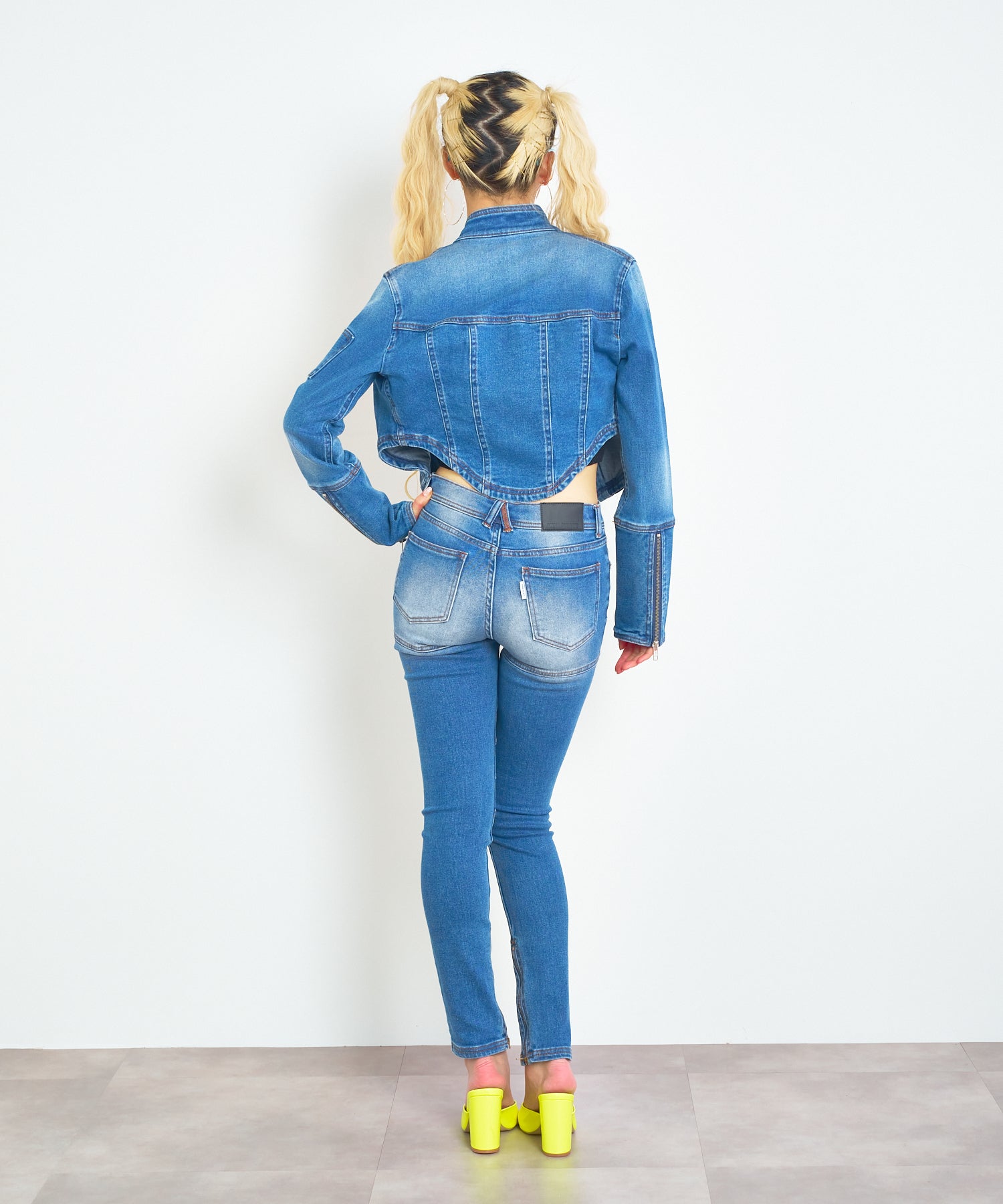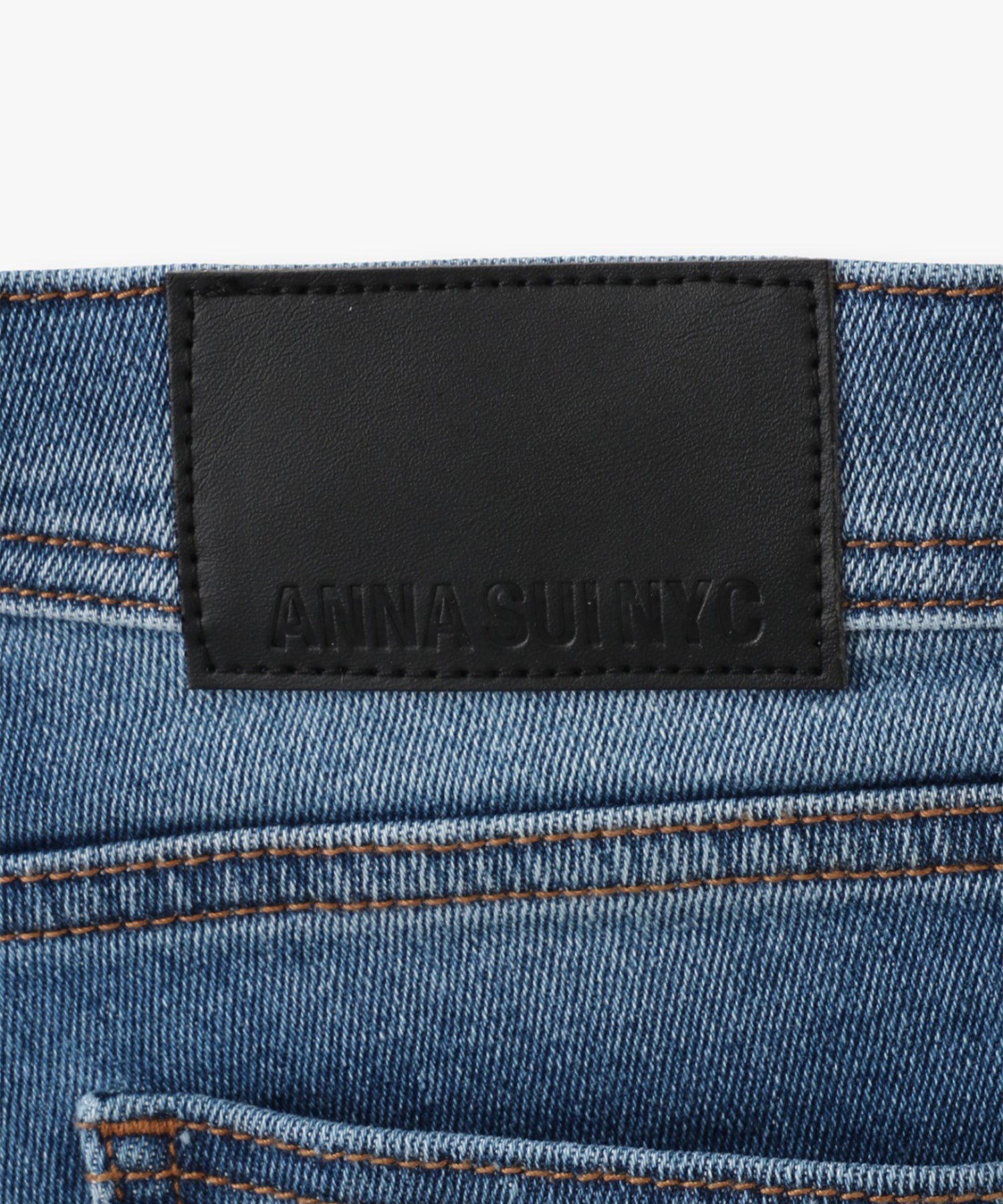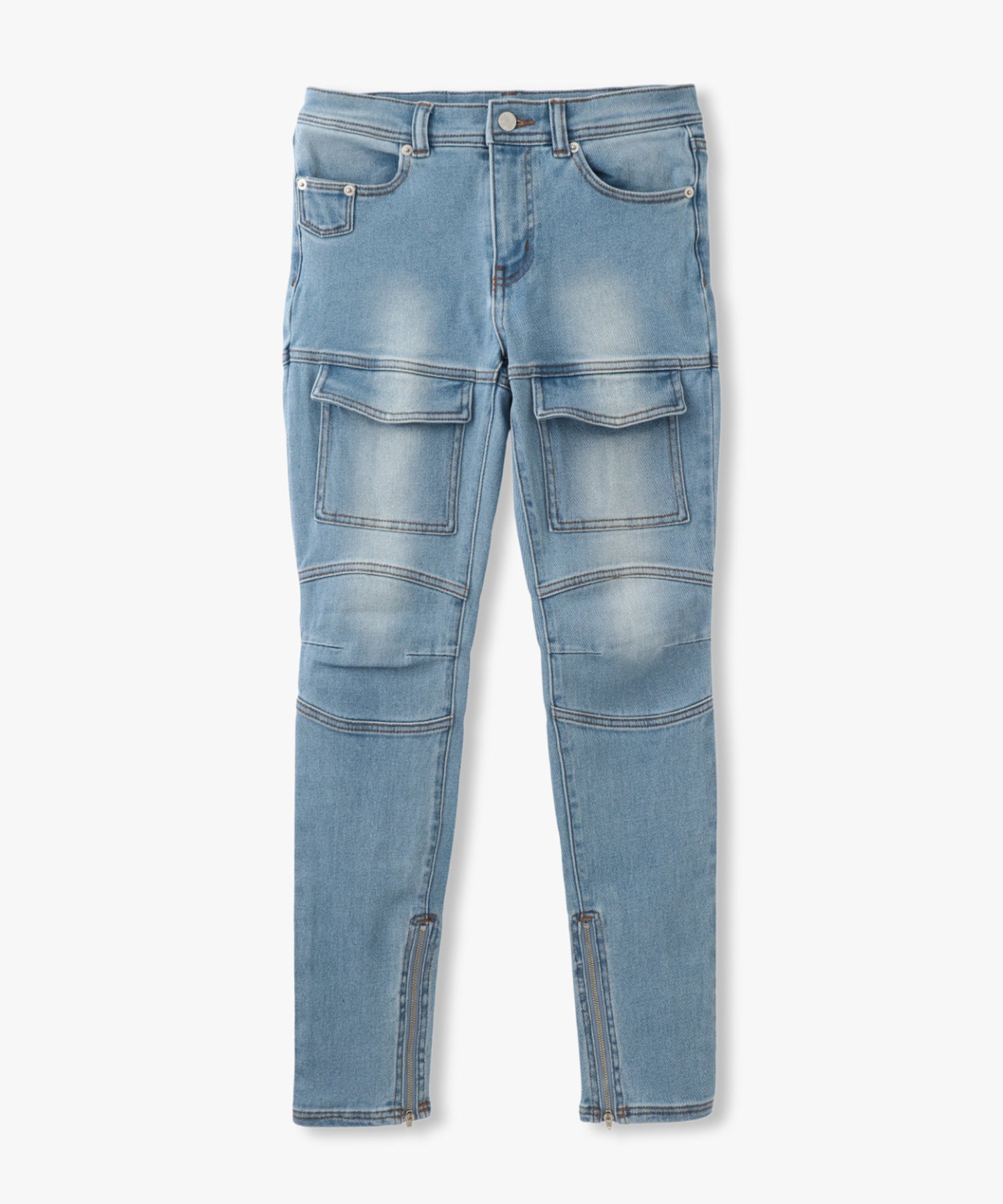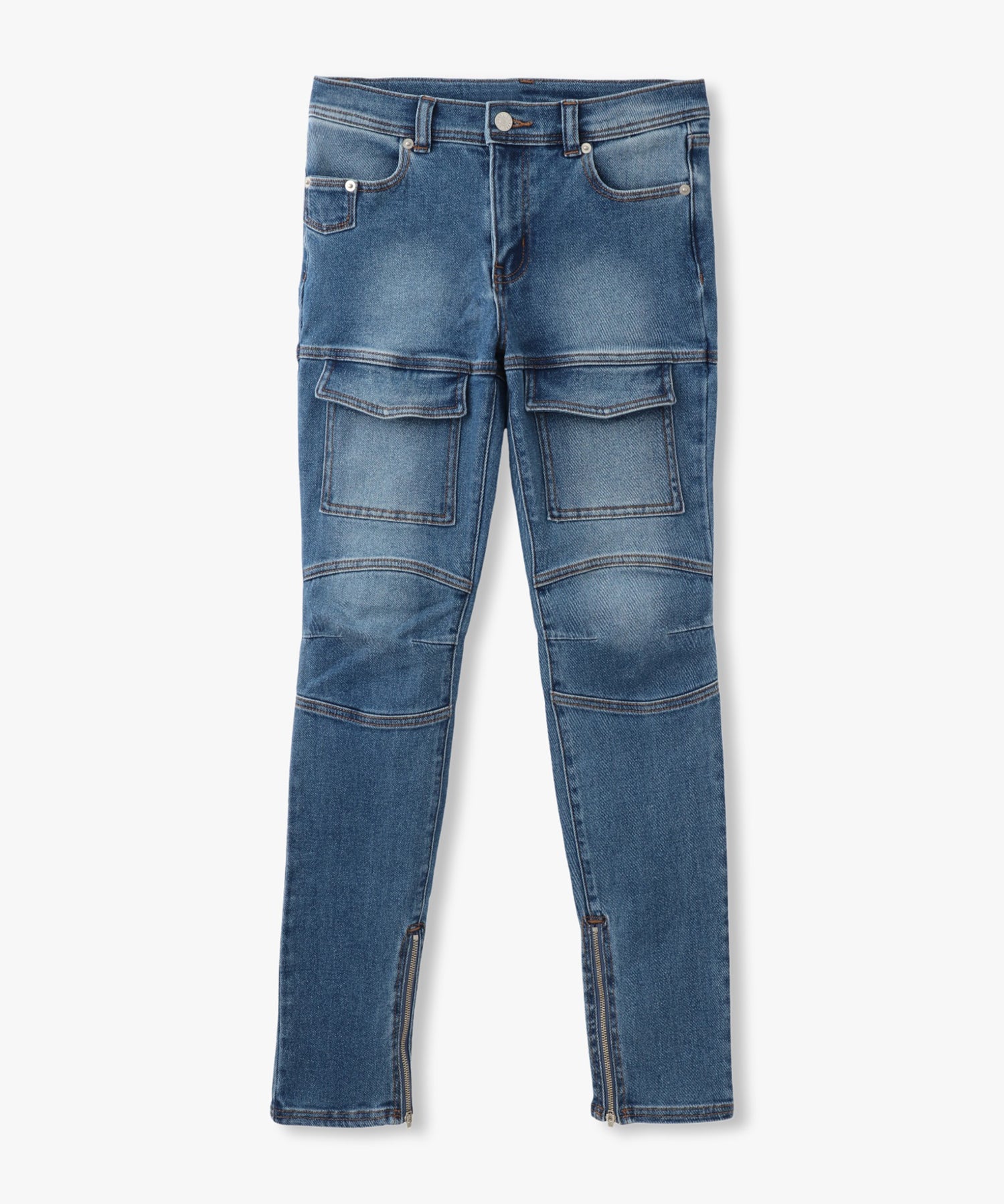 切り替えデザインがポイントのデニムパンツ。内裾についたファスナーを開閉することで裾のデザインを変えられるので、合わせるシューズや気分に合わせてシルエットの変化をお楽しみいただけます。
