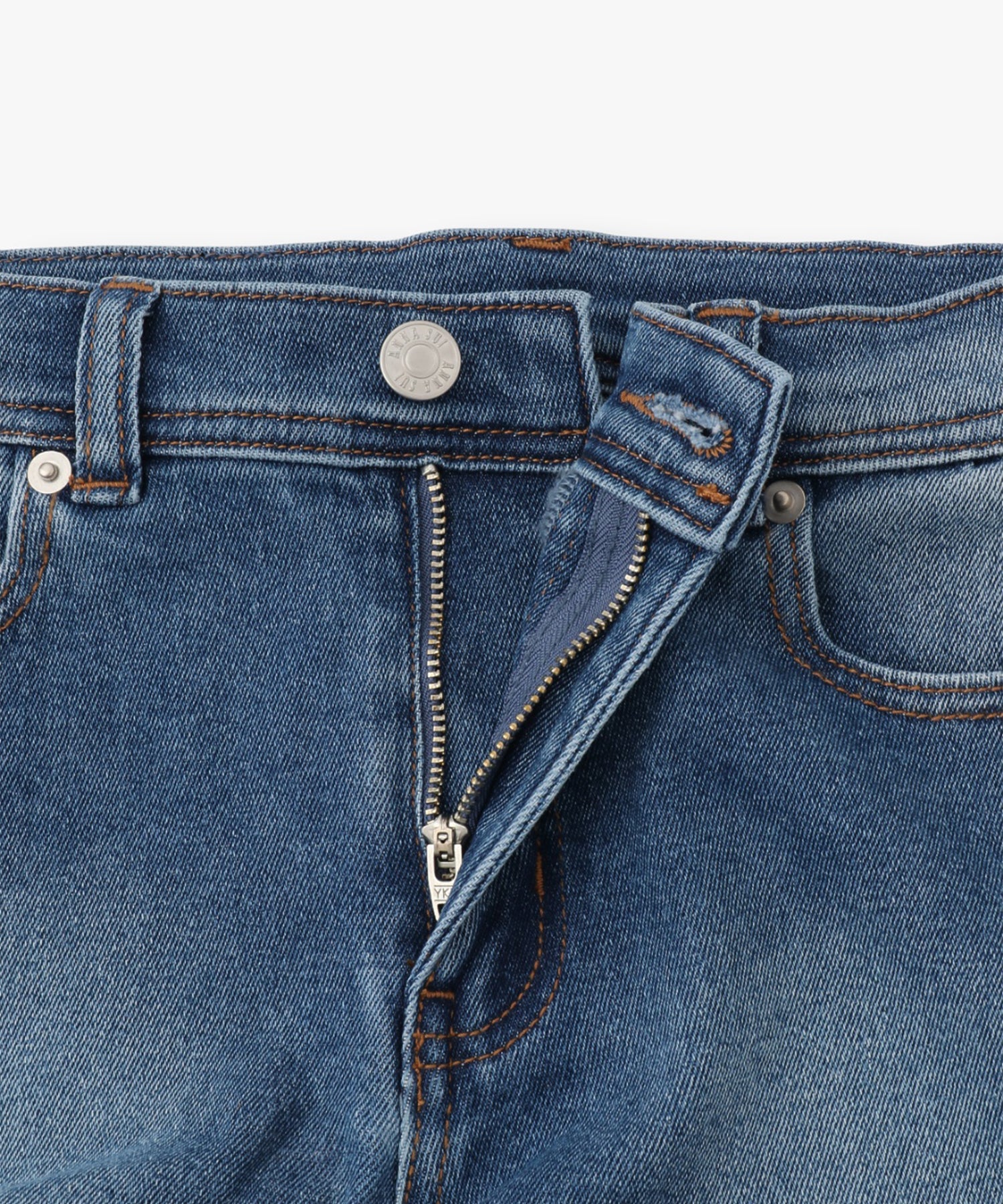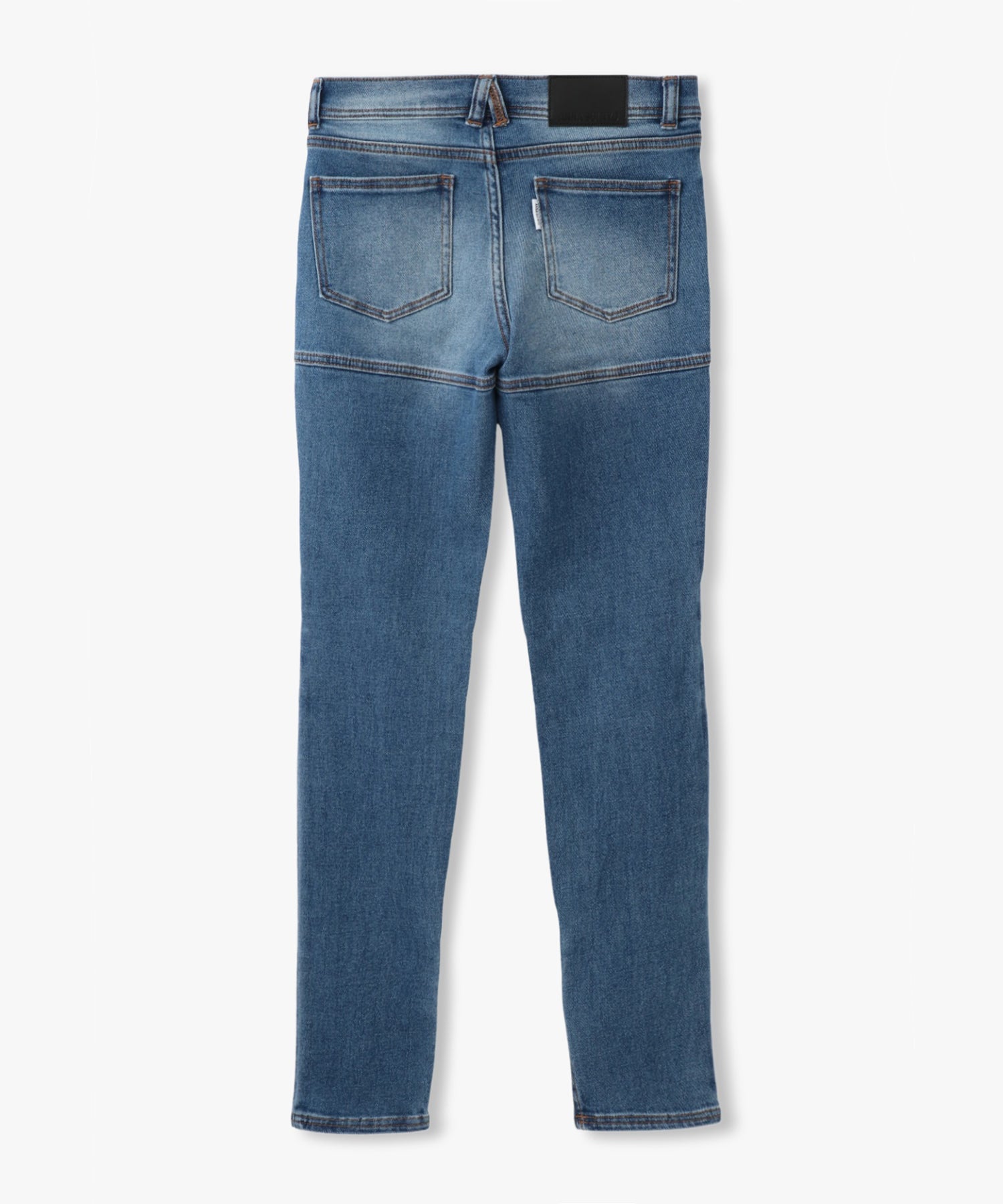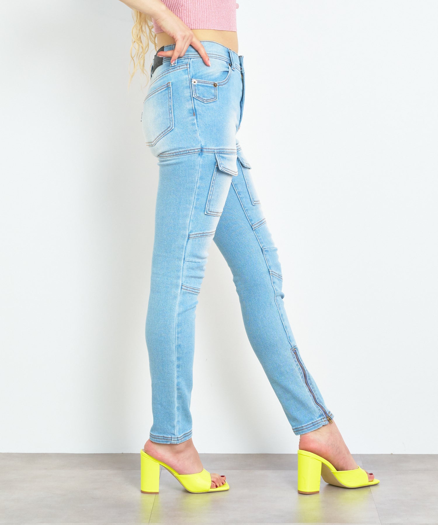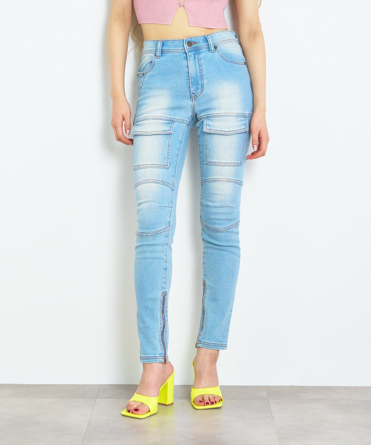 切り替えデザインがポイントのデニムパンツ。内裾についたファスナーを開閉することで裾のデザインを変えられるので、合わせるシューズや気分に合わせてシルエットの変化をお楽しみいただけます。