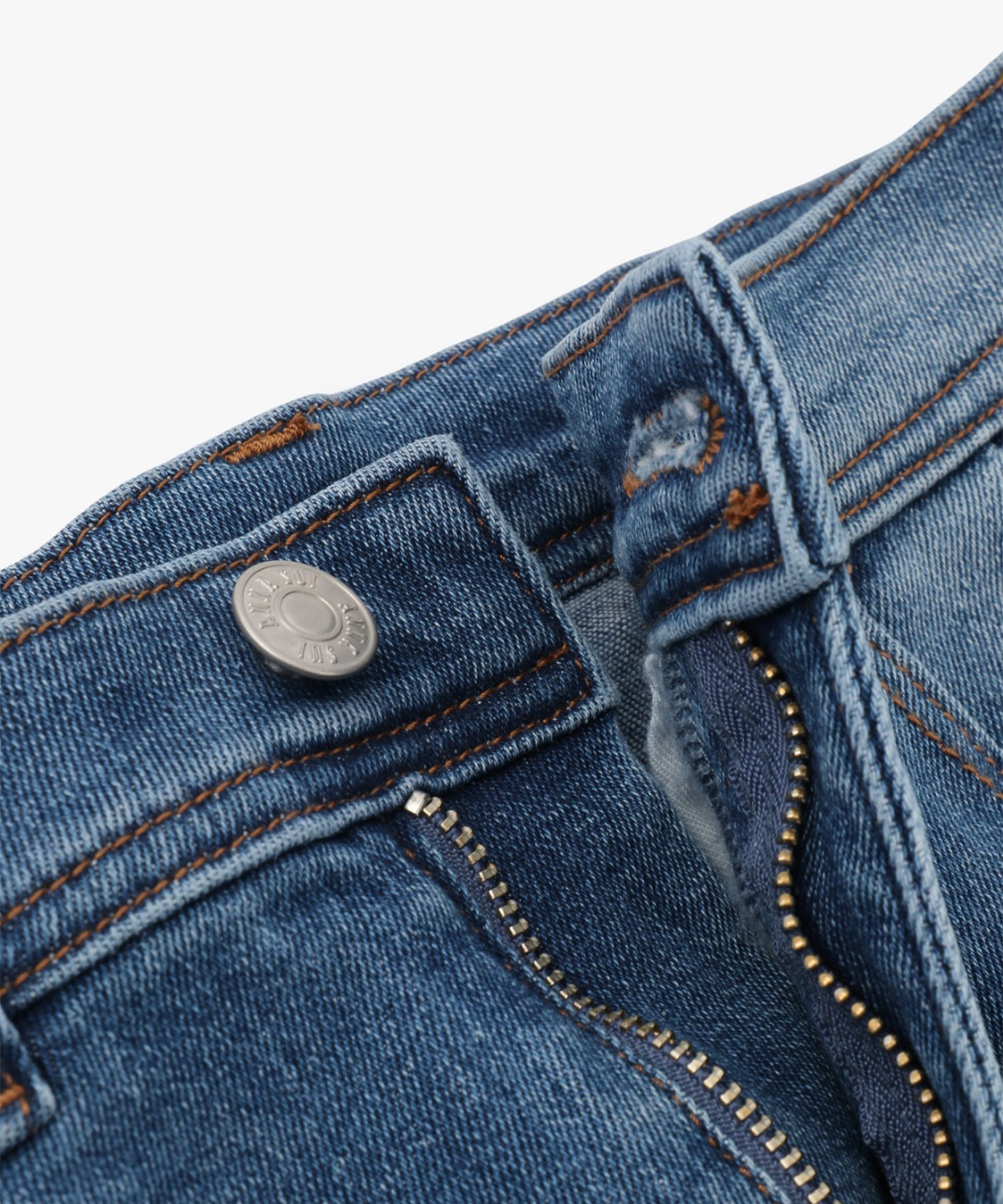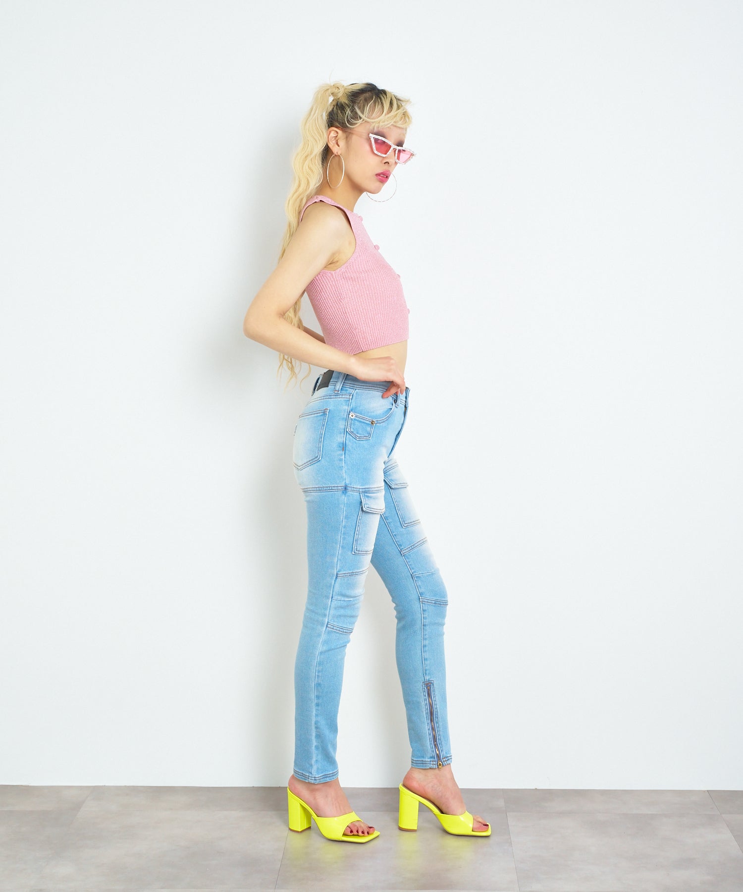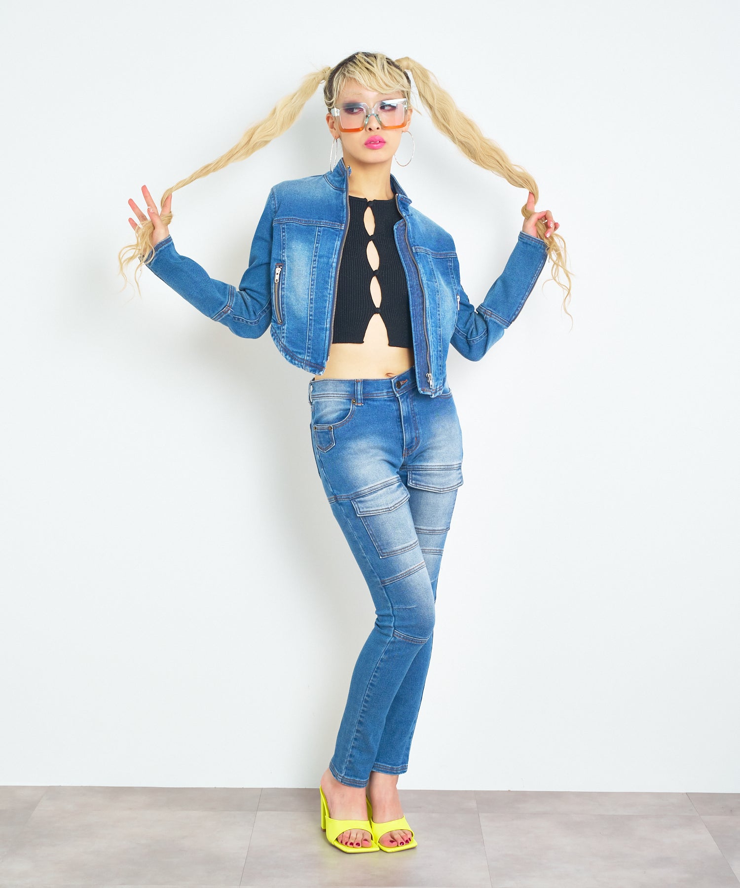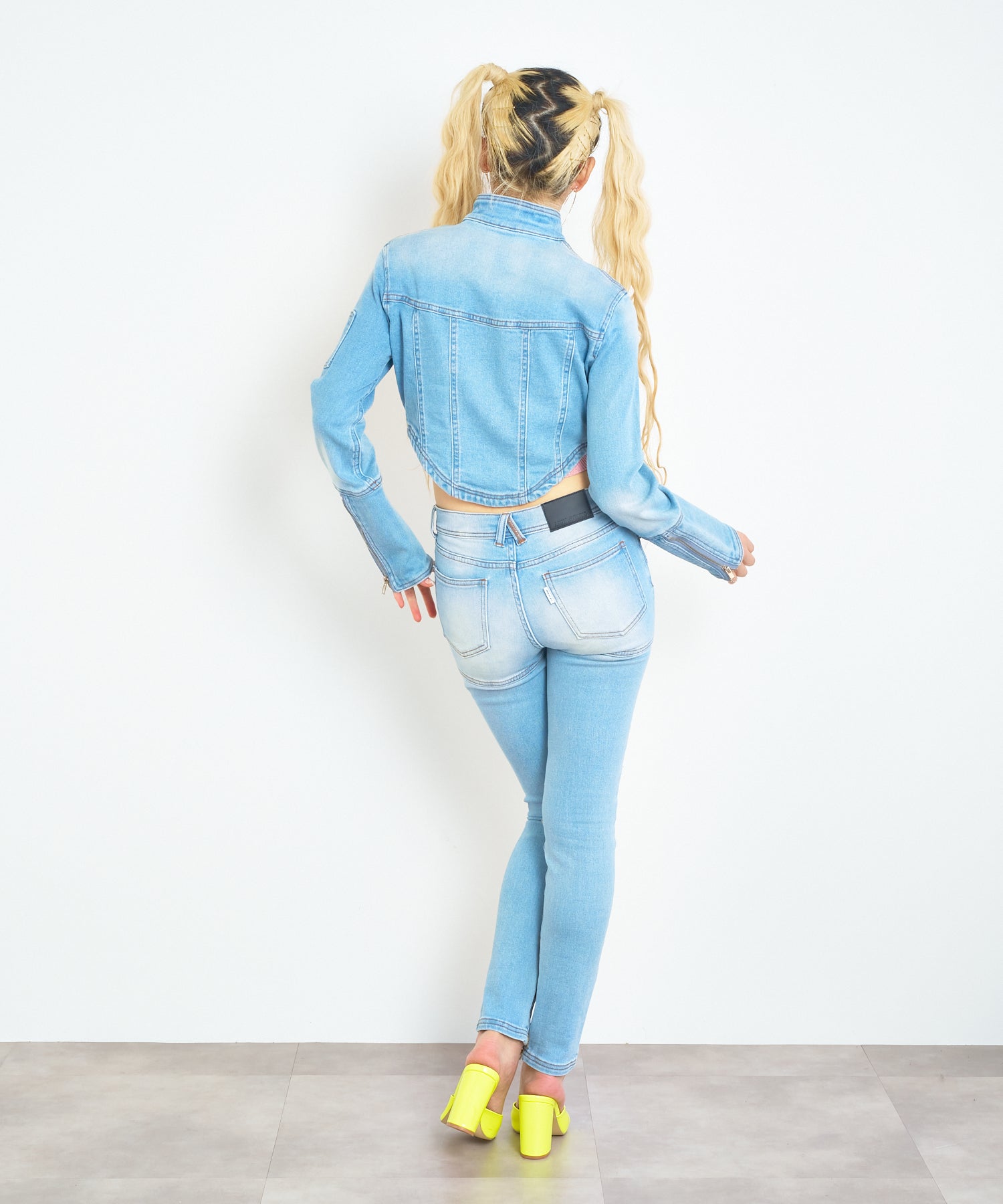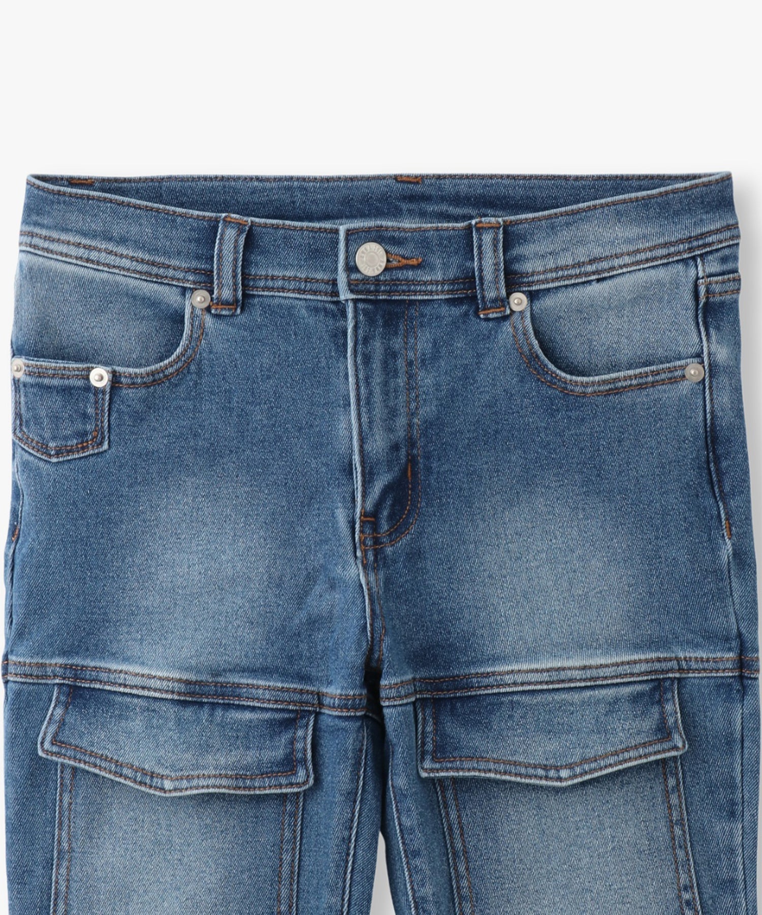 切り替えデザインがポイントのデニムパンツ。内裾についたファスナーを開閉することで裾のデザインを変えられるので、合わせるシューズや気分に合わせてシルエットの変化をお楽しみいただけます。