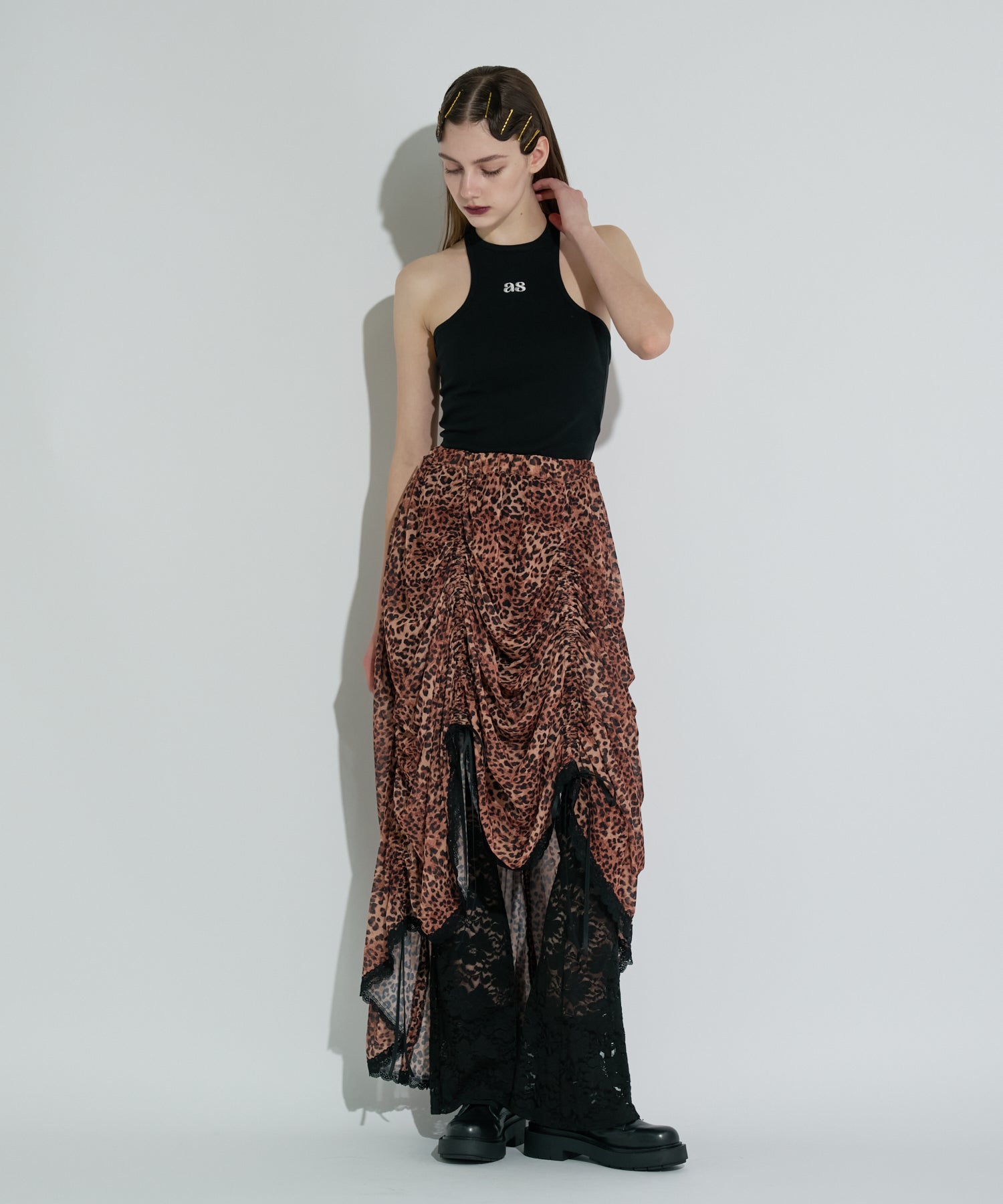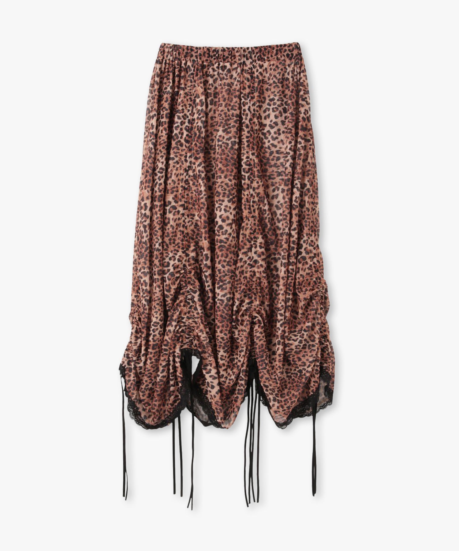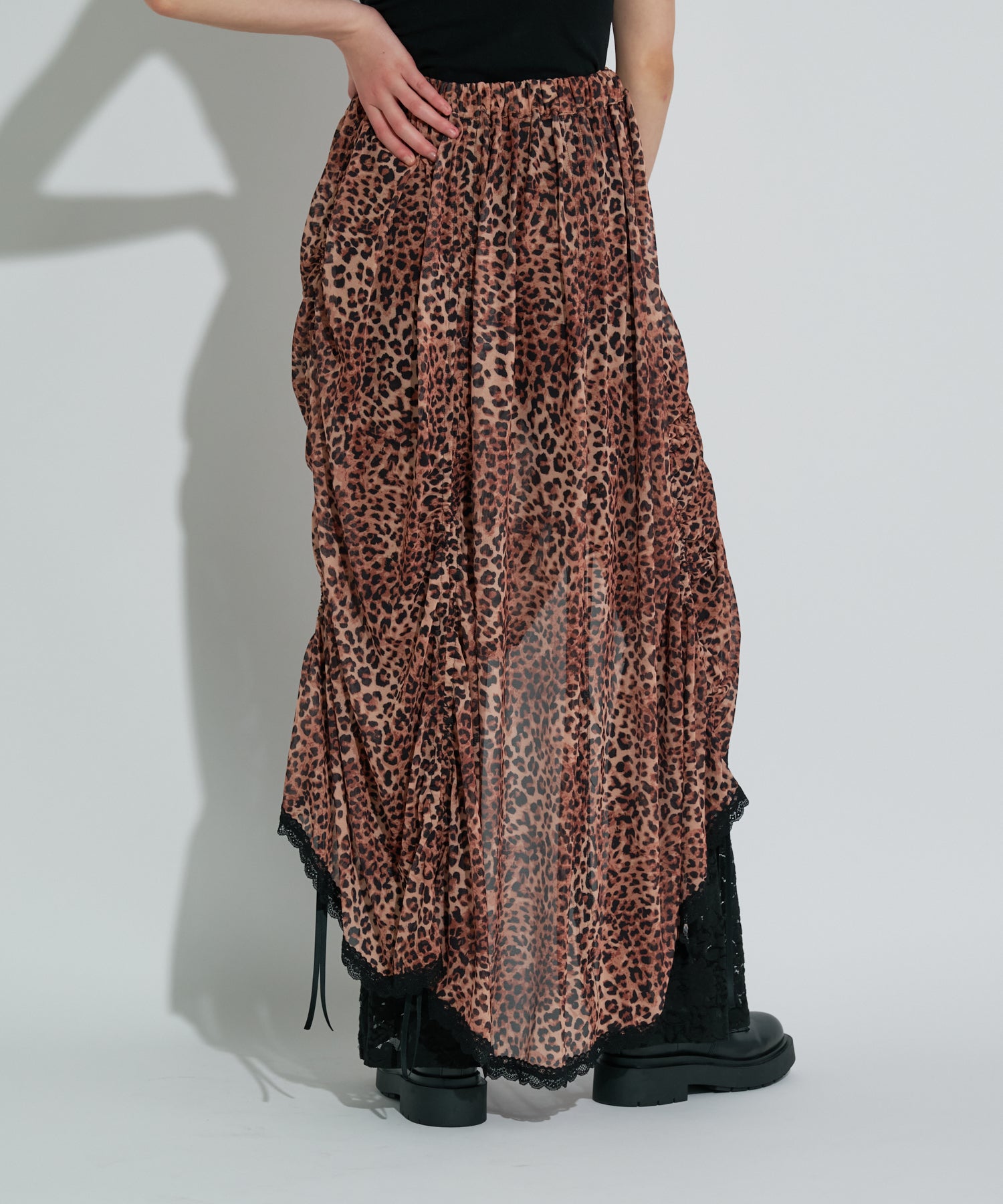 人気のシャーリングスカートが素材をアップデートして再登場!前後左右6箇所にあしらわれたリボンを絞ることで、くしゅっとギャザーを寄せたり、アシンメトリーにアレンジしたりと、シルエットを自分好みにクリエイトすることができる360度どこから見ても可愛い1着。裾には繊細なレースを施し、フェミニンさをさらにプラス。3色すべて異なる素材を使用した贅沢なラインナップ。SAXは透け感のあるシフォンに花柄モチーフを散りばめ、爽やかで軽やかな印象に。同じくシフォン素材したCAMELは、レオパード柄でヴィンテージライクな雰囲気に。ブラックは繊細なレースを使用し、センシュアルでモードな佇まいに仕上げています。ウエストは総ゴム仕様で着心地も快適。カジュアルなTシャツやスウェット、ニットとの相性も良く、シーズンレスに活躍する一枚です。