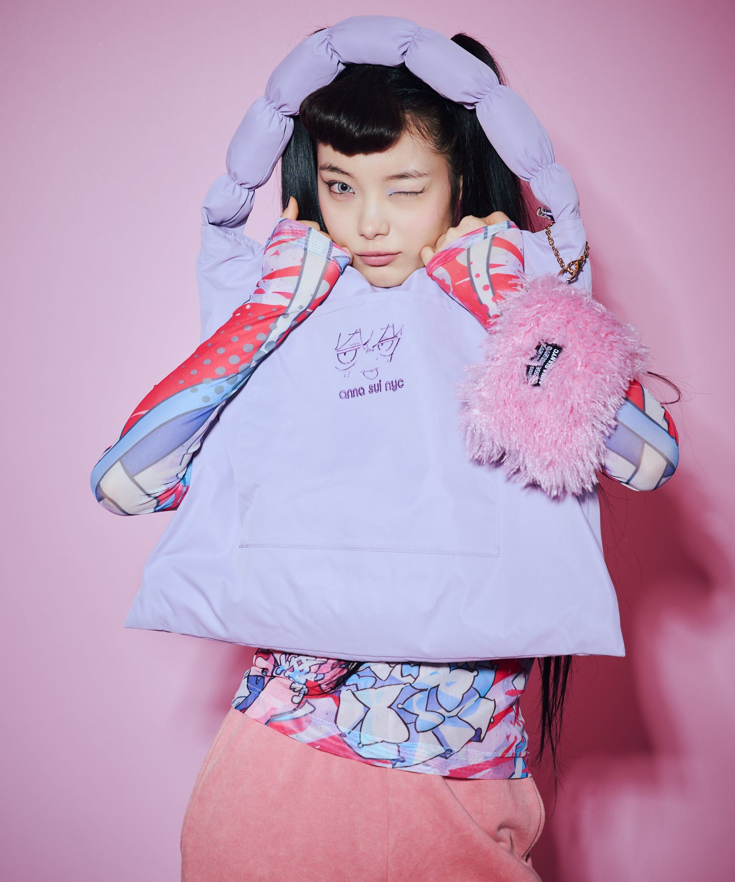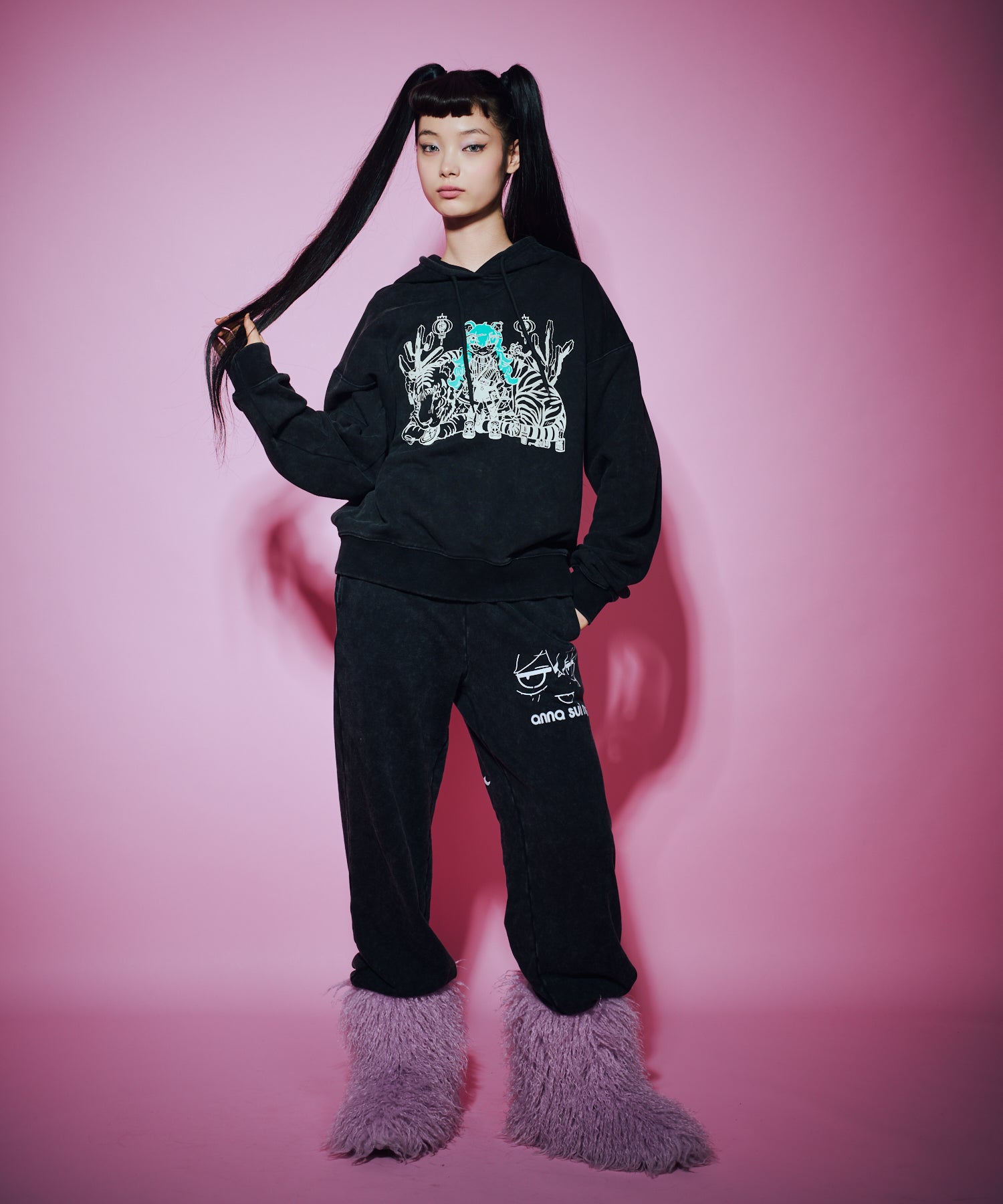 デジタルクリエイター の寺田てらさんとANNA SUI NYCのスペシャルコラボレーション。寺田てらさんの特徴の一つであるカラフルなアートワークをあえてモノトーンとアクセントカラーの2色で表現。ストリート感とアート性が融合し、唯一無二の存在感を放ちます。ボディはケミカルブリーチとオーバーダイ加工を組み合わせ、トレンドライクな表情に。カラーは、印象的なピンクとシックなブラックの2色展開。 同シリーズの“TERAスウェットパンツ”とセットアップでの着用もおすすめです。
