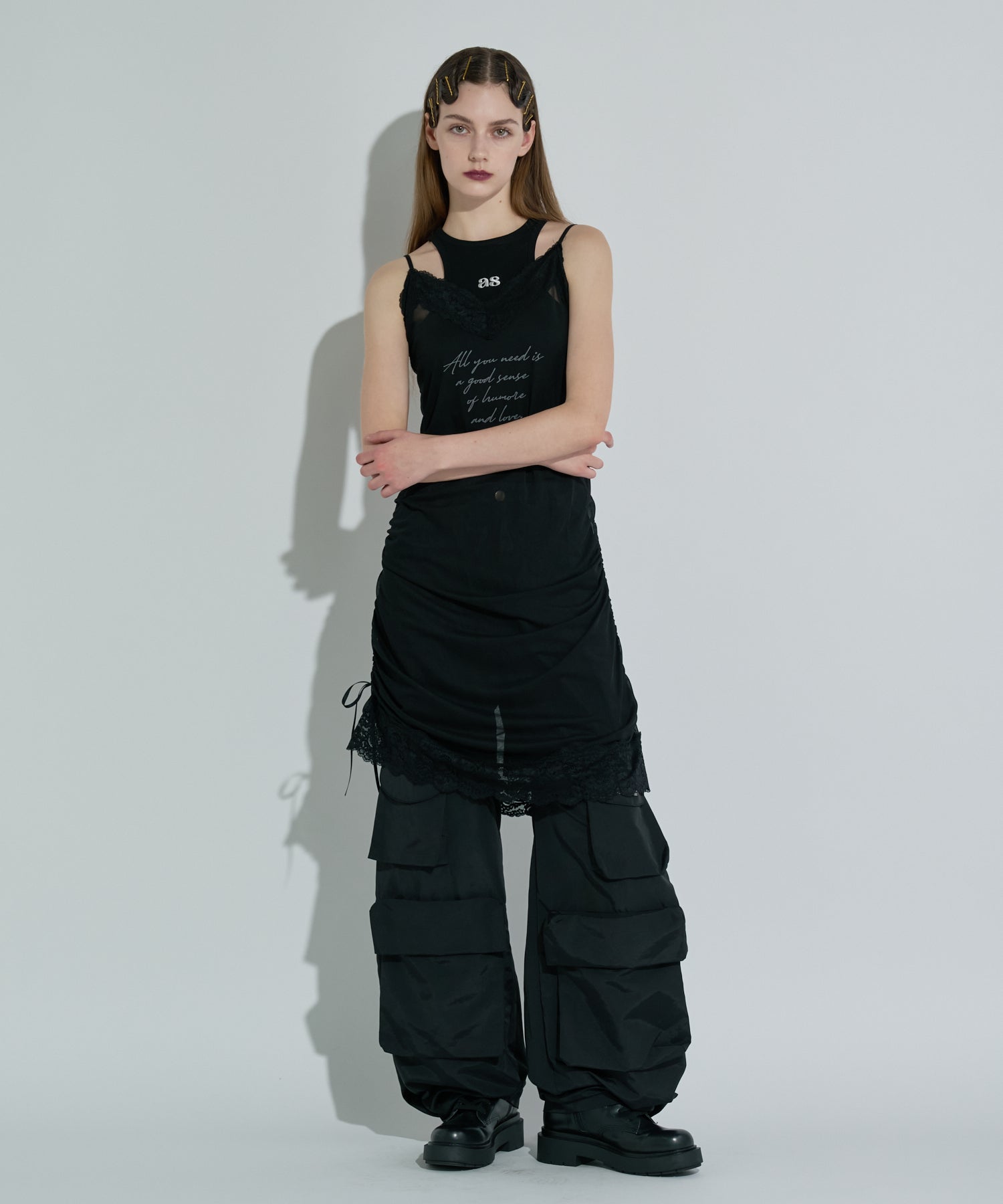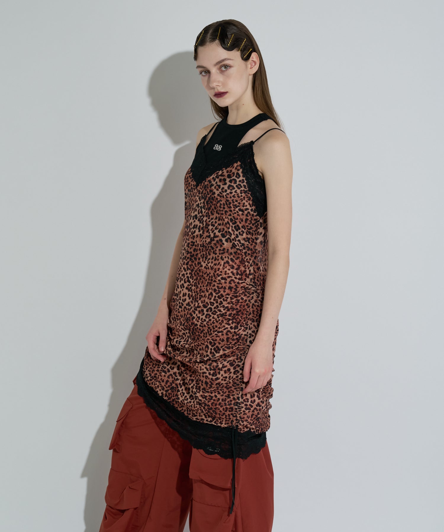 繊細なレースとドレープ感のあるシルエットが魅力のキャミワンピース。首元と裾にあしらわれたスカラップレースは、センシュアルなムードを引き立てつつ、全体の印象をほどよく引き締めます。両サイドはドローストリング仕様で、シルエットのアレンジが可能。くしゅっとギャザーを寄せて立体感を楽しんだり、絞りの調節で様々な表情をお楽しみいただけます。カラーは、コーディネートの主役になるレオパード柄、レトロなムードの花柄、そしてシアー感を活かした無地ブラックの3パターン。それぞれ異なる表情で、スタイリングの幅を広げてくれる一着です。