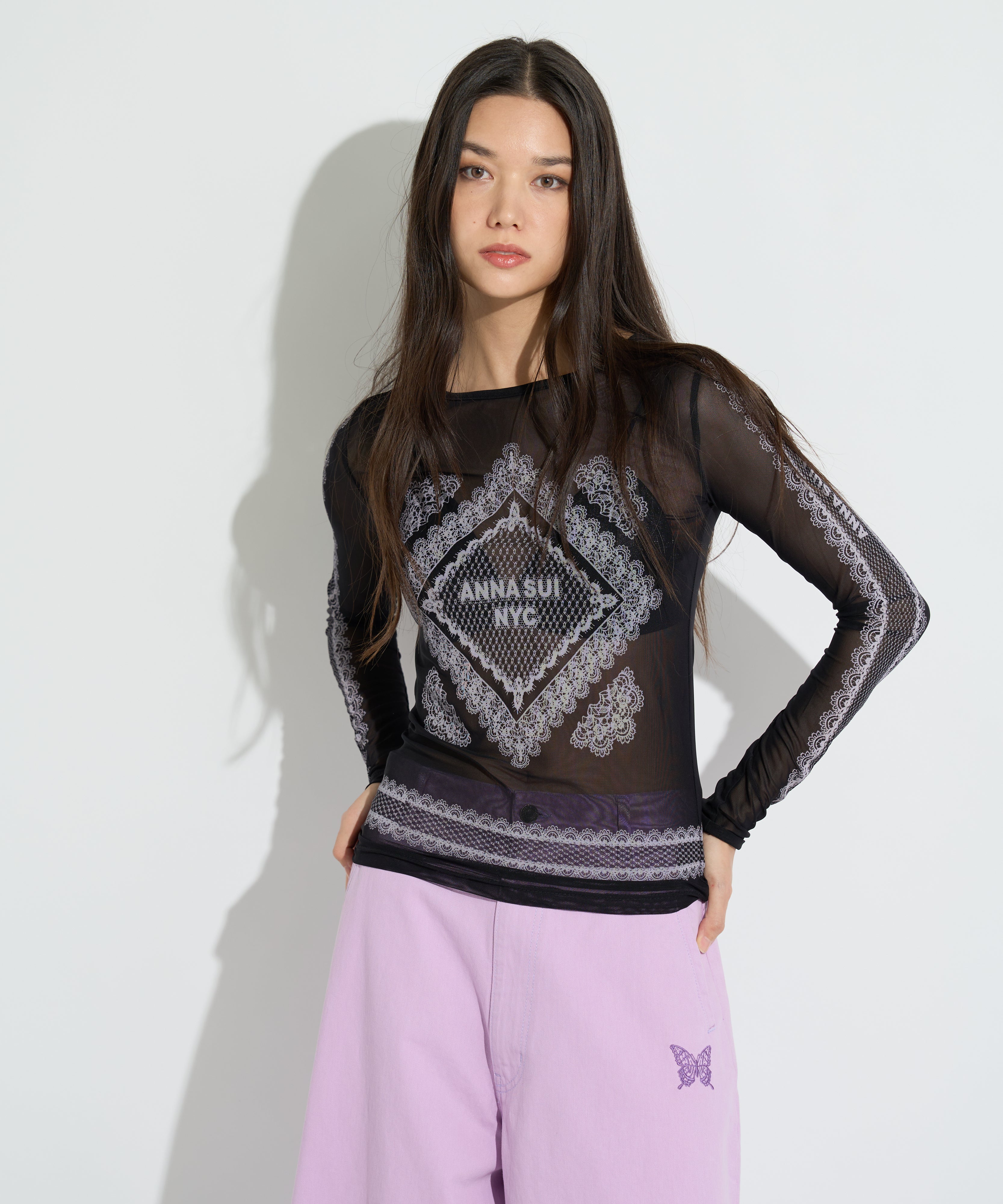 繊細なシア素材に、ヴィンテージライクなレースプリントを大胆に施したロングスリーブトップス。
