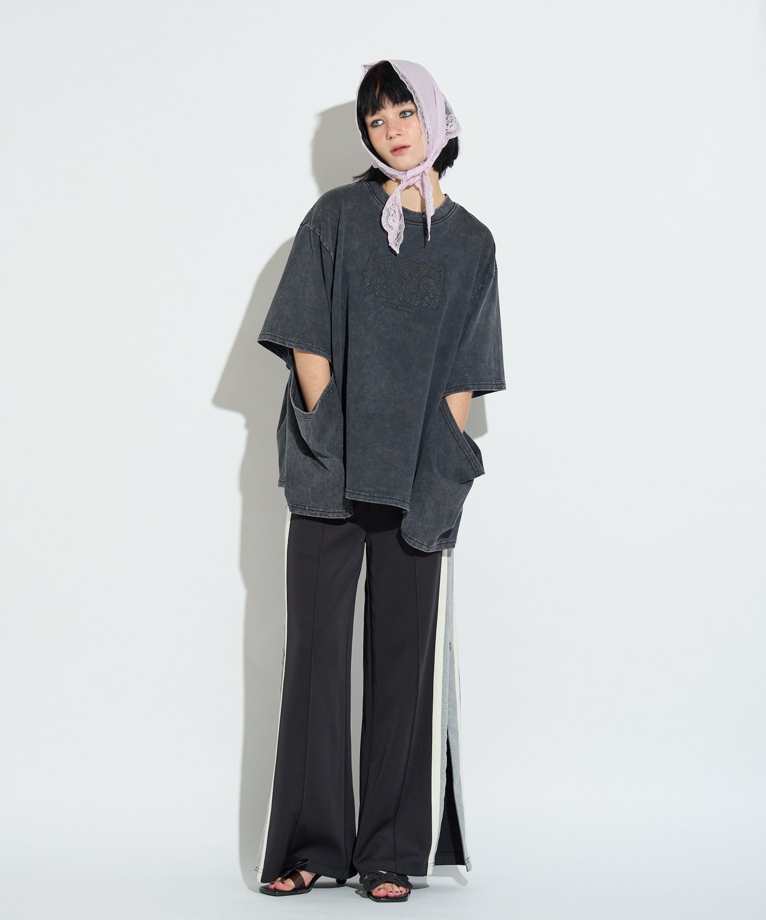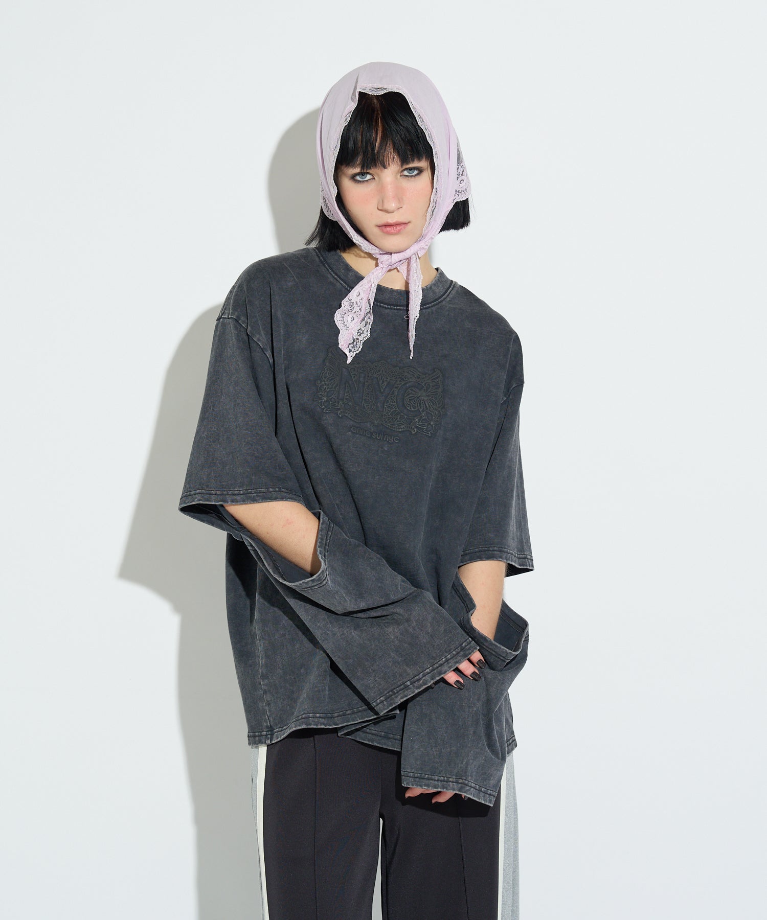 生地には洗い加工を施し、長く愛用したかのようなこなれ感のあるヴィンテージの風合いを再現。フロントには細かなグラフィックを発泡プリントで立体的に表現し、フェミニンなエッセンスをプラス。