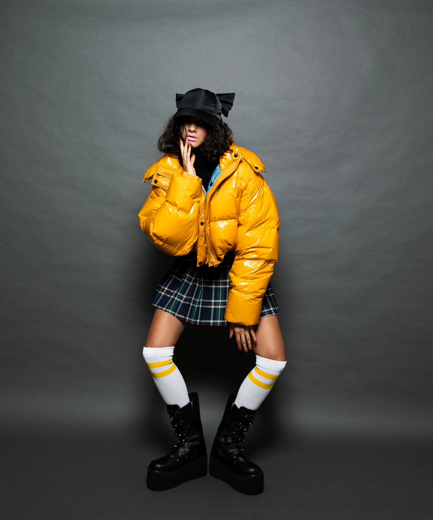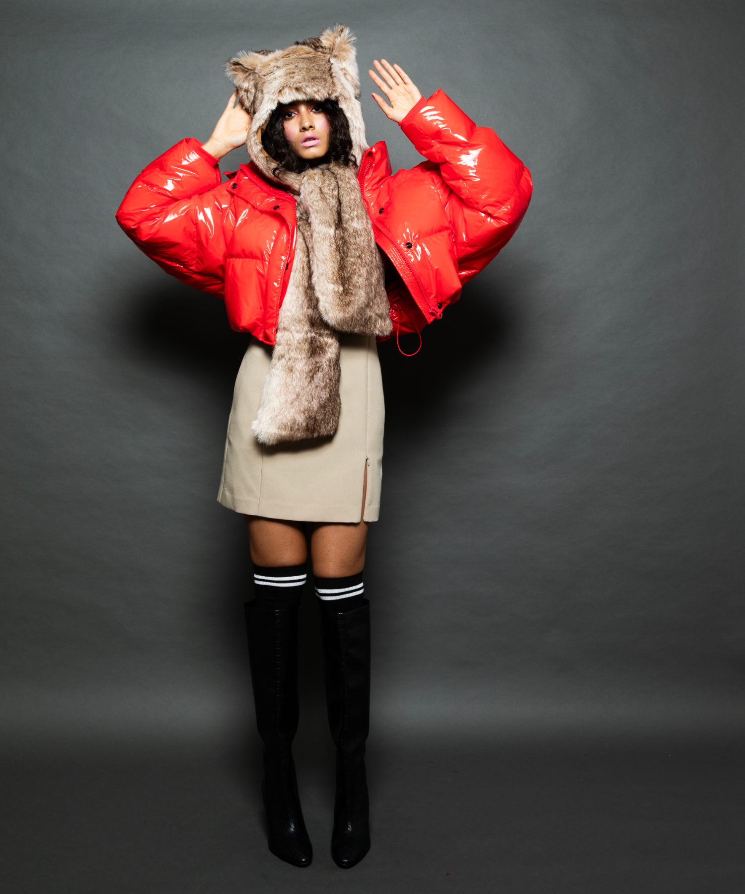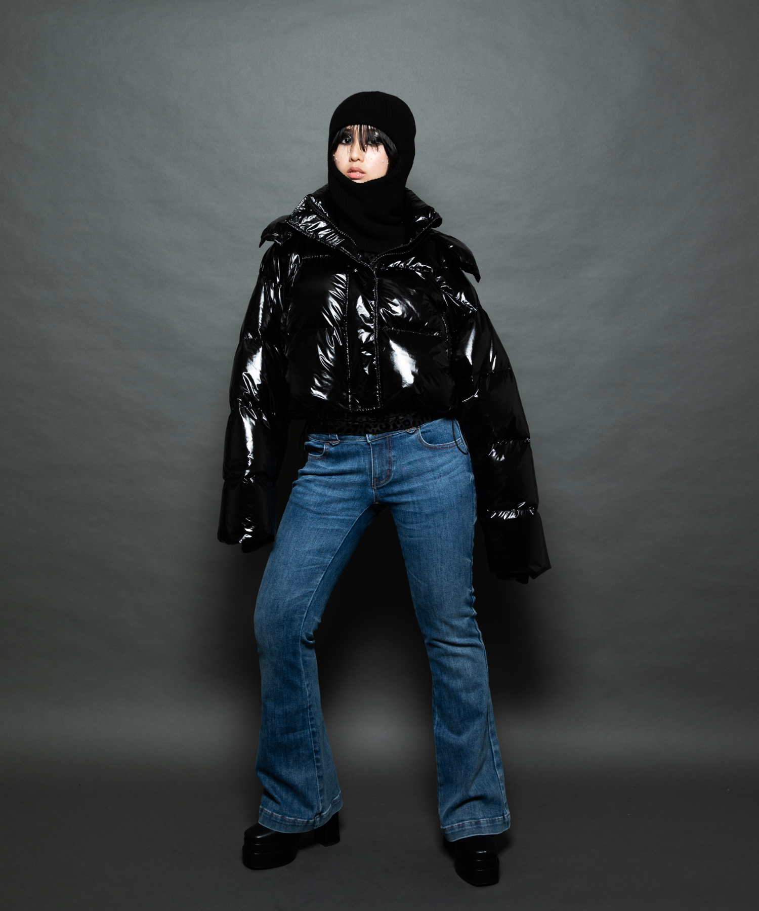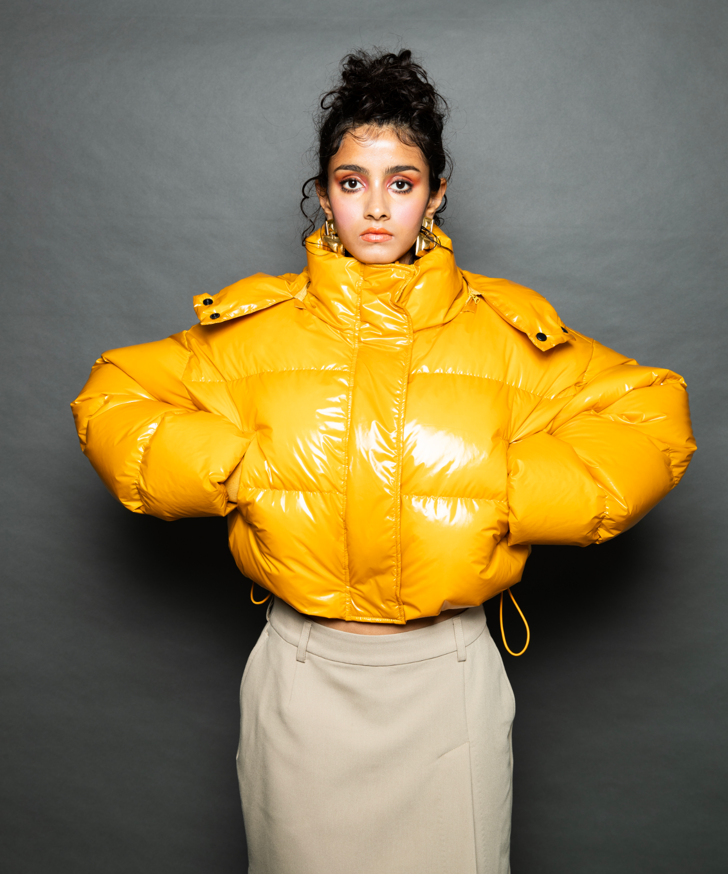 ツヤツヤの素材がフューチャーリスティックなスーパーショート丈のダウンジャケット。フード有り無しで2wayになります。丈が短いので、ショート丈やロング丈、どちらのボトムとも相性が良いです。配色のメッシュポケットがスポーティーなデザインになっています