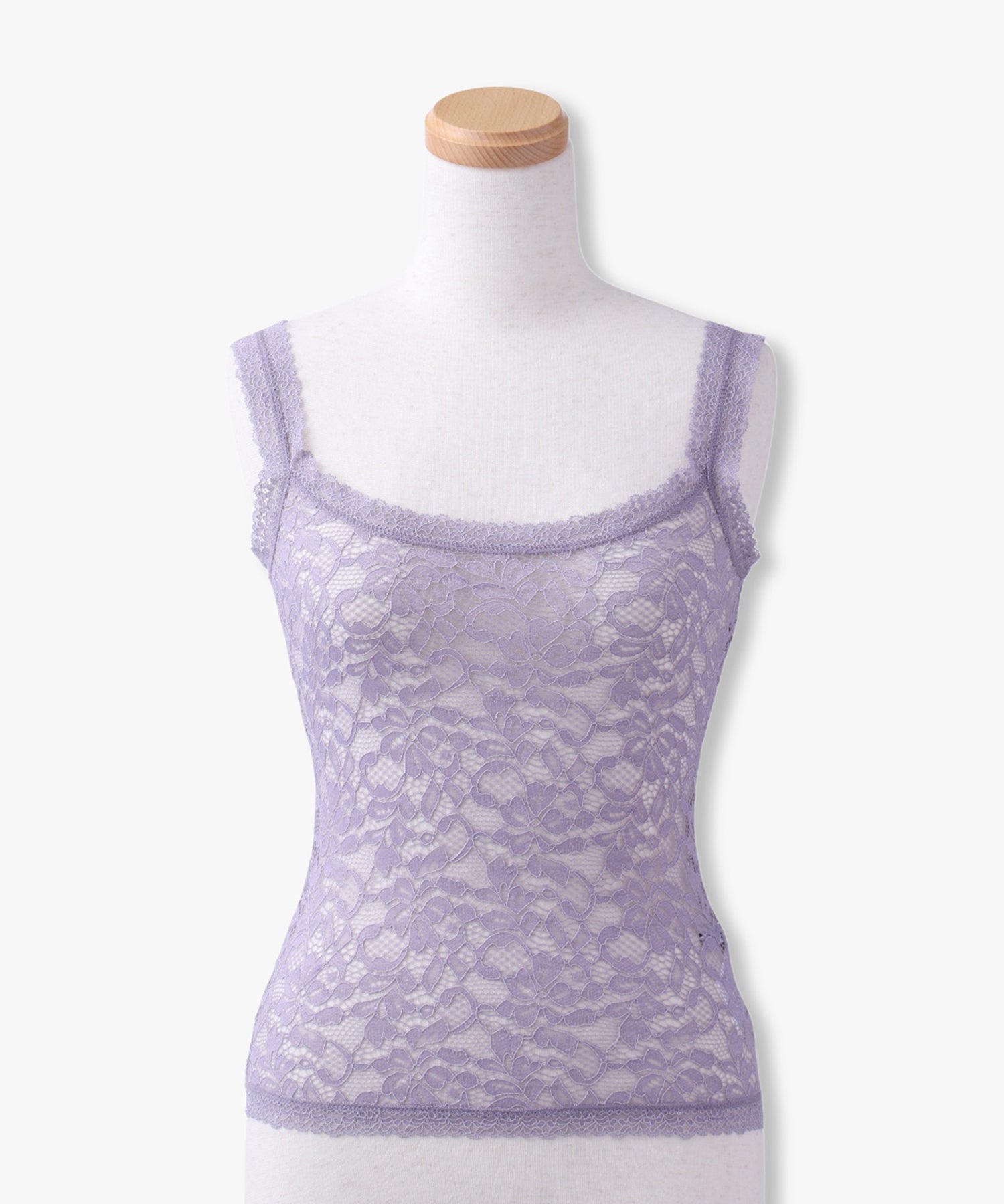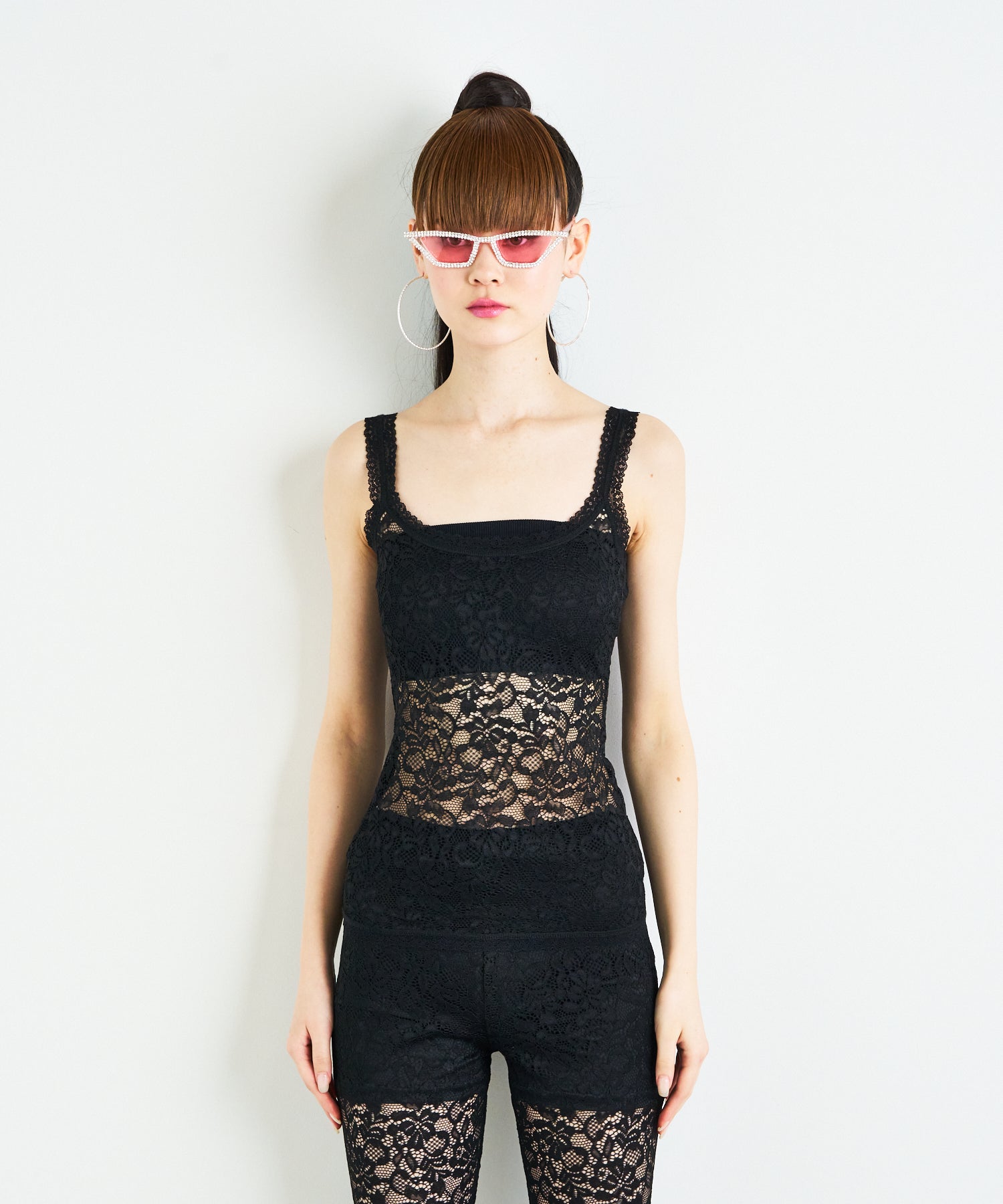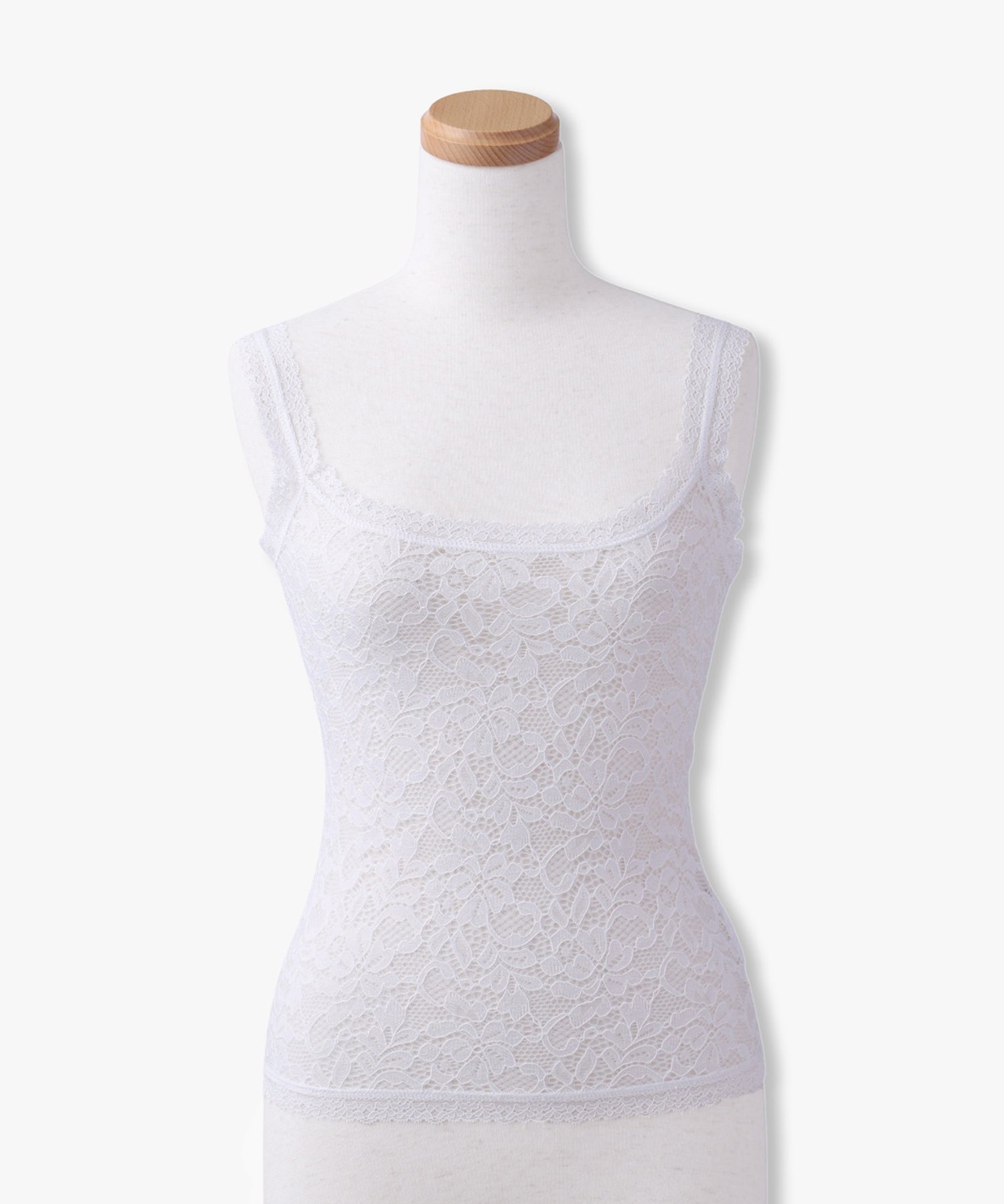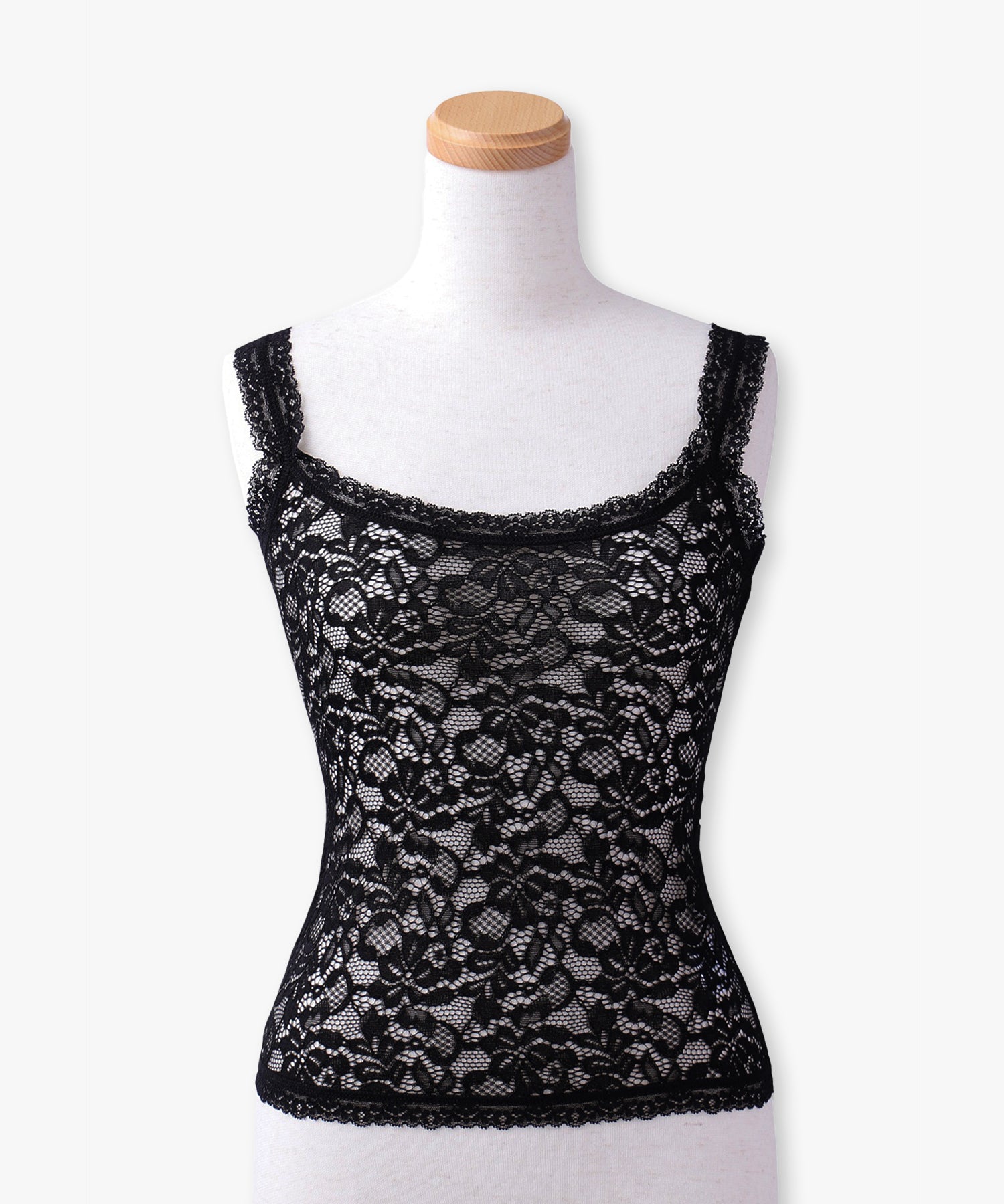 繊細な花柄モチーフのストレッチレースのタンクトップ。総レースなのでロゴタンクの上に重ねて透け感を楽しんだり、クロップド丈のトップスの裾からチラ見せしたり、魅せ方は色々。シンプルな形だからこそ着る方の個性を引き出してくれるアイテムです。