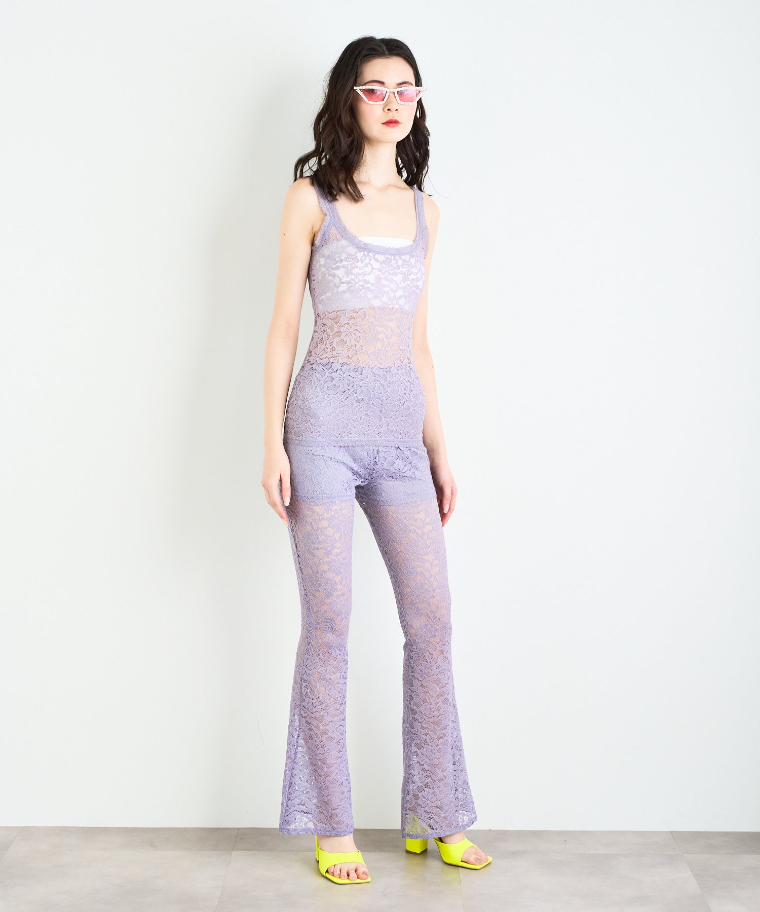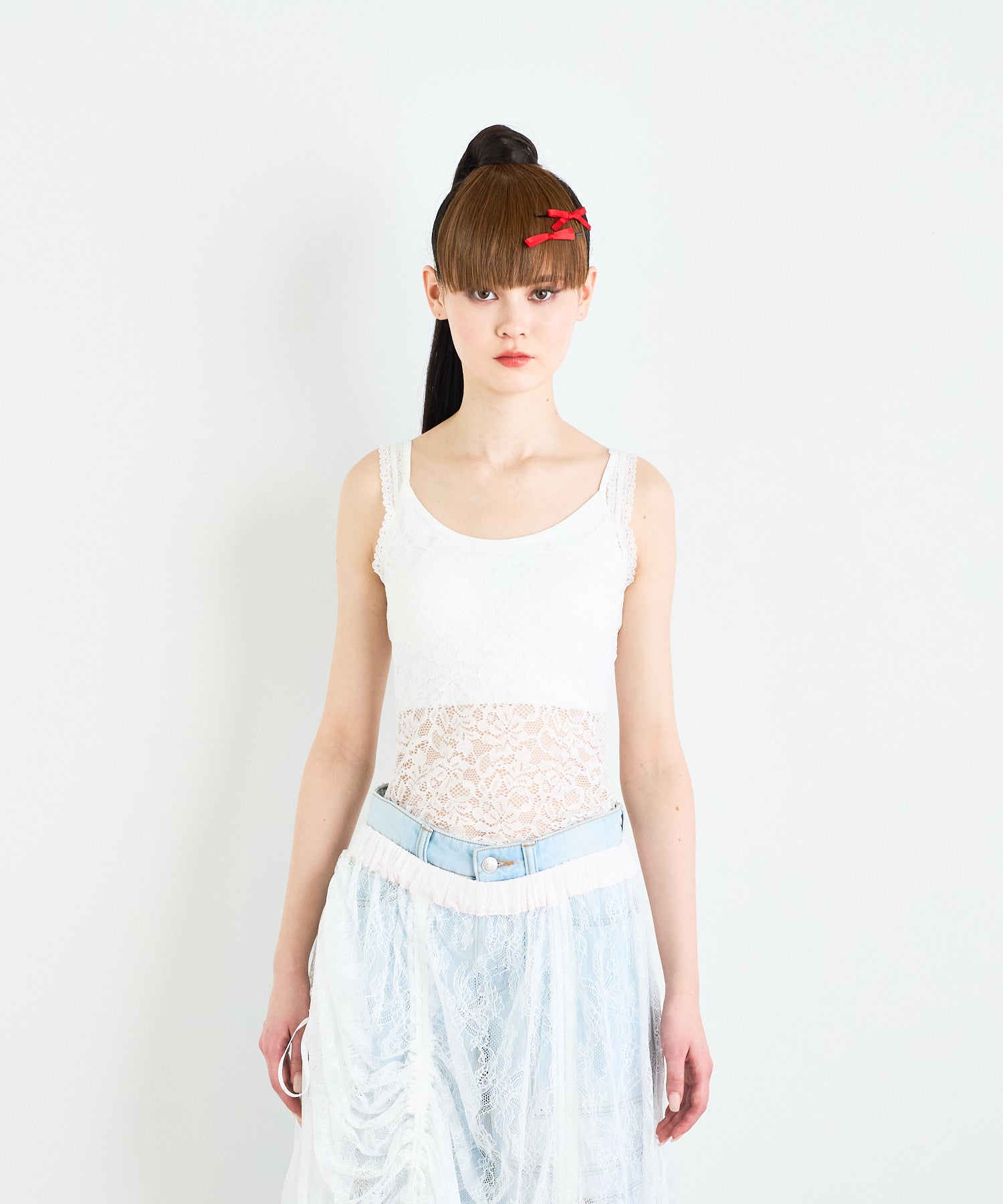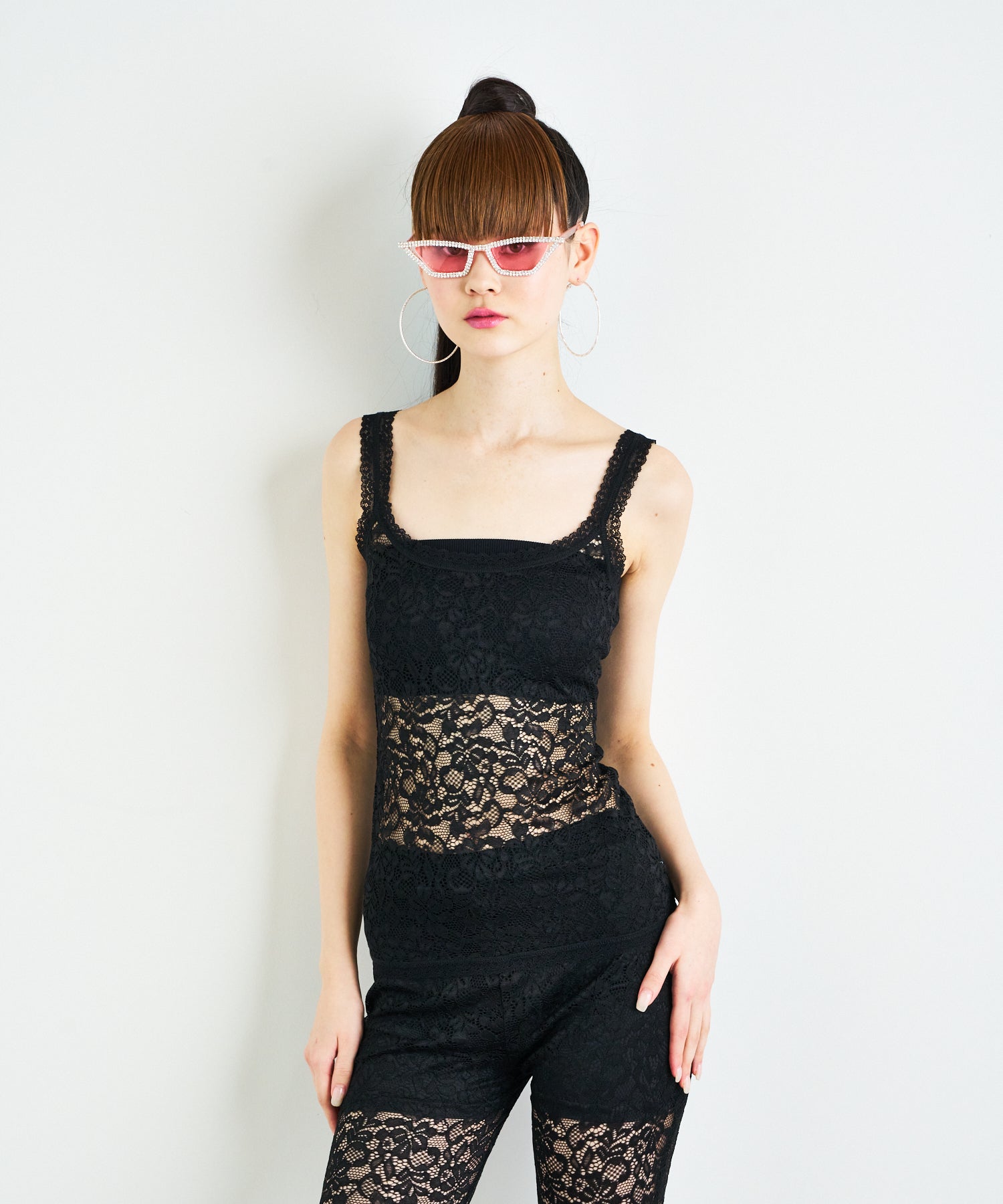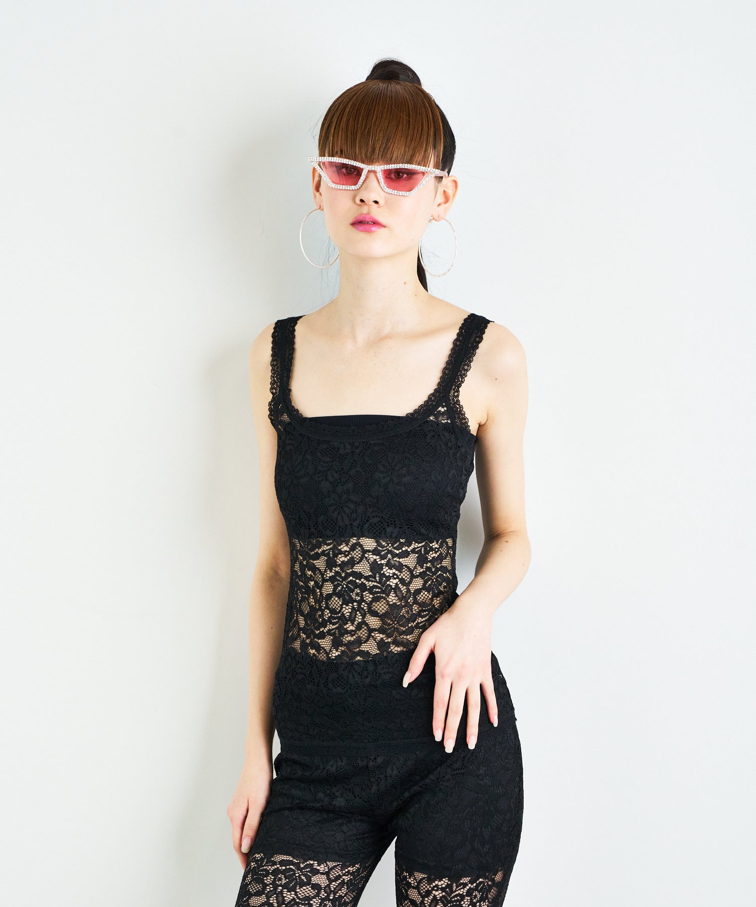 繊細な花柄モチーフのストレッチレースのタンクトップ。総レースなのでロゴタンクの上に重ねて透け感を楽しんだり、クロップド丈のトップスの裾からチラ見せしたり、魅せ方は色々。シンプルな形だからこそ着る方の個性を引き出してくれるアイテムです。