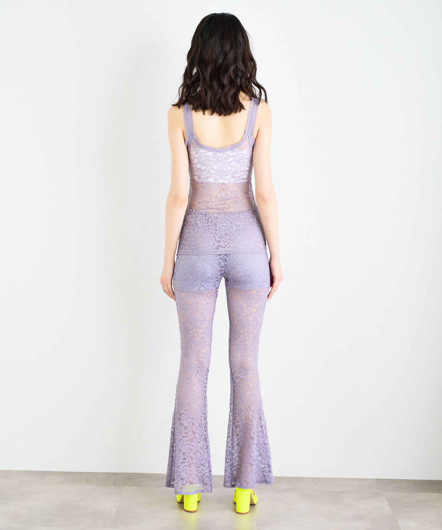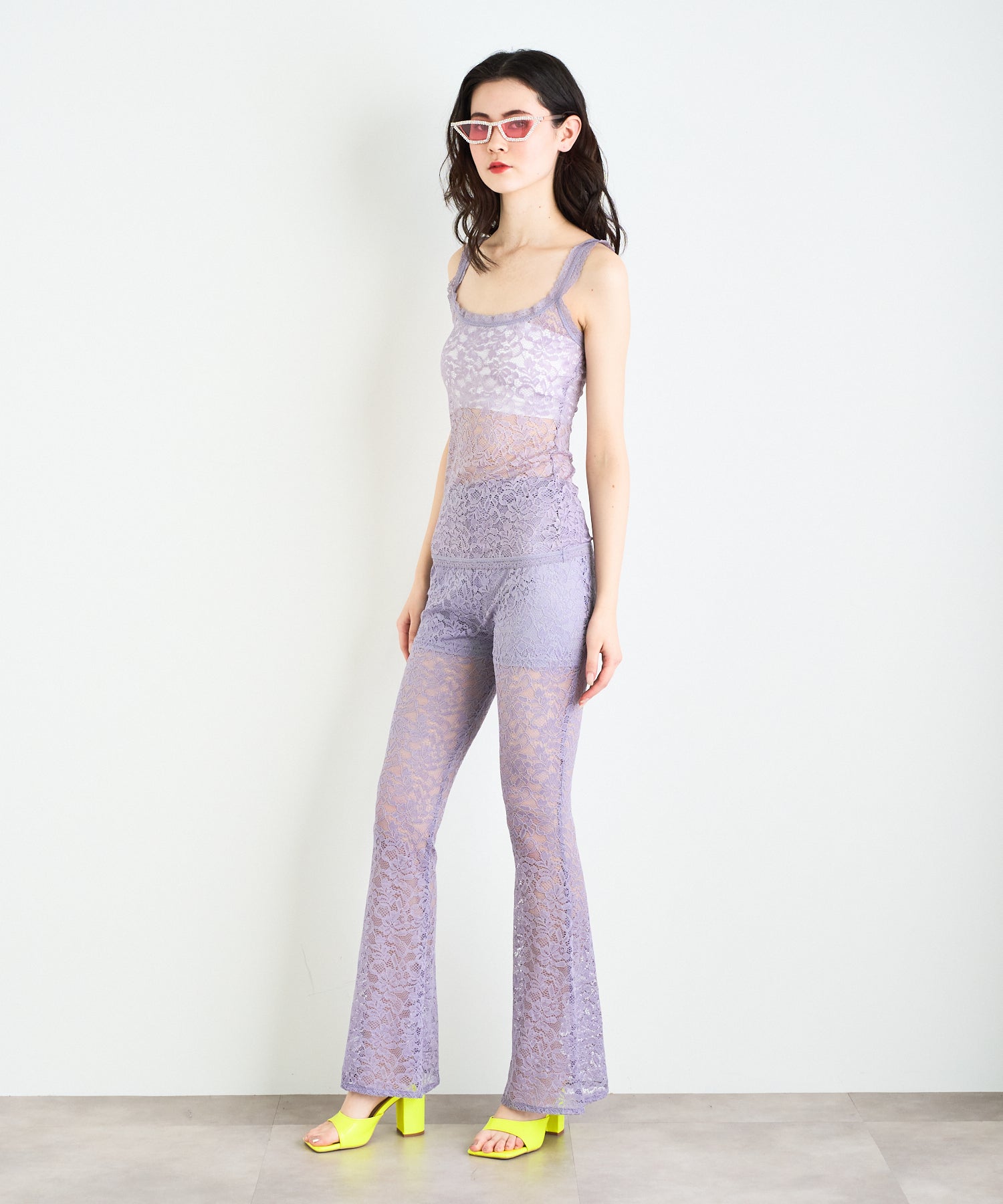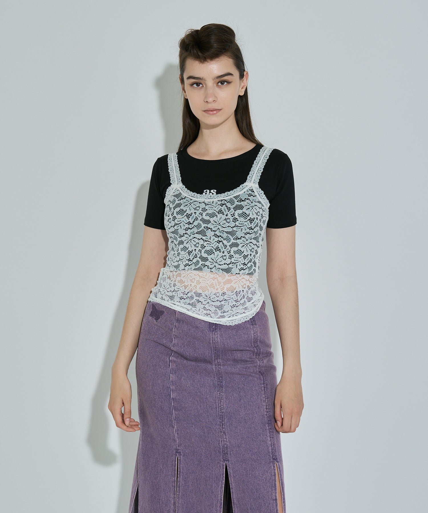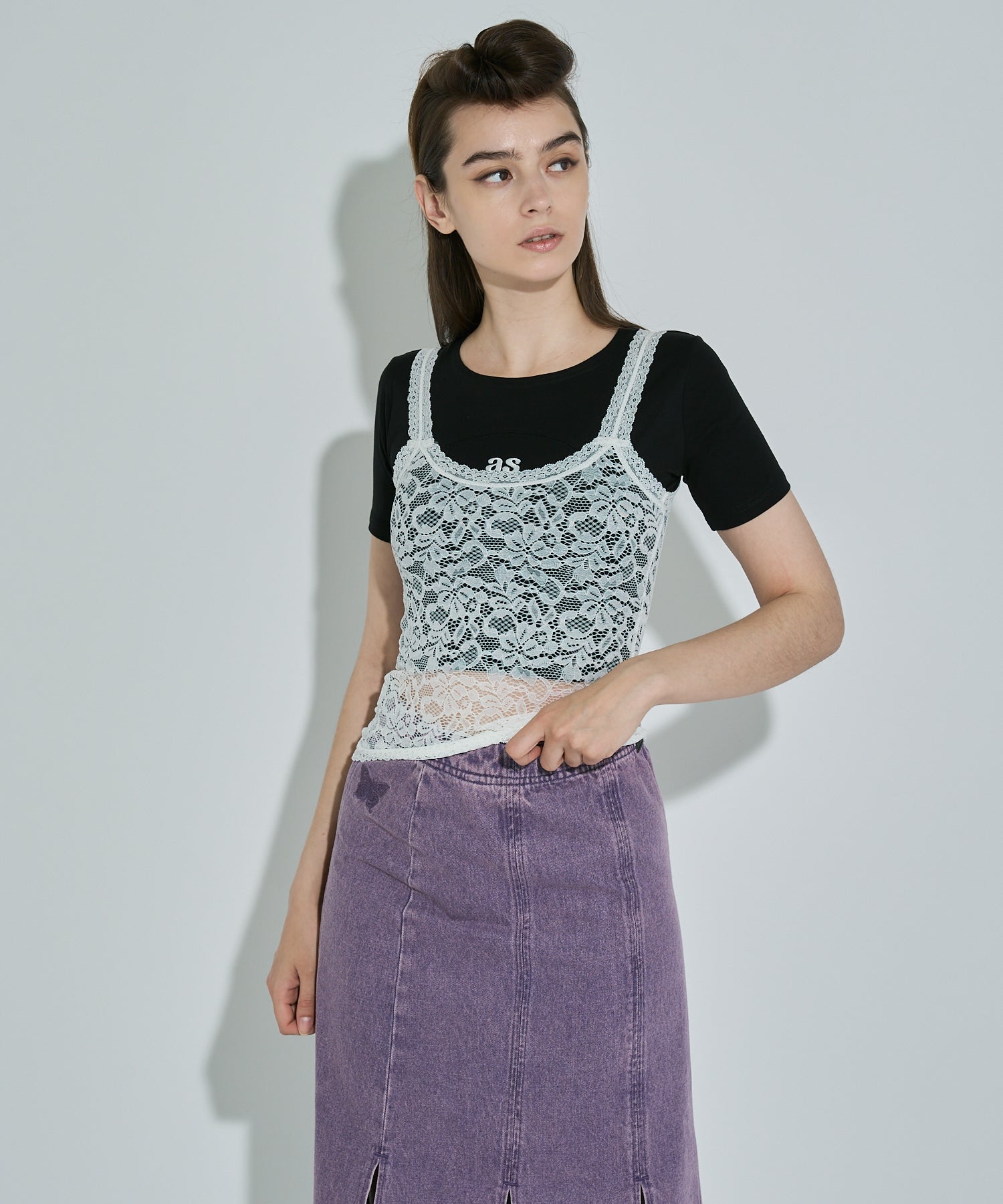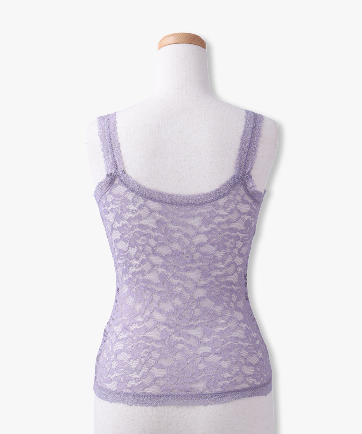 繊細な花柄モチーフのストレッチレースのタンクトップ。総レースなのでロゴタンクの上に重ねて透け感を楽しんだり、クロップド丈のトップスの裾からチラ見せしたり、魅せ方は色々。シンプルな形だからこそ着る方の個性を引き出してくれるアイテムです。