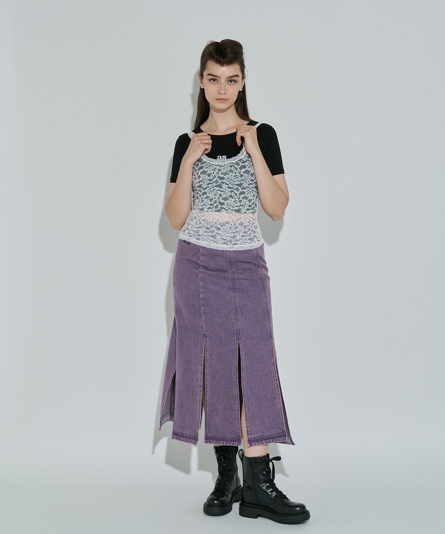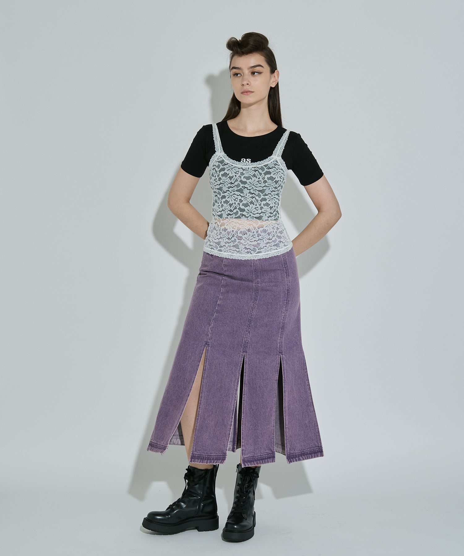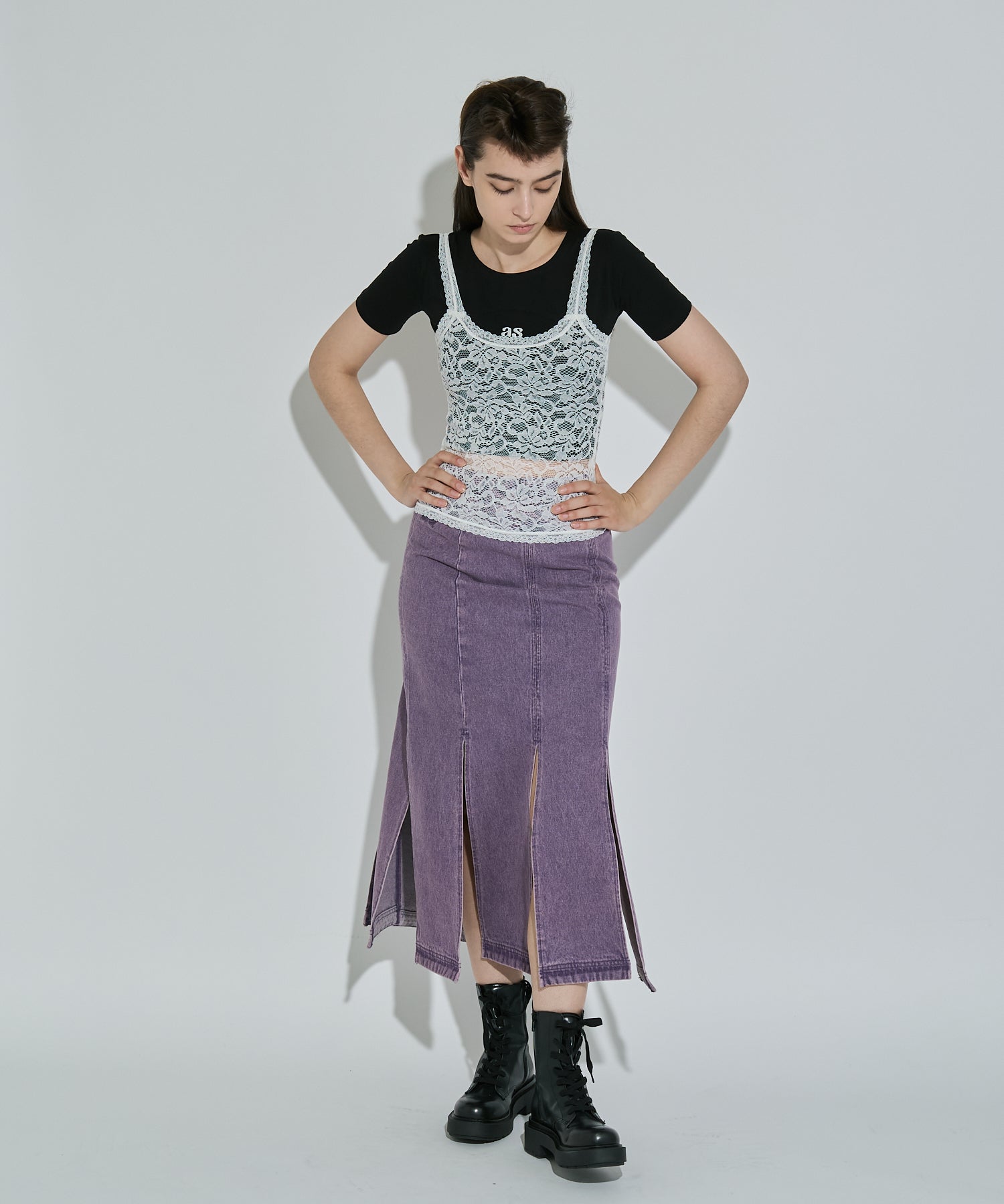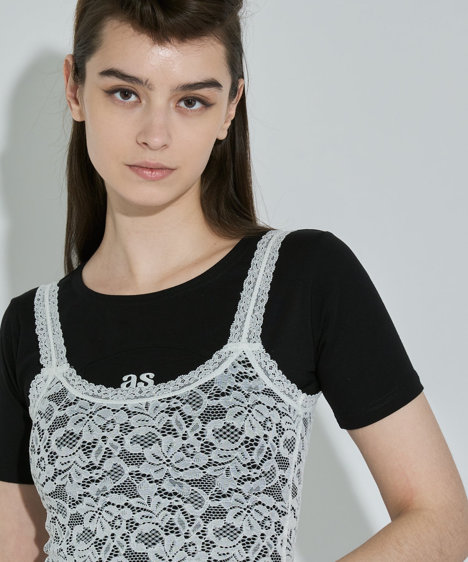 繊細な花柄モチーフのストレッチレースのタンクトップ。総レースなのでロゴタンクの上に重ねて透け感を楽しんだり、クロップド丈のトップスの裾からチラ見せしたり、魅せ方は色々。シンプルな形だからこそ着る方の個性を引き出してくれるアイテムです。