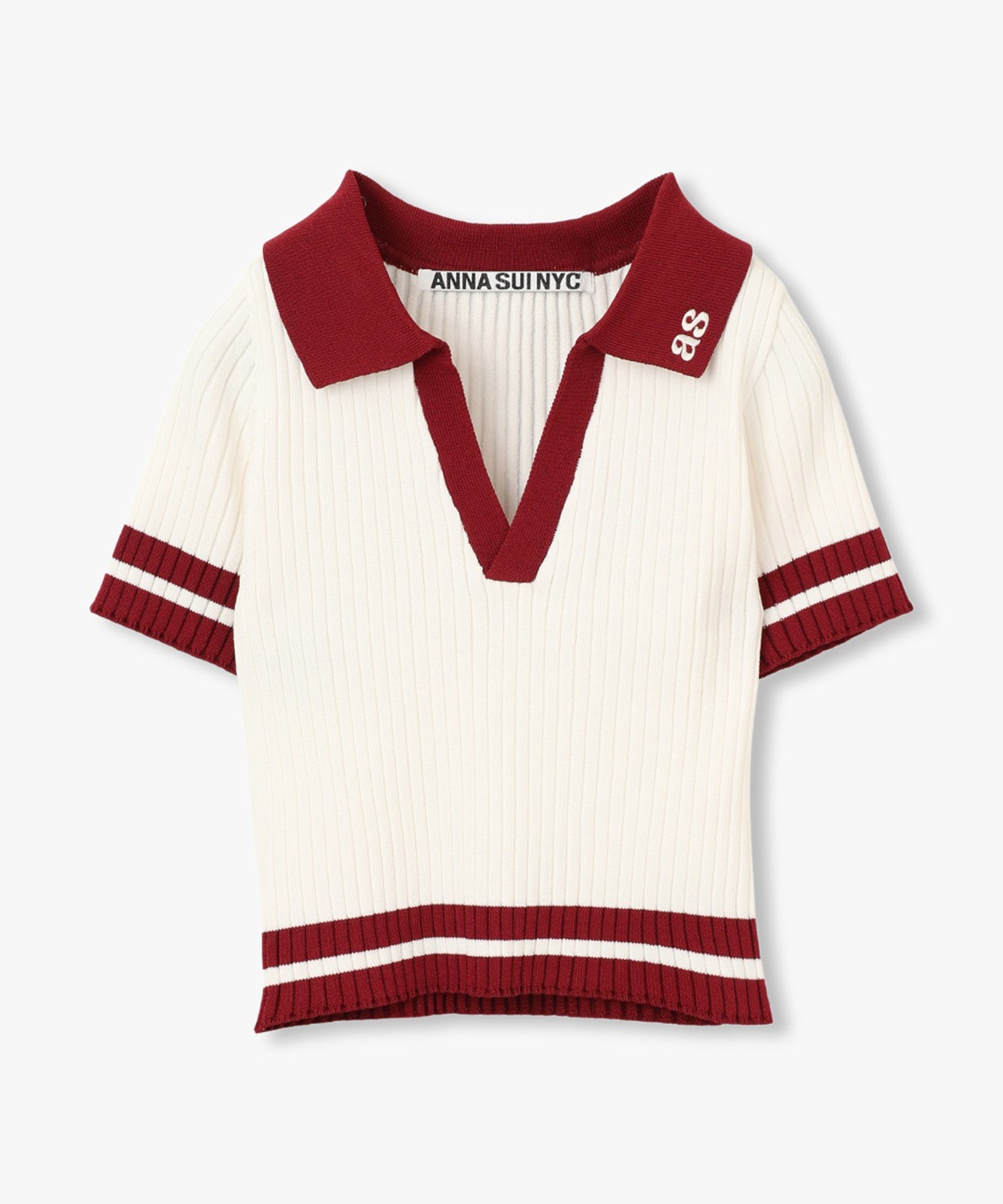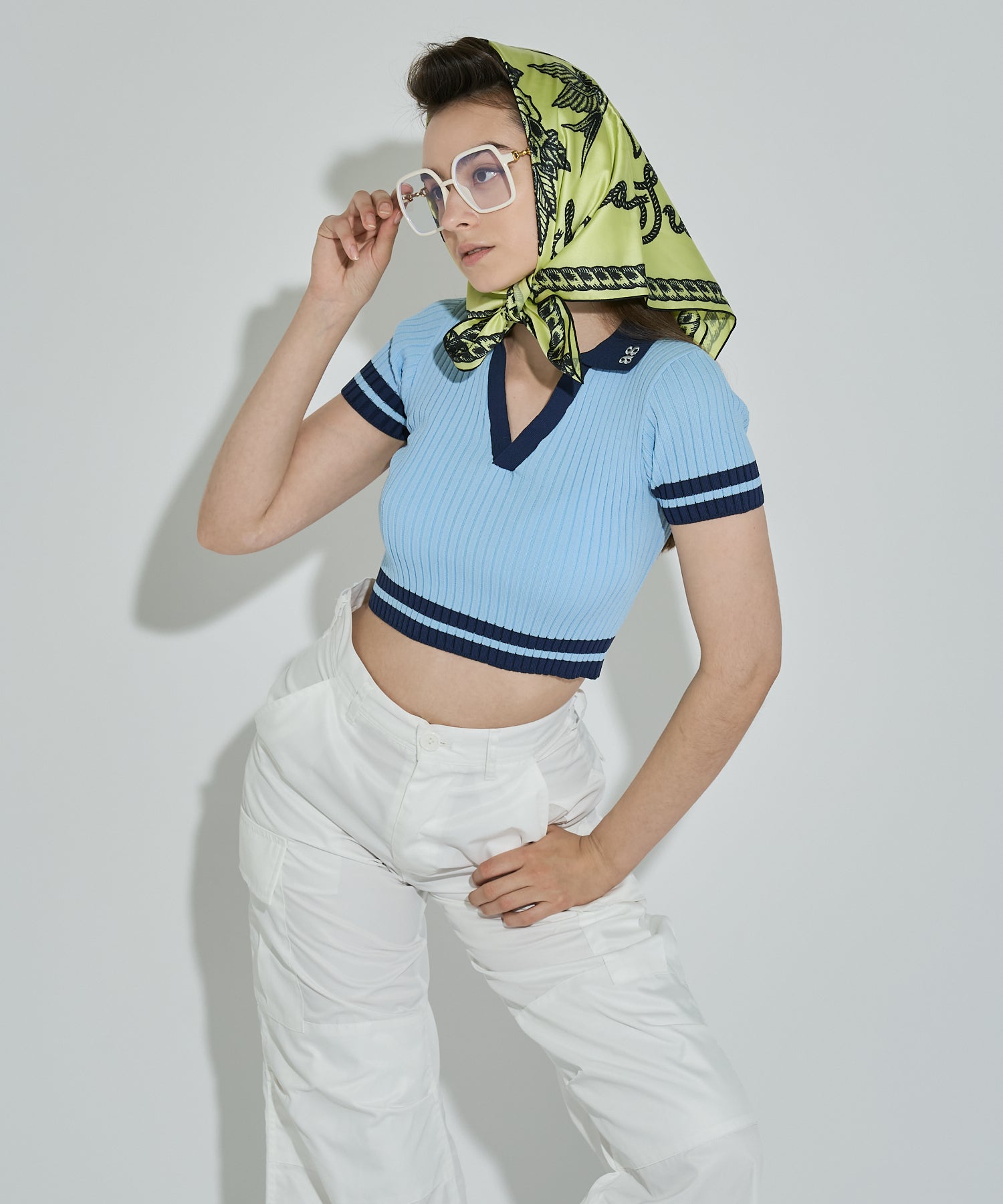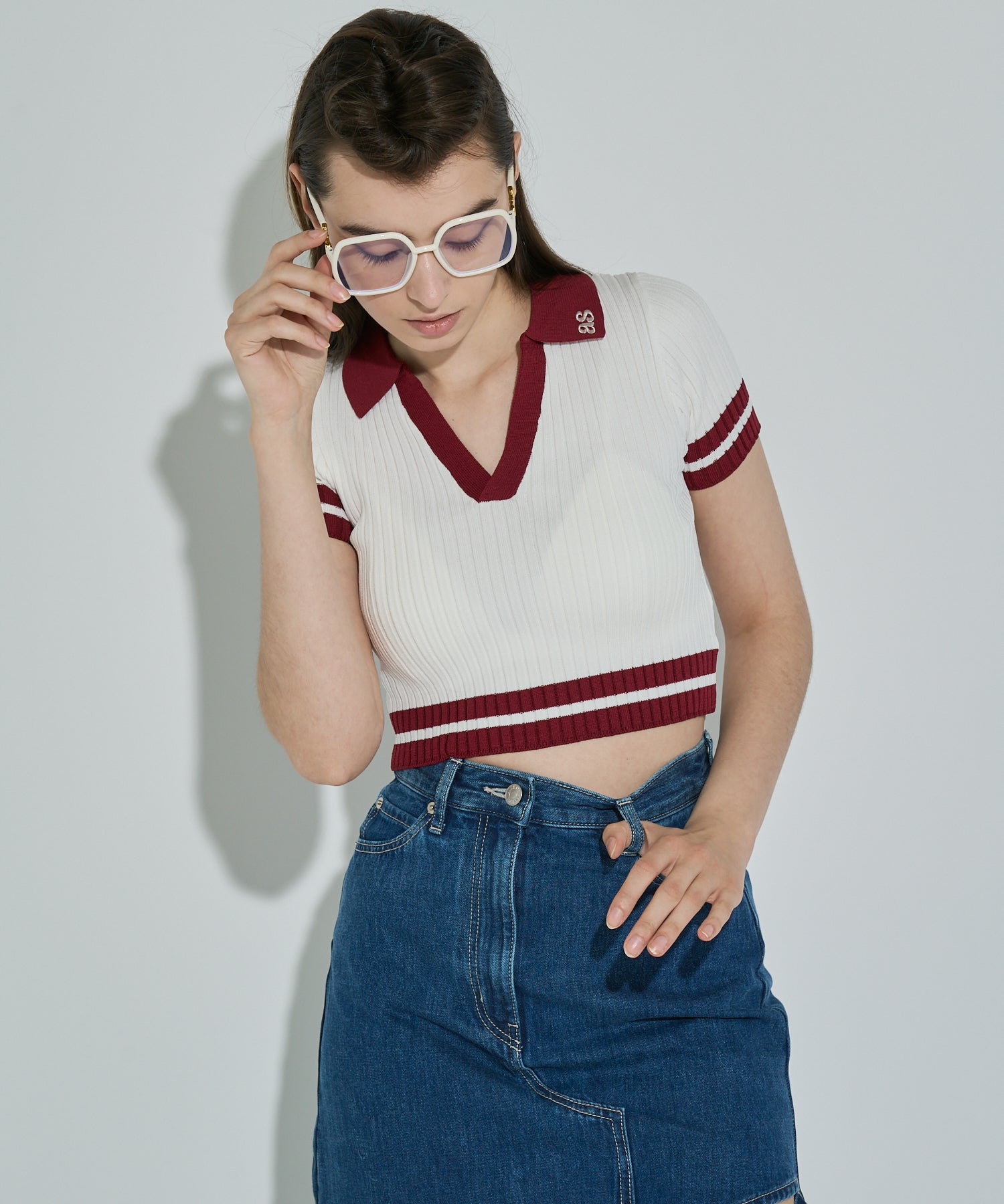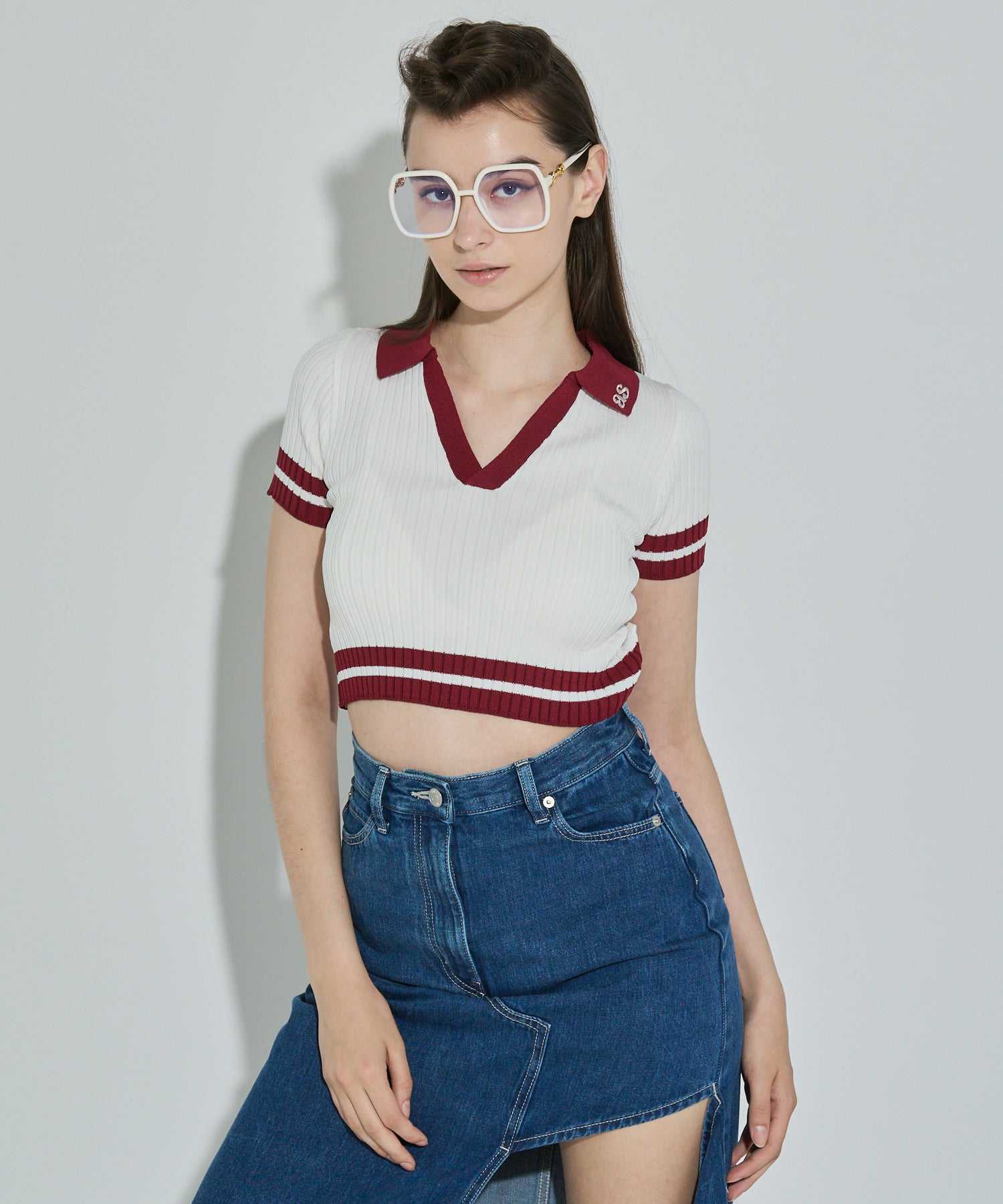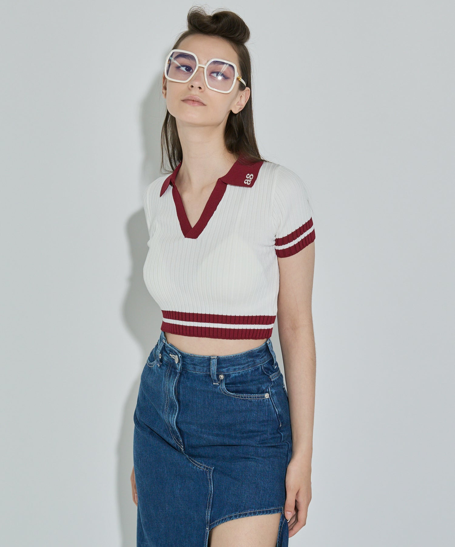 チアリーダーのユニフォームからインスパイアされたコンパクトなサイジングのニットポロシャツ。ラインや衿の配色、さりげないロゴ刺繍など細部までデザインポイントをプラス!大きめに開いたVネックが首元をスッキリと女性らしく見せてくれます。