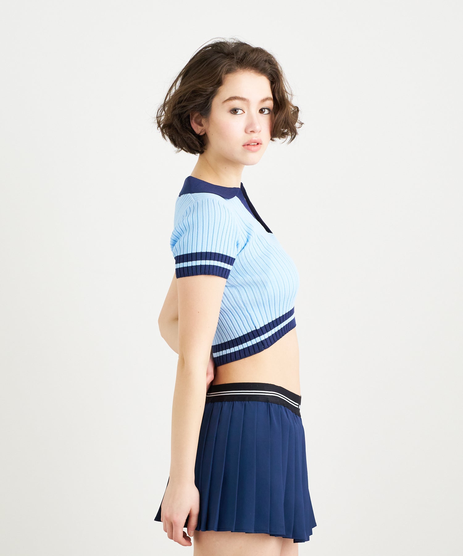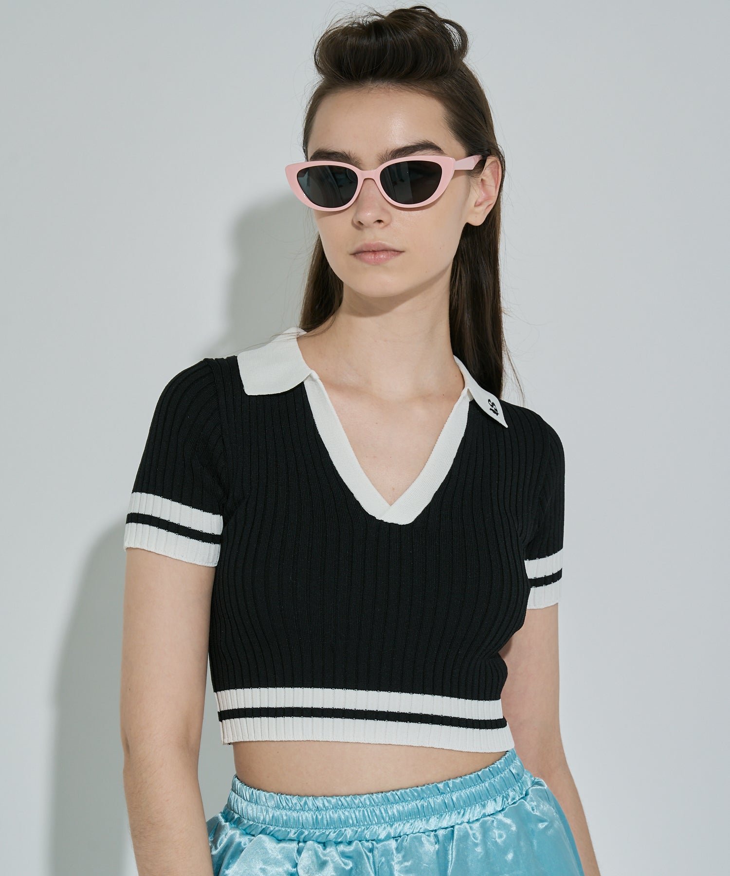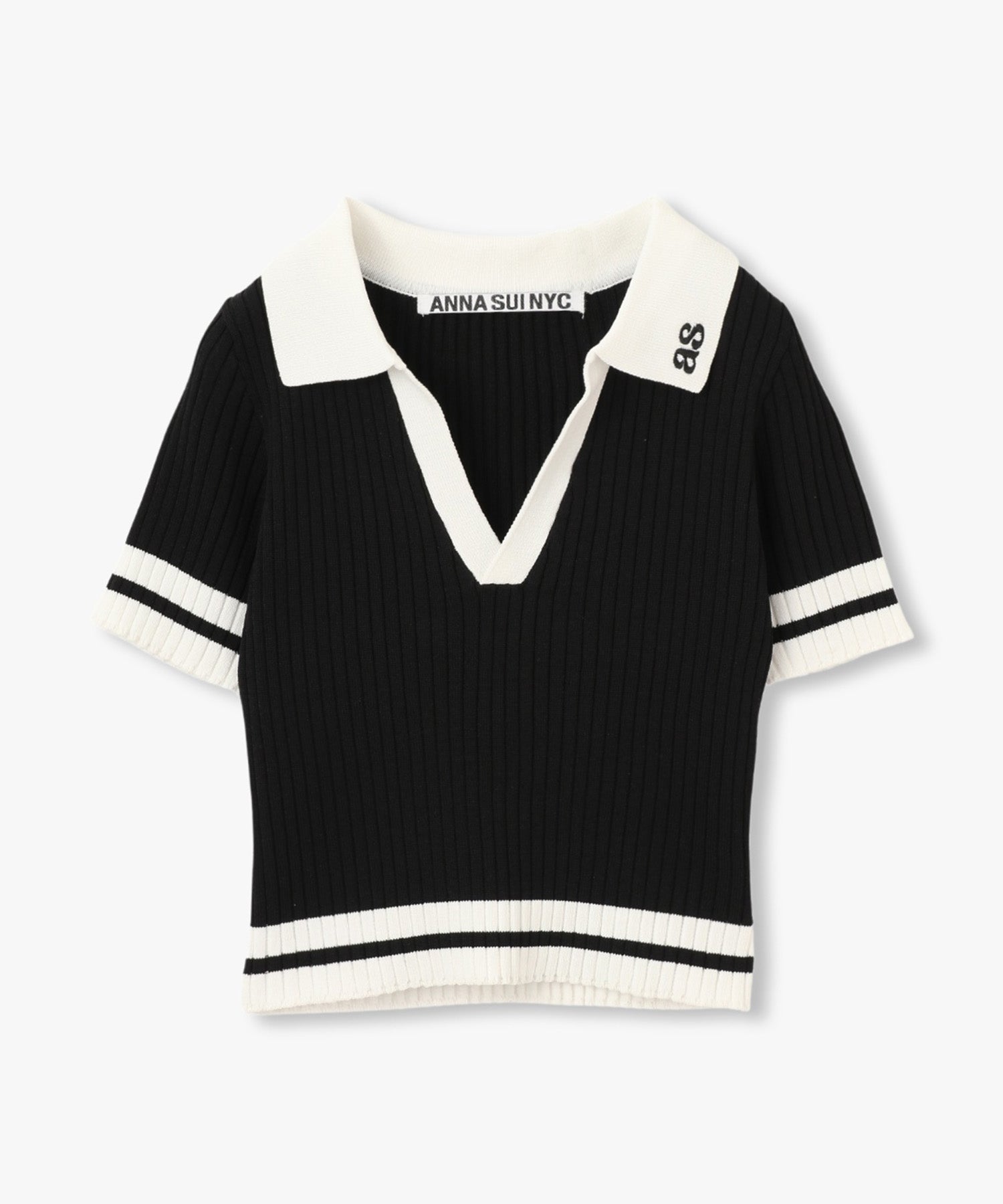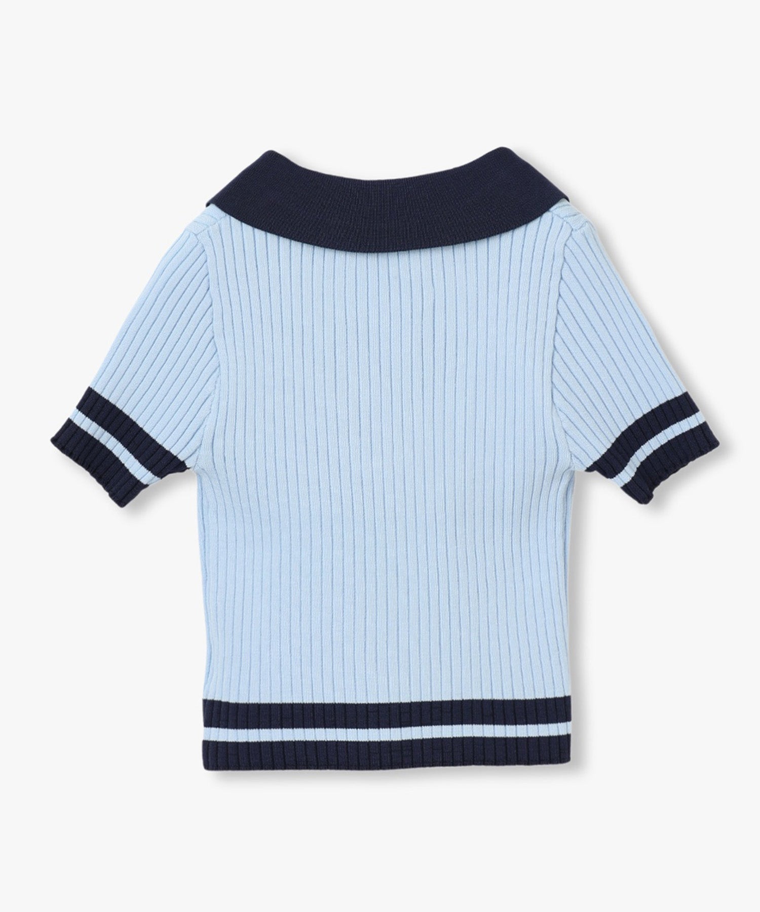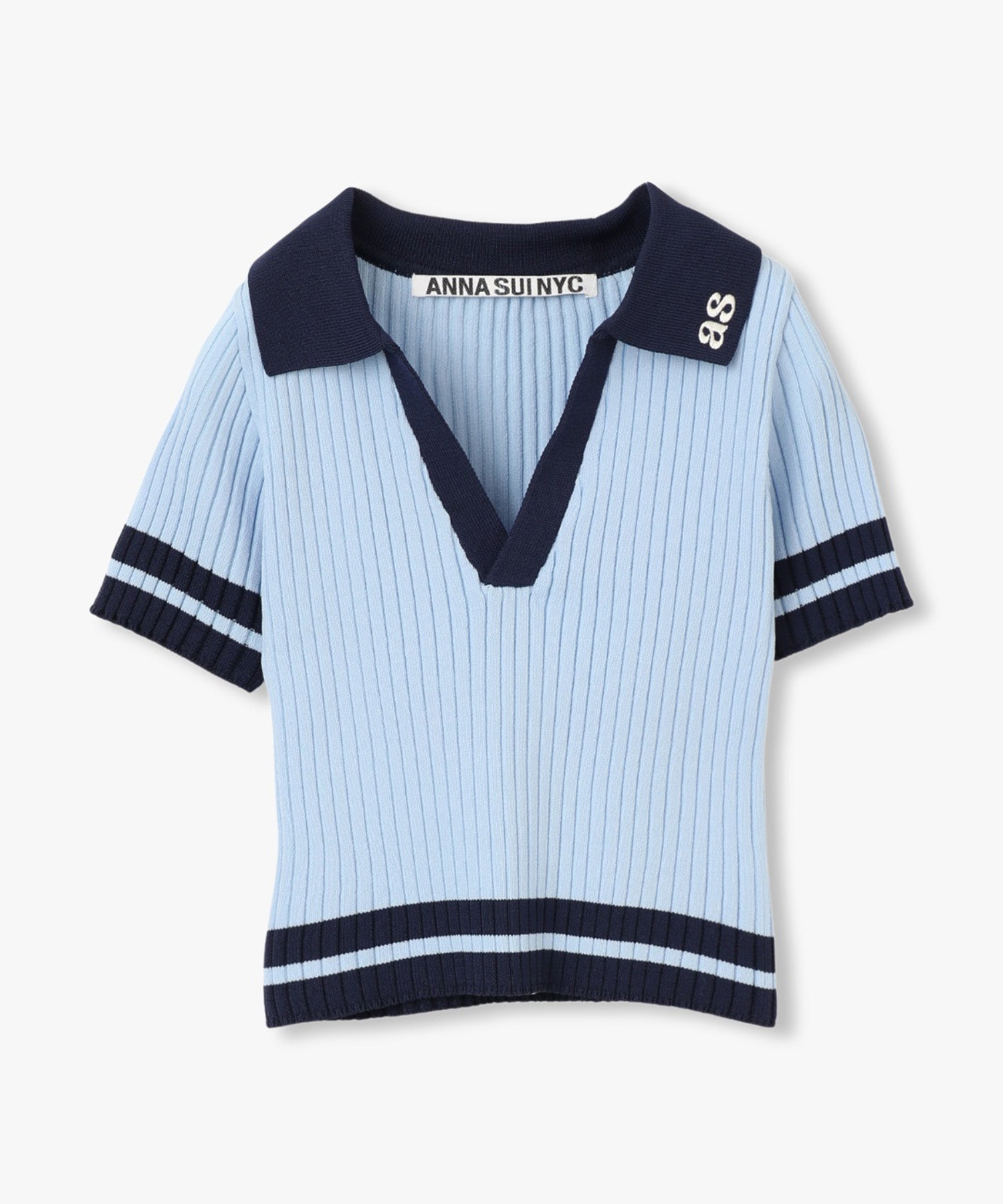 チアリーダーのユニフォームからインスパイアされたコンパクトなサイジングのニットポロシャツ。ラインや衿の配色、さりげないロゴ刺繍など細部までデザインポイントをプラス!大きめに開いたVネックが首元をスッキリと女性らしく見せてくれます。
