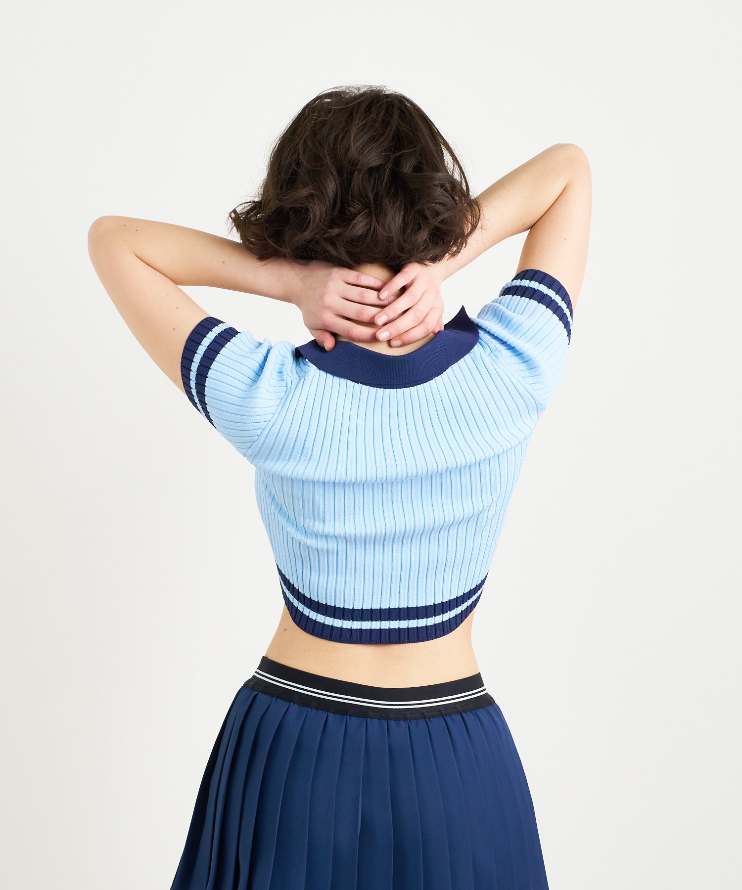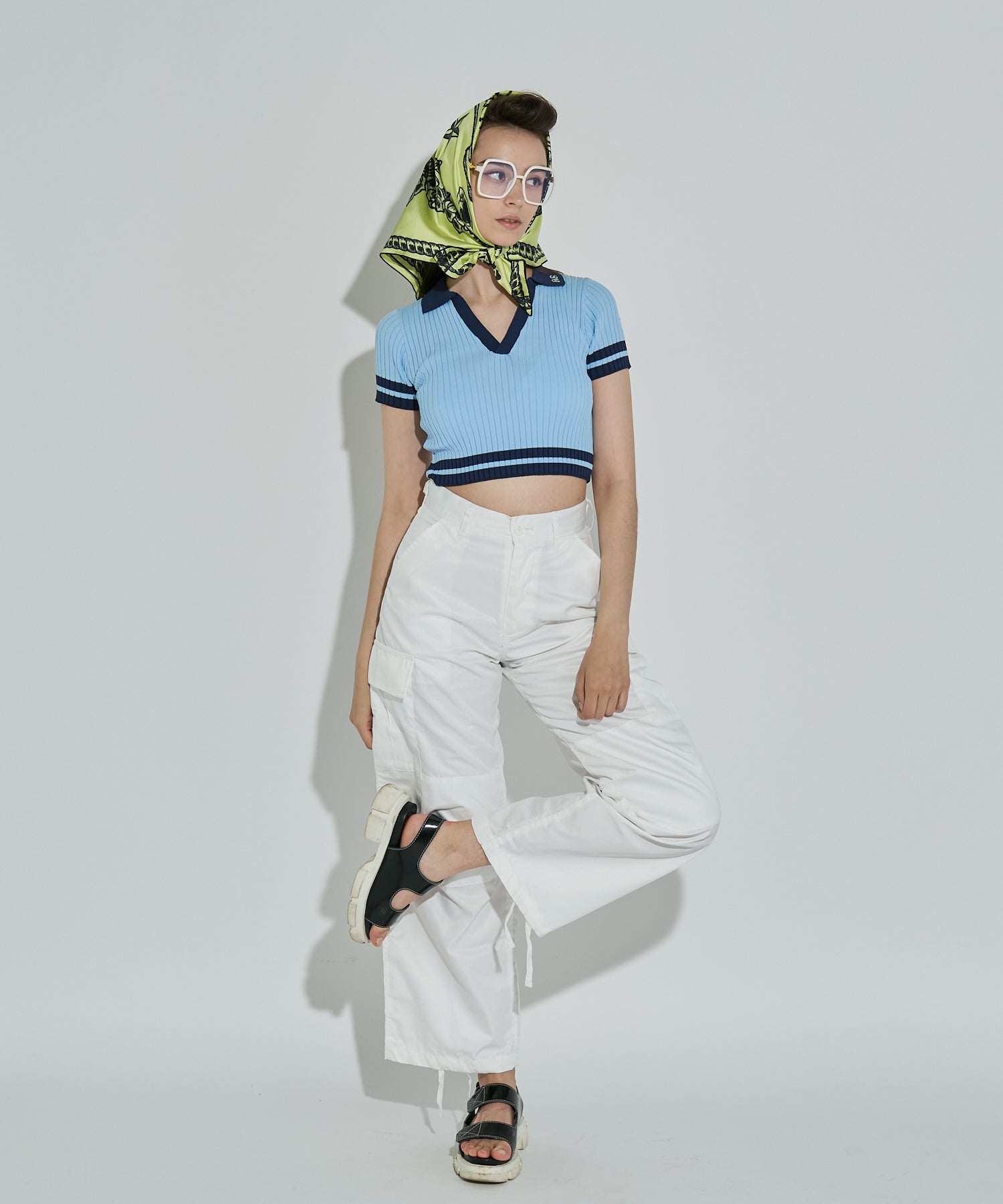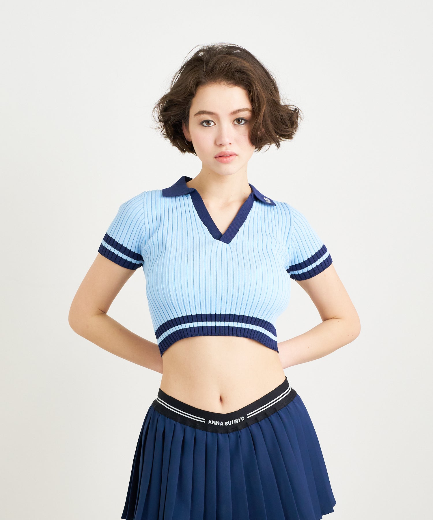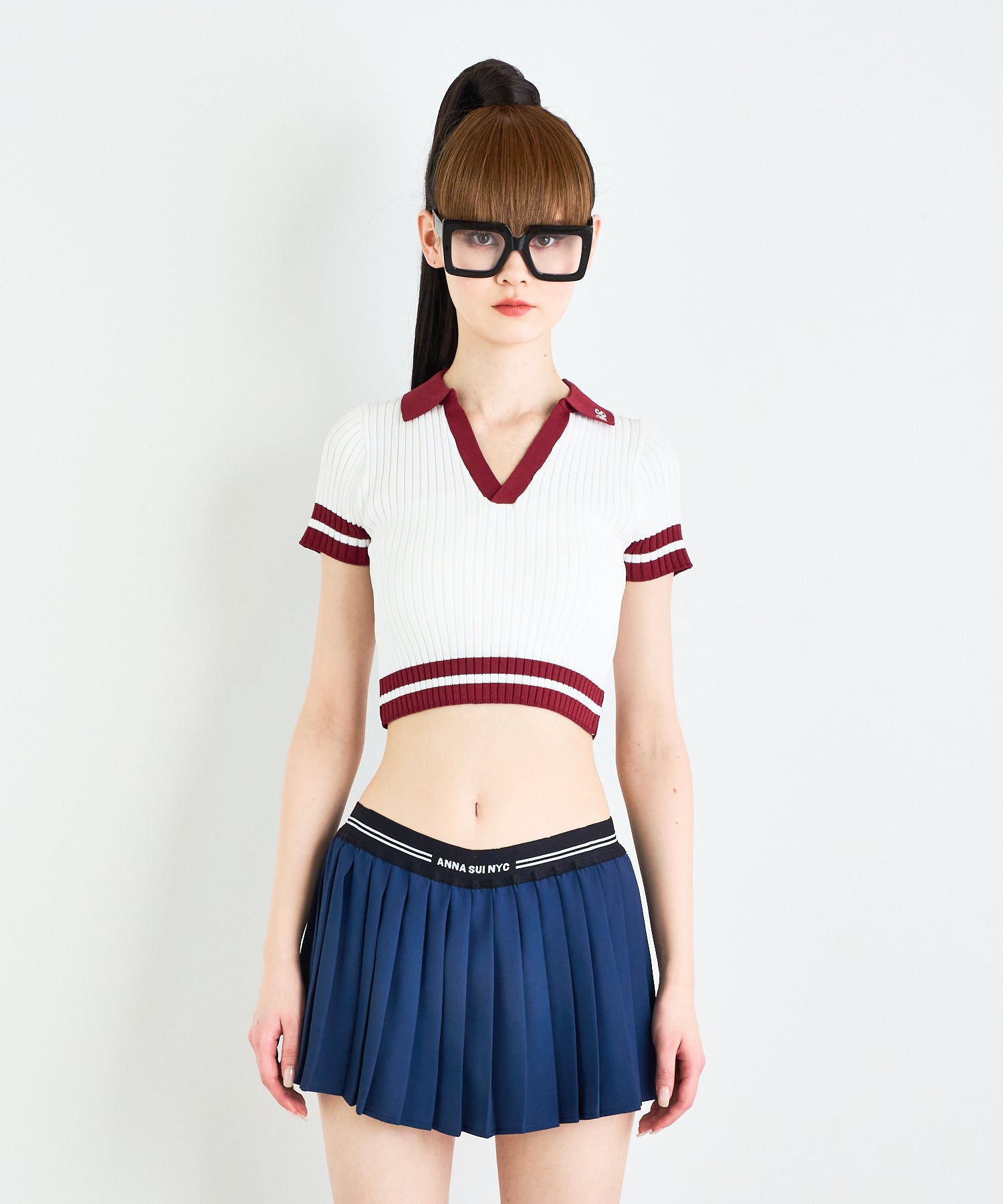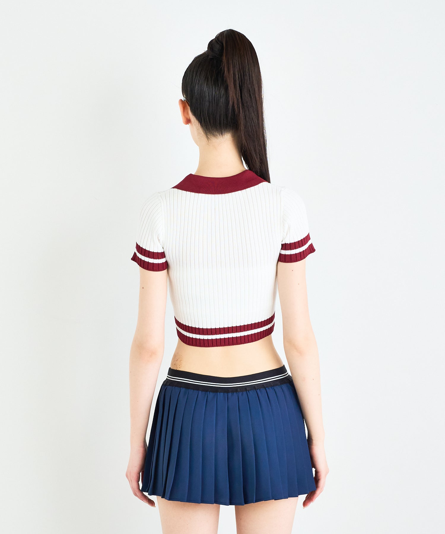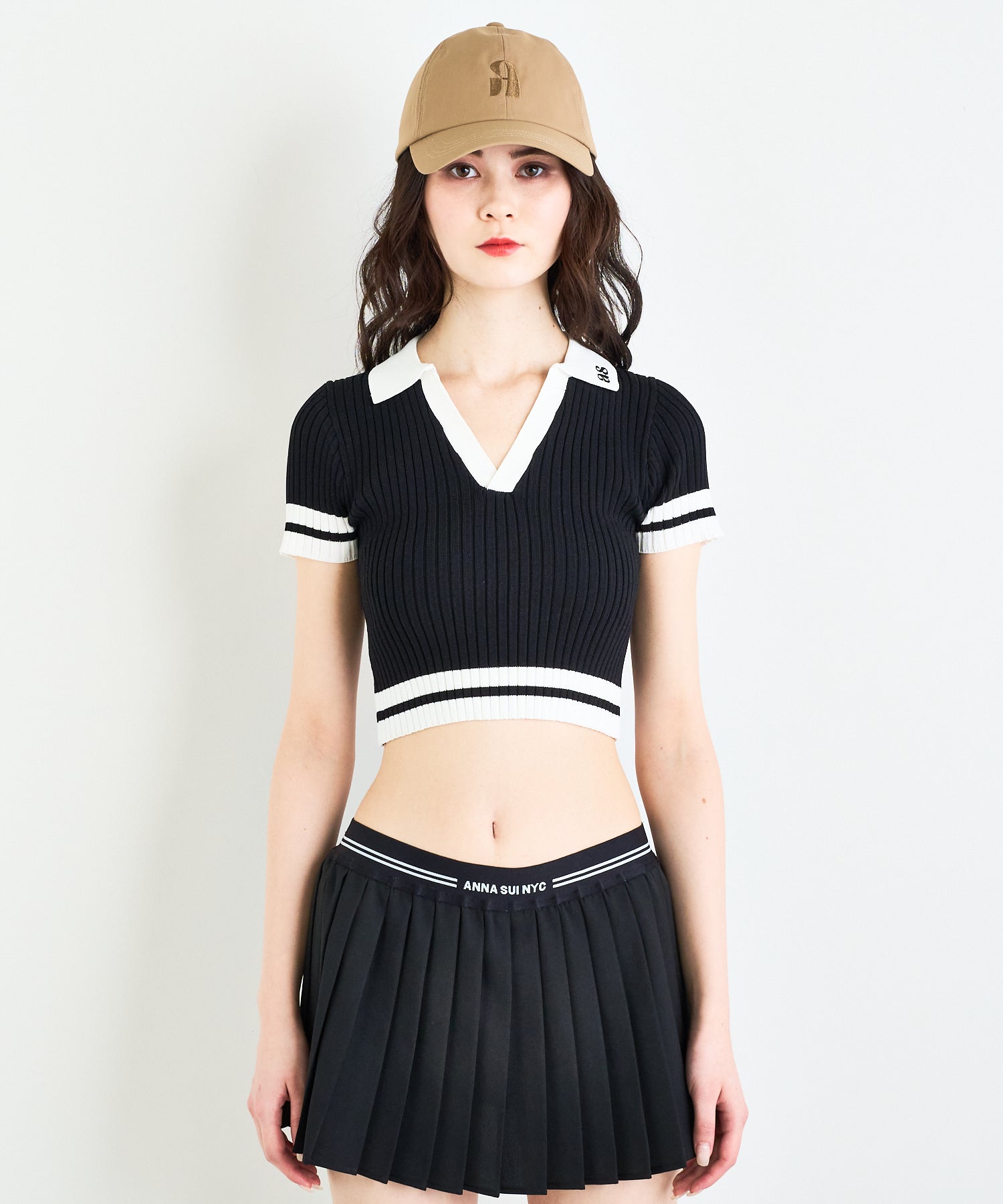 チアリーダーのユニフォームからインスパイアされたコンパクトなサイジングのニットポロシャツ。ラインや衿の配色、さりげないロゴ刺繍など細部までデザインポイントをプラス!大きめに開いたVネックが首元をスッキリと女性らしく見せてくれます。
