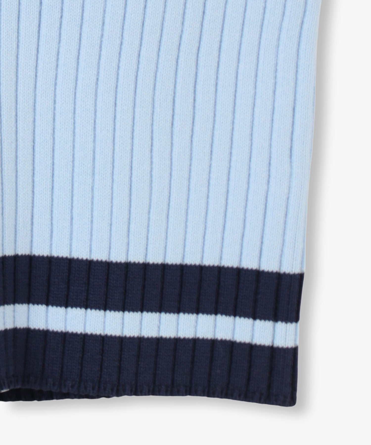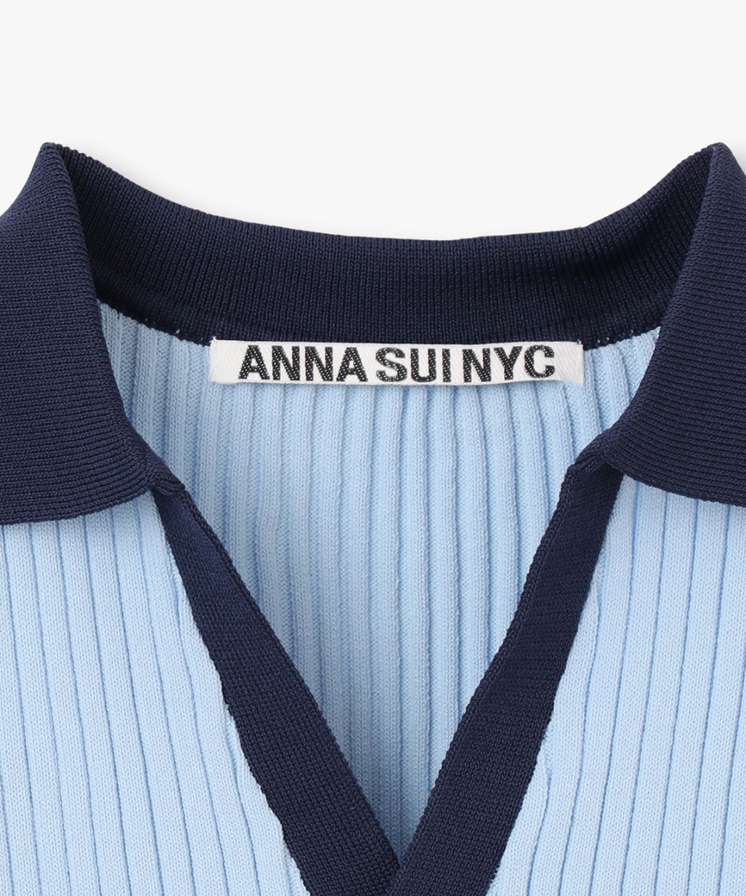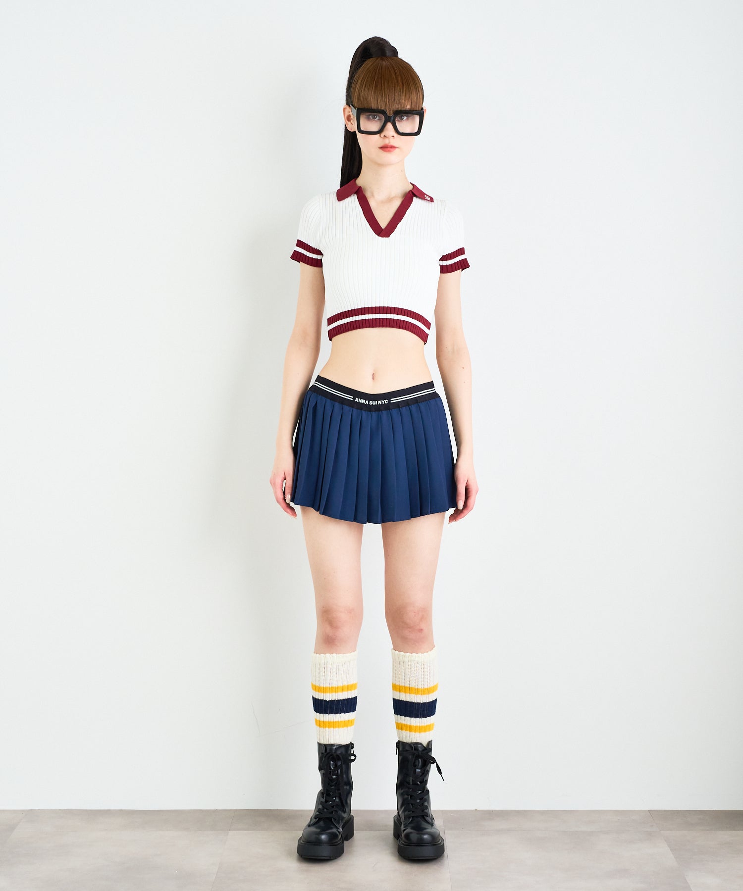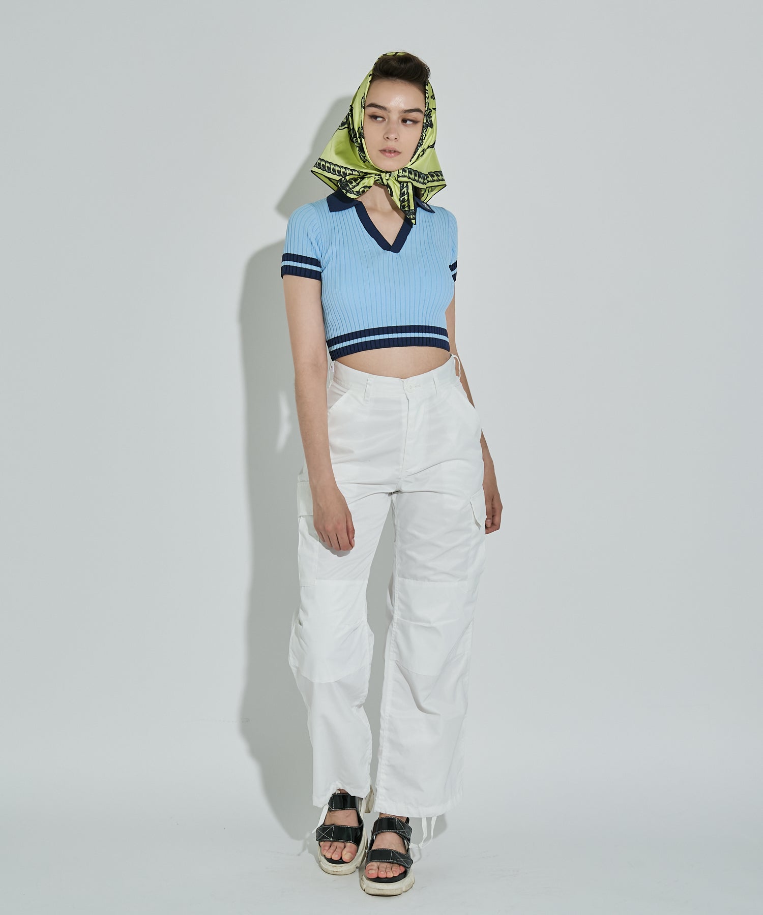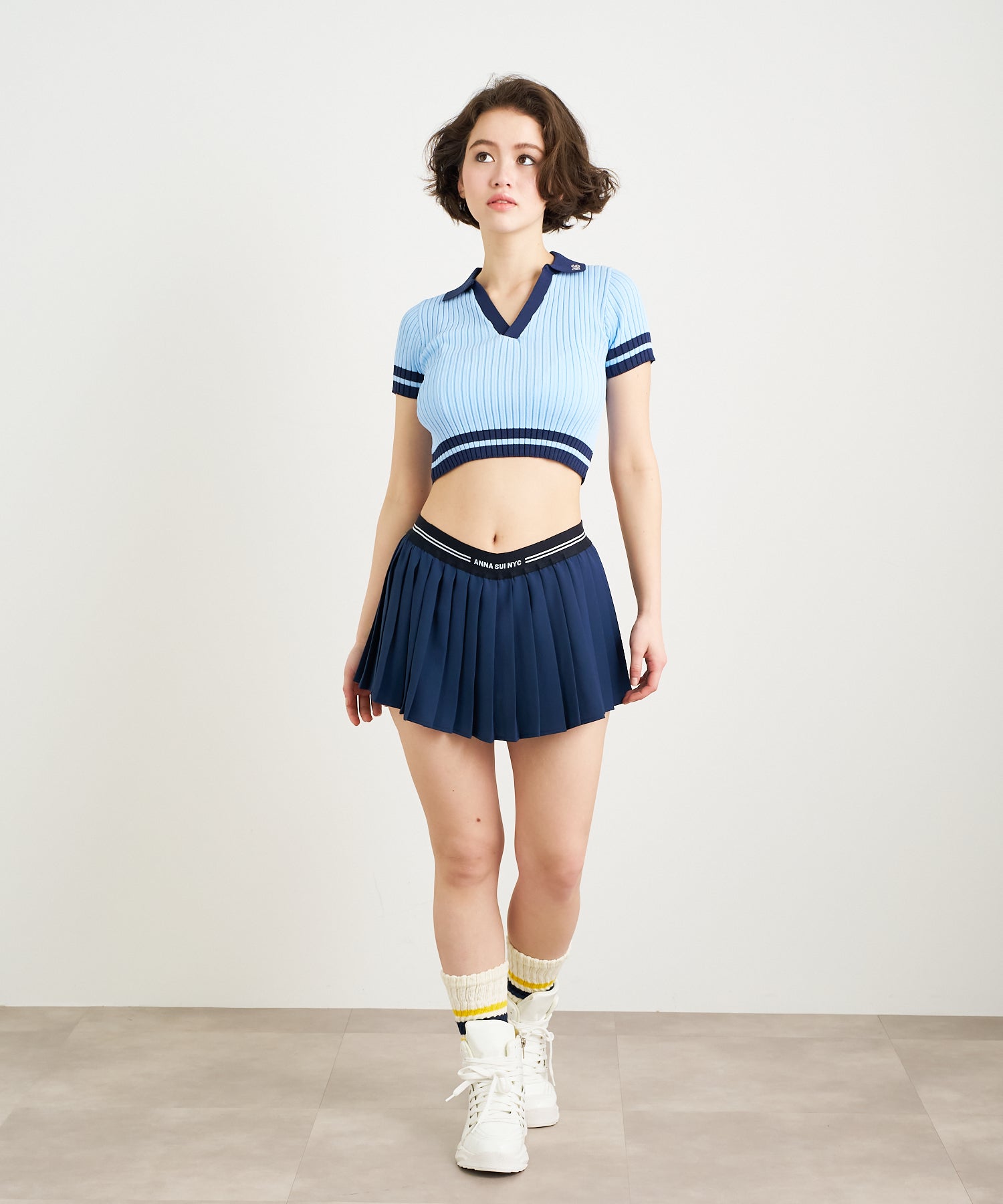 チアリーダーのユニフォームからインスパイアされたコンパクトなサイジングのニットポロシャツ。ラインや衿の配色、さりげないロゴ刺繍など細部までデザインポイントをプラス!大きめに開いたVネックが首元をスッキリと女性らしく見せてくれます。