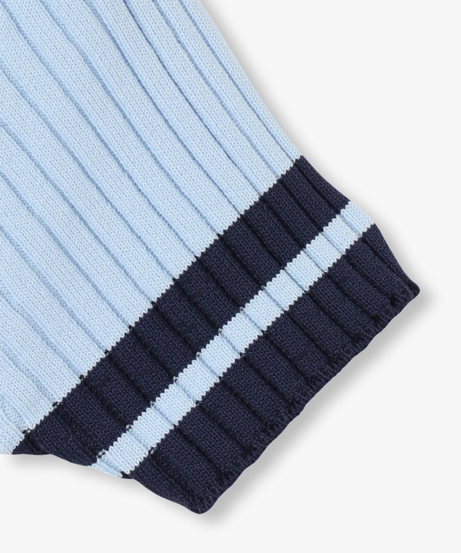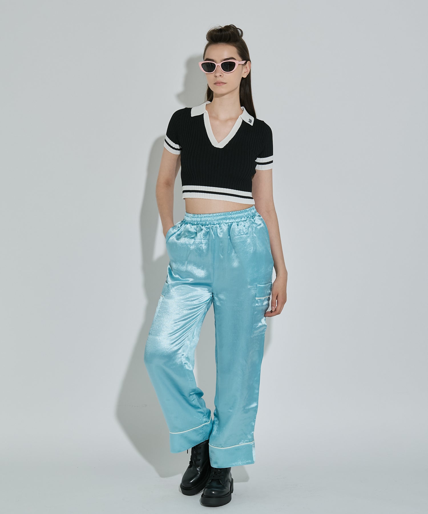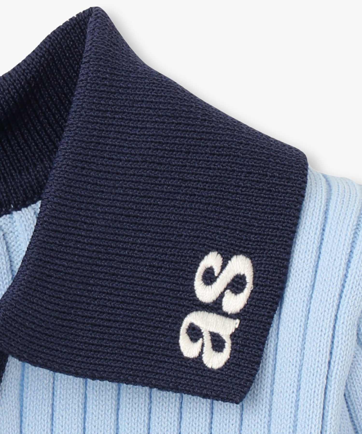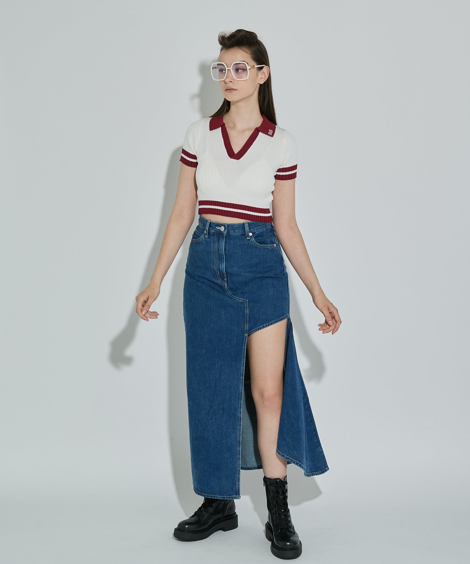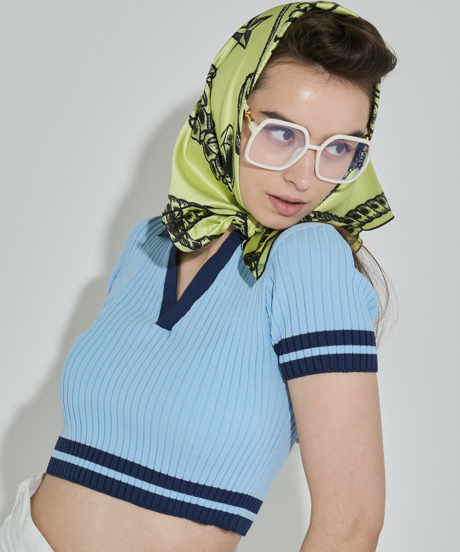 チアリーダーのユニフォームからインスパイアされたコンパクトなサイジングのニットポロシャツ。ラインや衿の配色、さりげないロゴ刺繍など細部までデザインポイントをプラス!大きめに開いたVネックが首元をスッキリと女性らしく見せてくれます。
