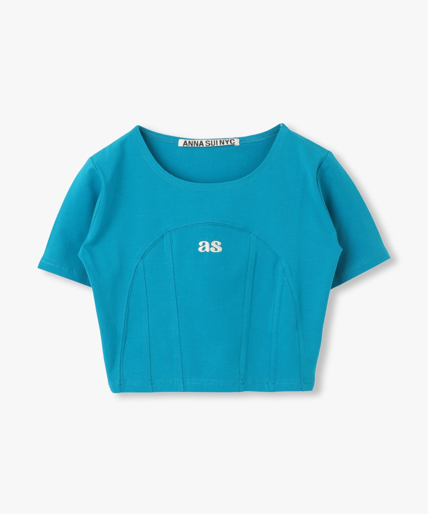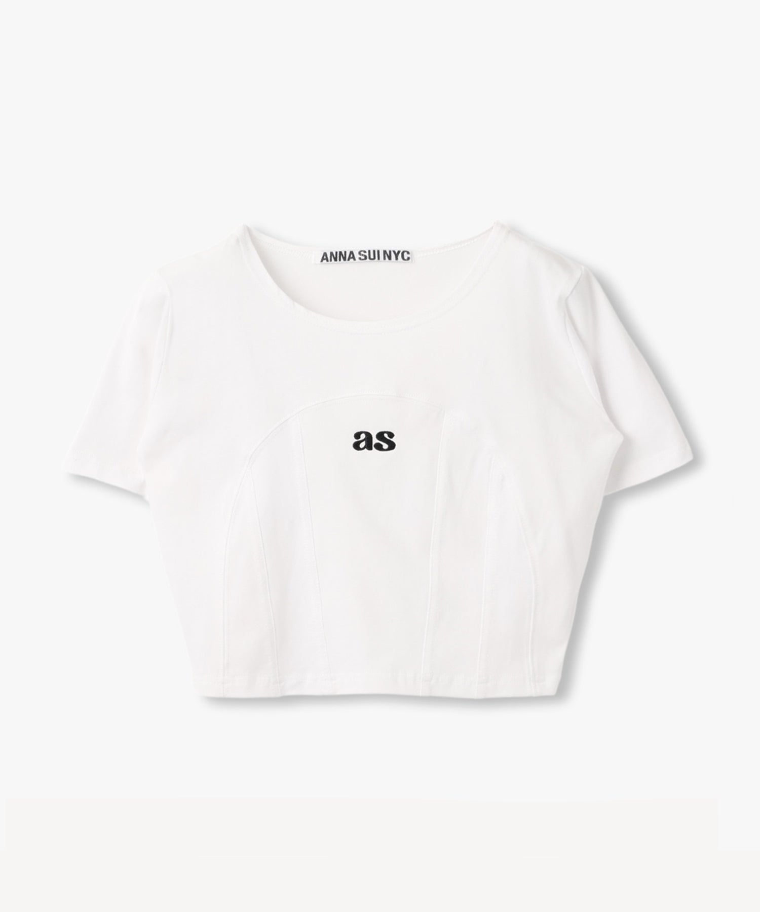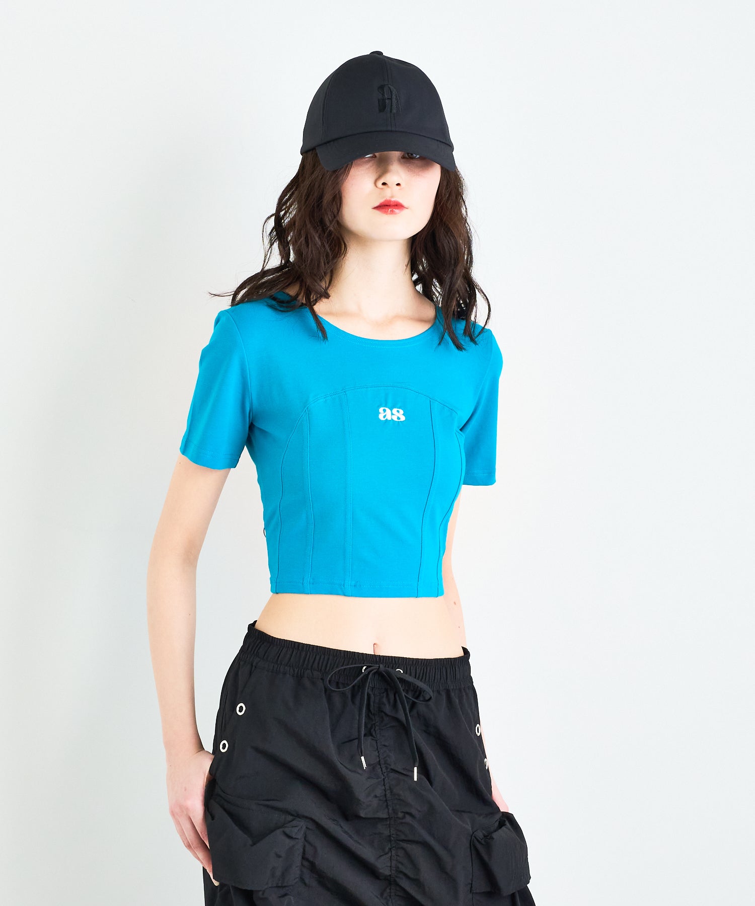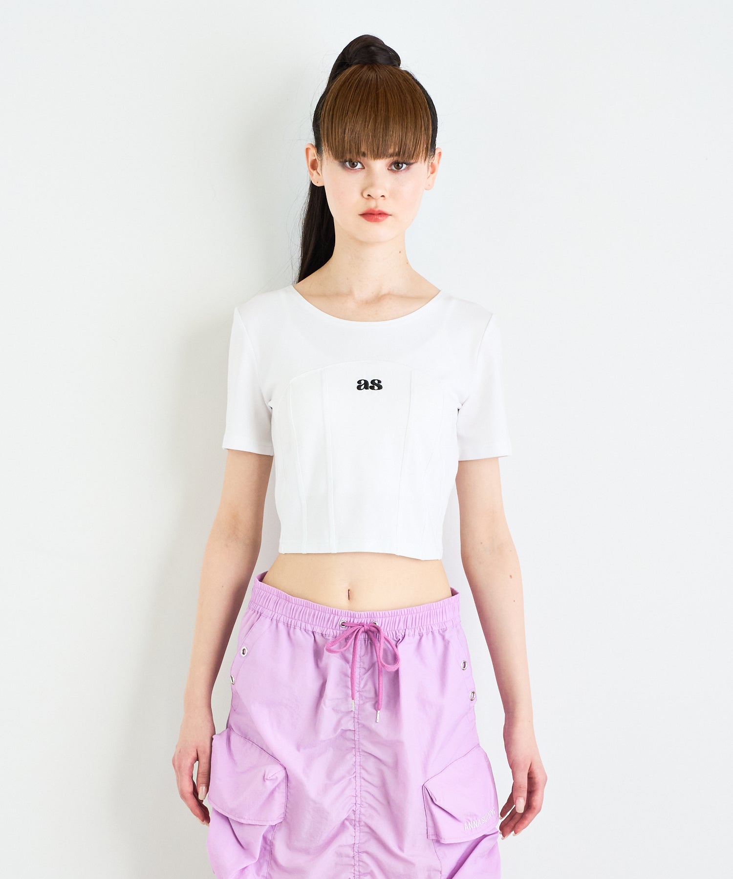 コルセット風の切り替えがトレンド感満載のクロップドTシャツ!伸びのいい柔らかな素材で楽に着用していただくことができます。タイトなシルエットがメリハリのあるボディを演出してくれる一枚で着映えする技ありトップスです◎