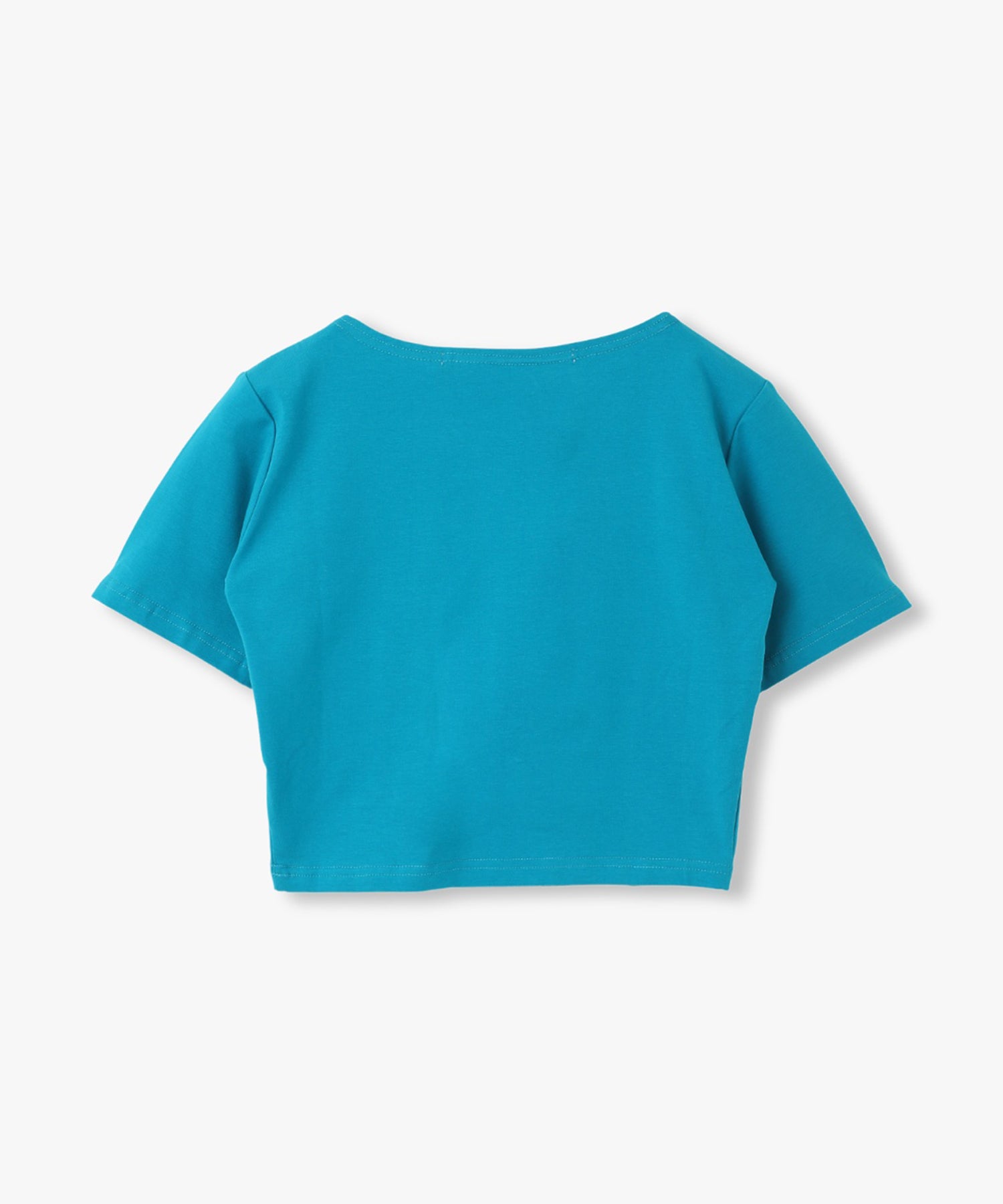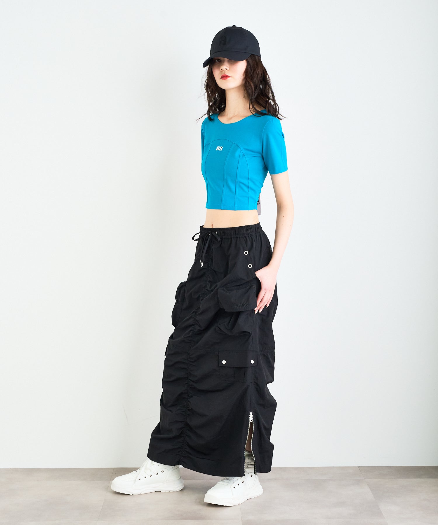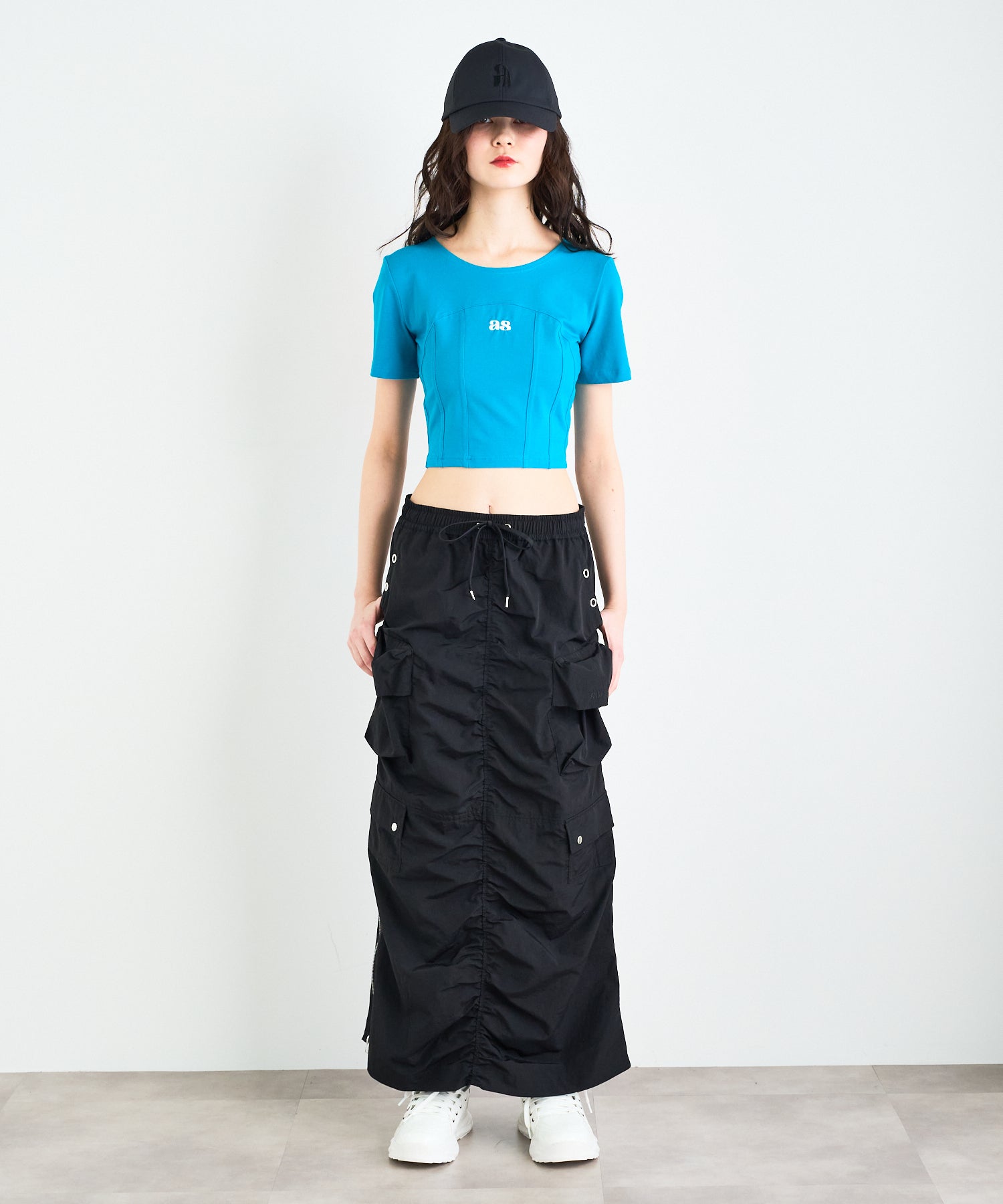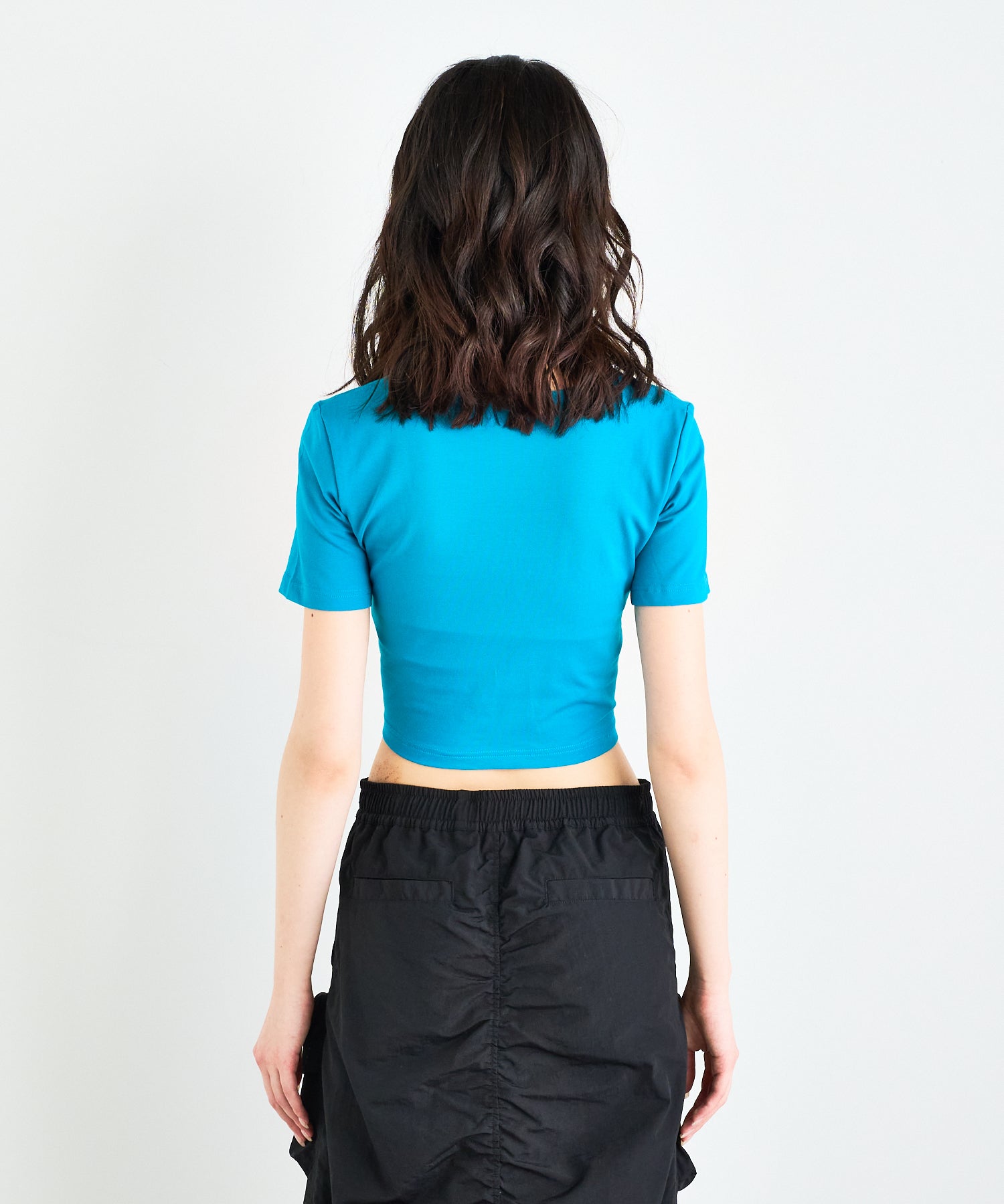 コルセット風の切り替えがトレンド感満載のクロップドTシャツ!伸びのいい柔らかな素材で楽に着用していただくことができます。タイトなシルエットがメリハリのあるボディを演出してくれる一枚で着映えする技ありトップスです◎