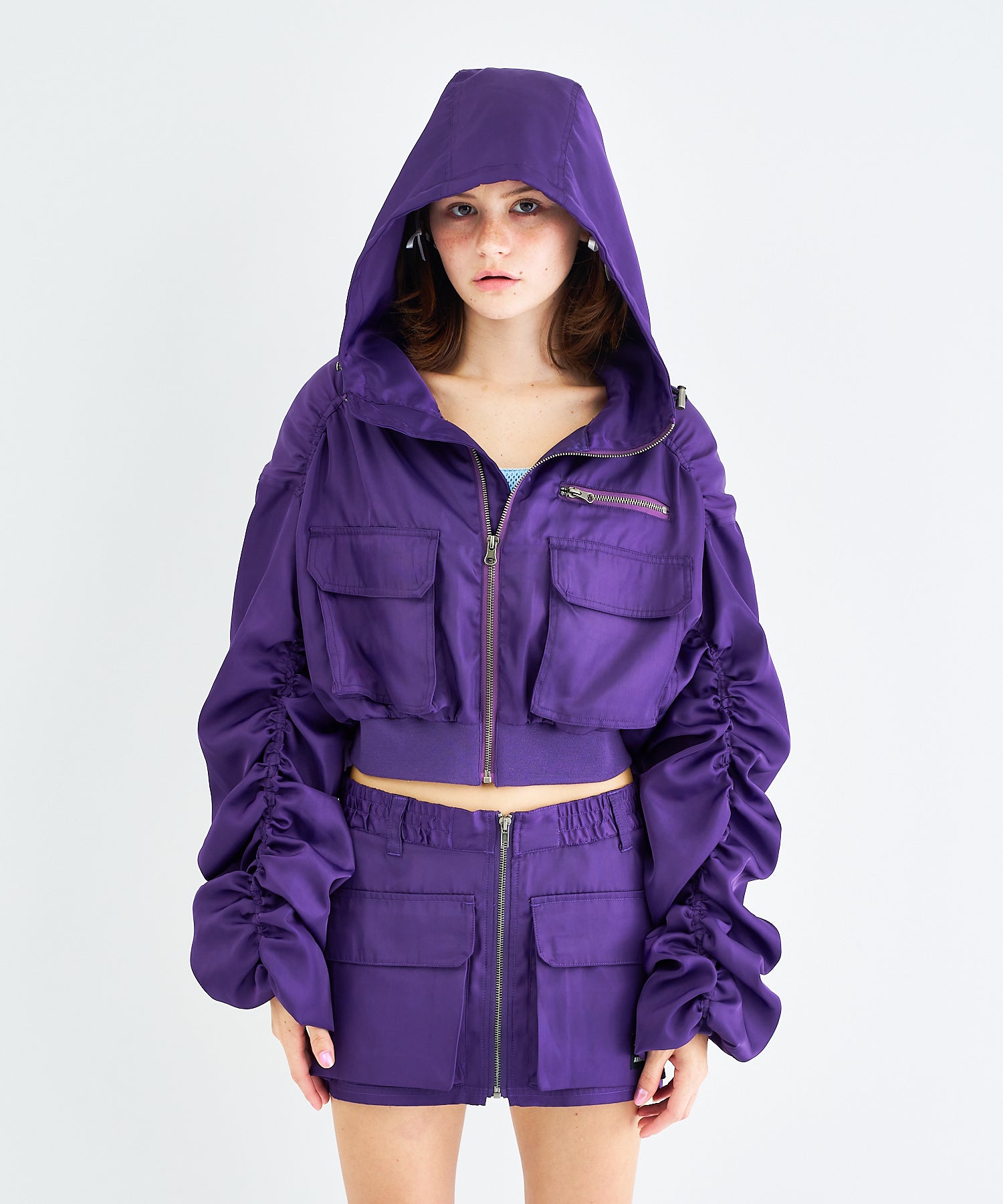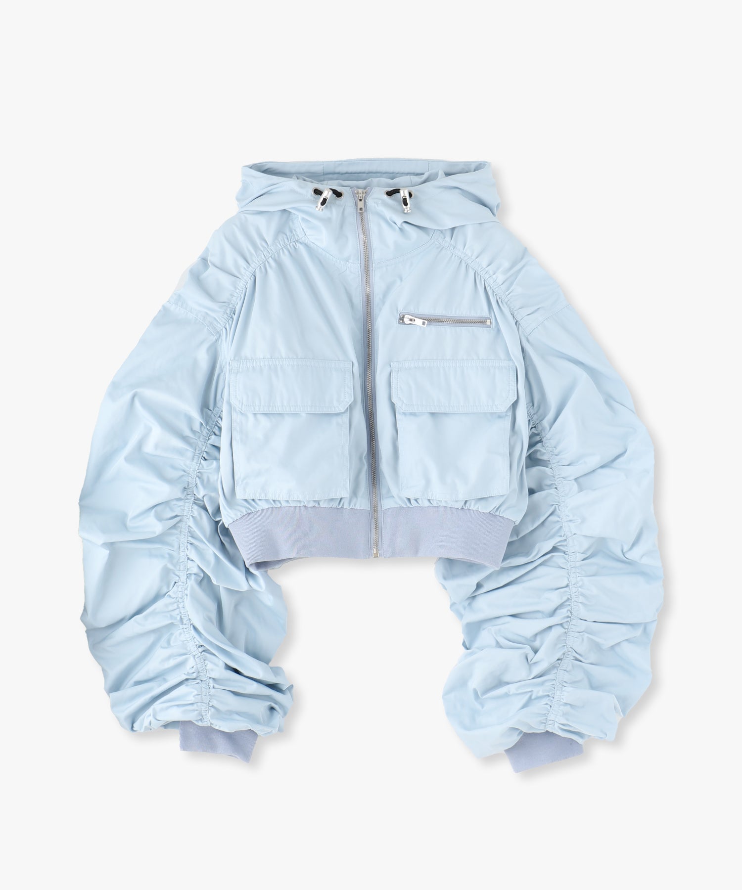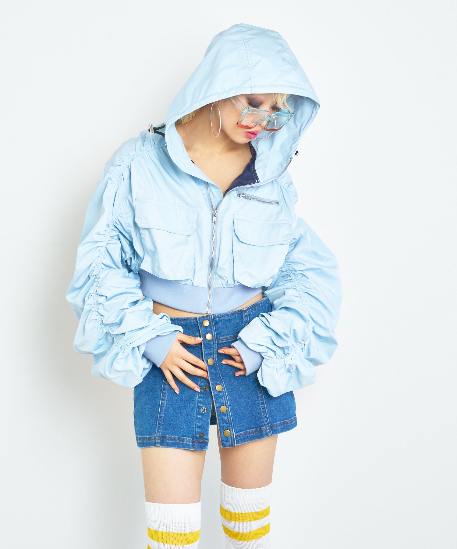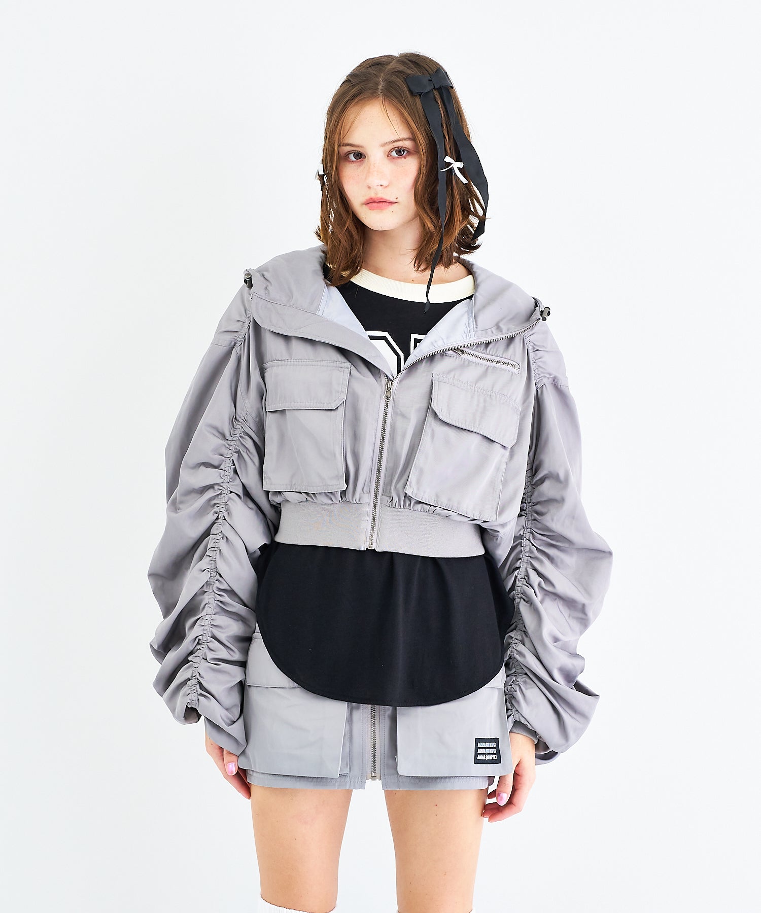 ウエストラインが高く脚長効果アリなジャケットです。袖にデザインされたボリューム感のあるシャーリングがドラマティック。やや大きめのフードもかぶったときにかっこよく見えるようにしました。SNS映え間違いなしのジャケットです。