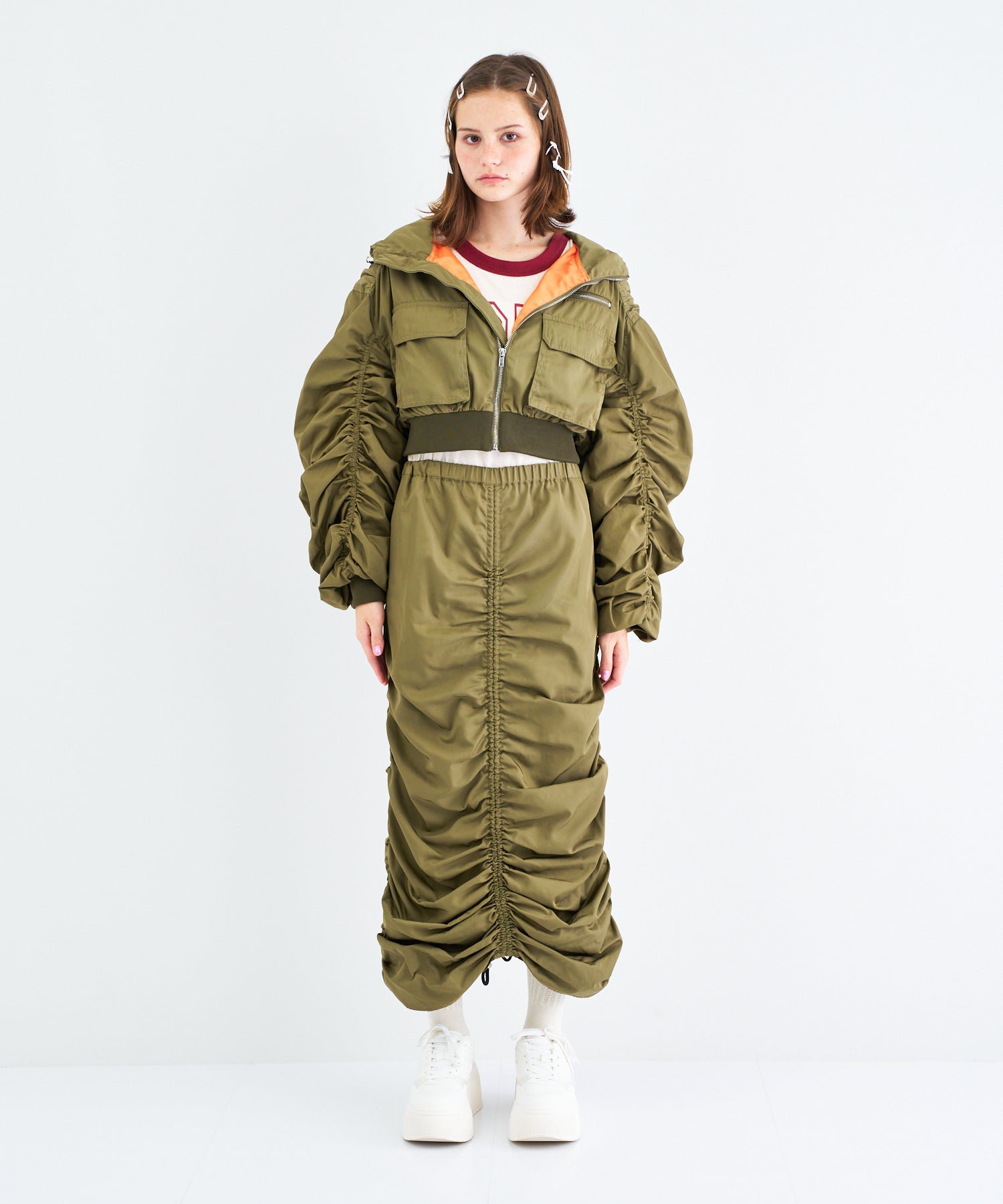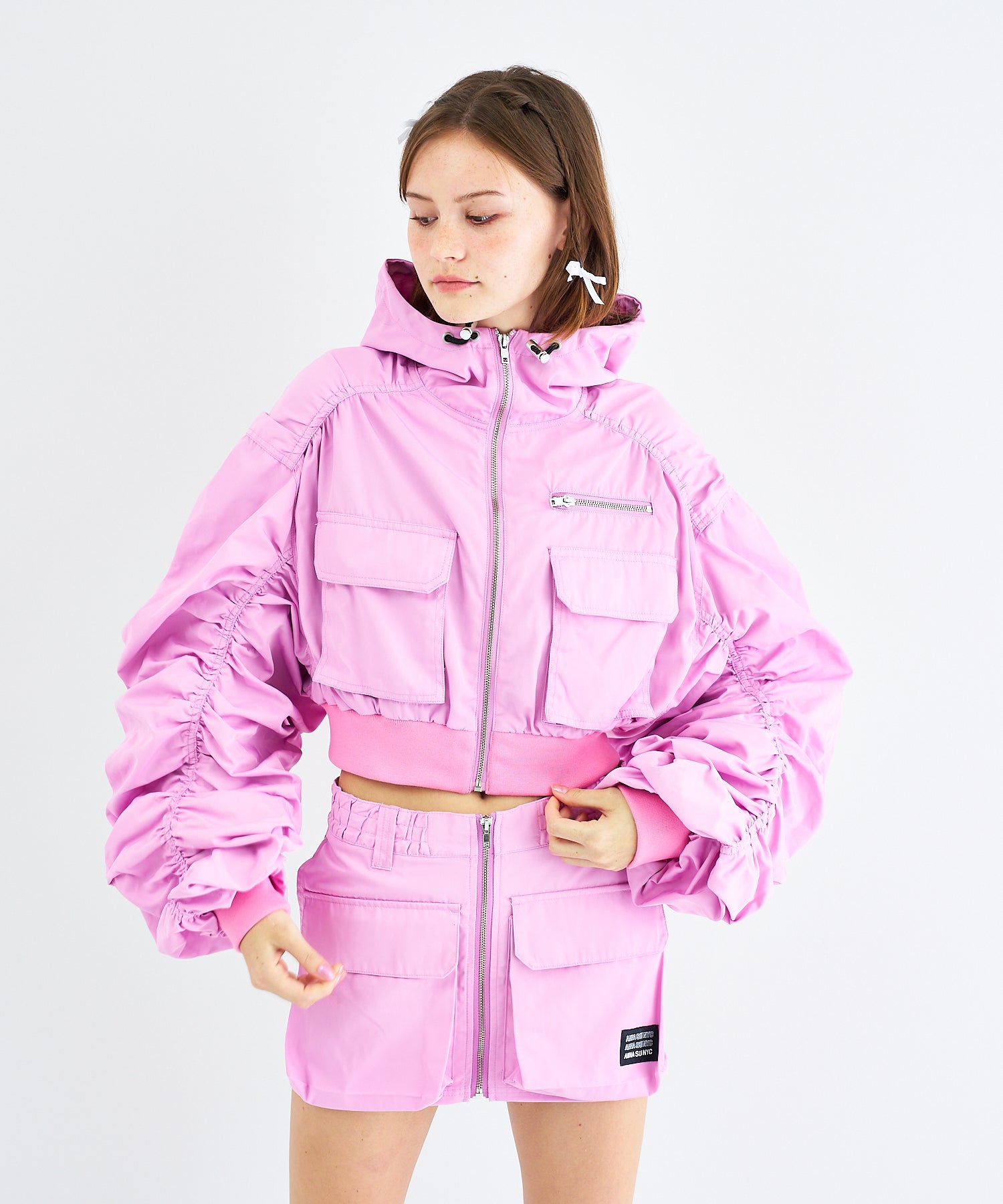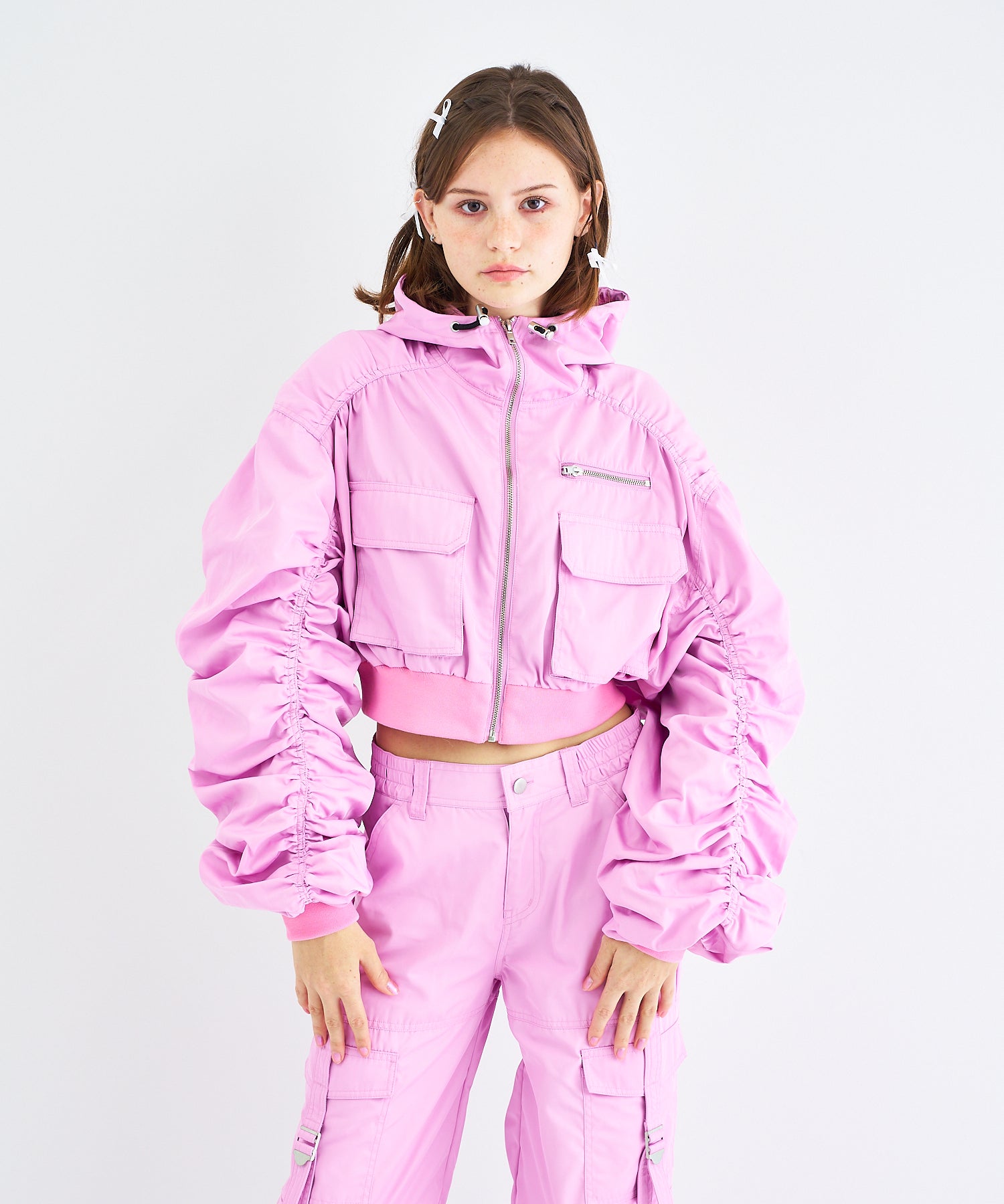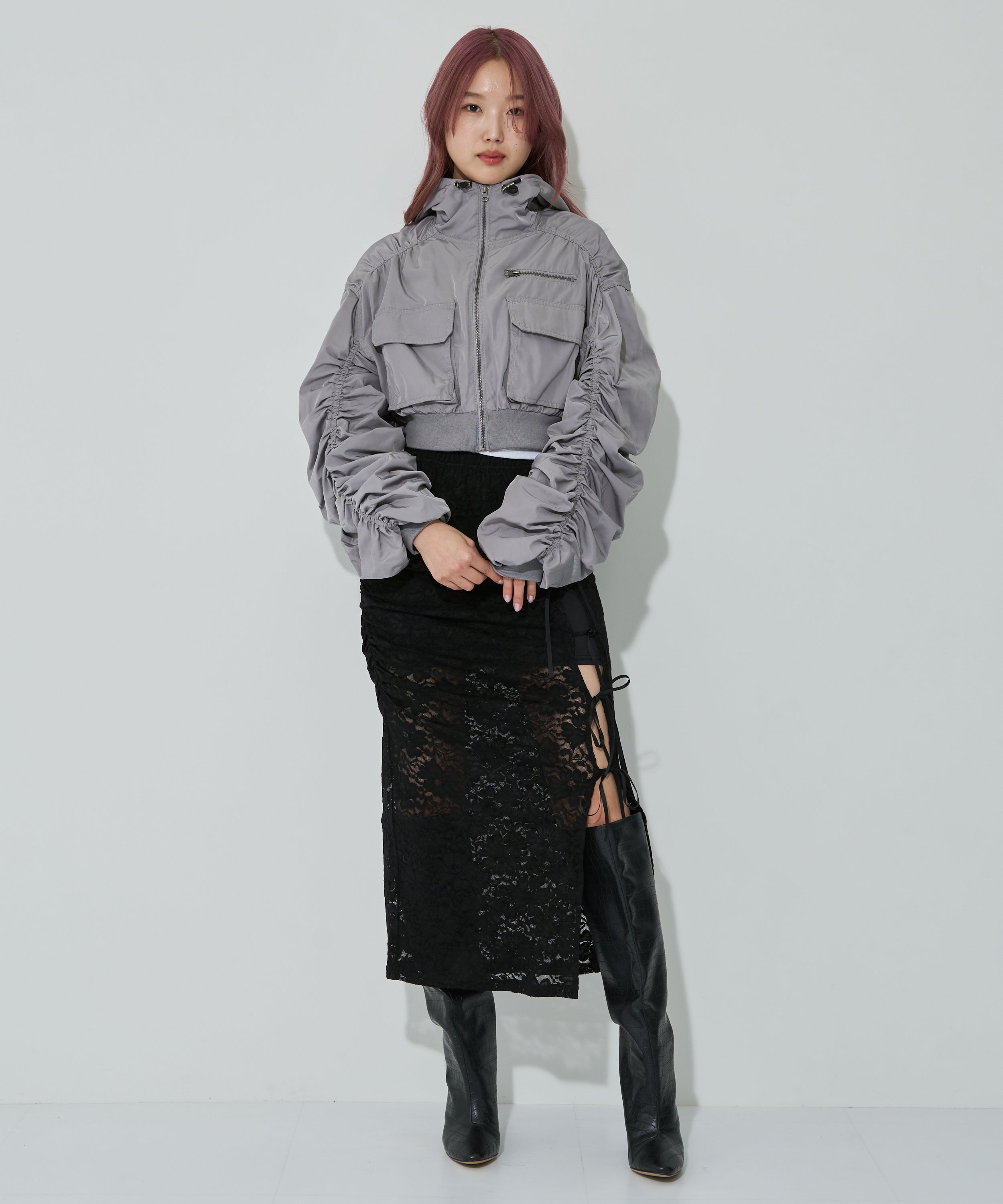 ウエストラインが高く脚長効果アリなジャケットです。袖にデザインされたボリューム感のあるシャーリングがドラマティック。やや大きめのフードもかぶったときにかっこよく見えるようにしました。SNS映え間違いなしのジャケットです。