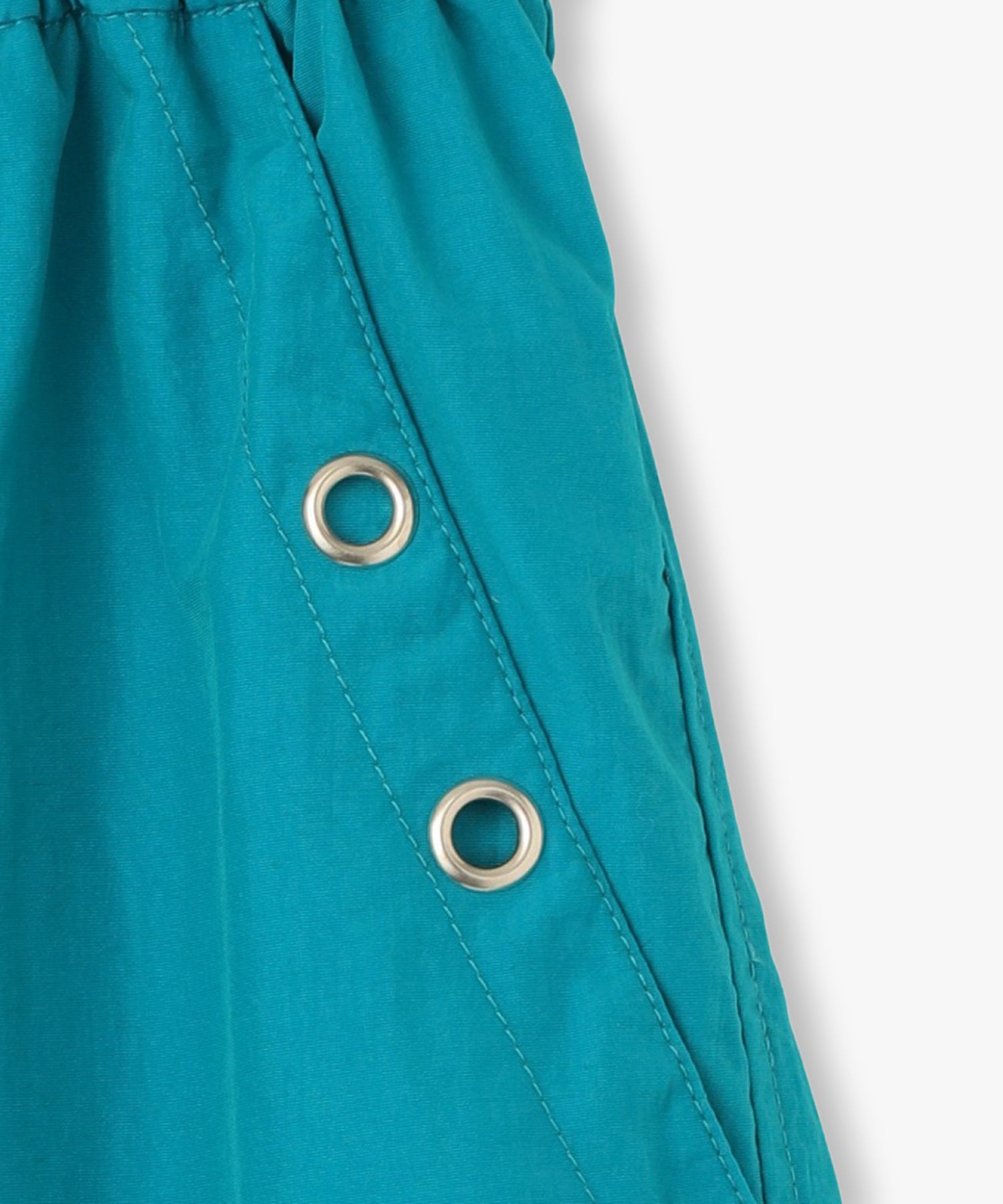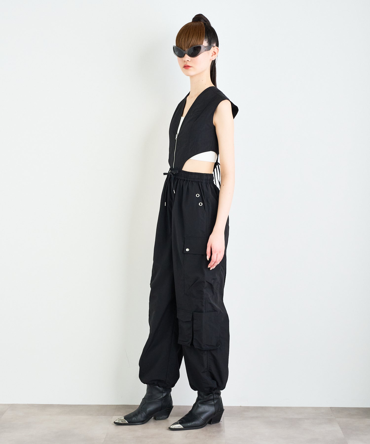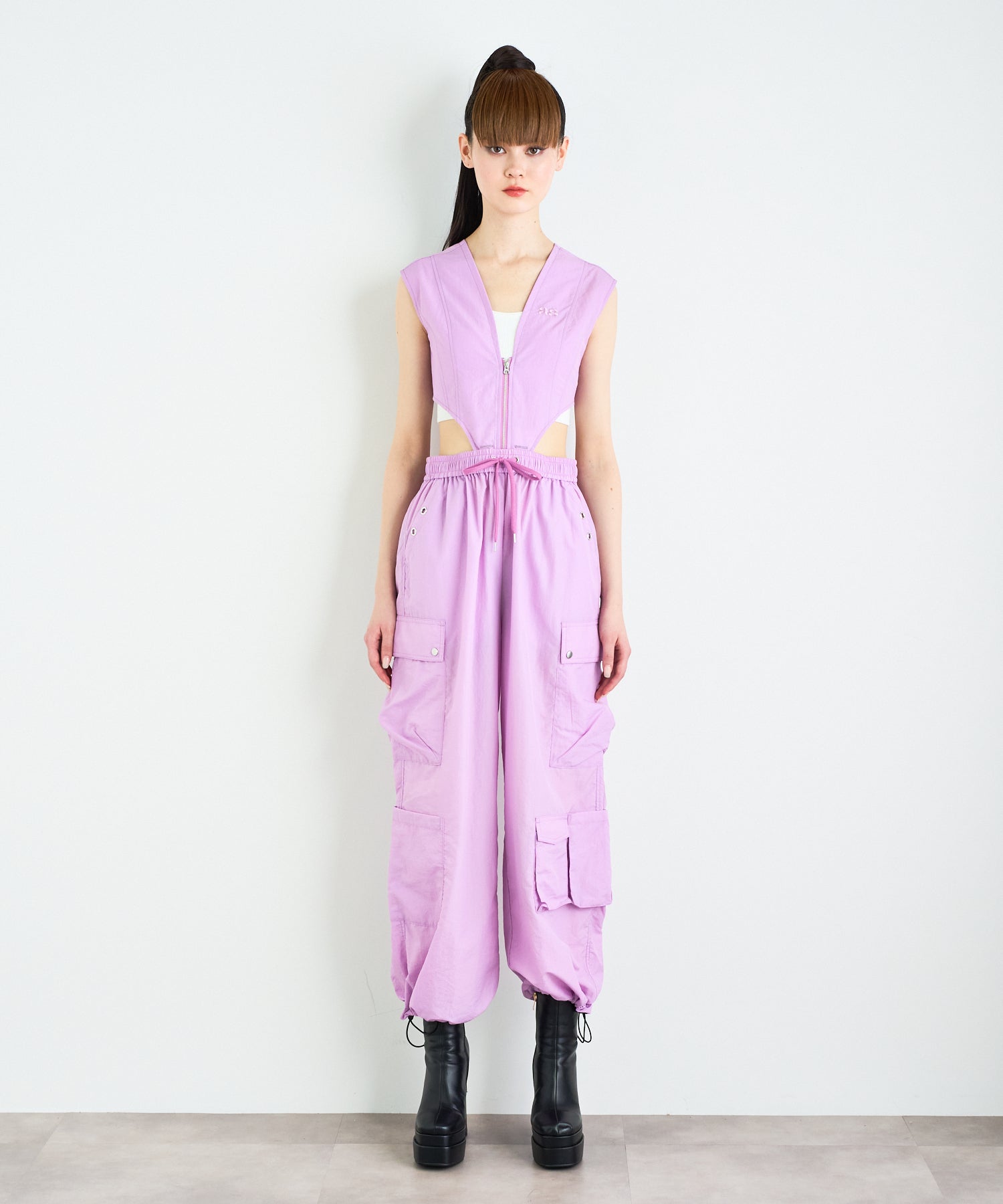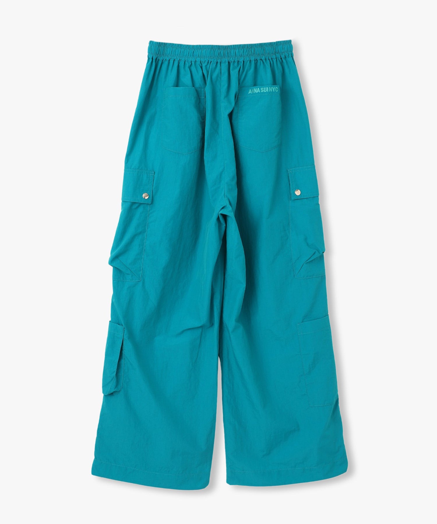 シワ感のある軽くシャカシャカとした素材で作られたマルチポケットパンツ。様々なデザインのポケットが配置された飽きのこないカーゴパンツ。ウエストの内側にはボタンが付いており、"スポーツワッシャーレースアップベスト"とドッキングさせてセットアップで着用できるANNA SUI NYCオリジナルのとっておきアイテムです!