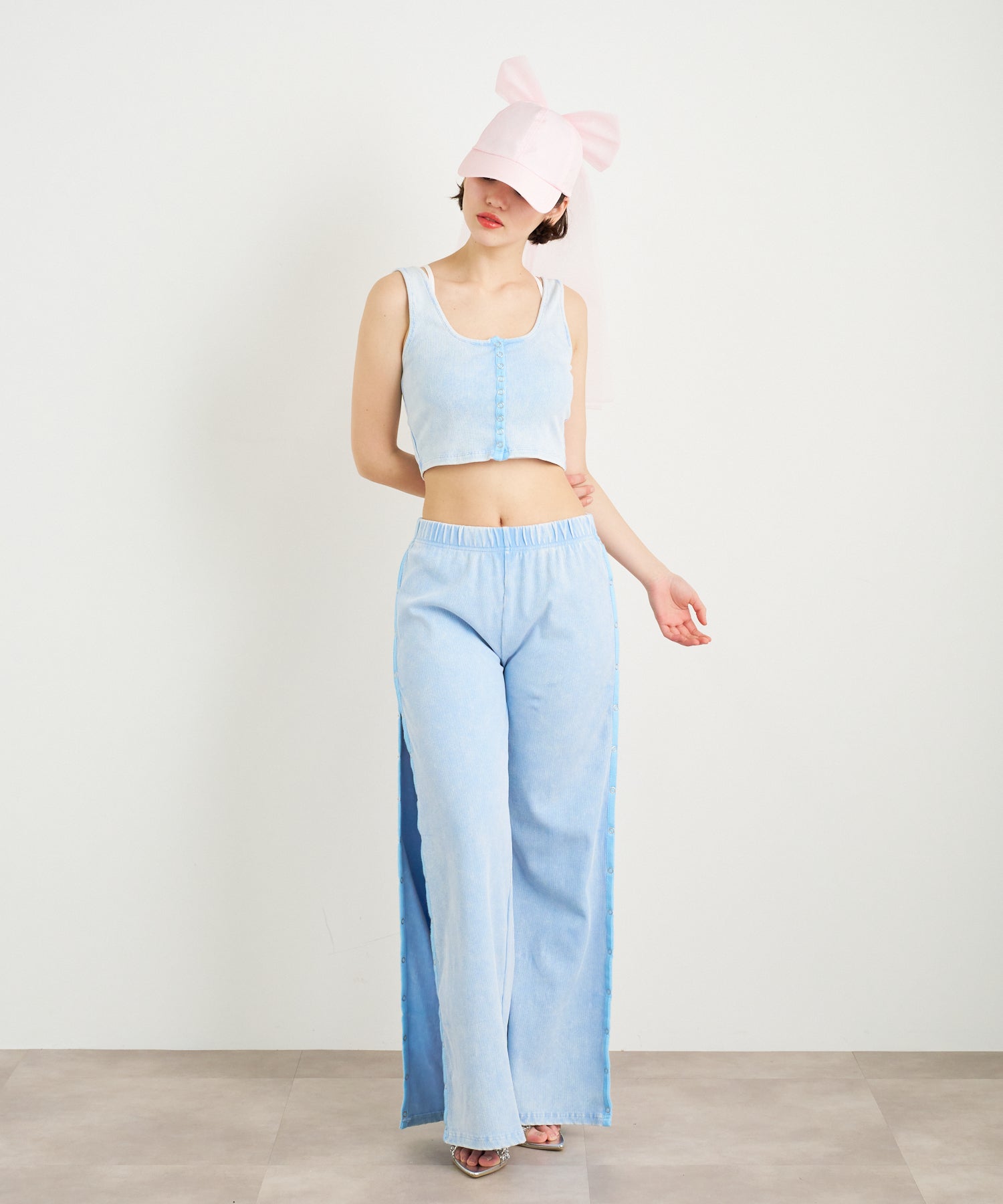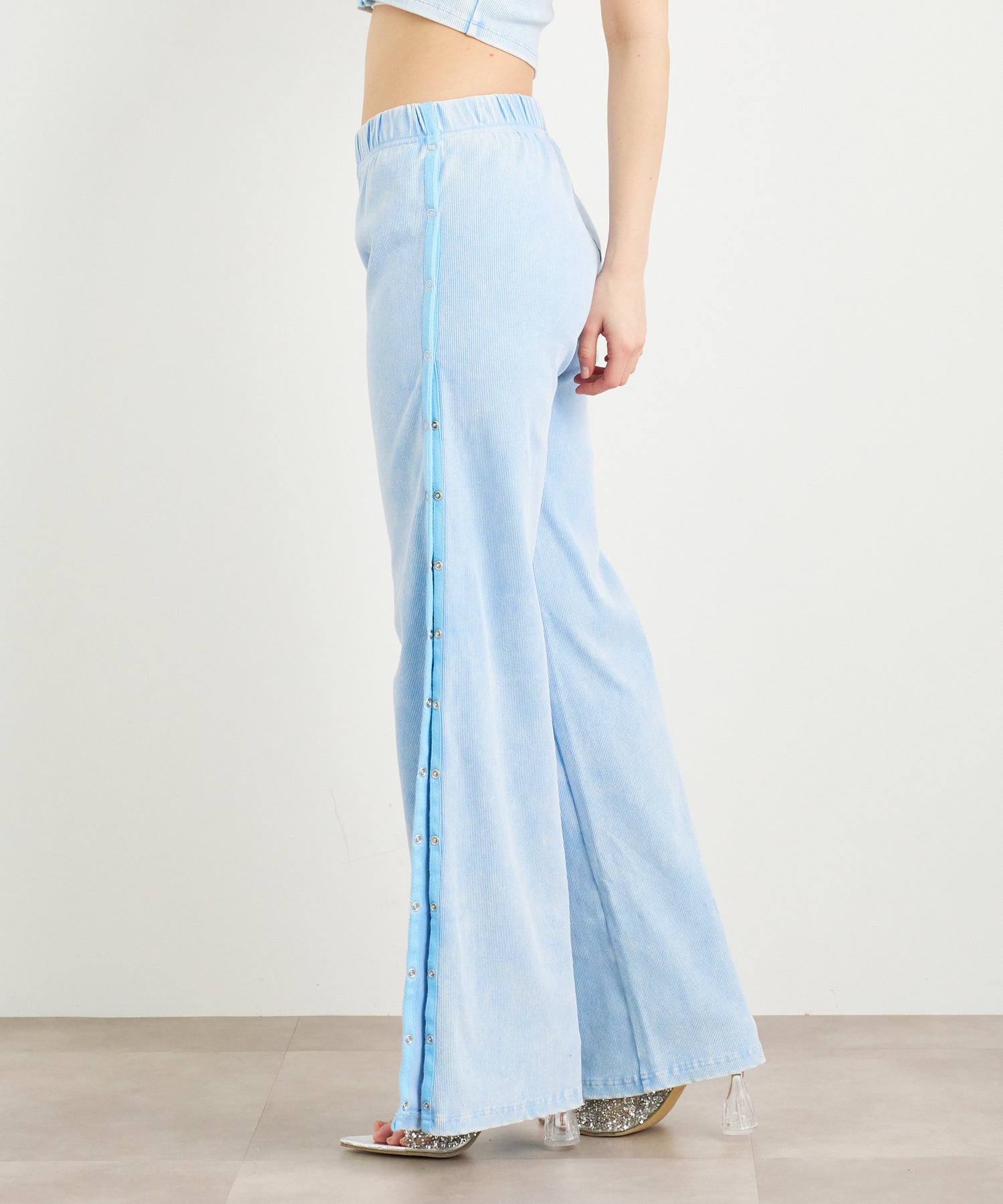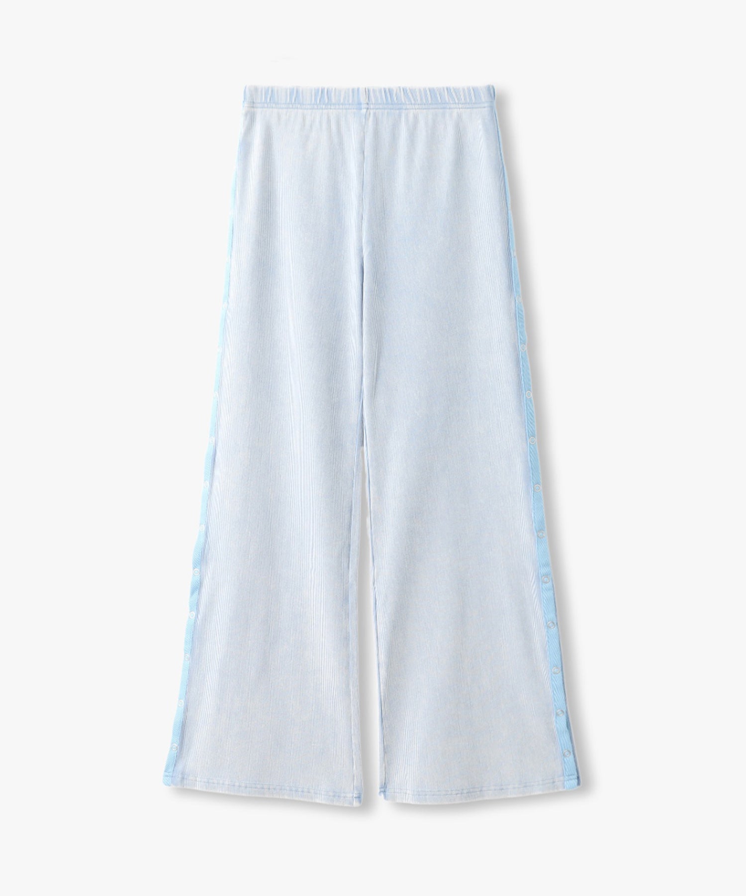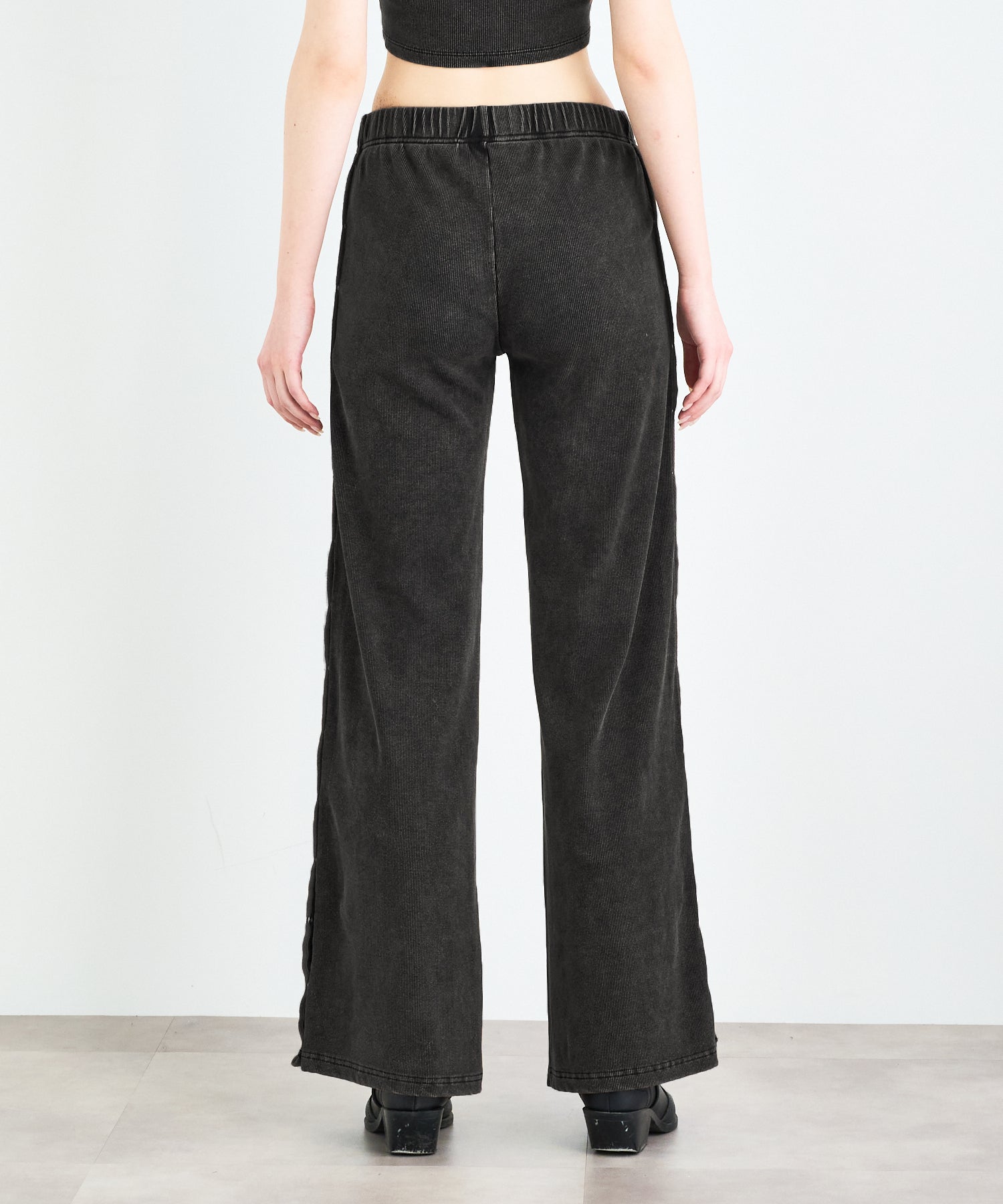 パウダーブリーチ加工でヴィンテージムードたっぷりに仕上げたパンツ。加工感が一枚一枚異なり、色落ちの表情を楽しんでいただけます。両サイドについたリングドットボタンでスリットの丈を自分好みに調節することも可能です◎