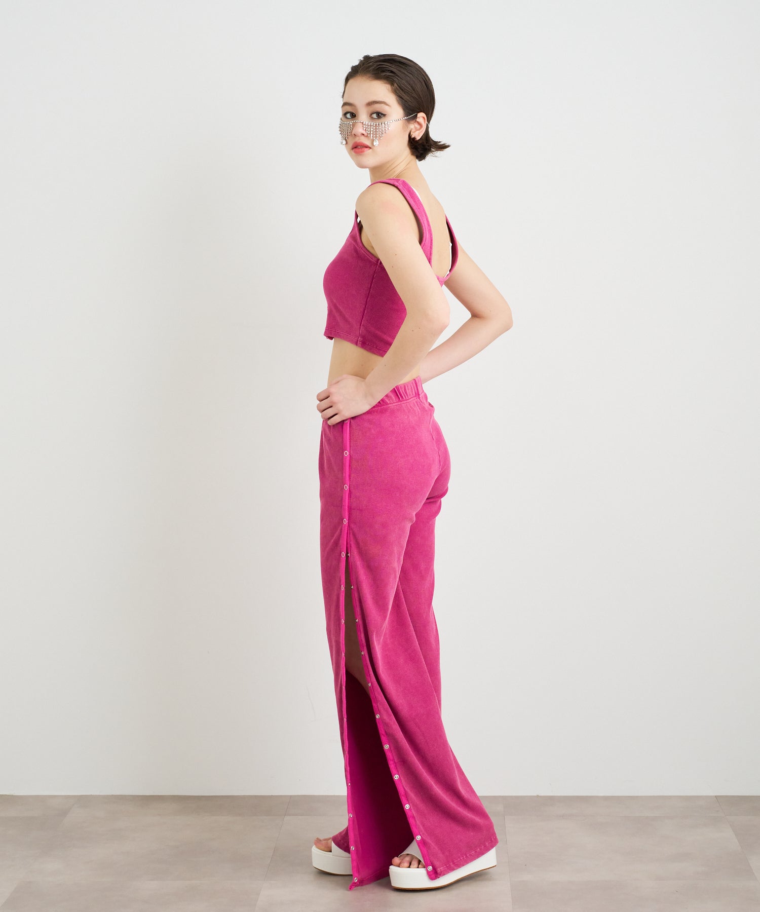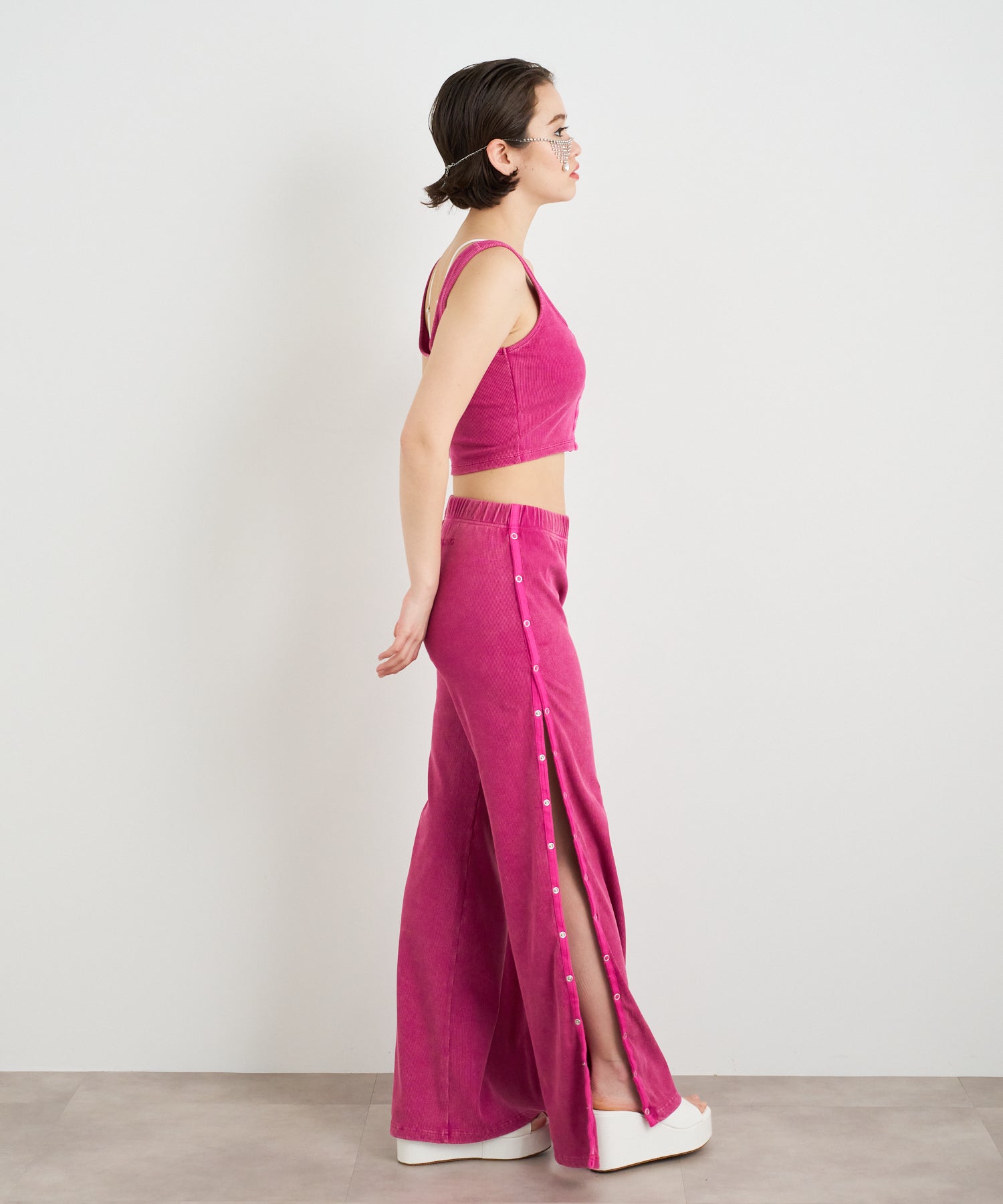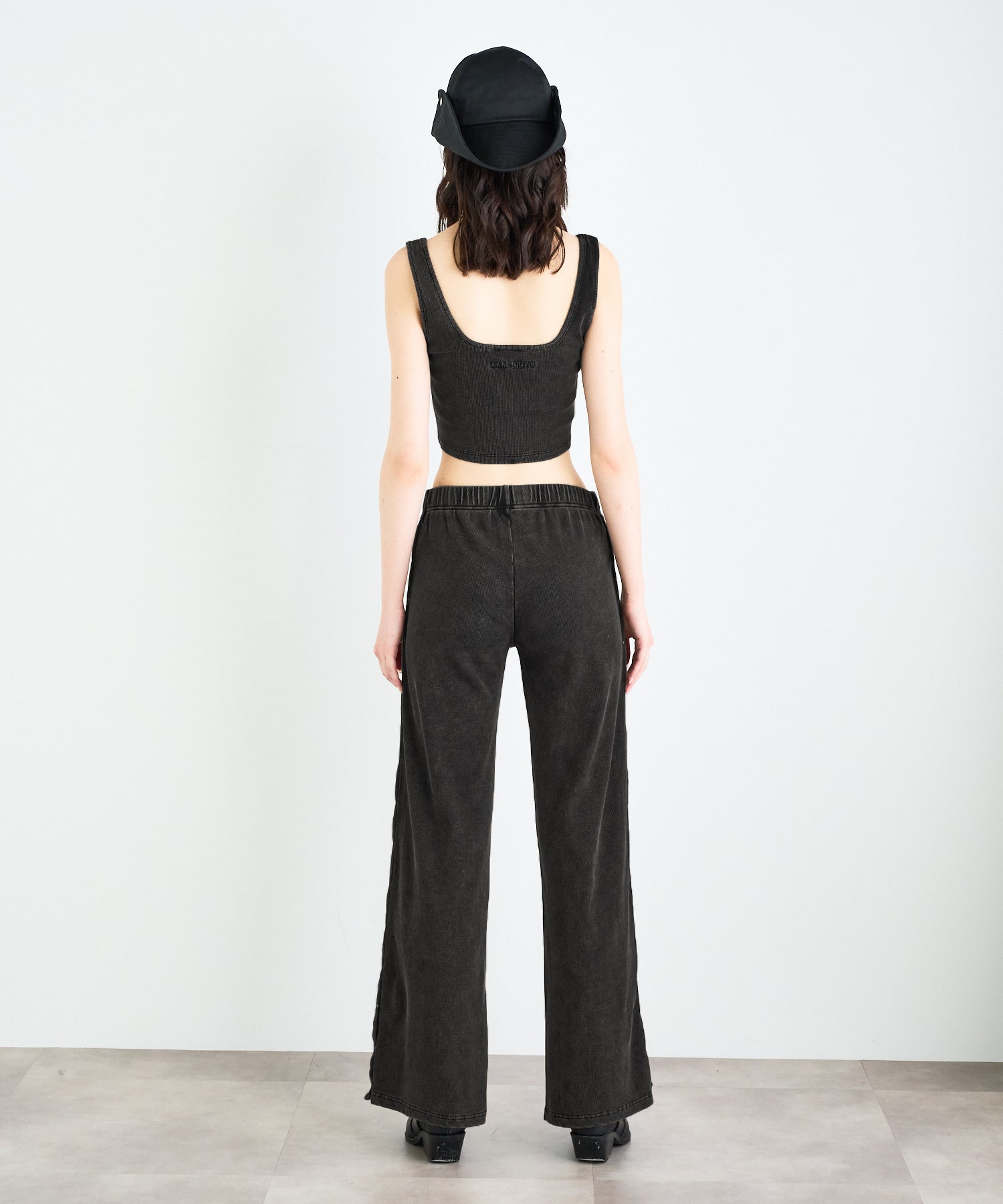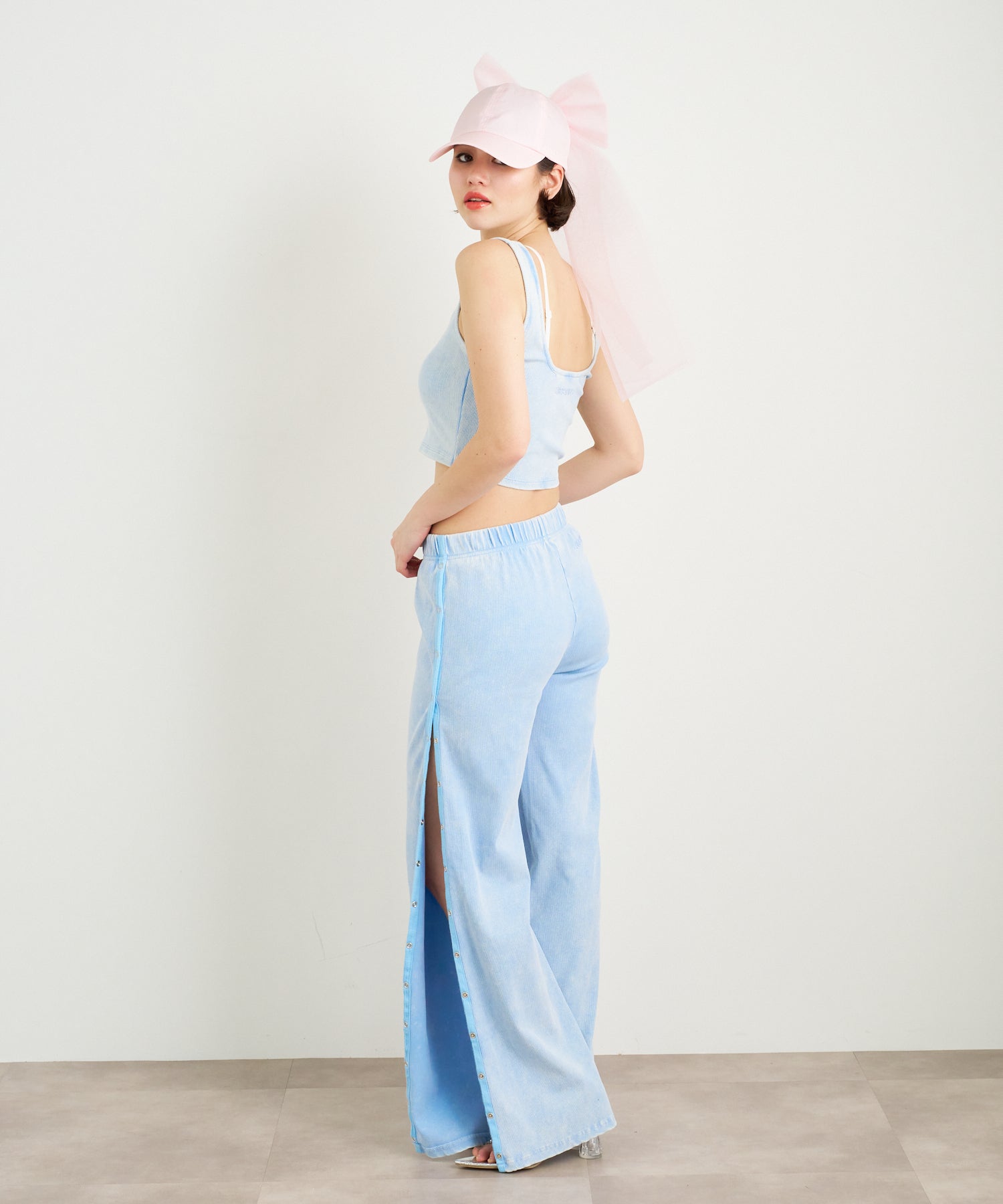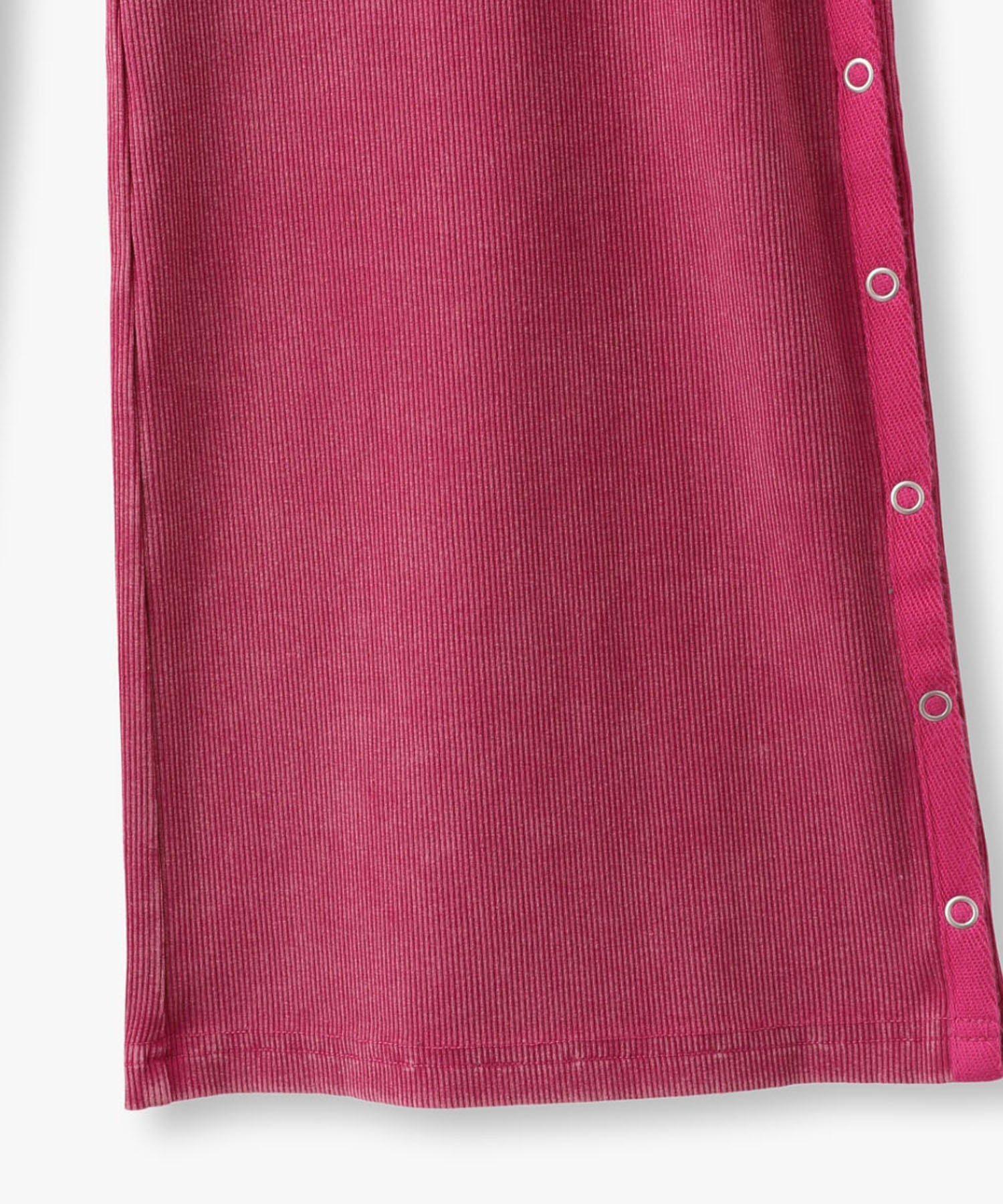 パウダーブリーチ加工でヴィンテージムードたっぷりに仕上げたパンツ。加工感が一枚一枚異なり、色落ちの表情を楽しんでいただけます。両サイドについたリングドットボタンでスリットの丈を自分好みに調節することも可能です◎