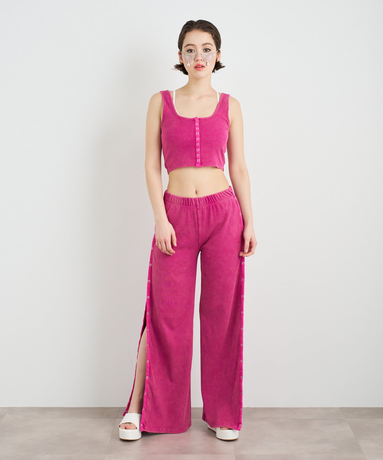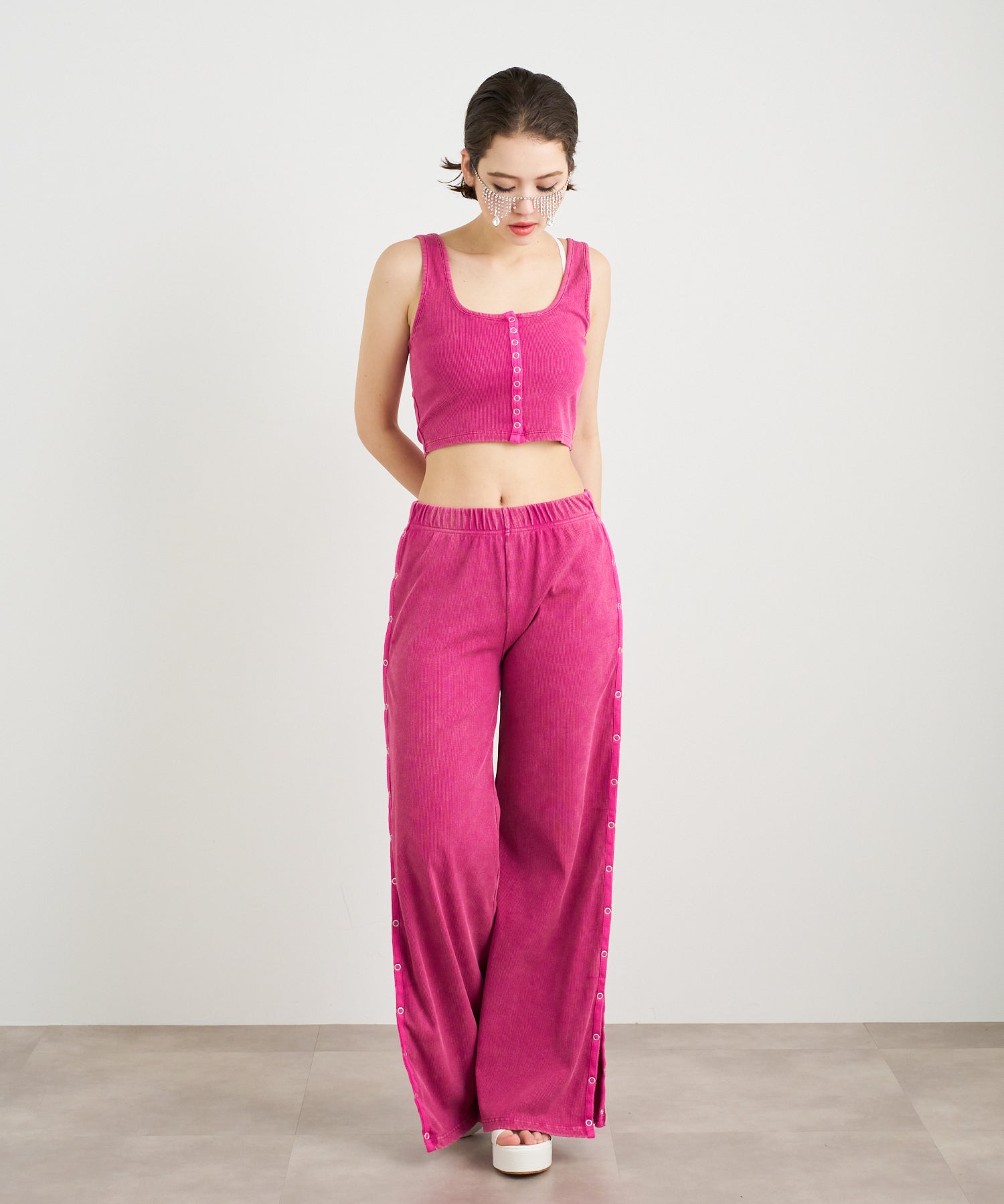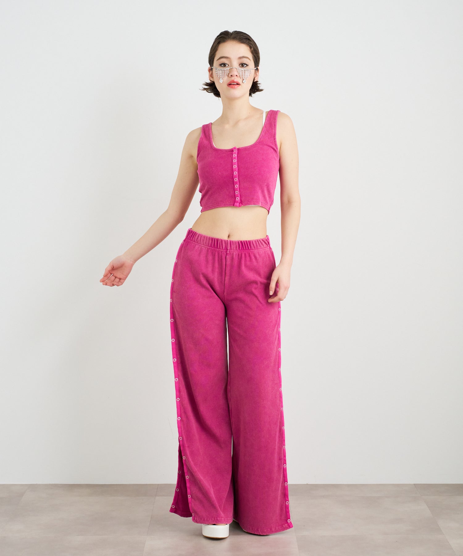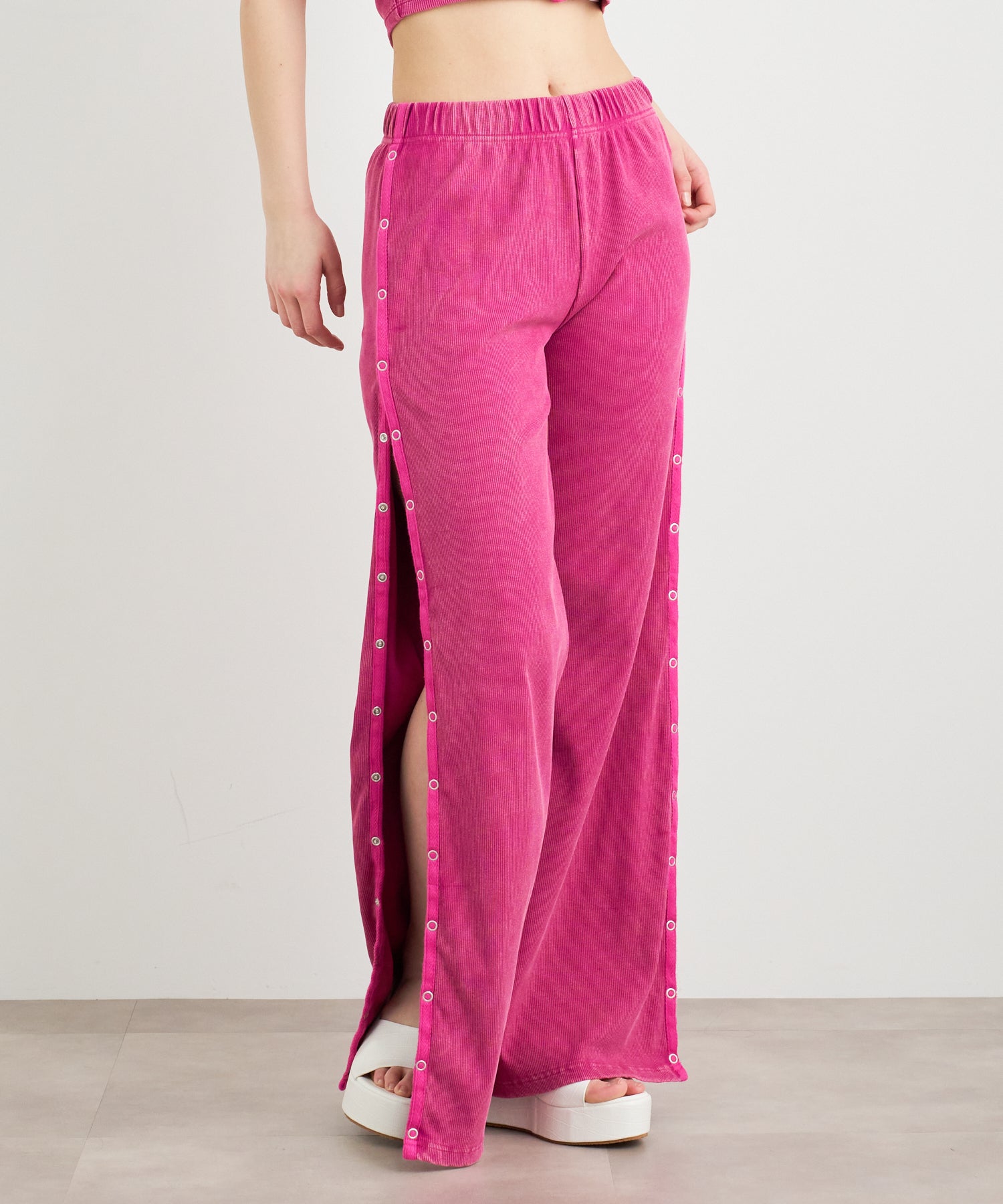 パウダーブリーチ加工でヴィンテージムードたっぷりに仕上げたパンツ。加工感が一枚一枚異なり、色落ちの表情を楽しんでいただけます。両サイドについたリングドットボタンでスリットの丈を自分好みに調節することも可能です◎