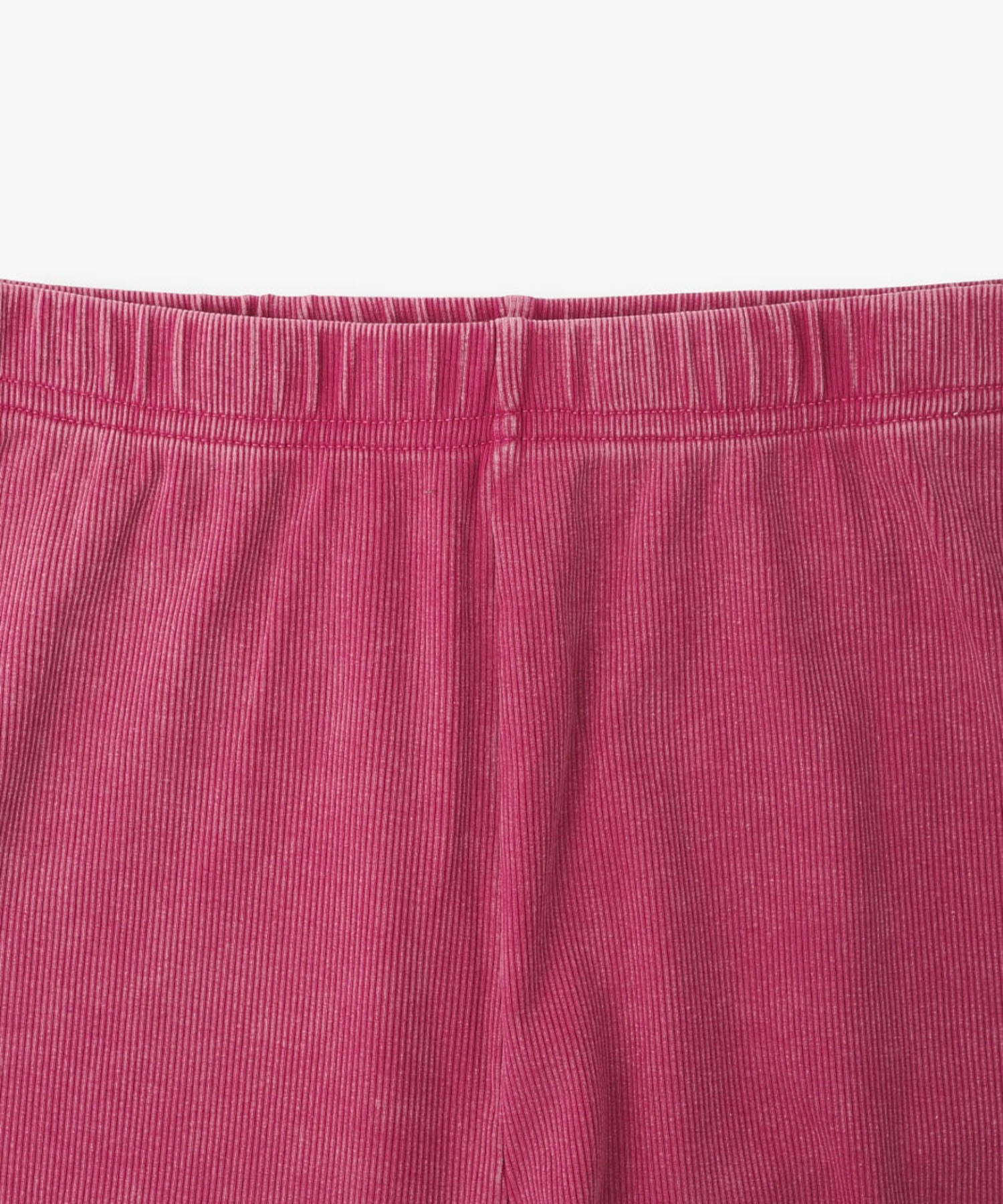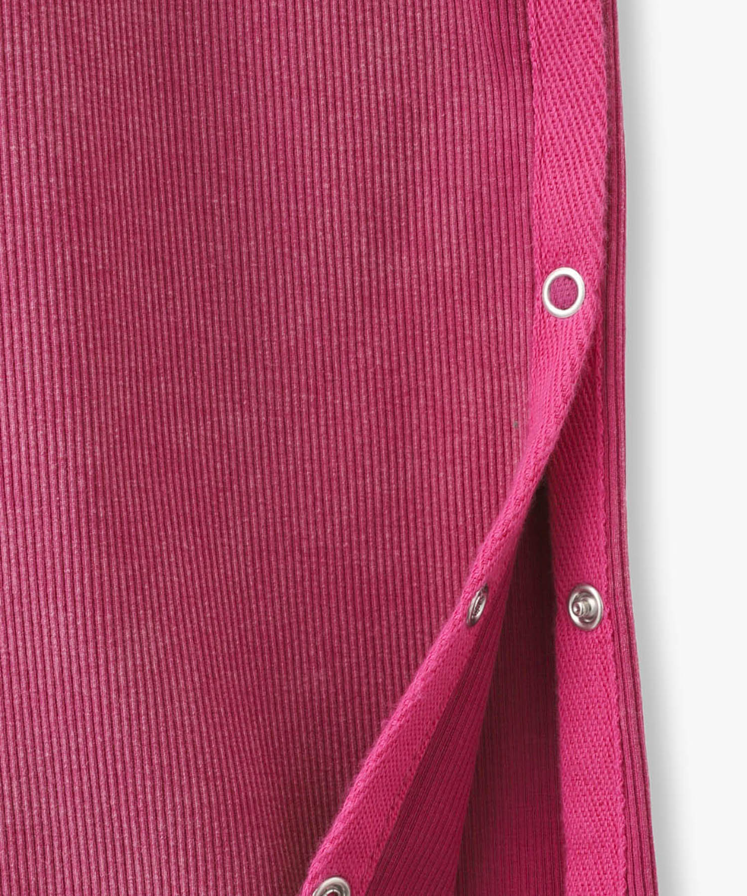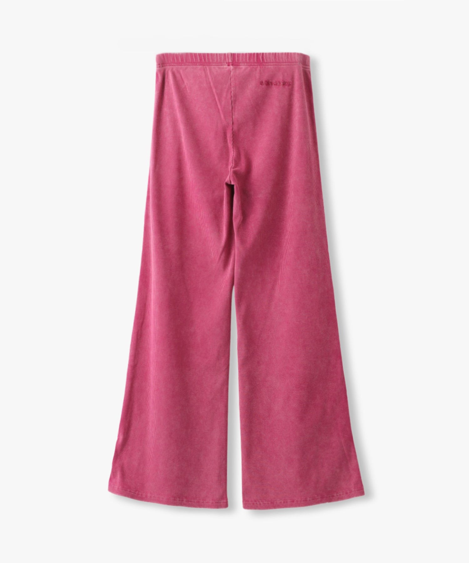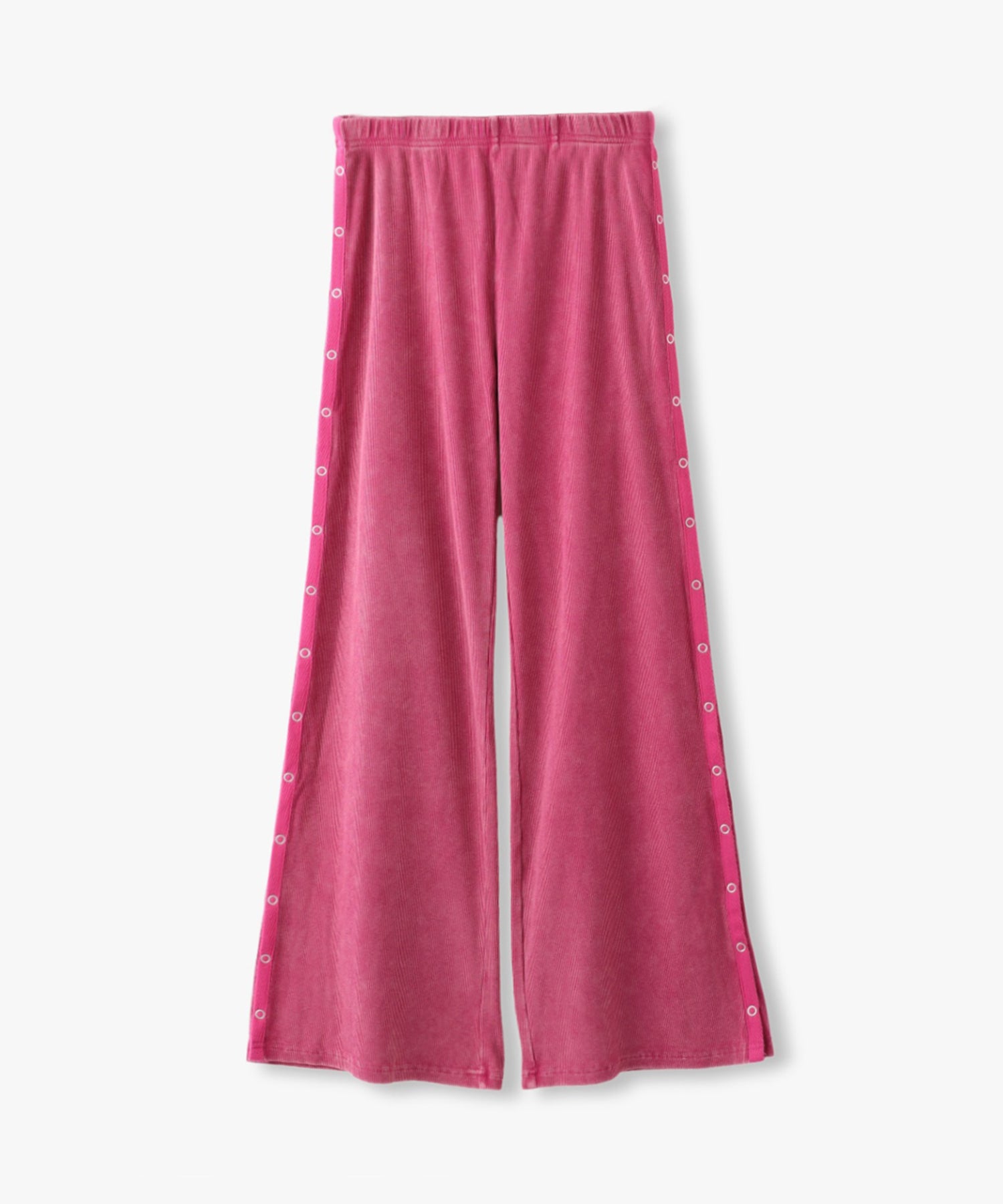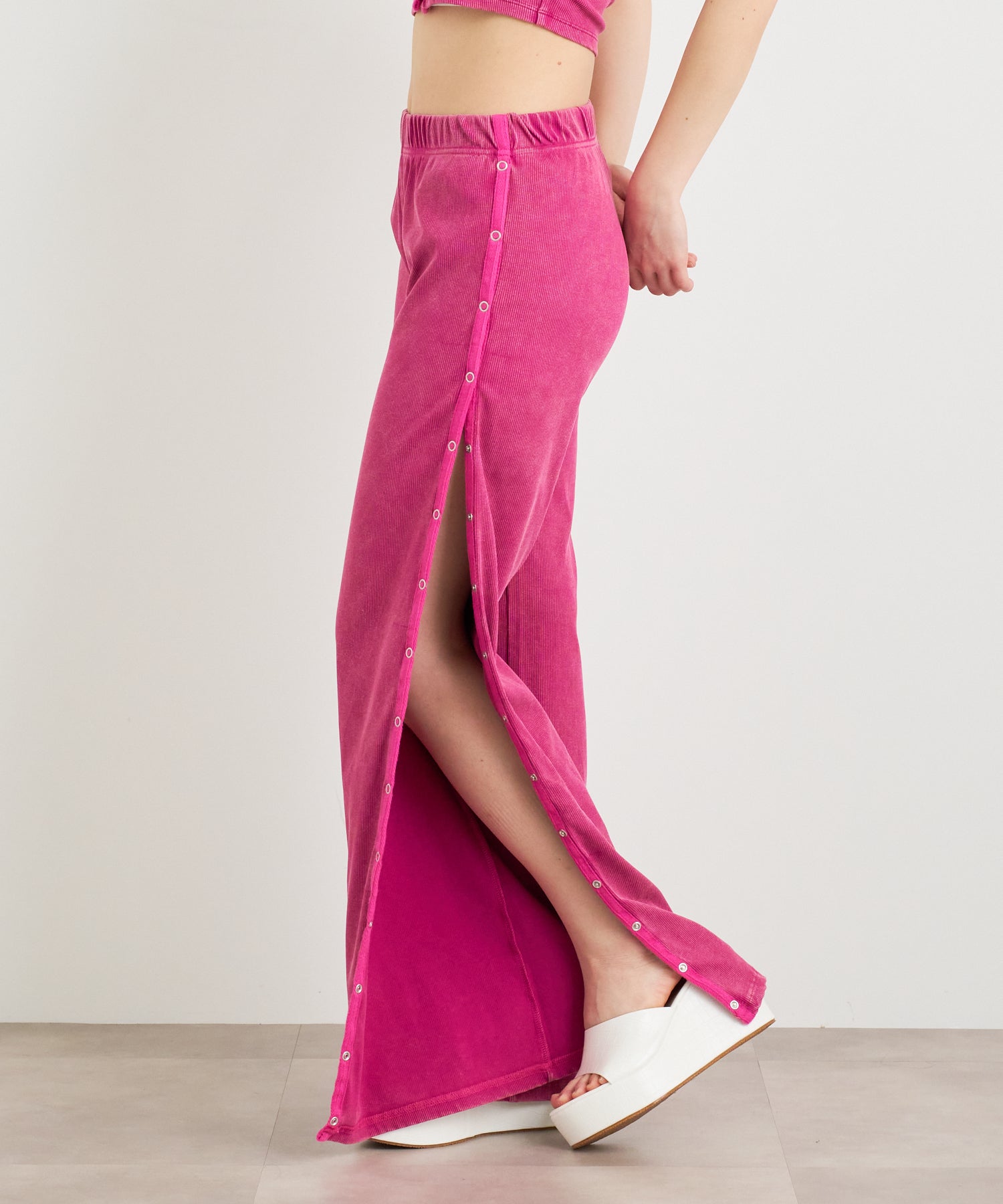 パウダーブリーチ加工でヴィンテージムードたっぷりに仕上げたパンツ。加工感が一枚一枚異なり、色落ちの表情を楽しんでいただけます。両サイドについたリングドットボタンでスリットの丈を自分好みに調節することも可能です◎