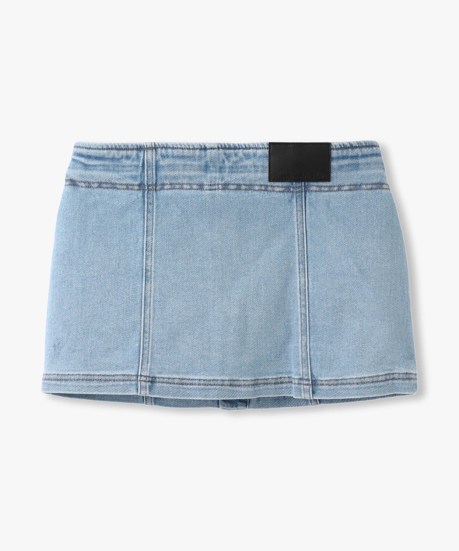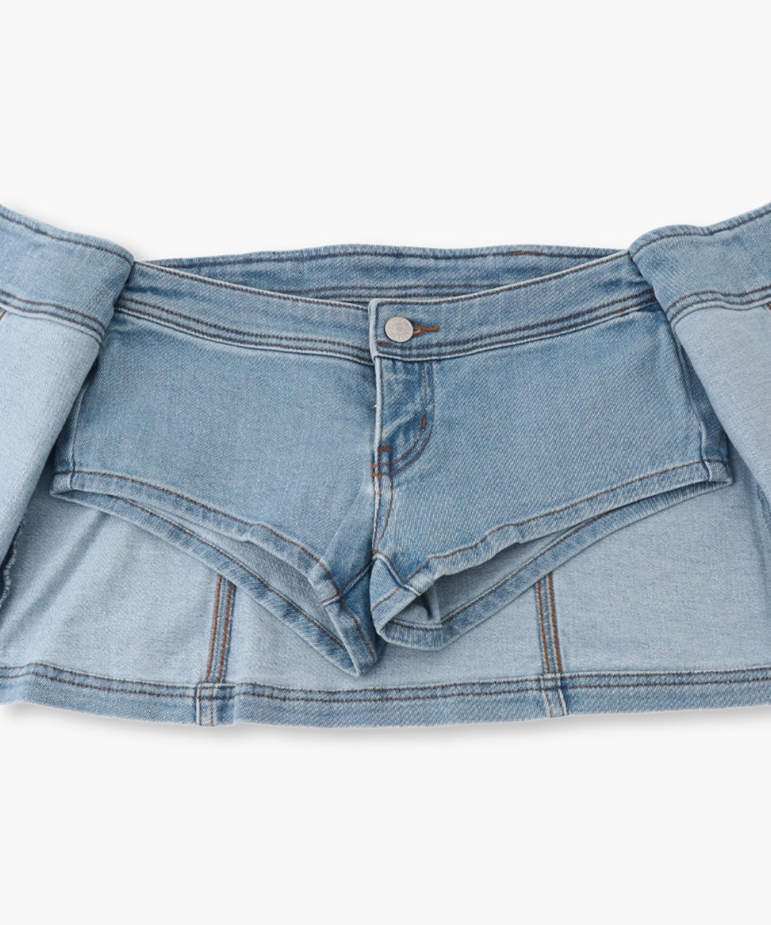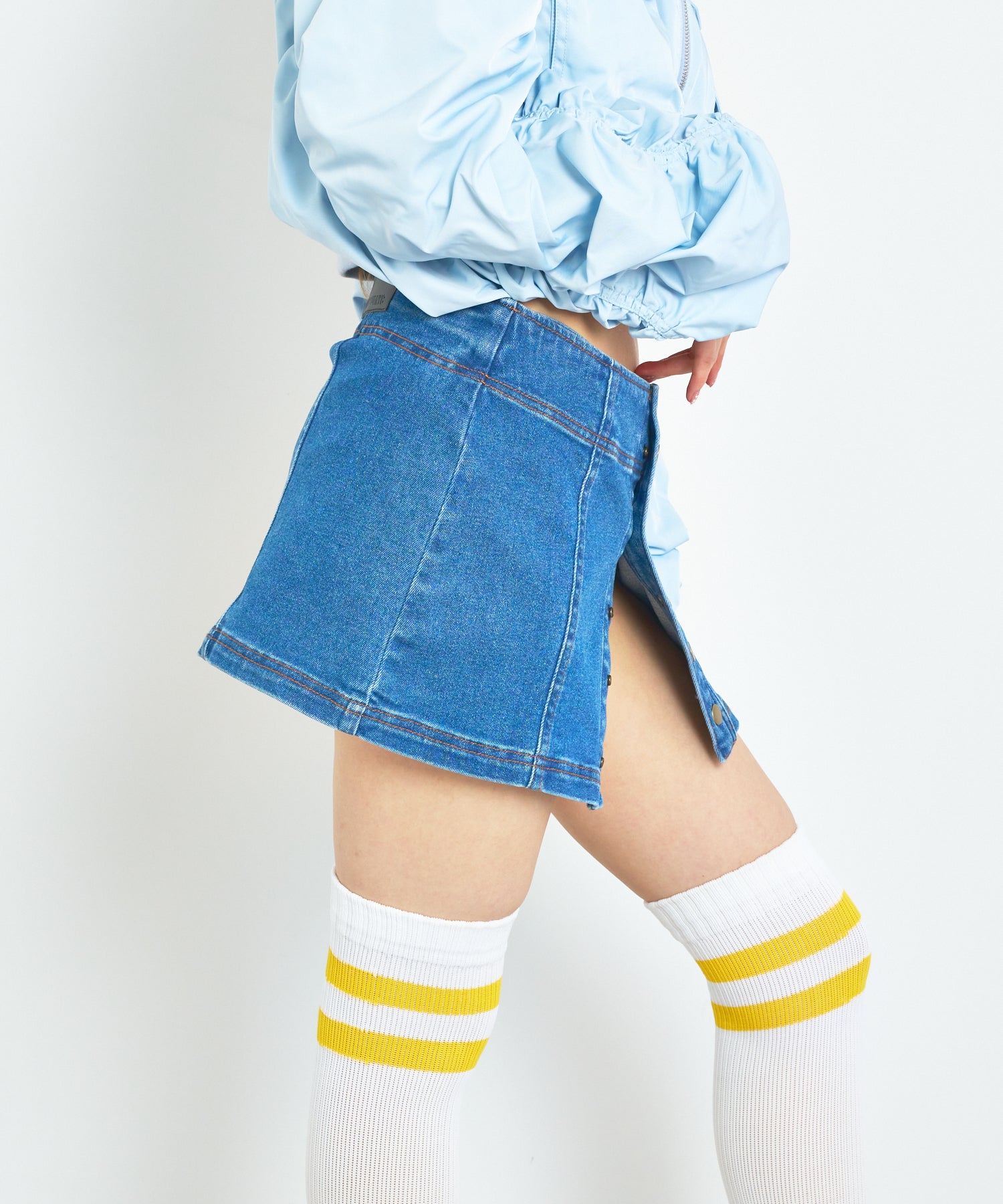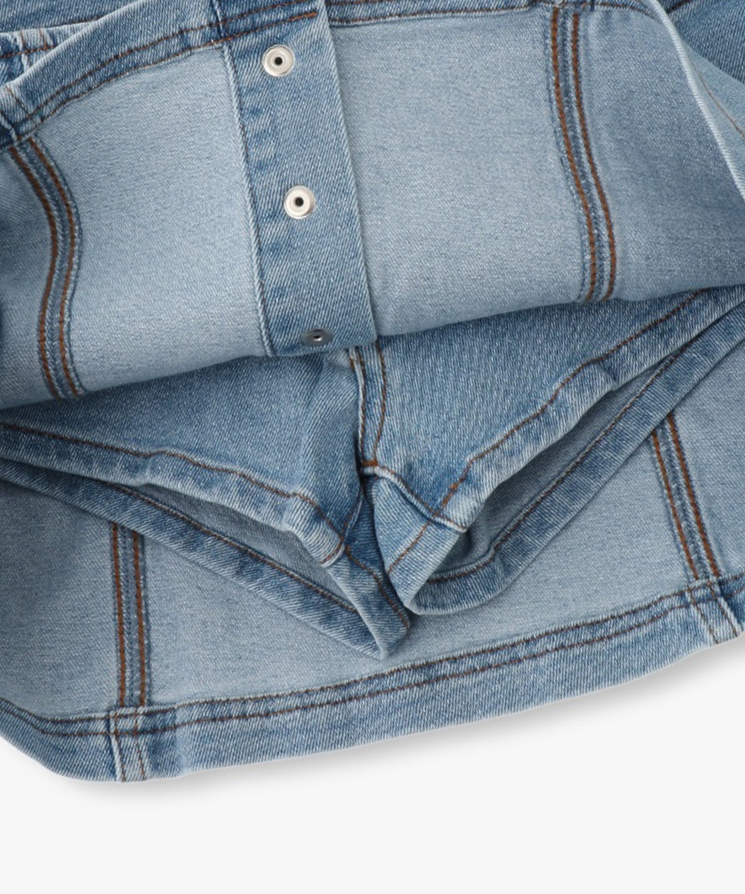 程よくストレッチの効いたデニム素材のスカパン。どこか懐かしさを感じるようなコンパクトなシルエットが魅力的な1着。マイクロミニ丈ですが、内側にパンツが付いているため安心して着用していただけます◎
