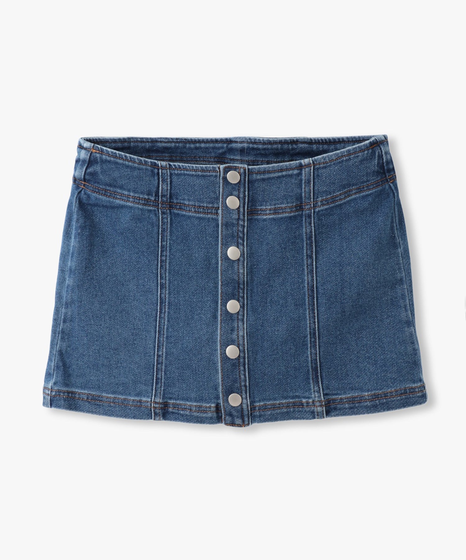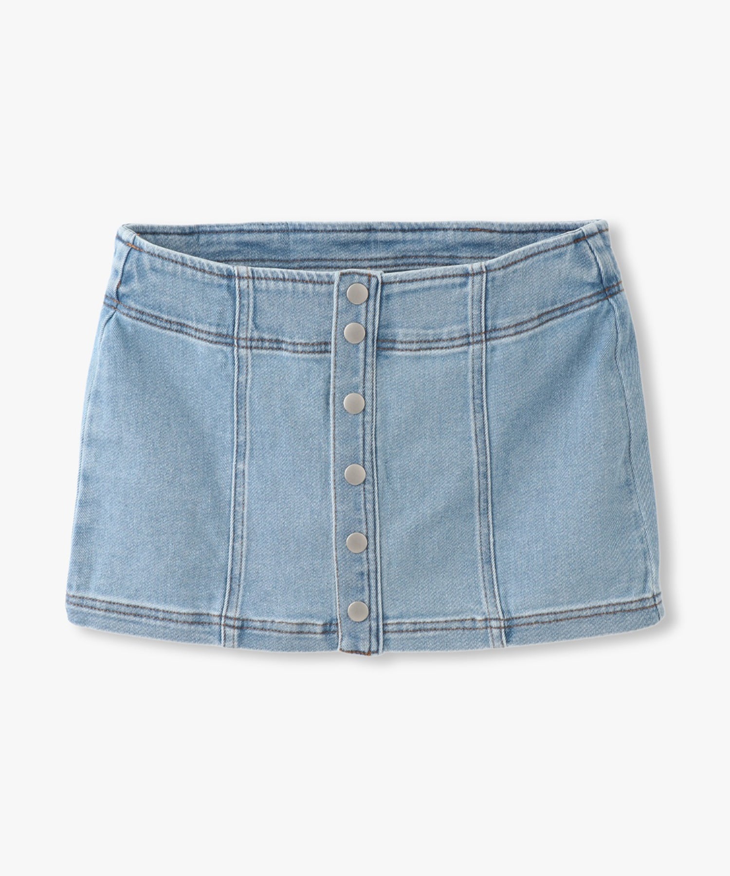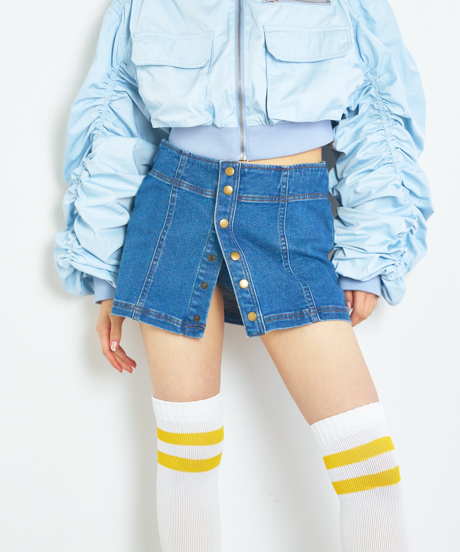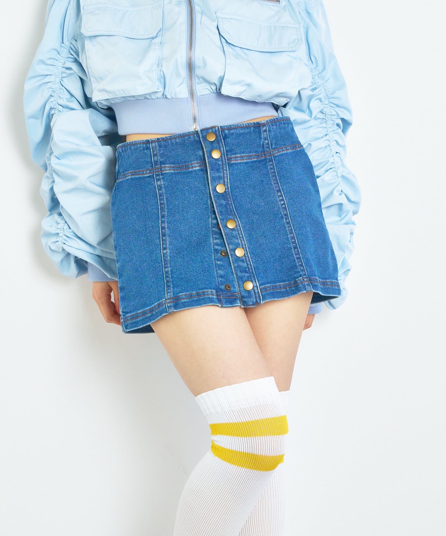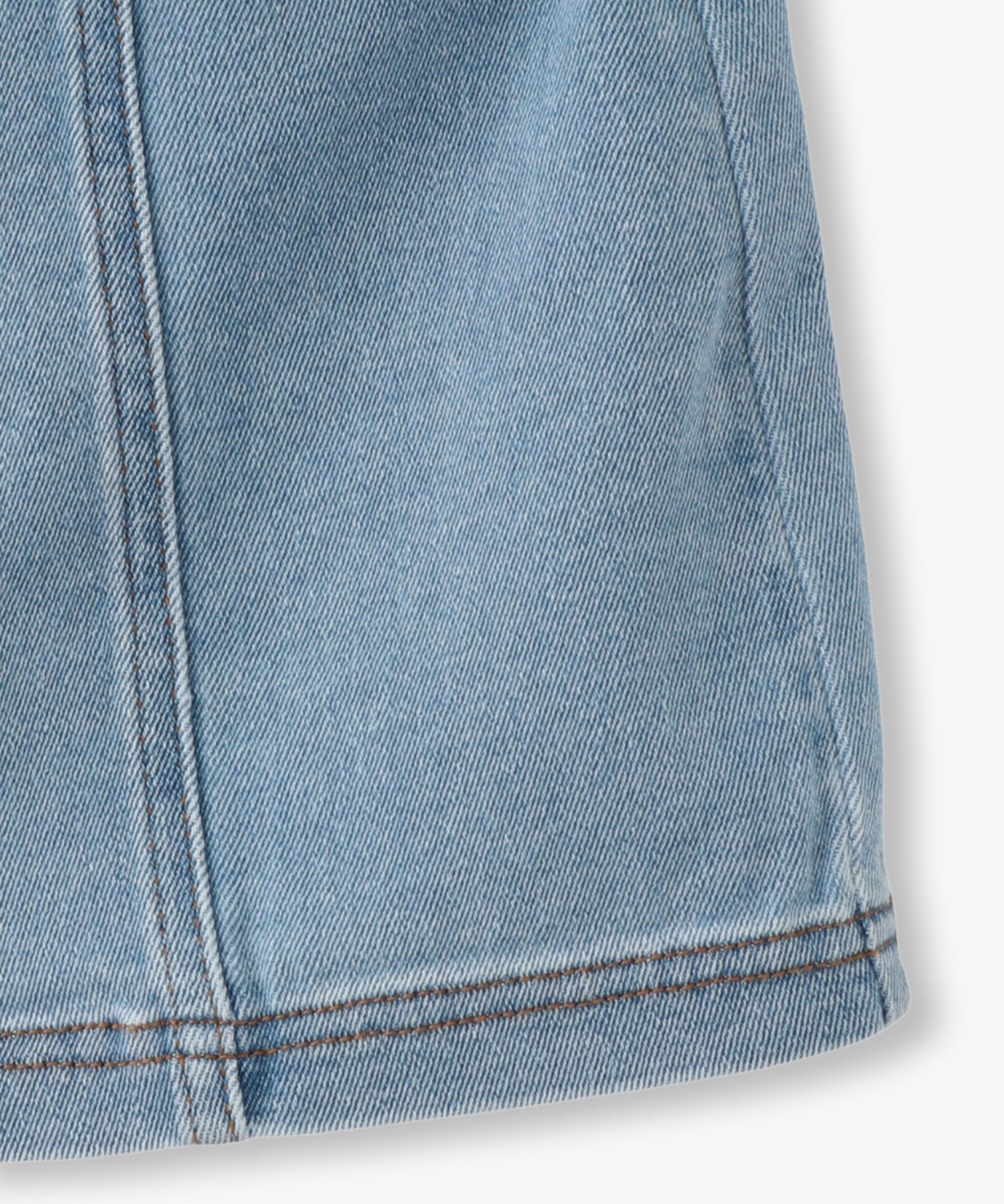 程よくストレッチの効いたデニム素材のスカパン。どこか懐かしさを感じるようなコンパクトなシルエットが魅力的な1着。マイクロミニ丈ですが、内側にパンツが付いているため安心して着用していただけます◎