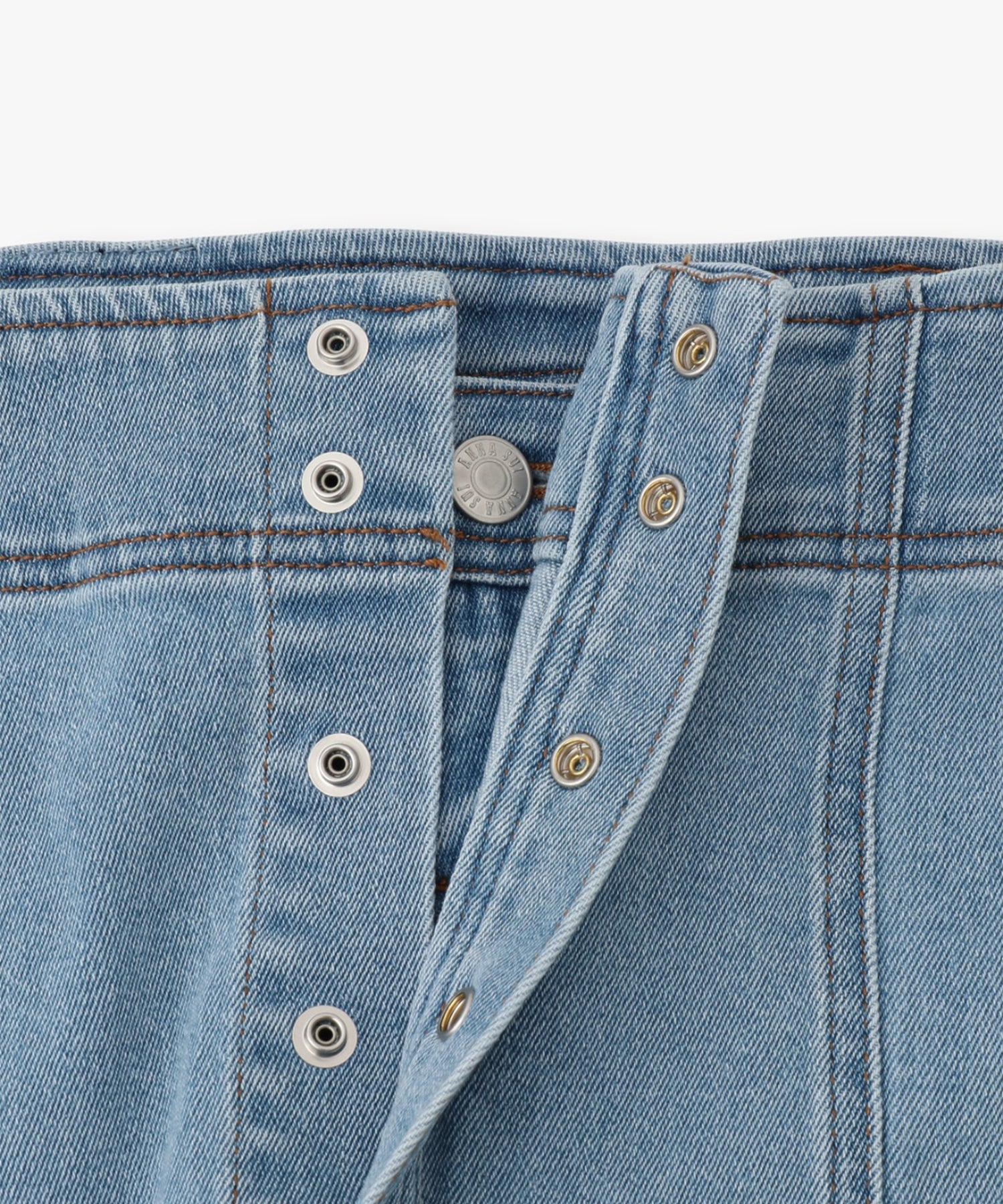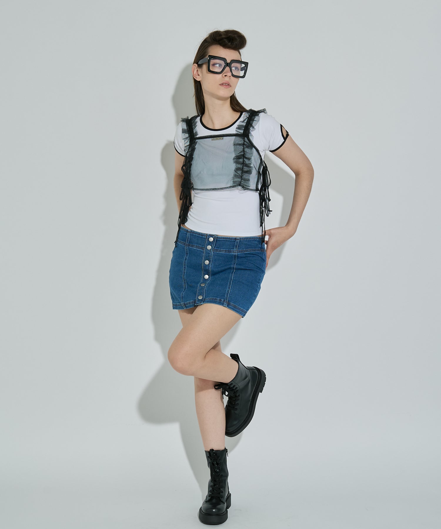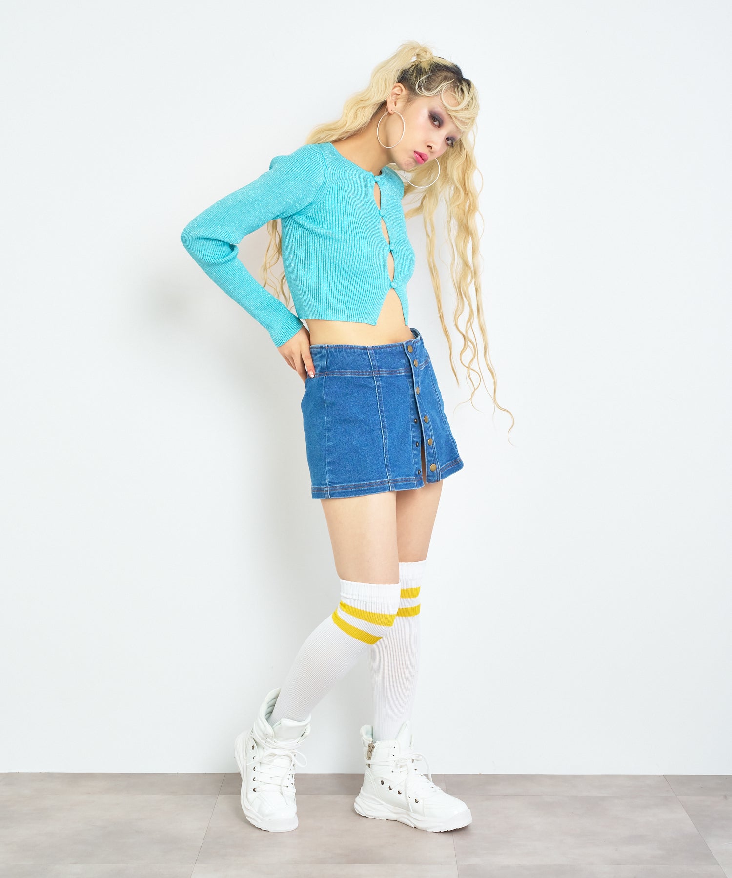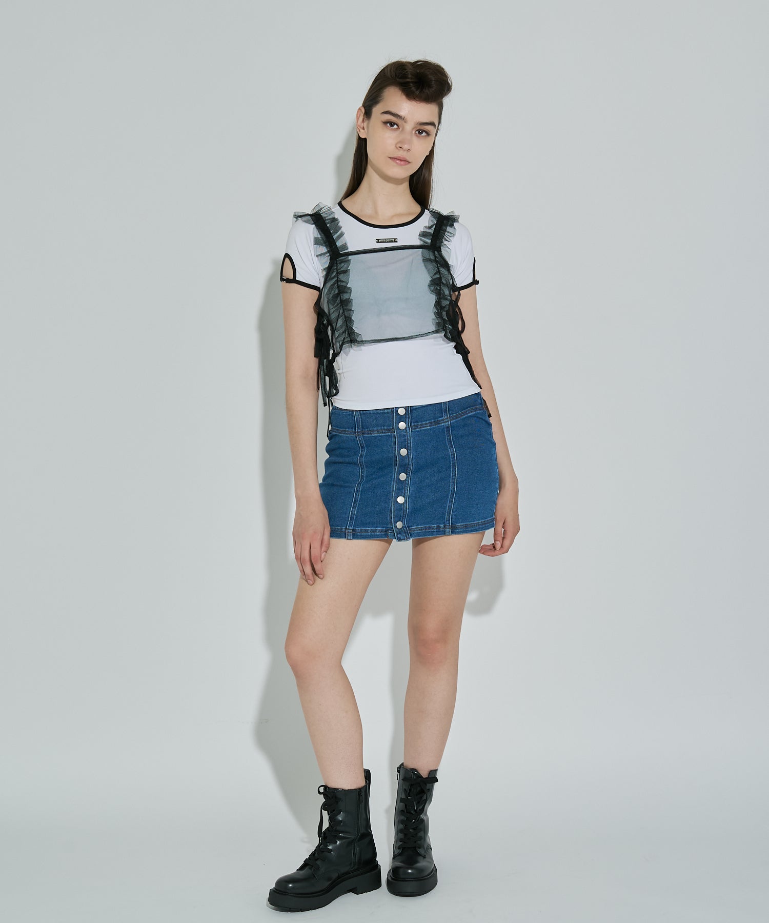 程よくストレッチの効いたデニム素材のスカパン。どこか懐かしさを感じるようなコンパクトなシルエットが魅力的な1着。マイクロミニ丈ですが、内側にパンツが付いているため安心して着用していただけます◎