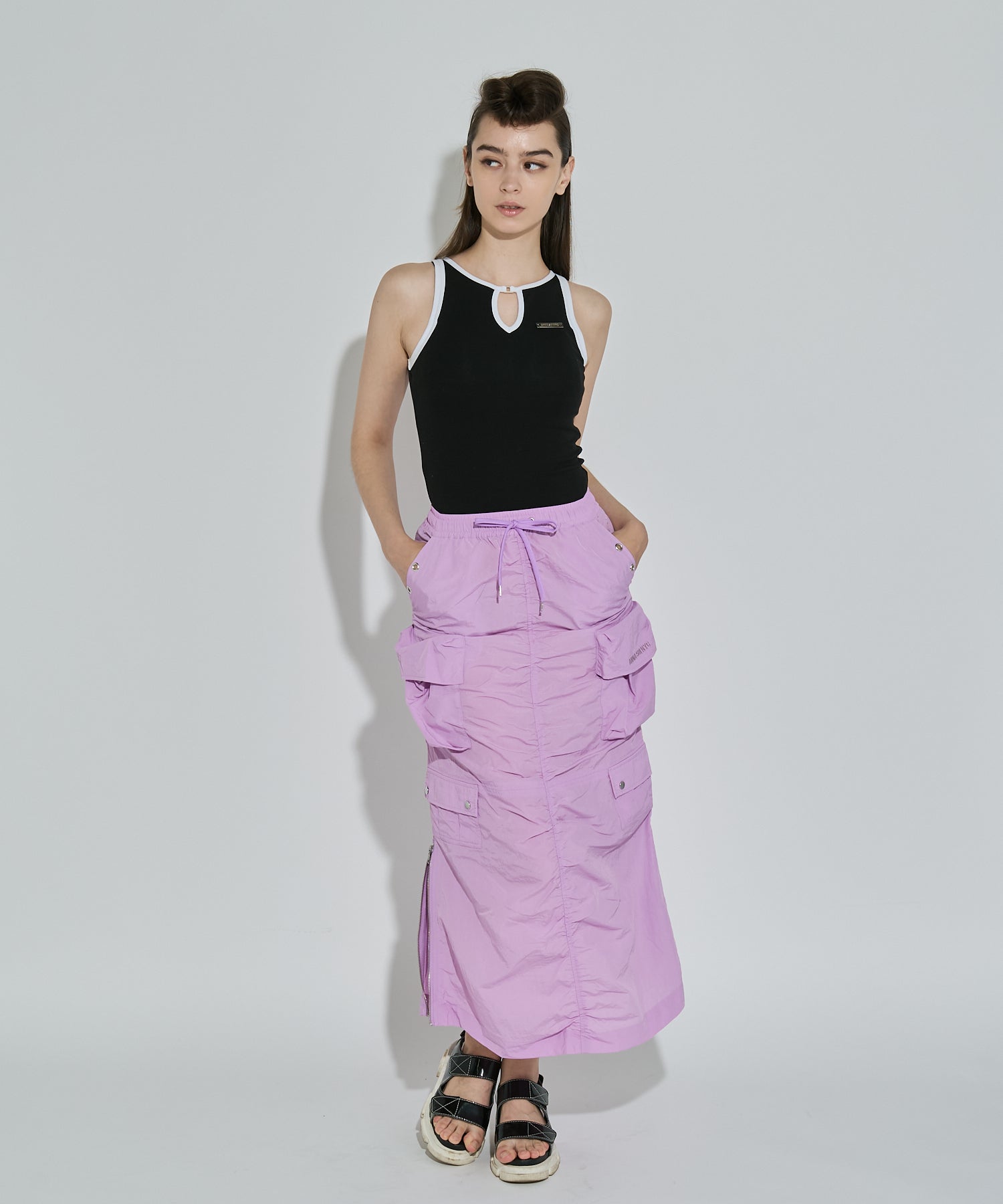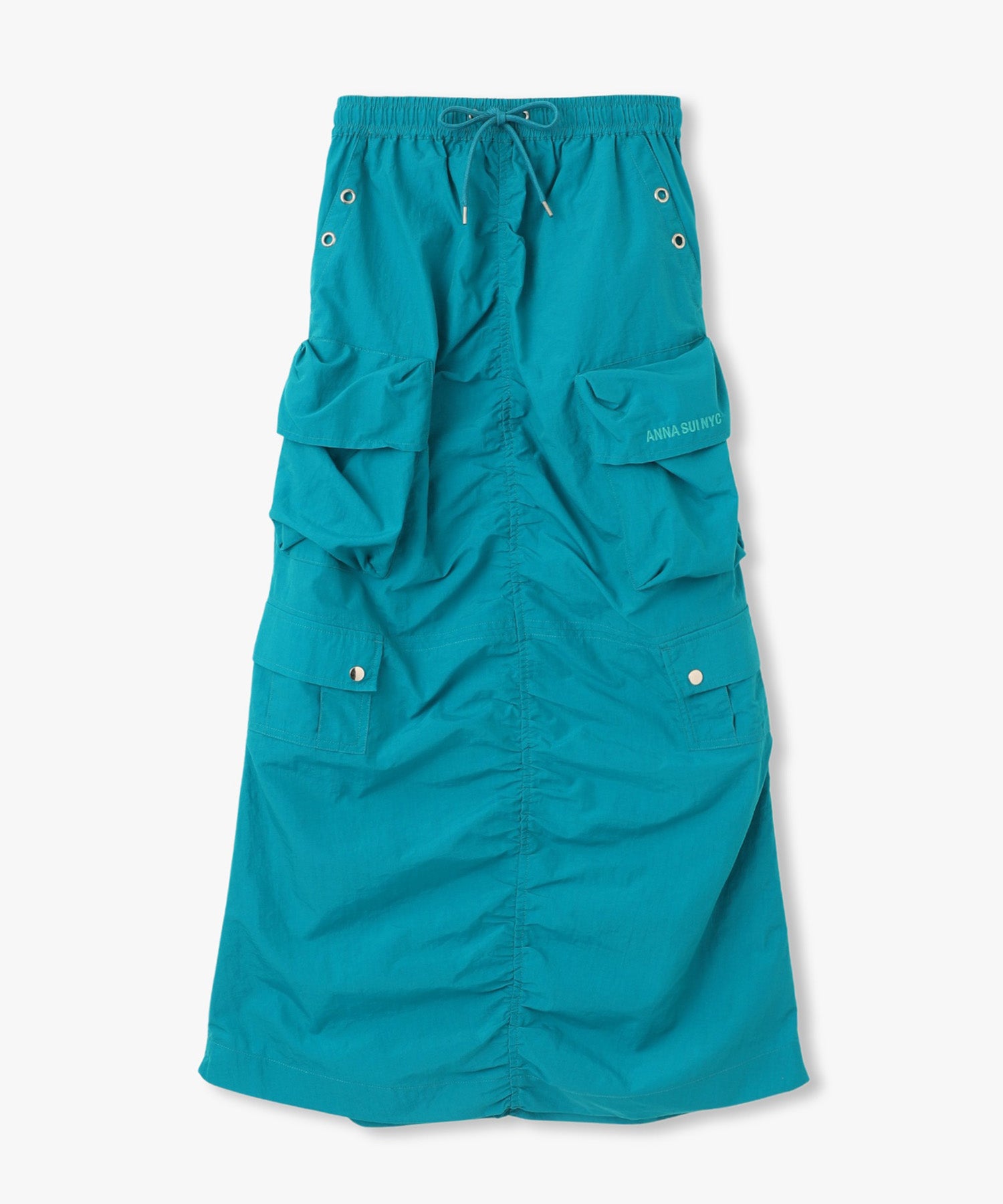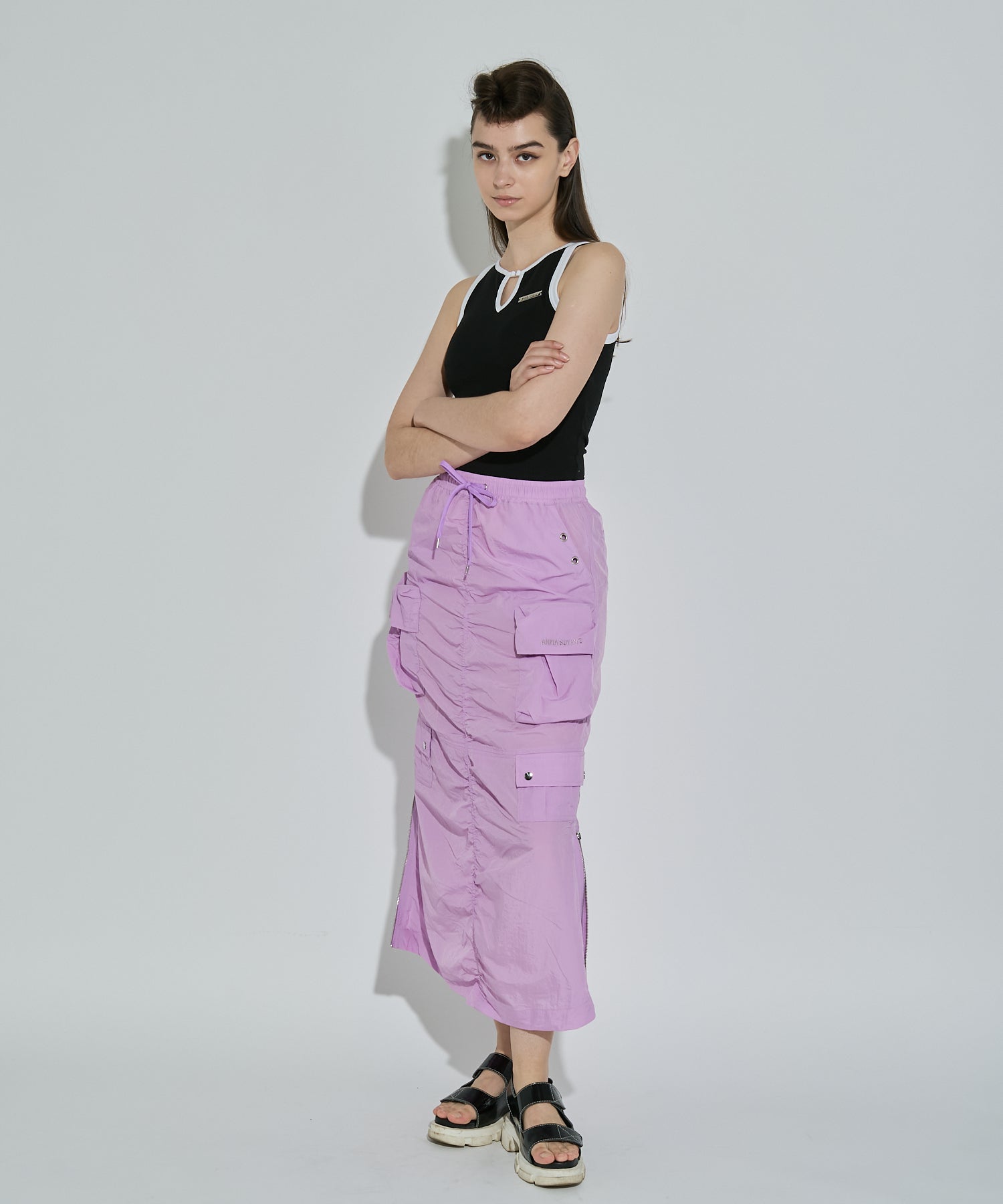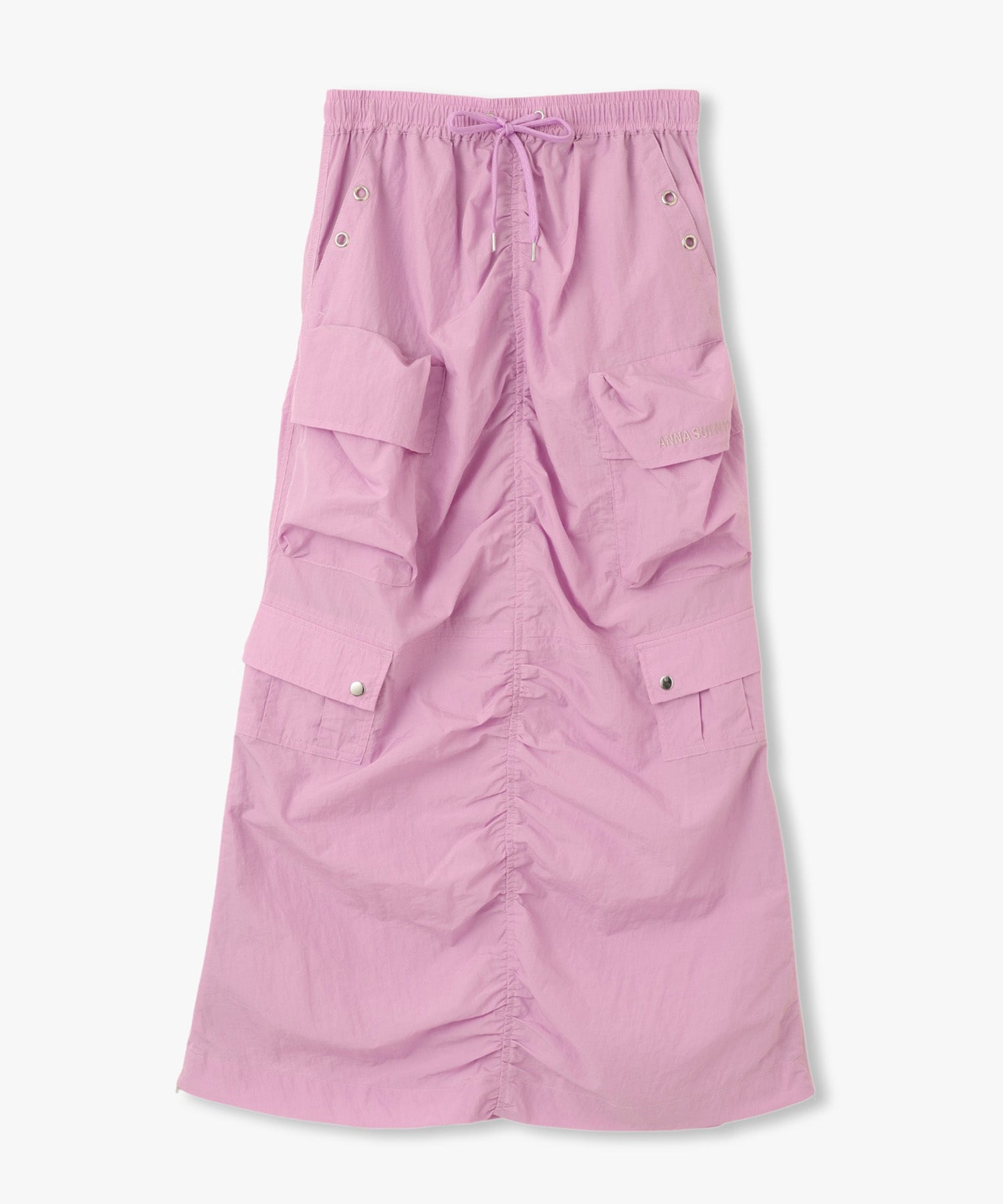 シワ感のある軽くシャカシャカとした素材で作られたマルチポケットスカート。様々なデザインのポケットが配置され洗練されたデザインに。裾のサイドファスナーを開けて着用すると足元が見え涼しげな雰囲気に。ウエストの内側にはボタンが付いており、"スポーツワッシャーレースアップベスト"とドッキングさせてセットアップで着用できるANNA SUI NYC オリジナルのとっておきアイテムです!